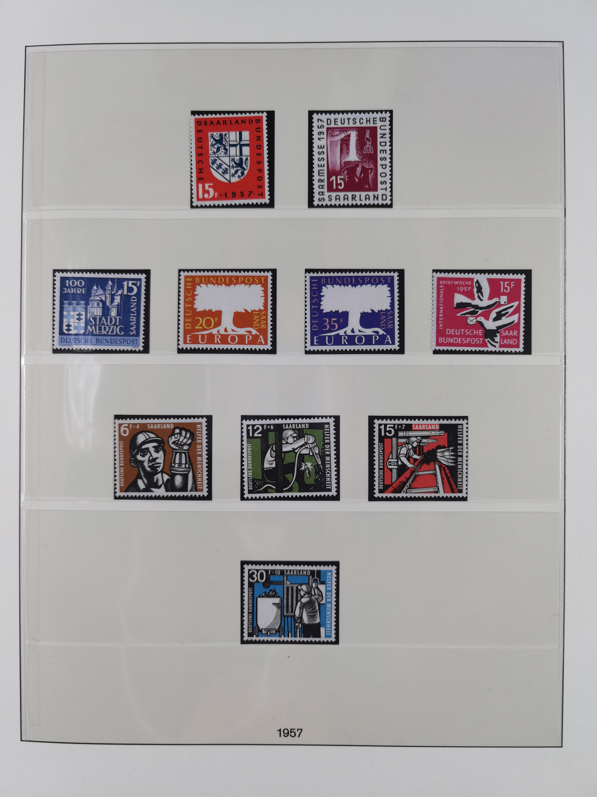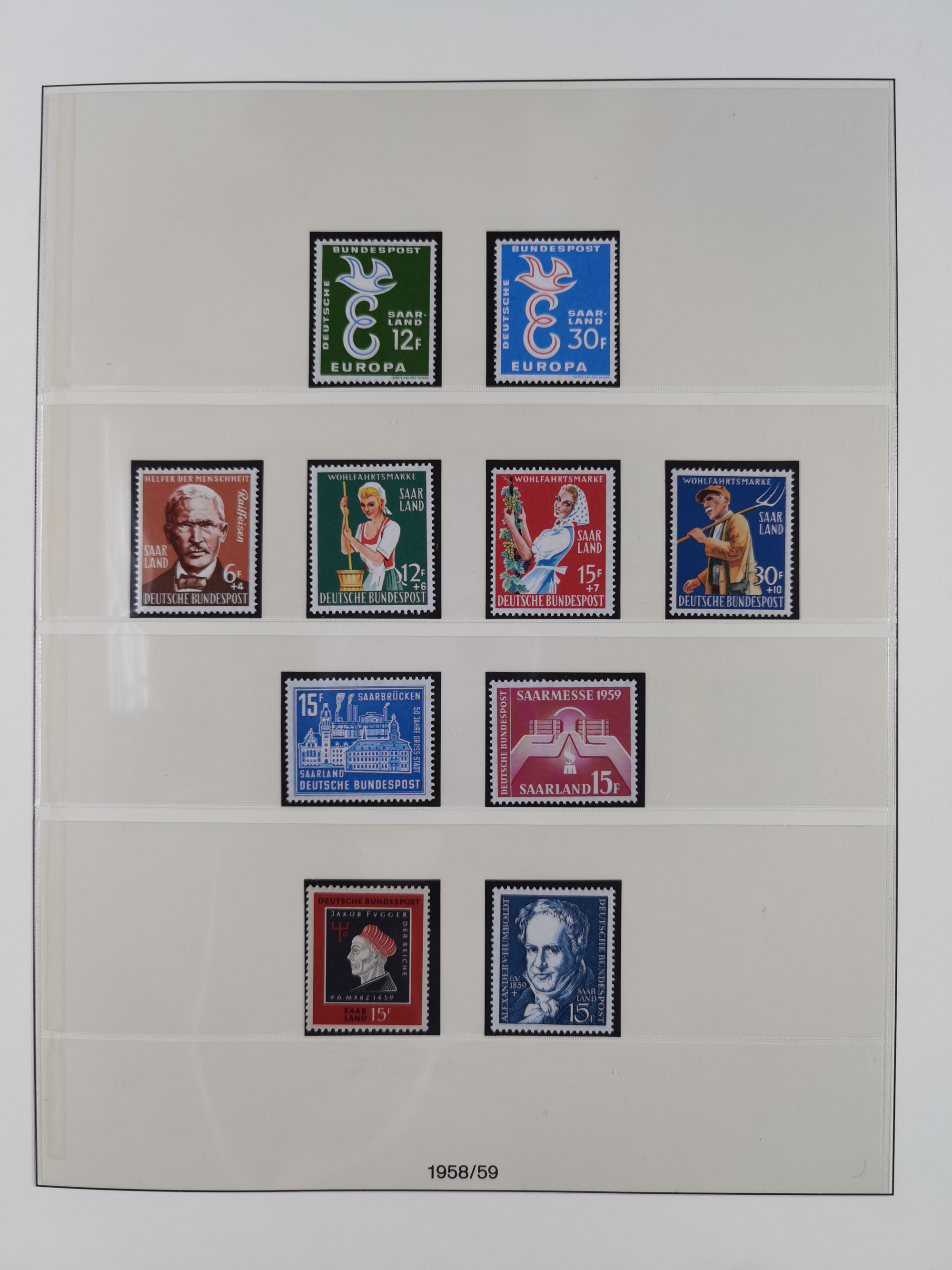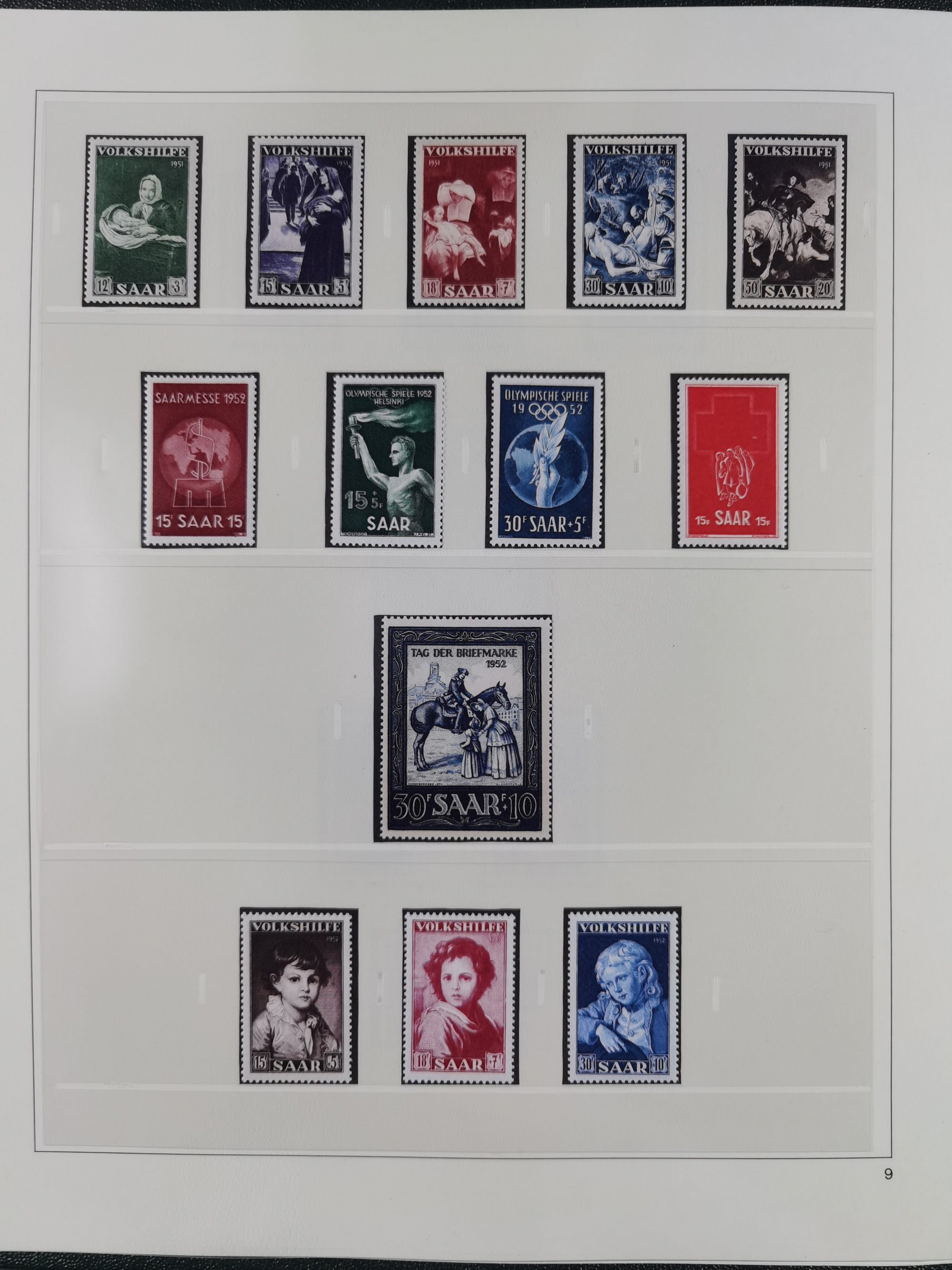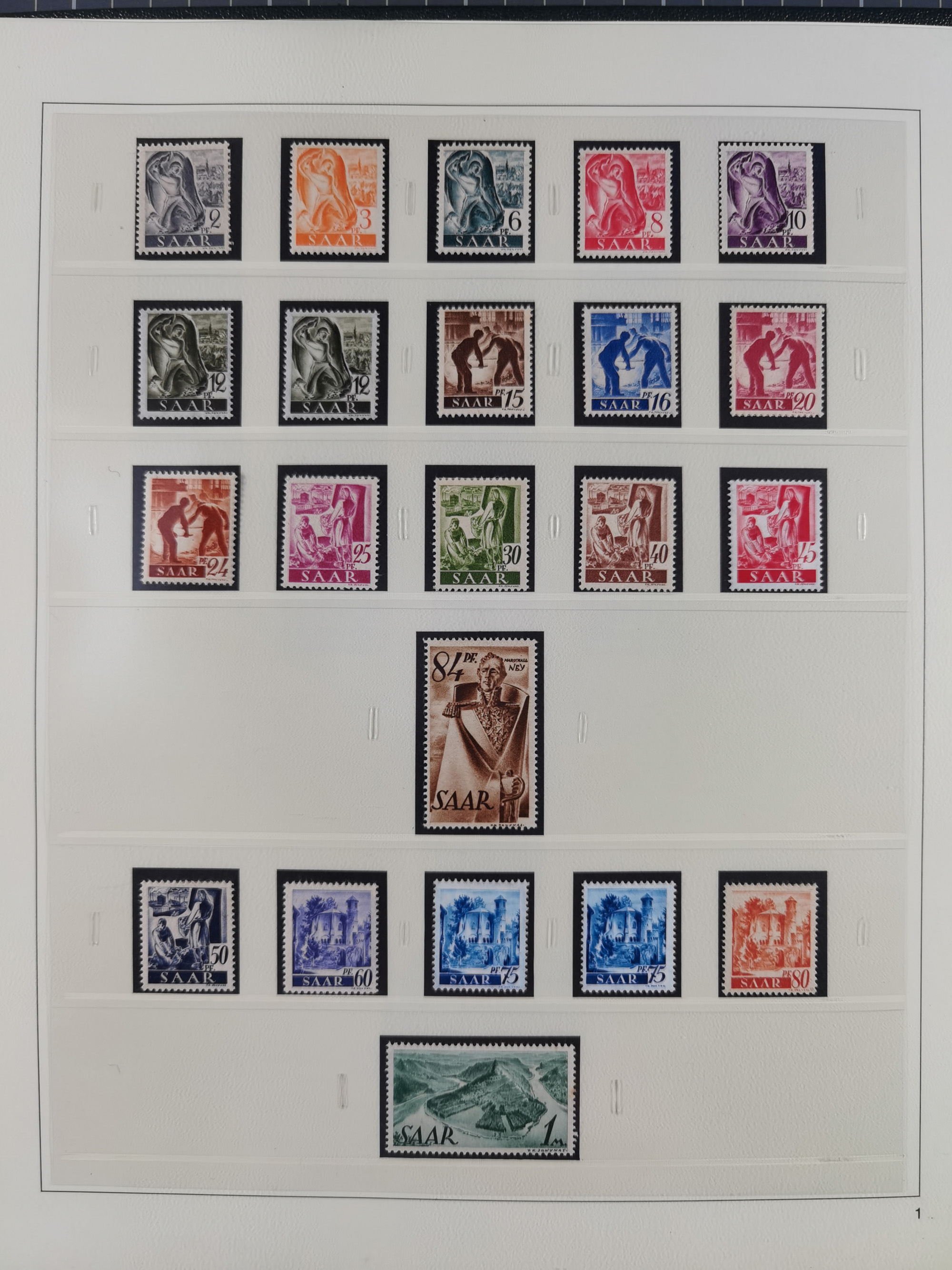 1920/59, in den Hauptnummern stark überkomplette fast ausnahmslos postfrische Sammlung inkl. Dienstmarken, dabei Mi.-Nr. 1-17, 1-17IA inkl. Farben mit 14aIA, Type II 7 Werte kpl., zusätzlich diese auch mit PF A (ohne 2aIIA), 1-17III mit 16IIIOR, 18-31 mit 30L und 31L, A31-C31 (B31 ungebraucht), ferner alle Volkshilfen inkl. Madonna mit Bogenrand, sowie Saarland mit unsigniertem Urdrucksatz, Hochwasserhilfe-Blockspaar, einigen Klbg., zusätzlich gestempelt 380-83 und 409-28 OR auf Briefstücken und MH1 postfrisch/ungebraucht (etwas fleckig), gute Erhaltung, 23 (Kurz-)Befunde und Atteste Ney, Geigle, Burger und Bernhard BPP, in zwei Vordruckalben
