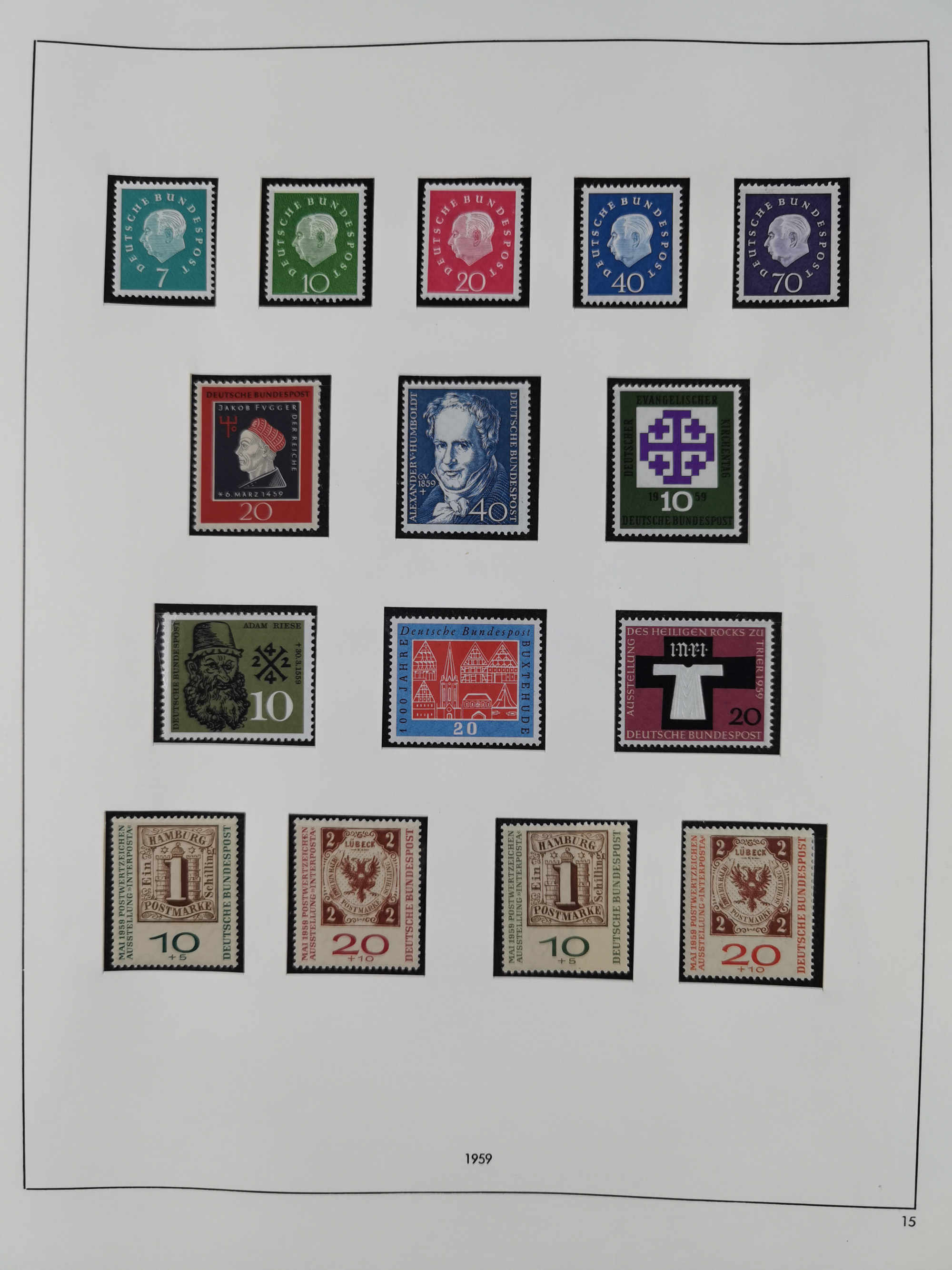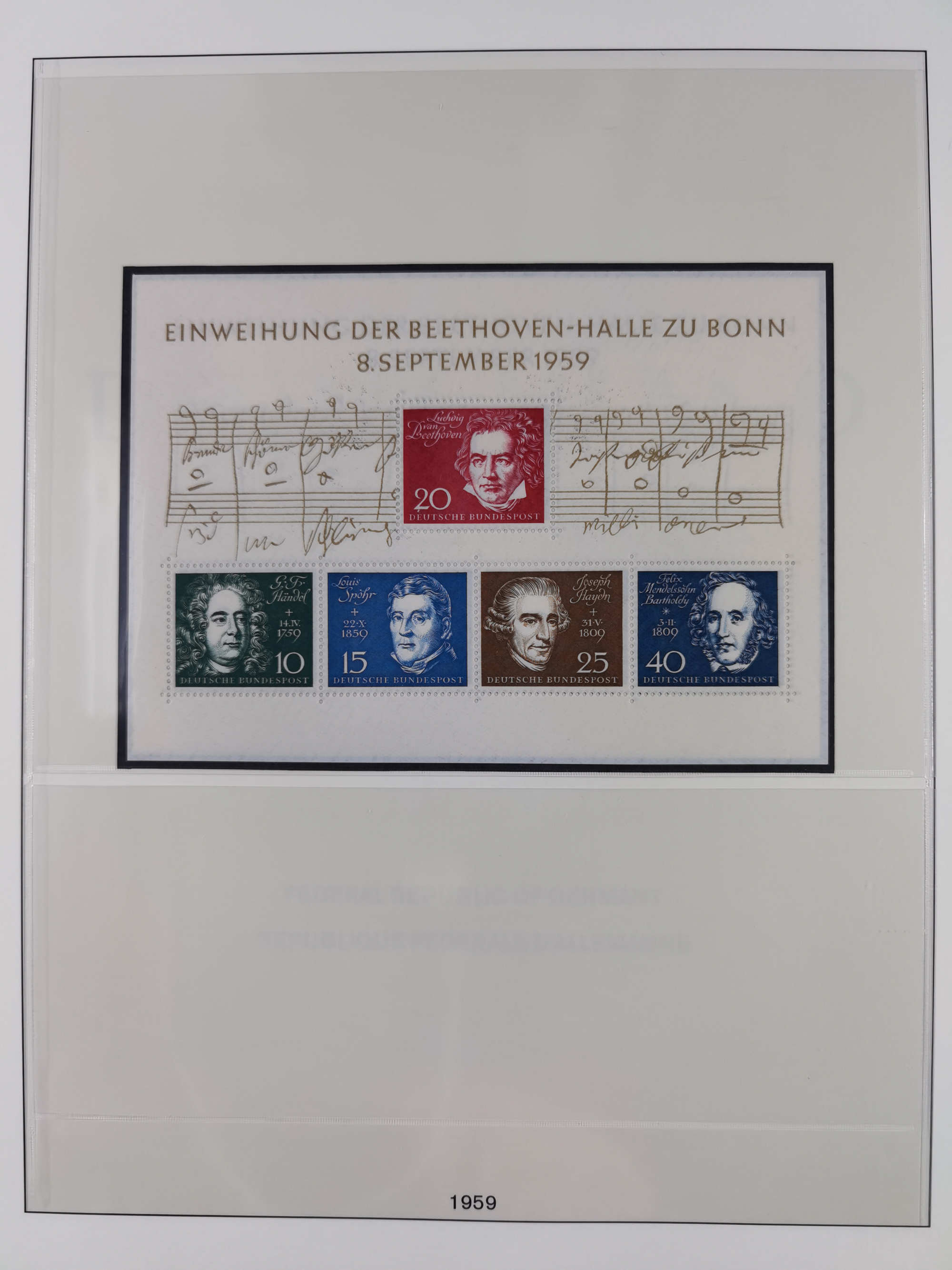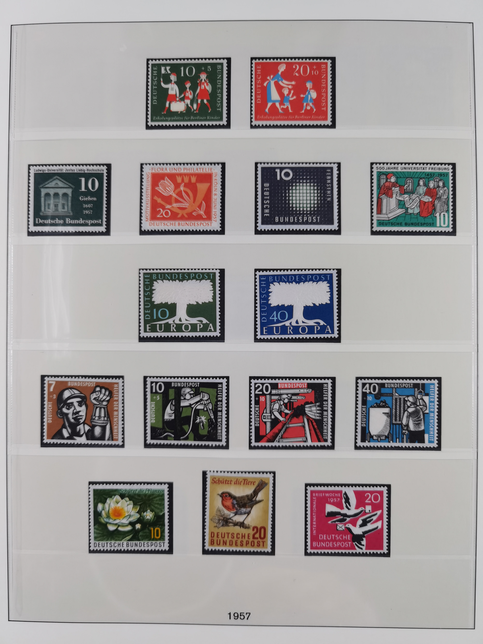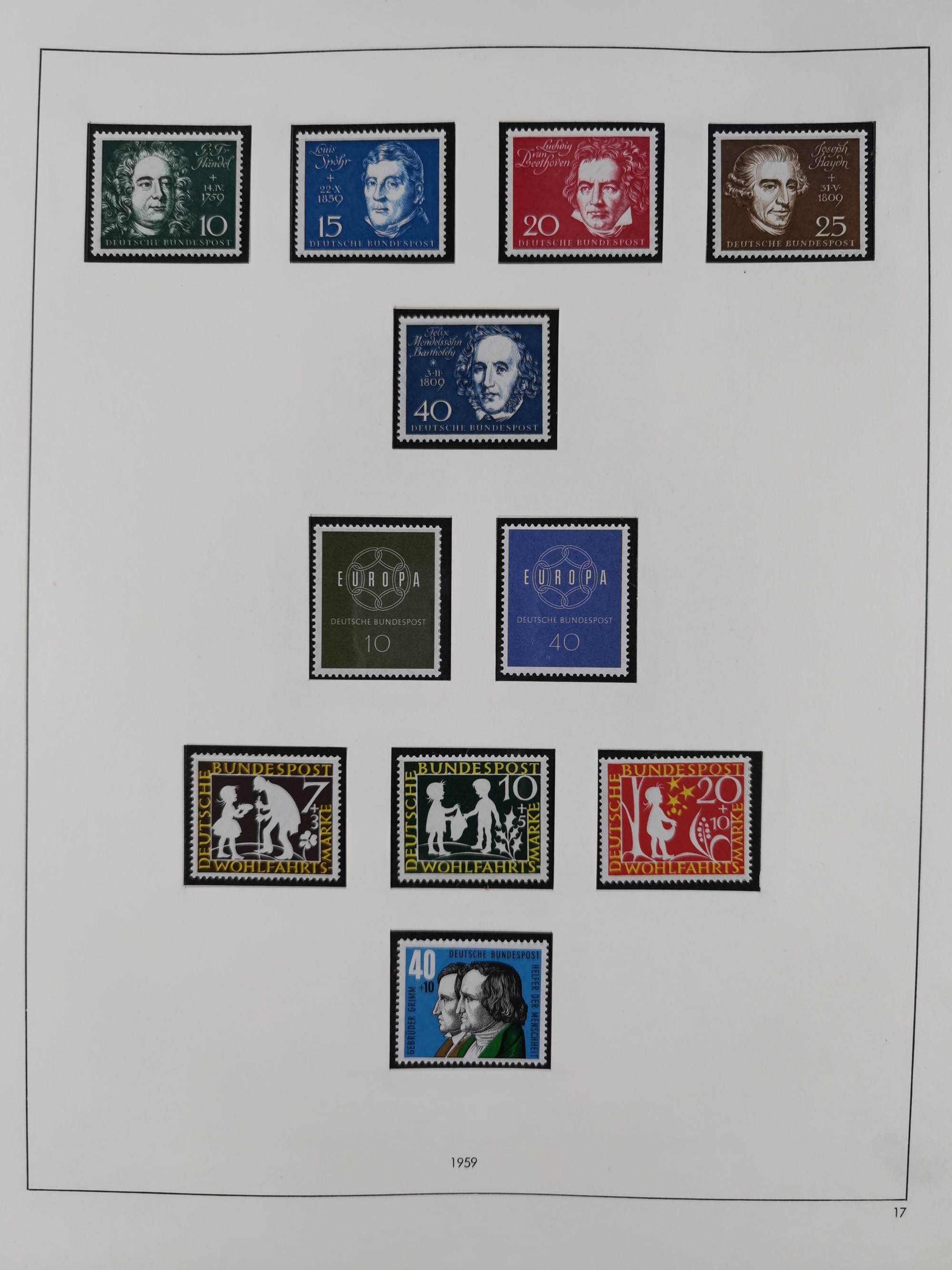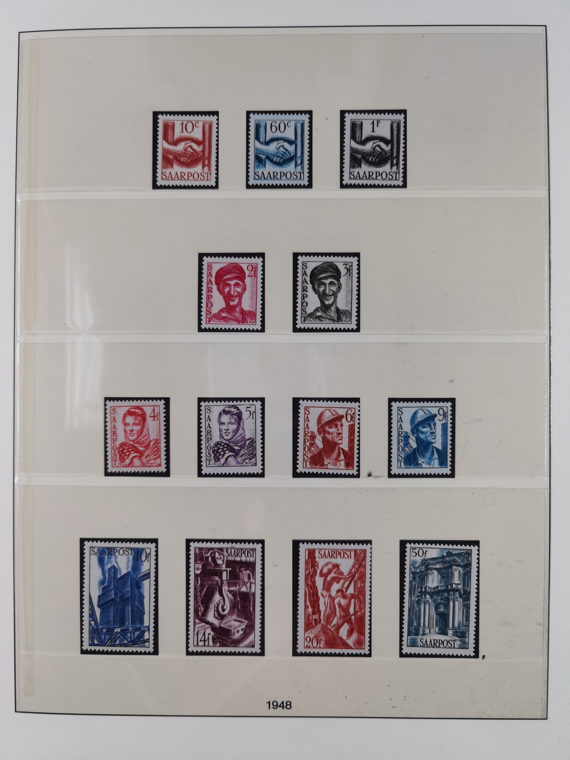 1920/59, in den Hauptnummern stark überkomplette fast ausnahmslos postfrische Sammlung inkl. Dienstmarken, dabei Mi.-Nr. 1-17, 1-17IA inkl. Farben mit 14aIA, Type II 7 Werte kpl., zusätzlich diese auch mit PF A (ohne 2aIIA), 1-17III mit 16IIIOR, 18-31 mit 30L und 31L, A31-C31 (B31 ungebraucht), ferner alle Volkshilfen inkl. Madonna mit Bogenrand, sowie Saarland mit unsigniertem Urdrucksatz, Hochwasserhilfe-Blockspaar, einigen Klbg., zusätzlich gestempelt 380-83 und 409-28 OR auf Briefstücken und MH1 postfrisch/ungebraucht (etwas fleckig), gute Erhaltung, 23 (Kurz-)Befunde und Atteste Ney, Geigle, Burger und Bernhard BPP, in zwei Vordruckalben
