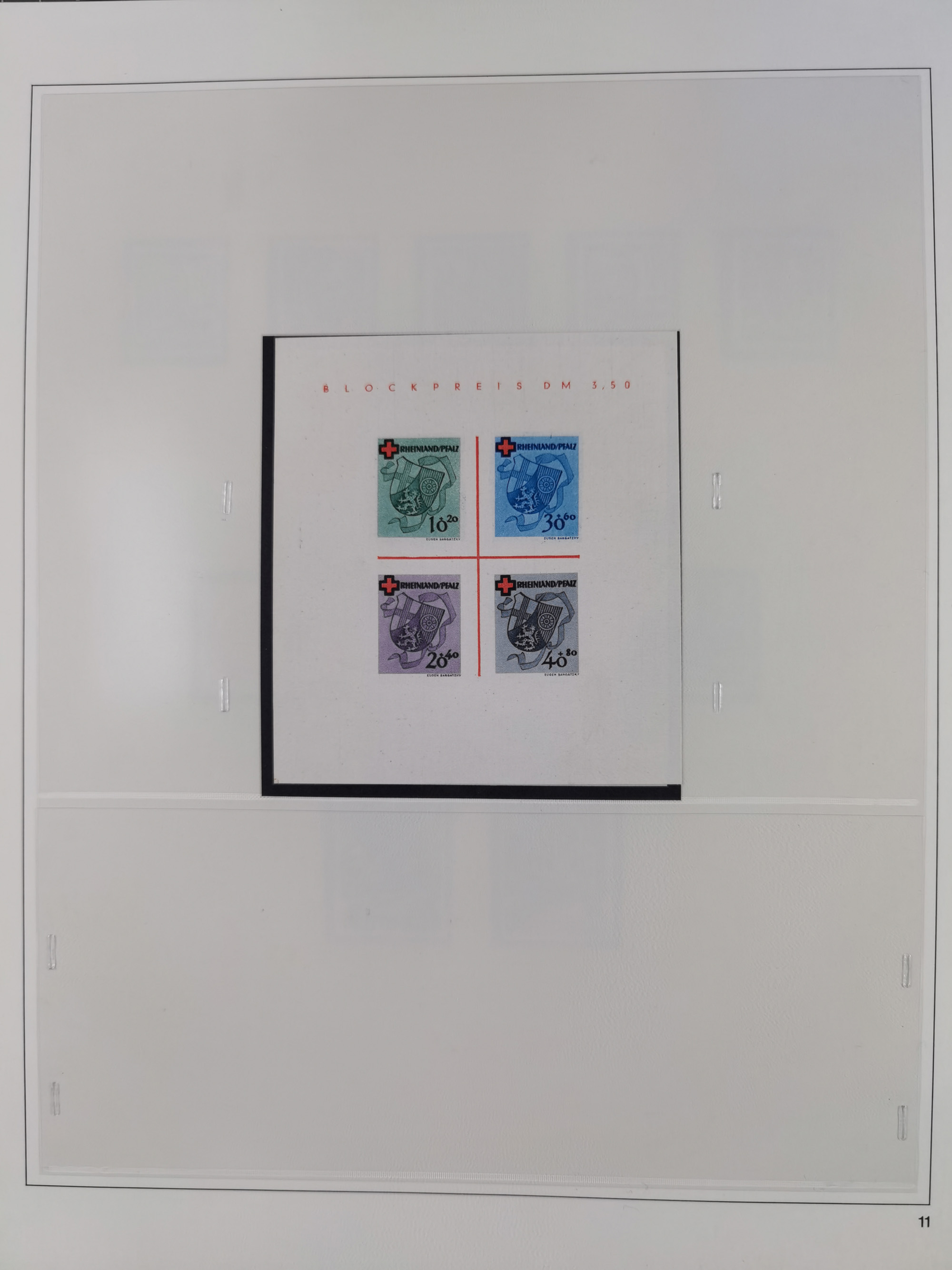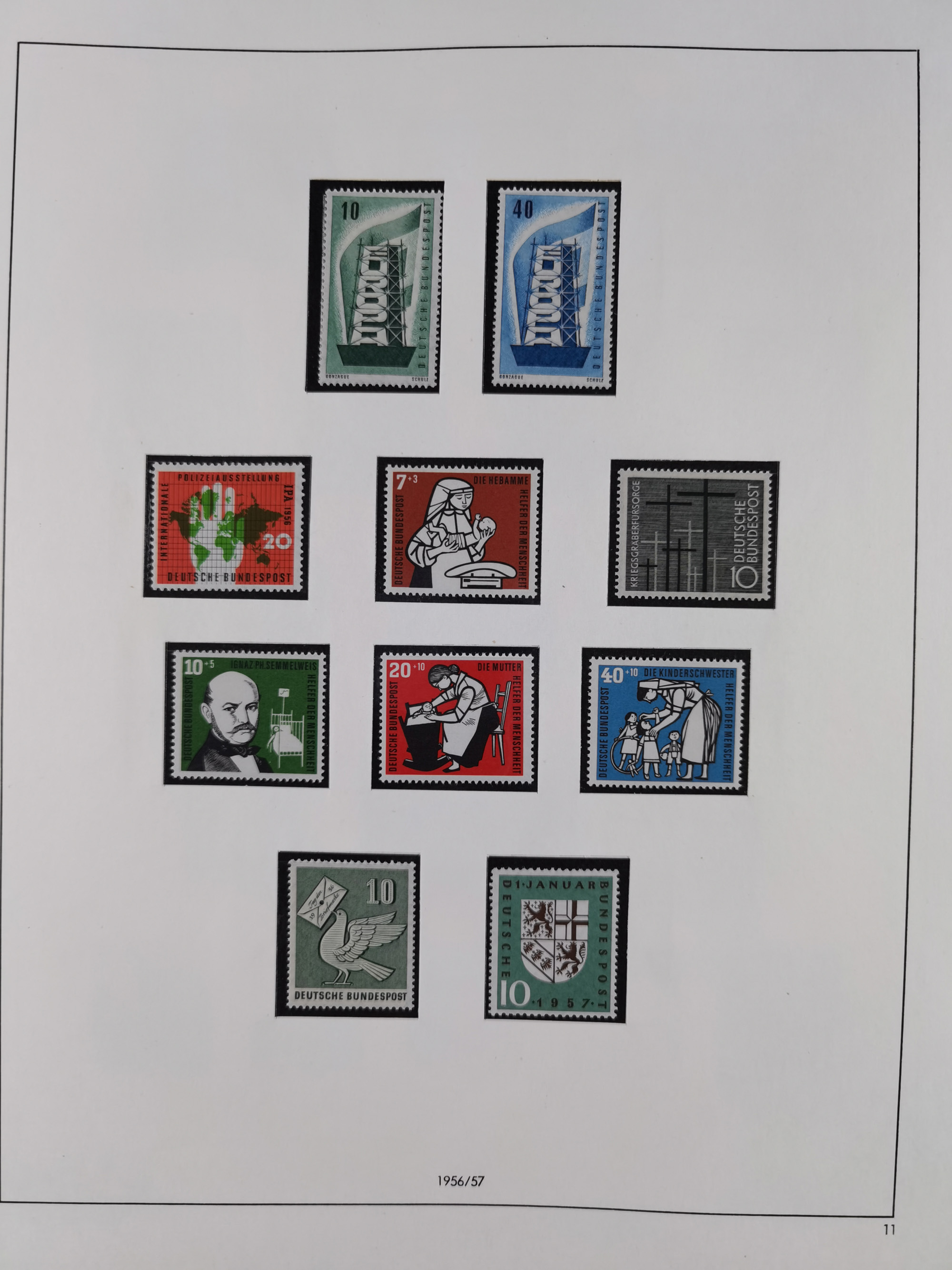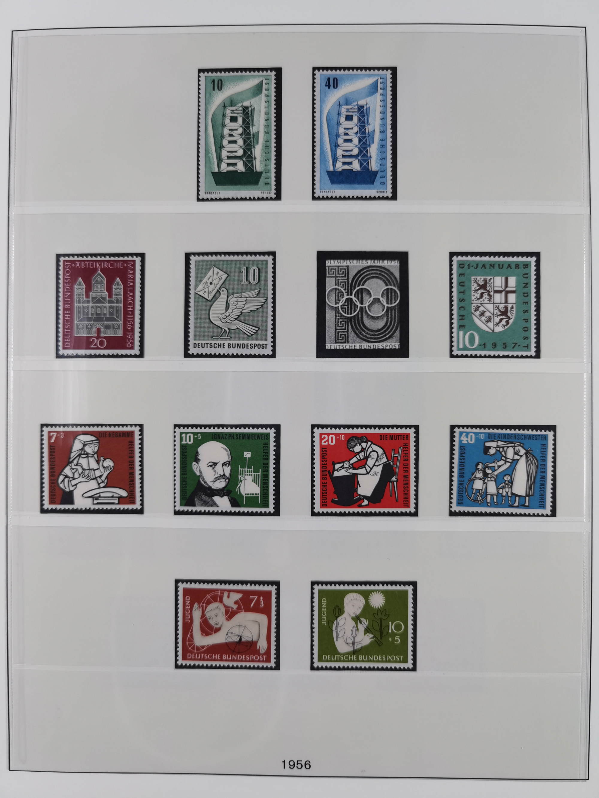 1945/59, Gemeinschaftsausgaben, FZ, Bizone und Saarland, Sammlung in zwei Vordruckalben mit u.a. Bl. 12 A/B, gutem Teil Bauten, 2 Rotes Kreuz-Blocks, etc.