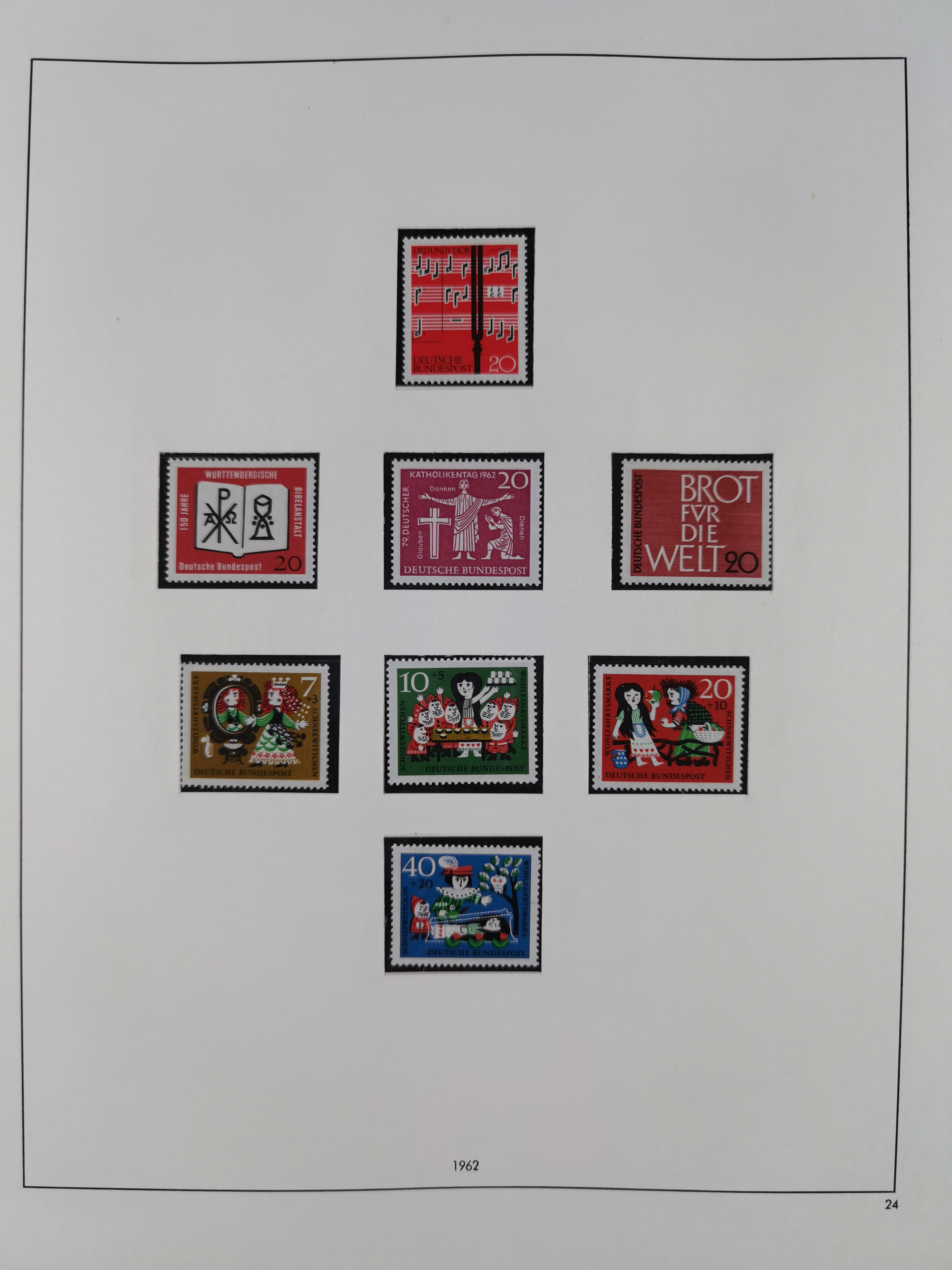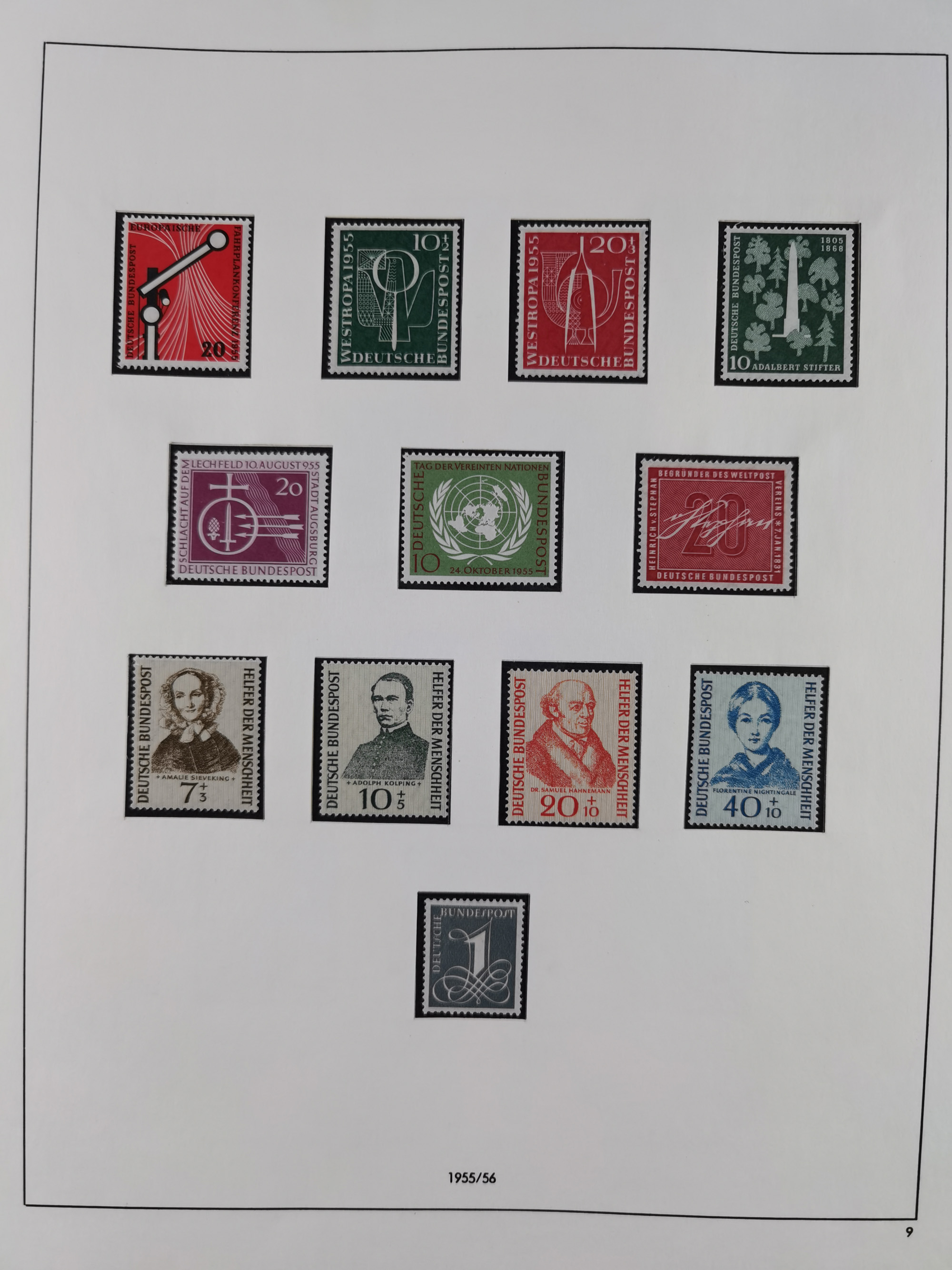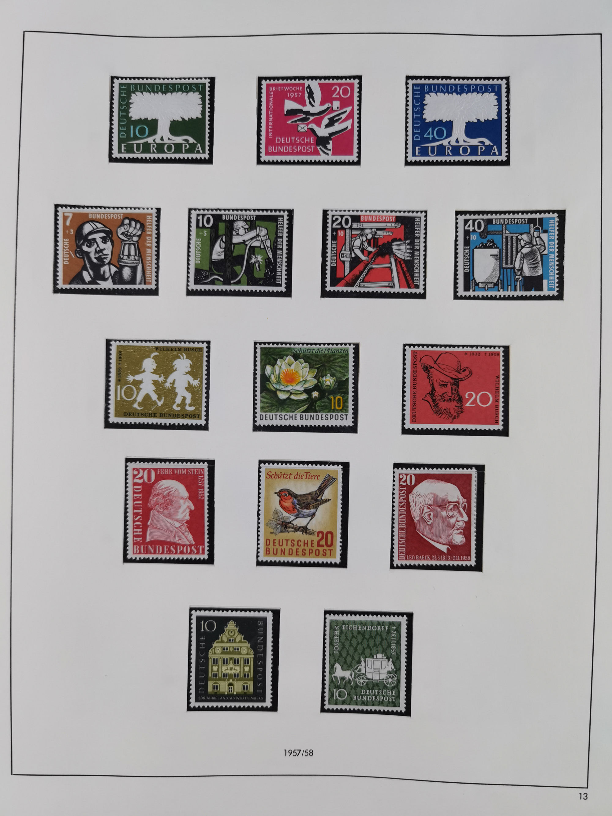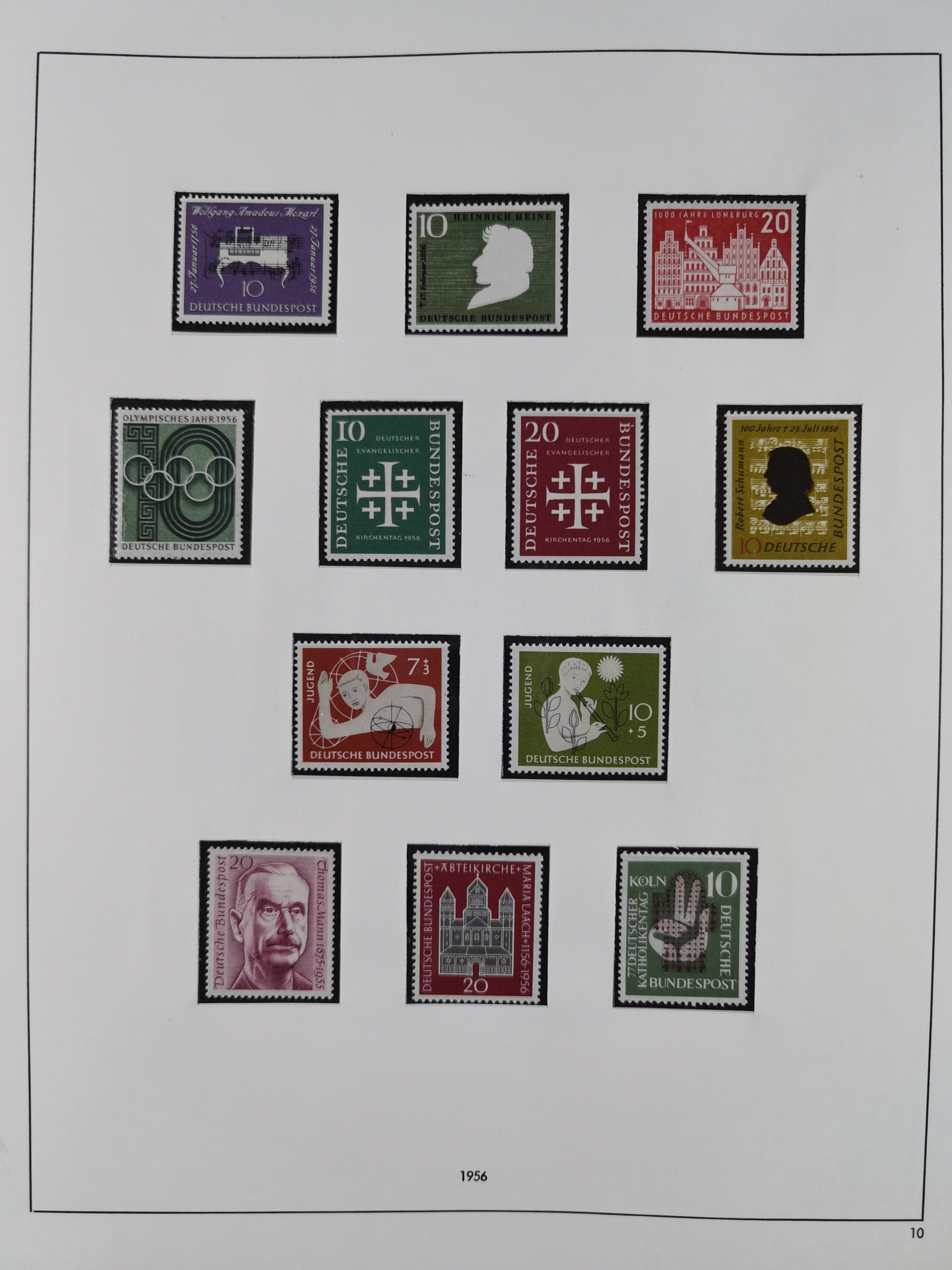 1945/59, Gemeinschaftsausgaben, FZ, Bizone und Saarland, Sammlung in zwei Vordruckalben mit u.a. Bl. 12 A/B, gutem Teil Bauten, 2 Rotes Kreuz-Blocks, etc.