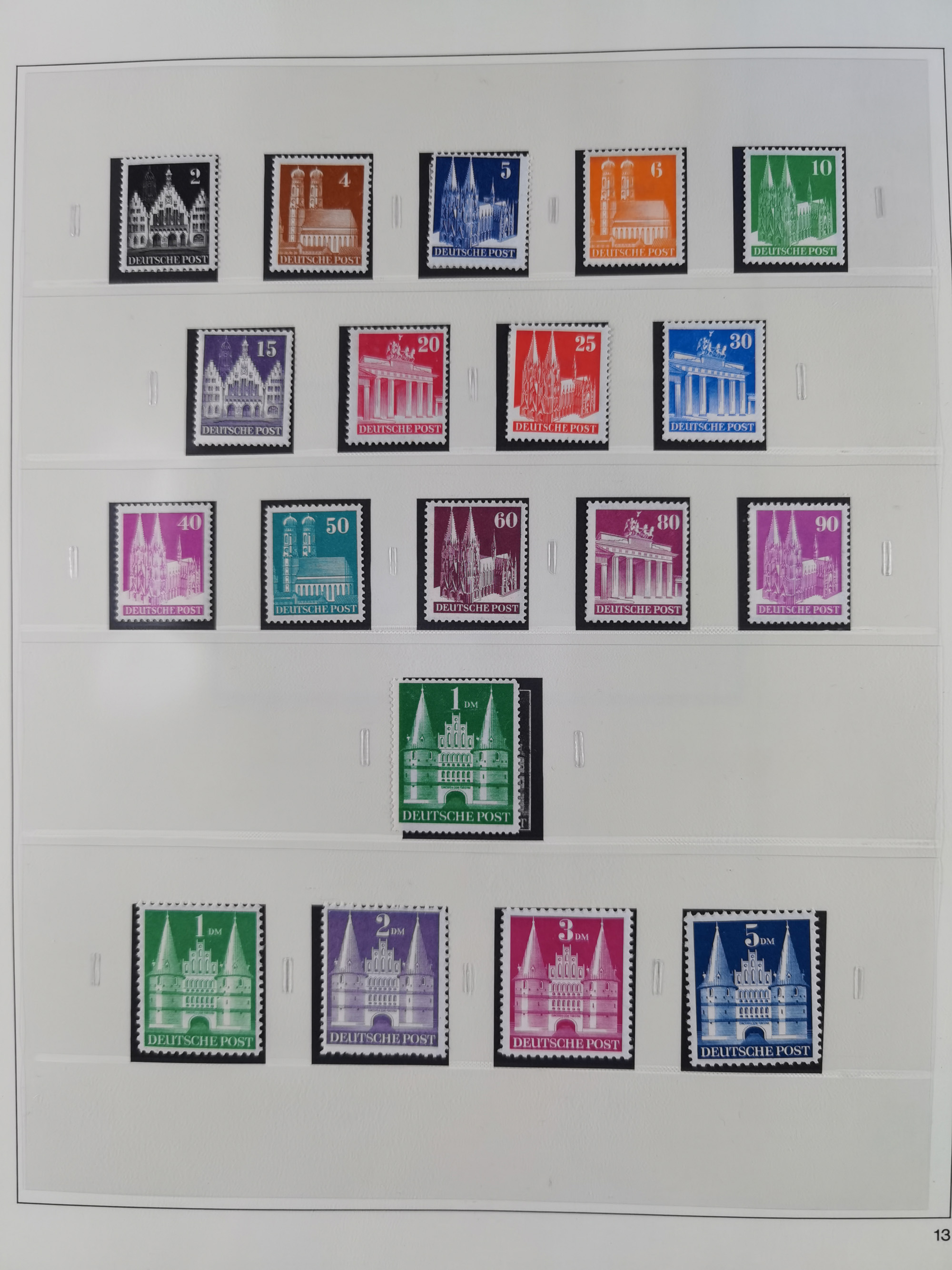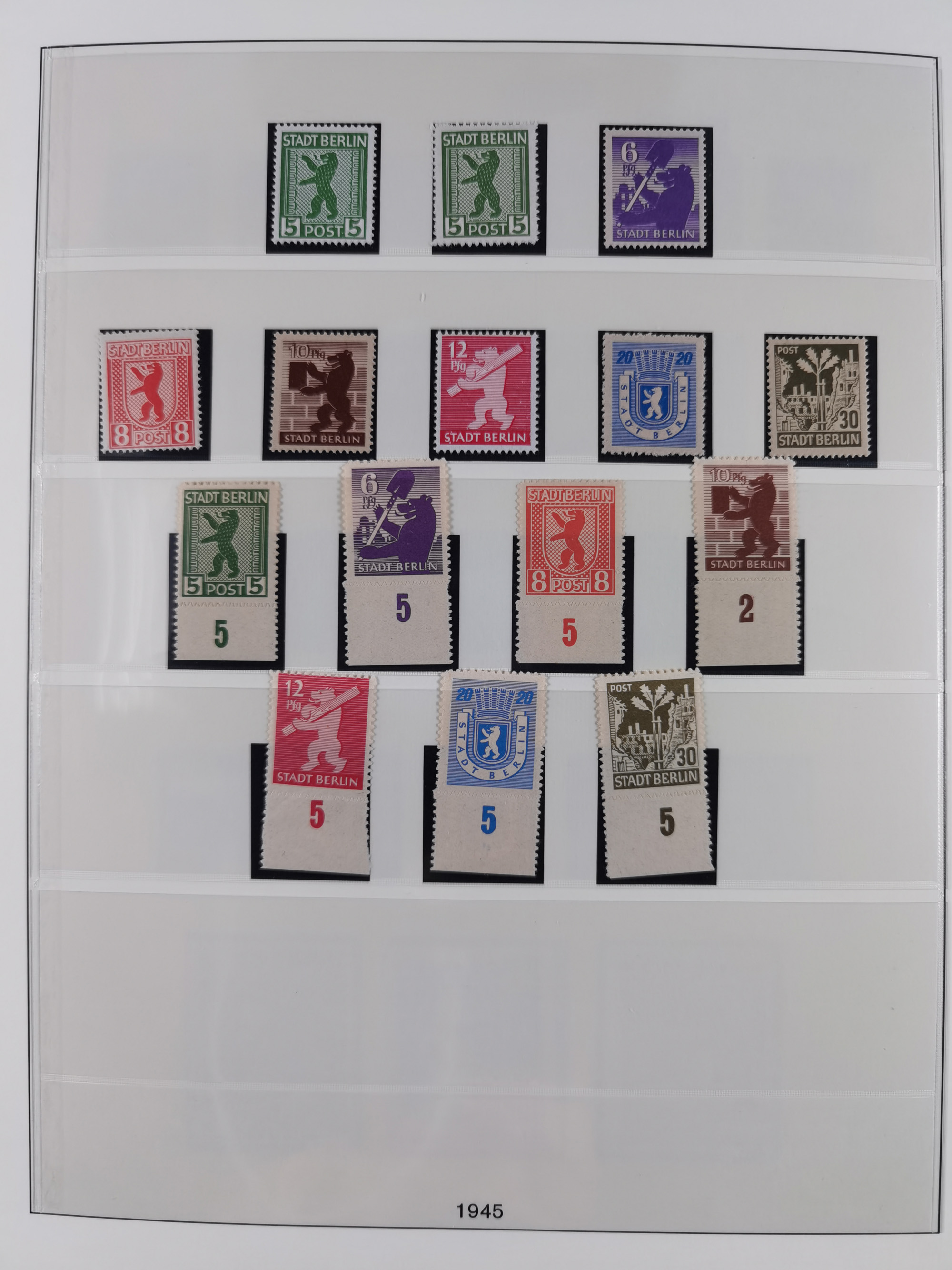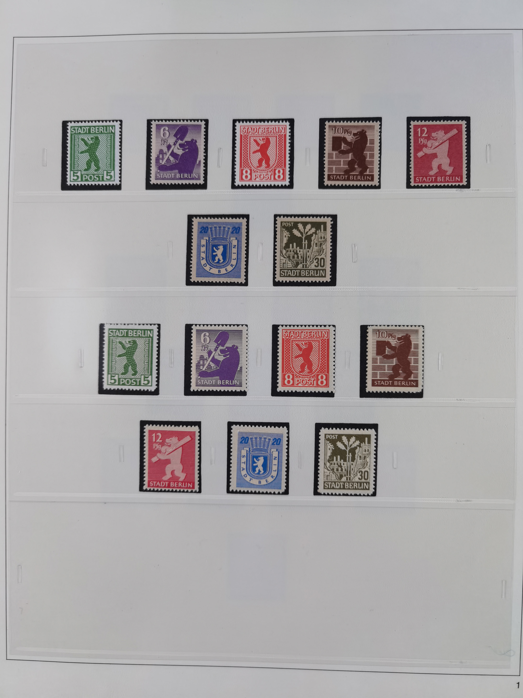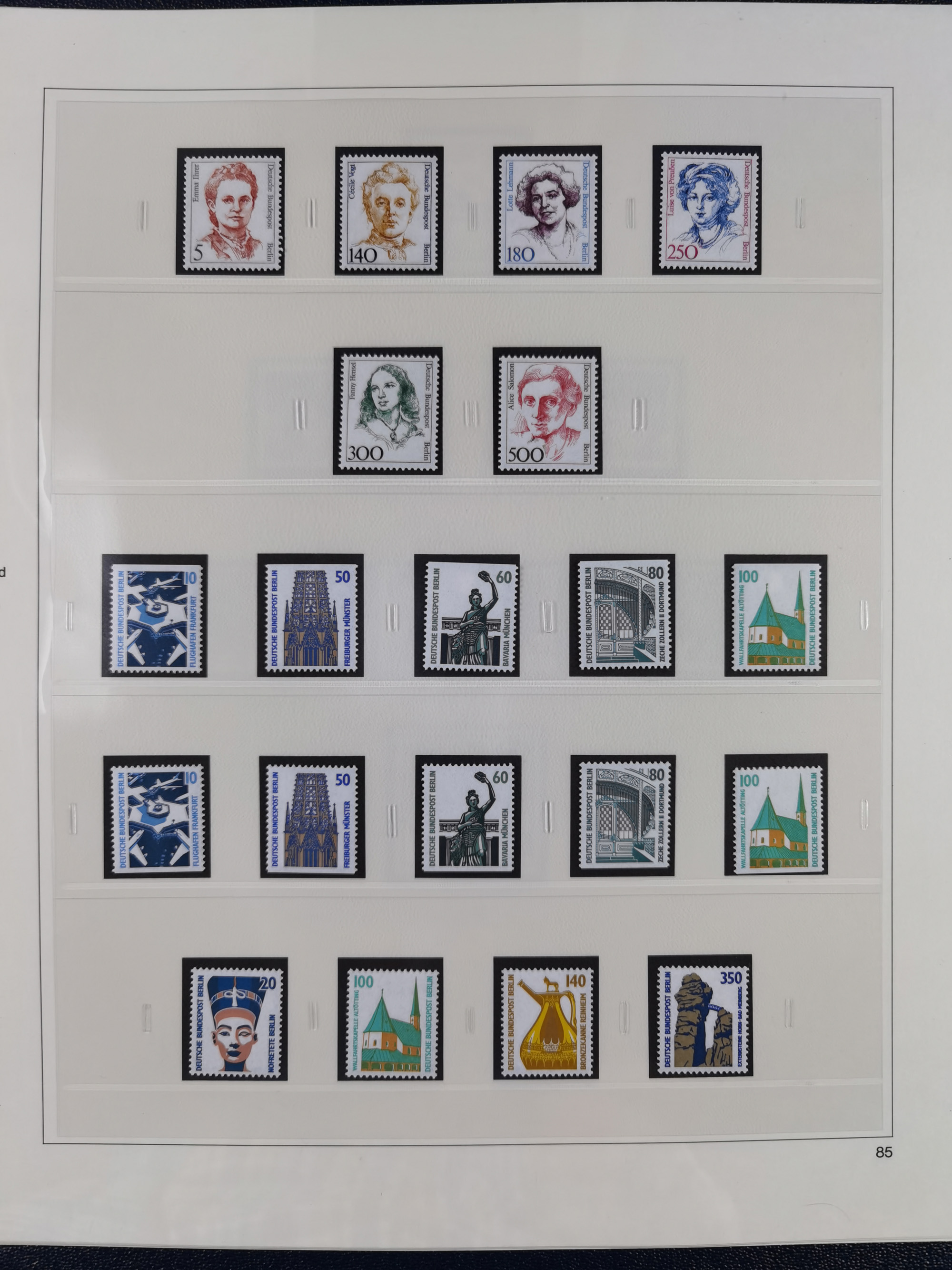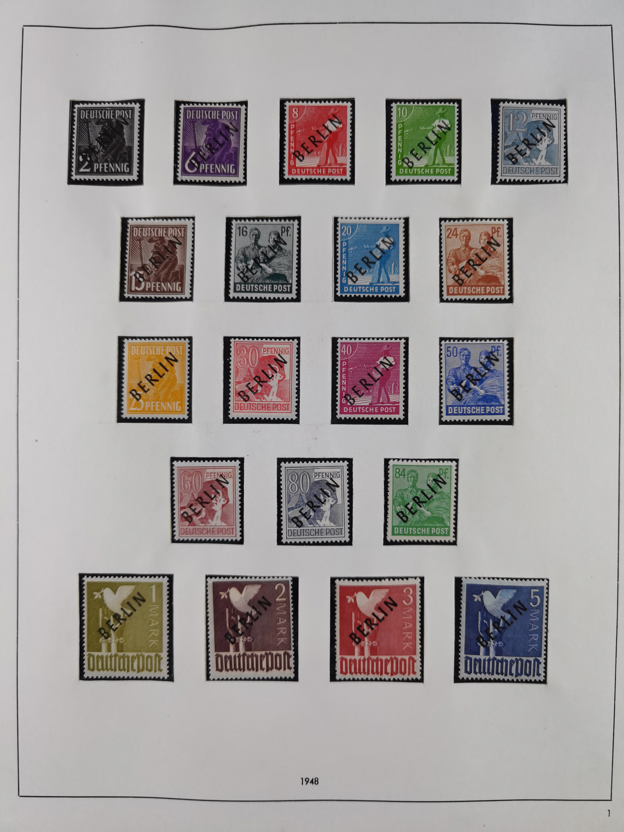 1948/2000, fast ausschließlich postfrischer Sammlungsbestand ab Berlin mit u.a. zwei Schwarzaufdruck-Sätzen, Bl. 1 je ungebraucht und nachgummiert, Bauten, Währungsgeschädigte, sowie besseren Ausgaben, Bundesrepublik 1951-2000 mit u.a. Posthorn 30, 50 und 70 Pfg. postfrisch, Heuss in großen Einheiten und mit Bogenrand, sowie einer fast kompletten Sammlung DDR, etliches mehrfach und mit Bogen- bzw. Eckrand, gute Erhaltung, in 17 Vordruckalben