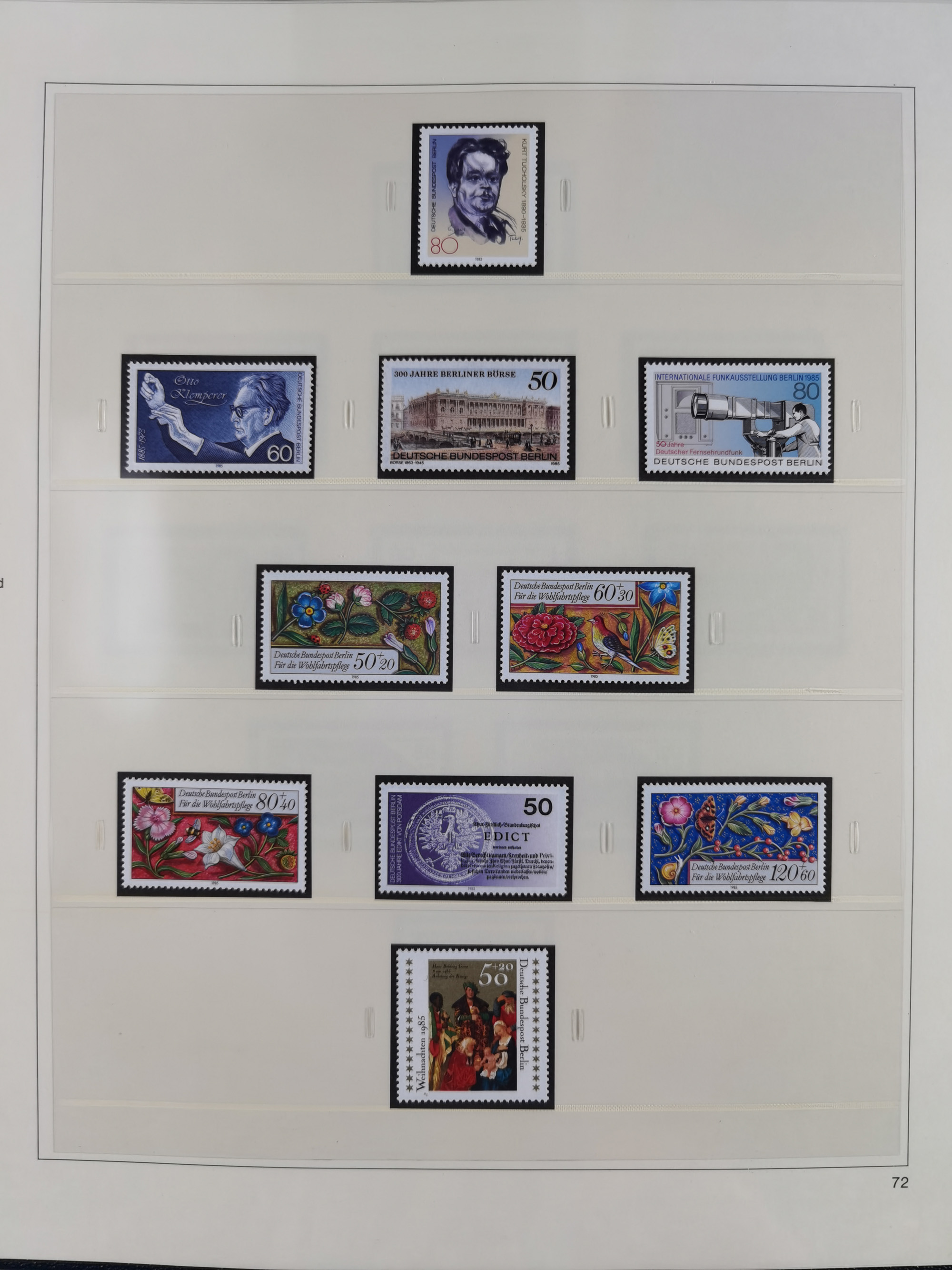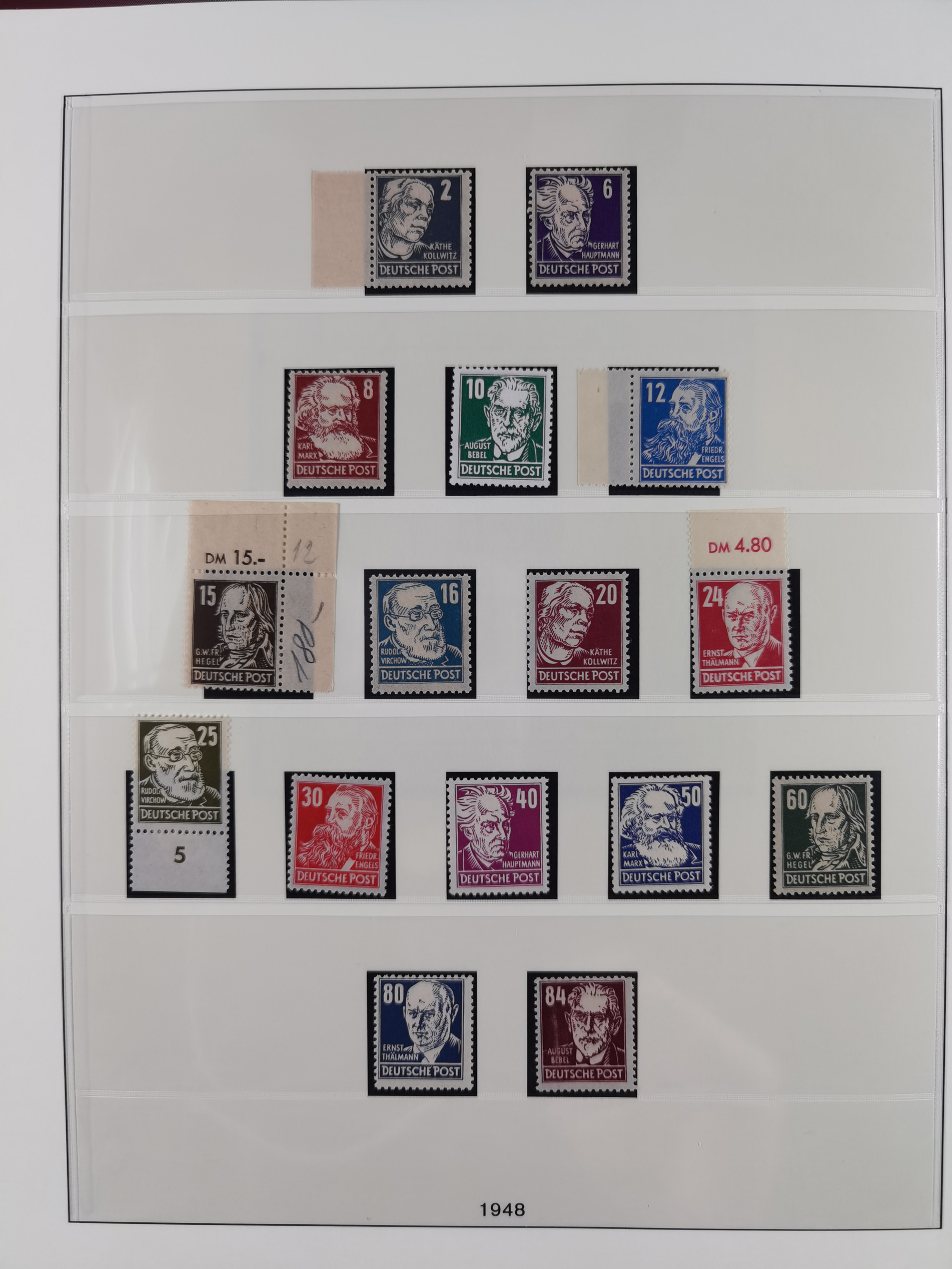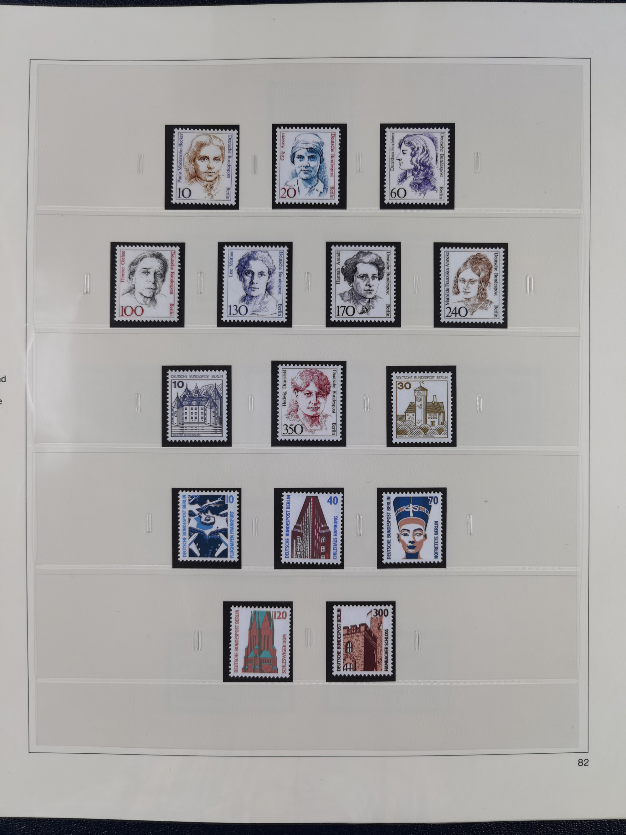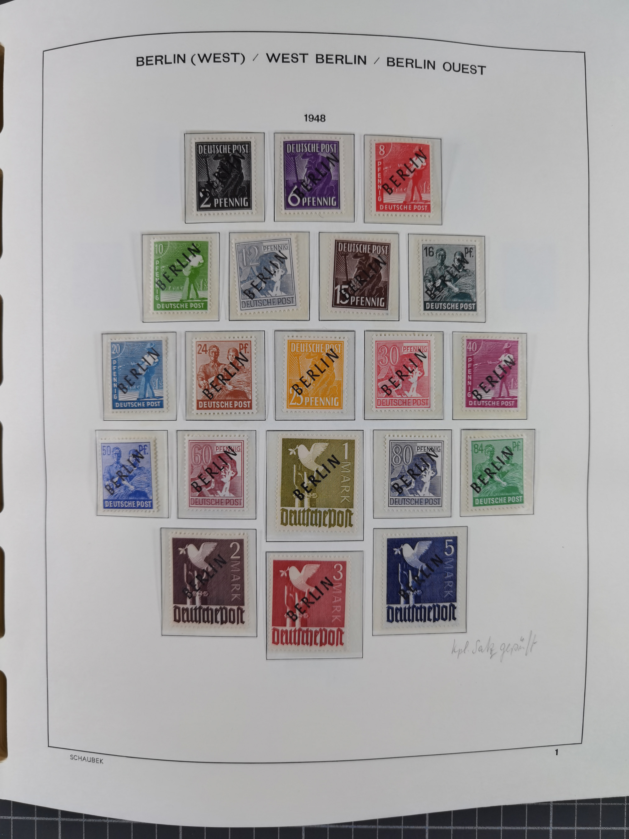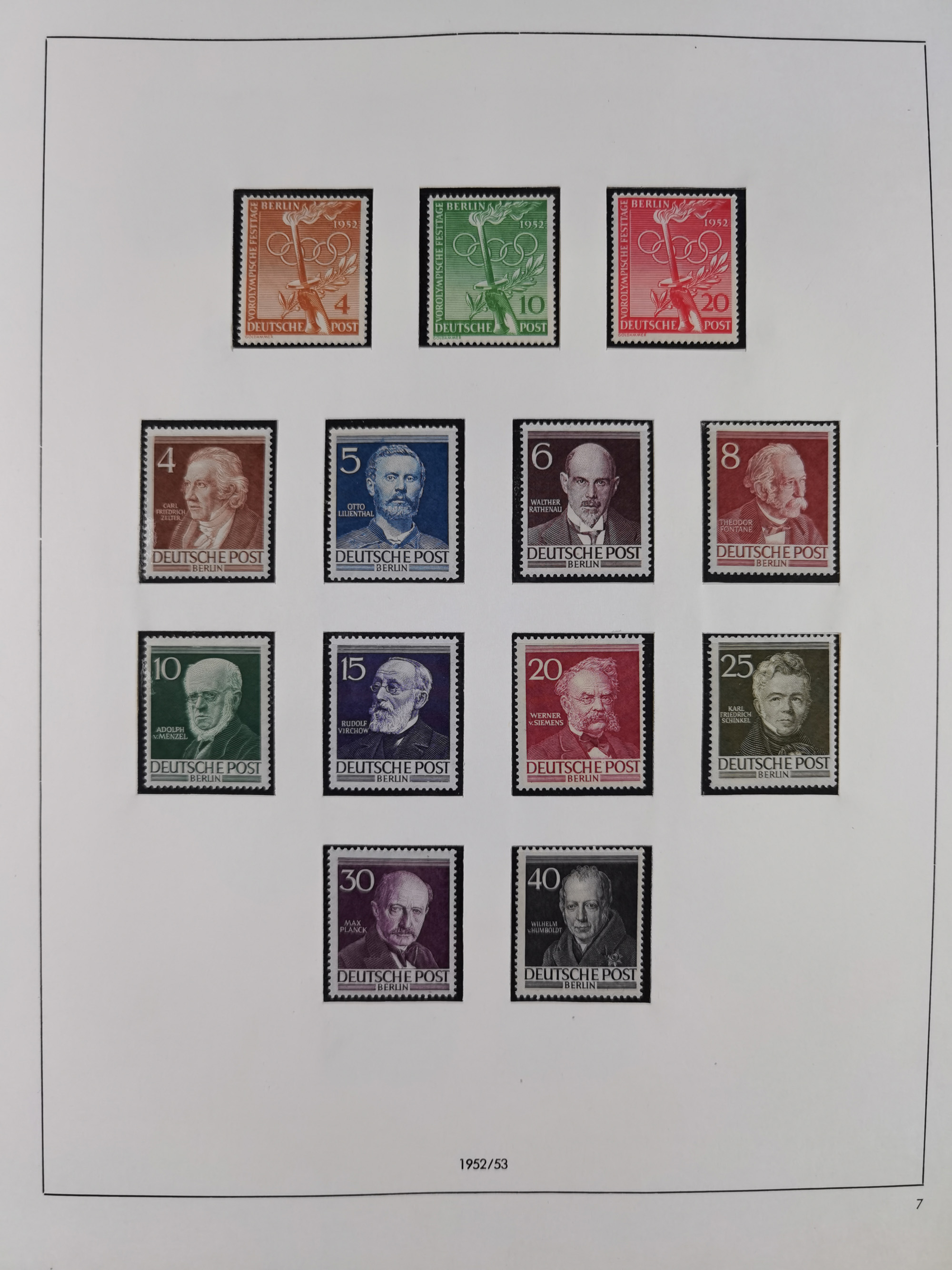 1948/2000, fast ausschließlich postfrischer Sammlungsbestand ab Berlin mit u.a. zwei Schwarzaufdruck-Sätzen, Bl. 1 je ungebraucht und nachgummiert, Bauten, Währungsgeschädigte, sowie besseren Ausgaben, Bundesrepublik 1951-2000 mit u.a. Posthorn 30, 50 und 70 Pfg. postfrisch, Heuss in großen Einheiten und mit Bogenrand, sowie einer fast kompletten Sammlung DDR, etliches mehrfach und mit Bogen- bzw. Eckrand, gute Erhaltung, in 17 Vordruckalben