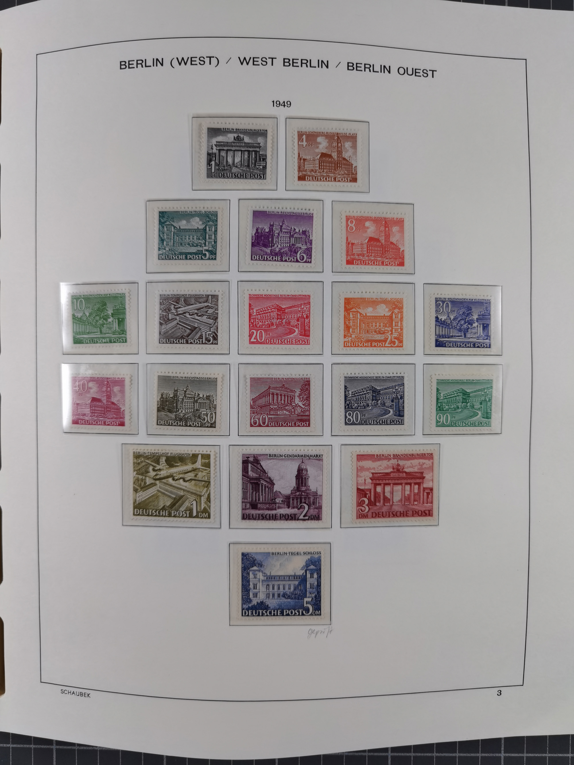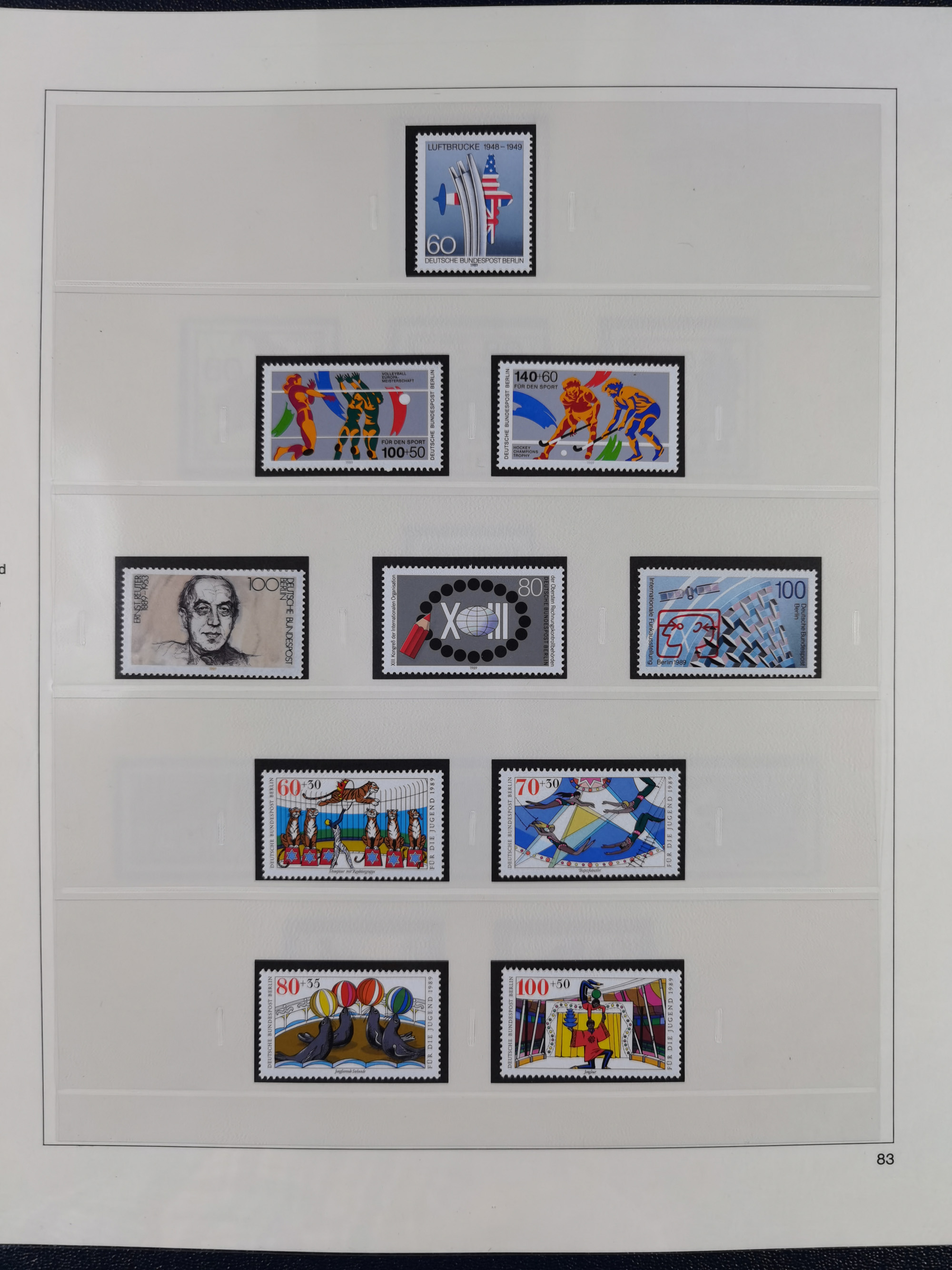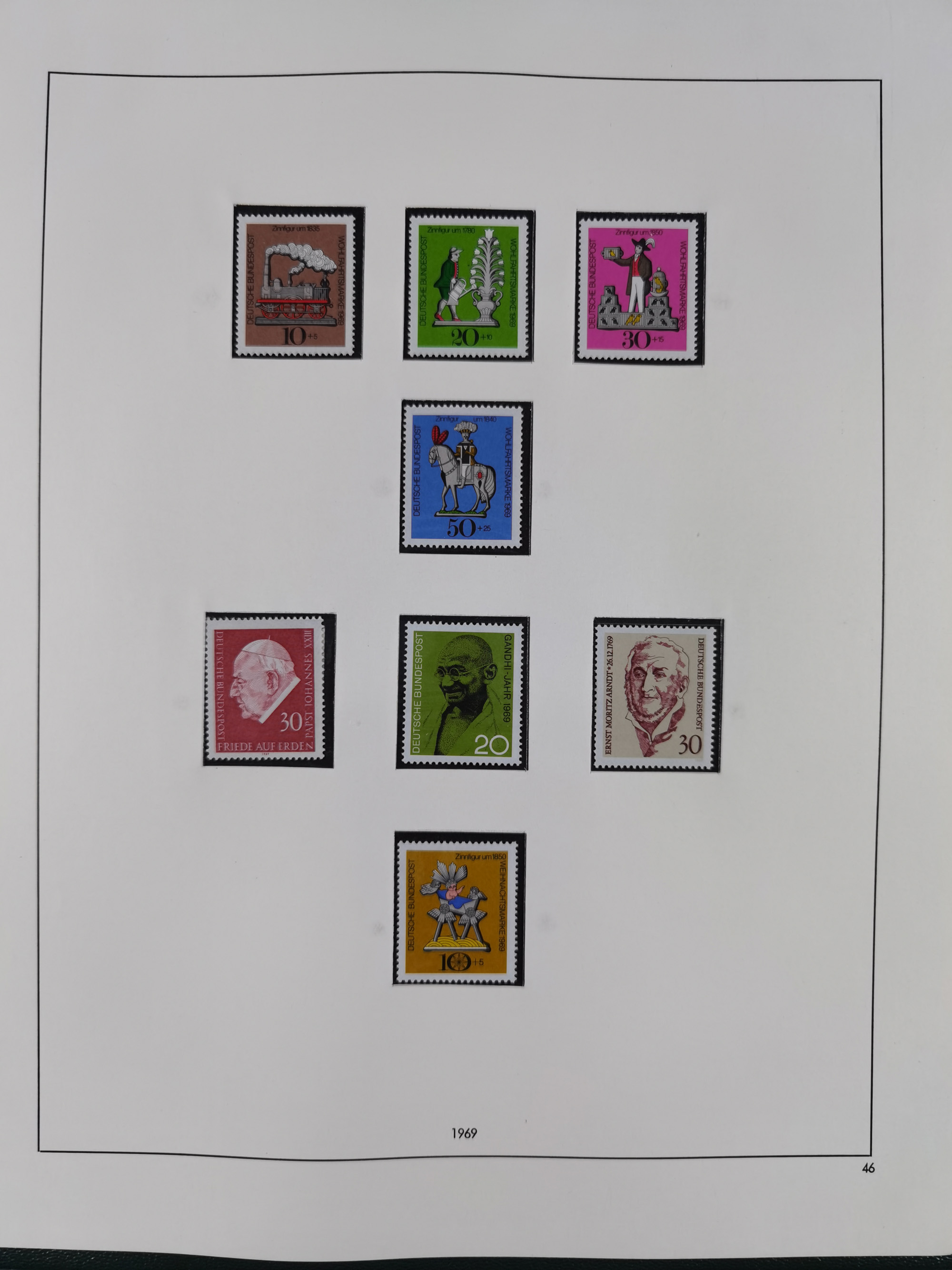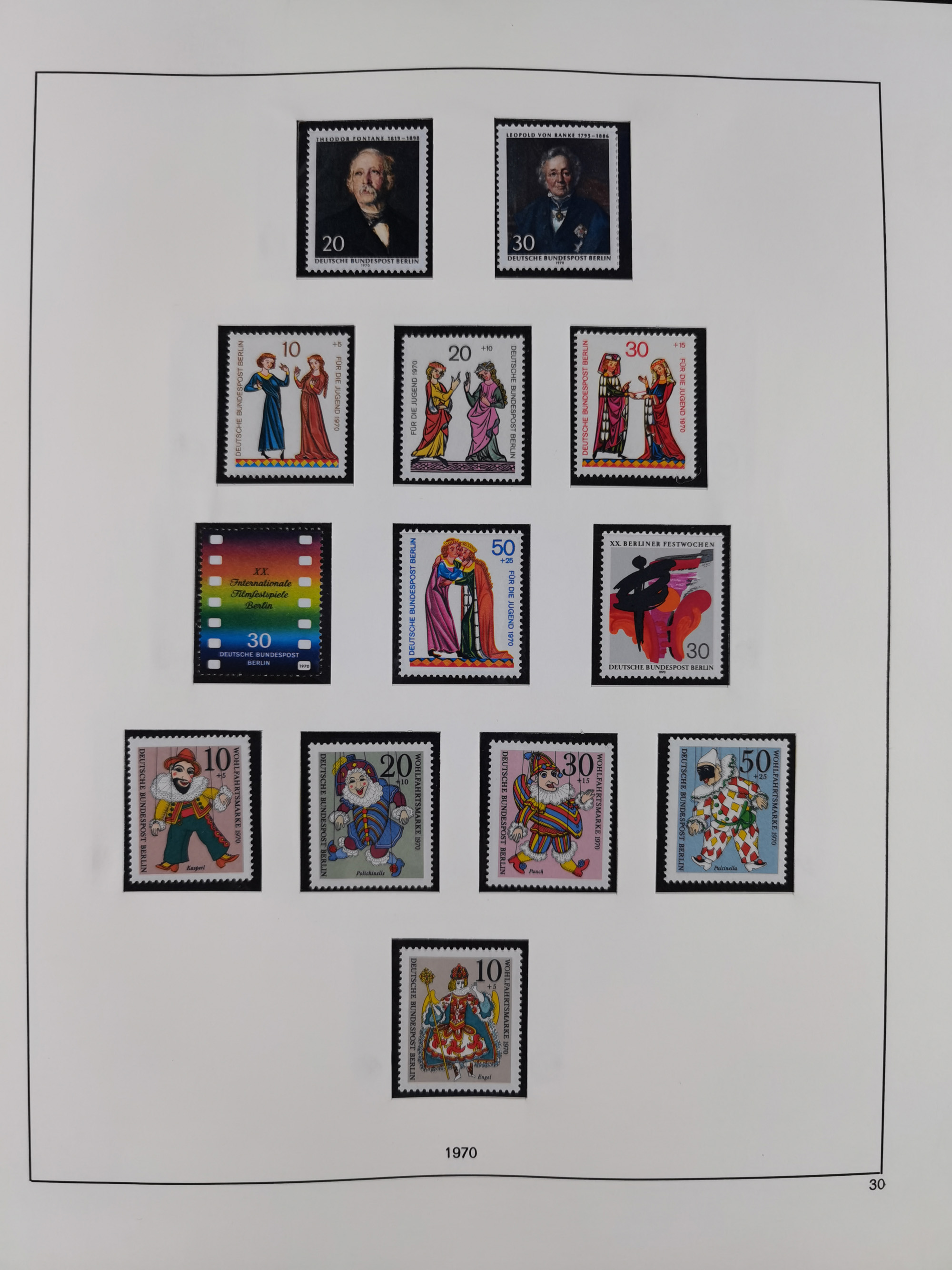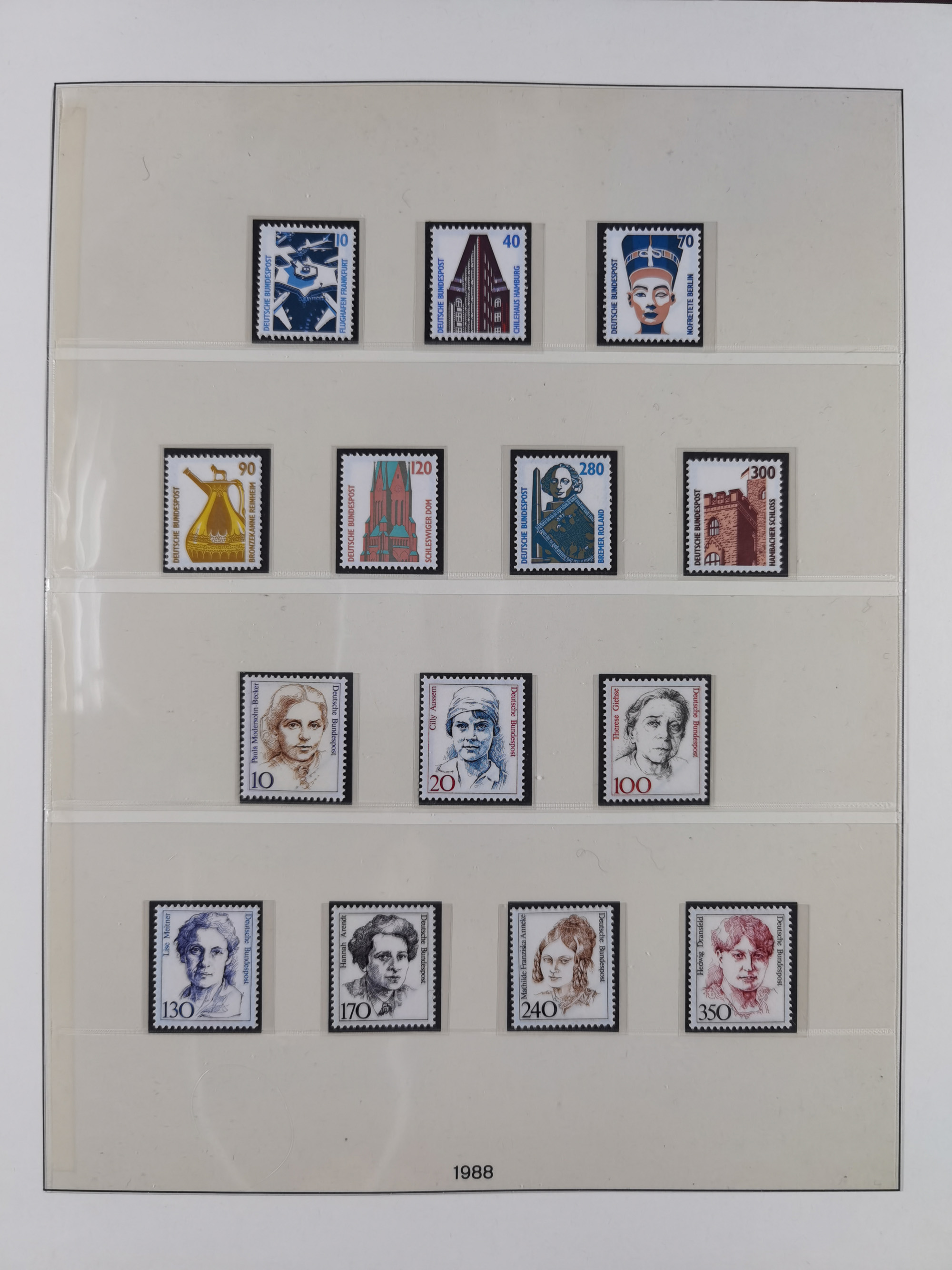 1948/2000, fast ausschließlich postfrischer Sammlungsbestand ab Berlin mit u.a. zwei Schwarzaufdruck-Sätzen, Bl. 1 je ungebraucht und nachgummiert, Bauten, Währungsgeschädigte, sowie besseren Ausgaben, Bundesrepublik 1951-2000 mit u.a. Posthorn 30, 50 und 70 Pfg. postfrisch, Heuss in großen Einheiten und mit Bogenrand, sowie einer fast kompletten Sammlung DDR, etliches mehrfach und mit Bogen- bzw. Eckrand, gute Erhaltung, in 17 Vordruckalben