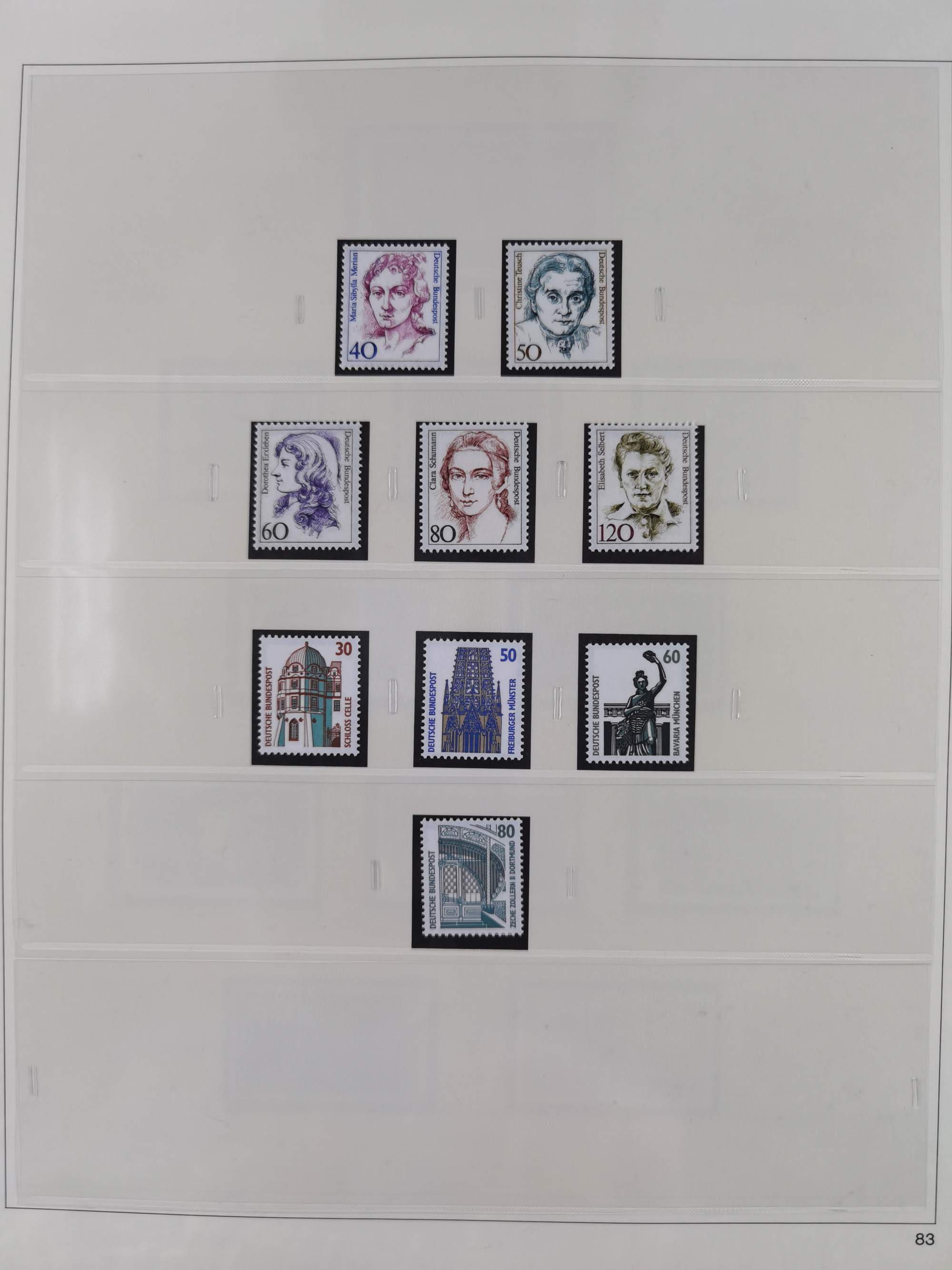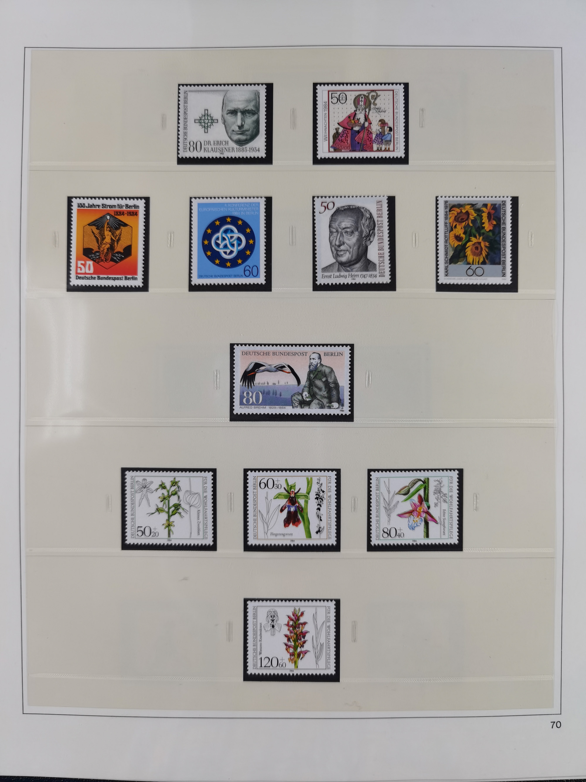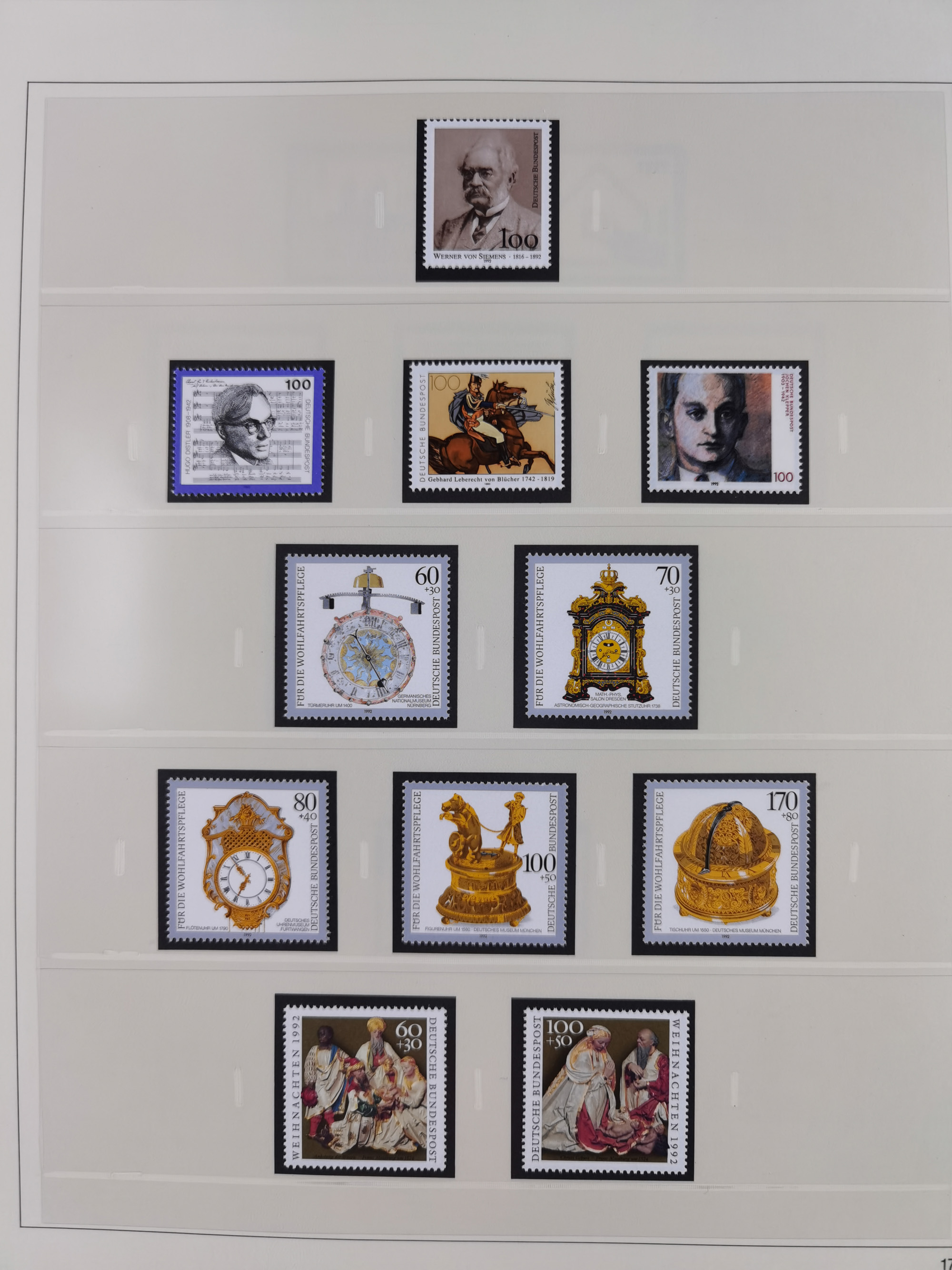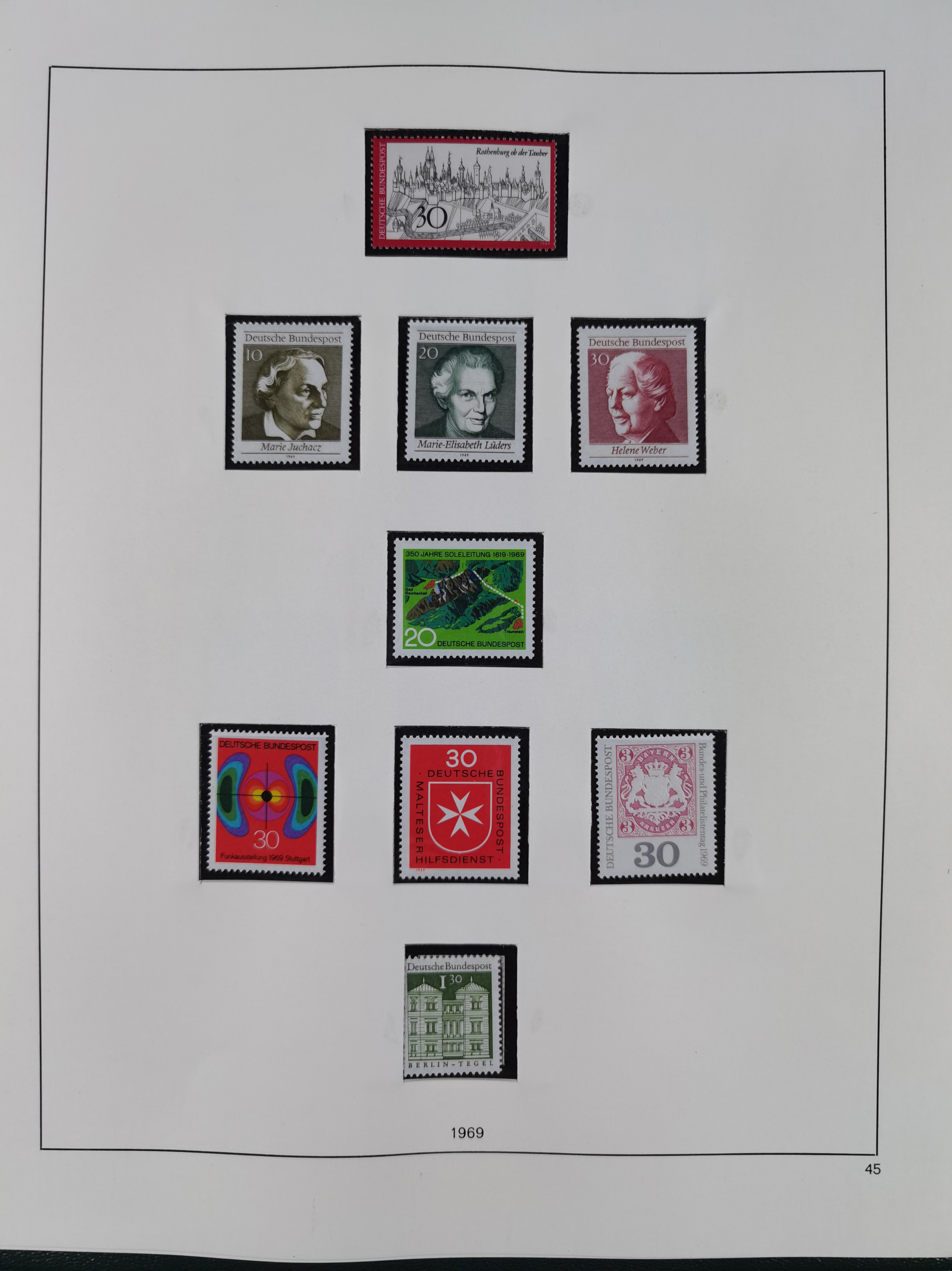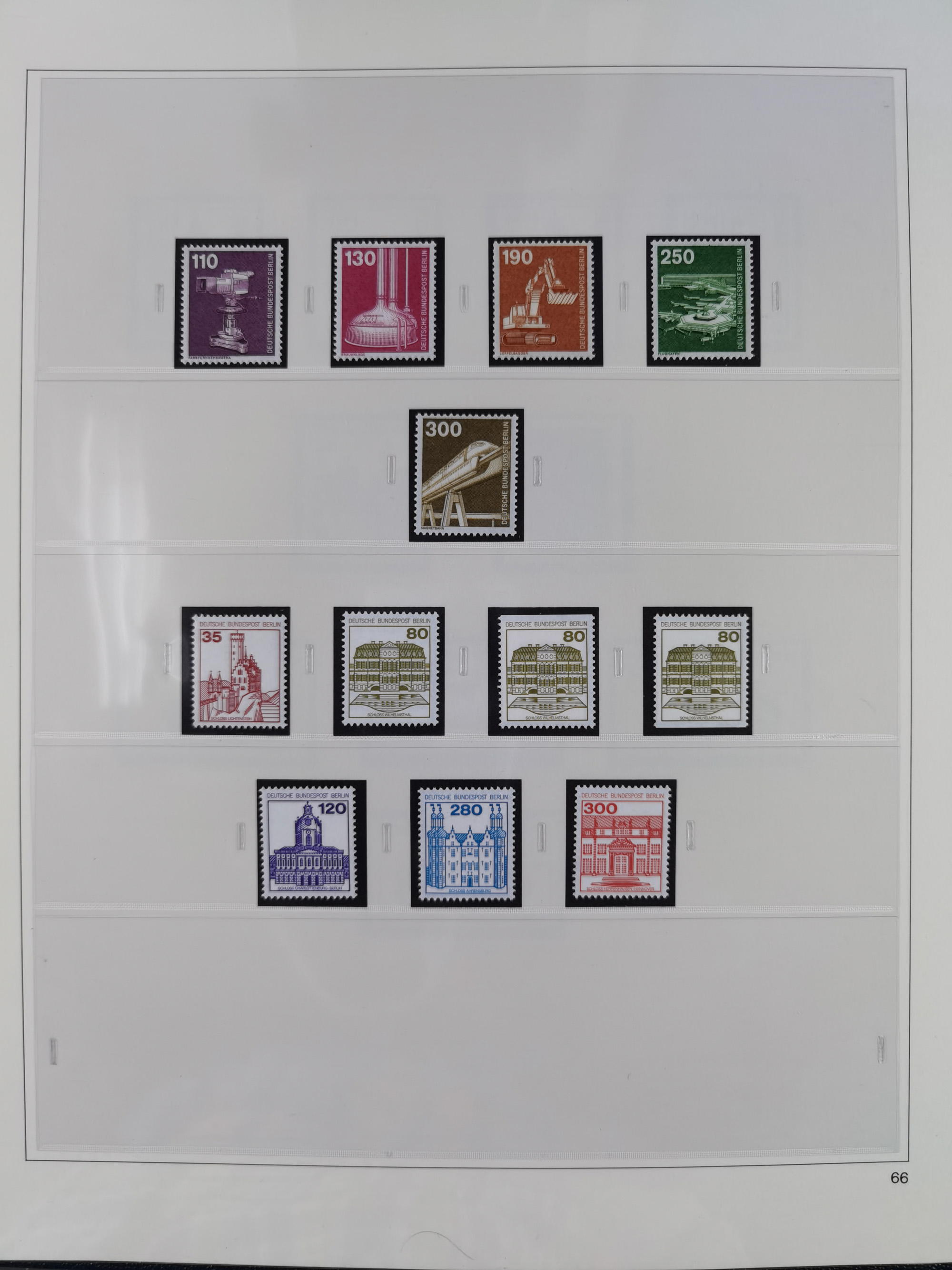 1948/2000, fast ausschließlich postfrischer Sammlungsbestand ab Berlin mit u.a. zwei Schwarzaufdruck-Sätzen, Bl. 1 je ungebraucht und nachgummiert, Bauten, Währungsgeschädigte, sowie besseren Ausgaben, Bundesrepublik 1951-2000 mit u.a. Posthorn 30, 50 und 70 Pfg. postfrisch, Heuss in großen Einheiten und mit Bogenrand, sowie einer fast kompletten Sammlung DDR, etliches mehrfach und mit Bogen- bzw. Eckrand, gute Erhaltung, in 17 Vordruckalben