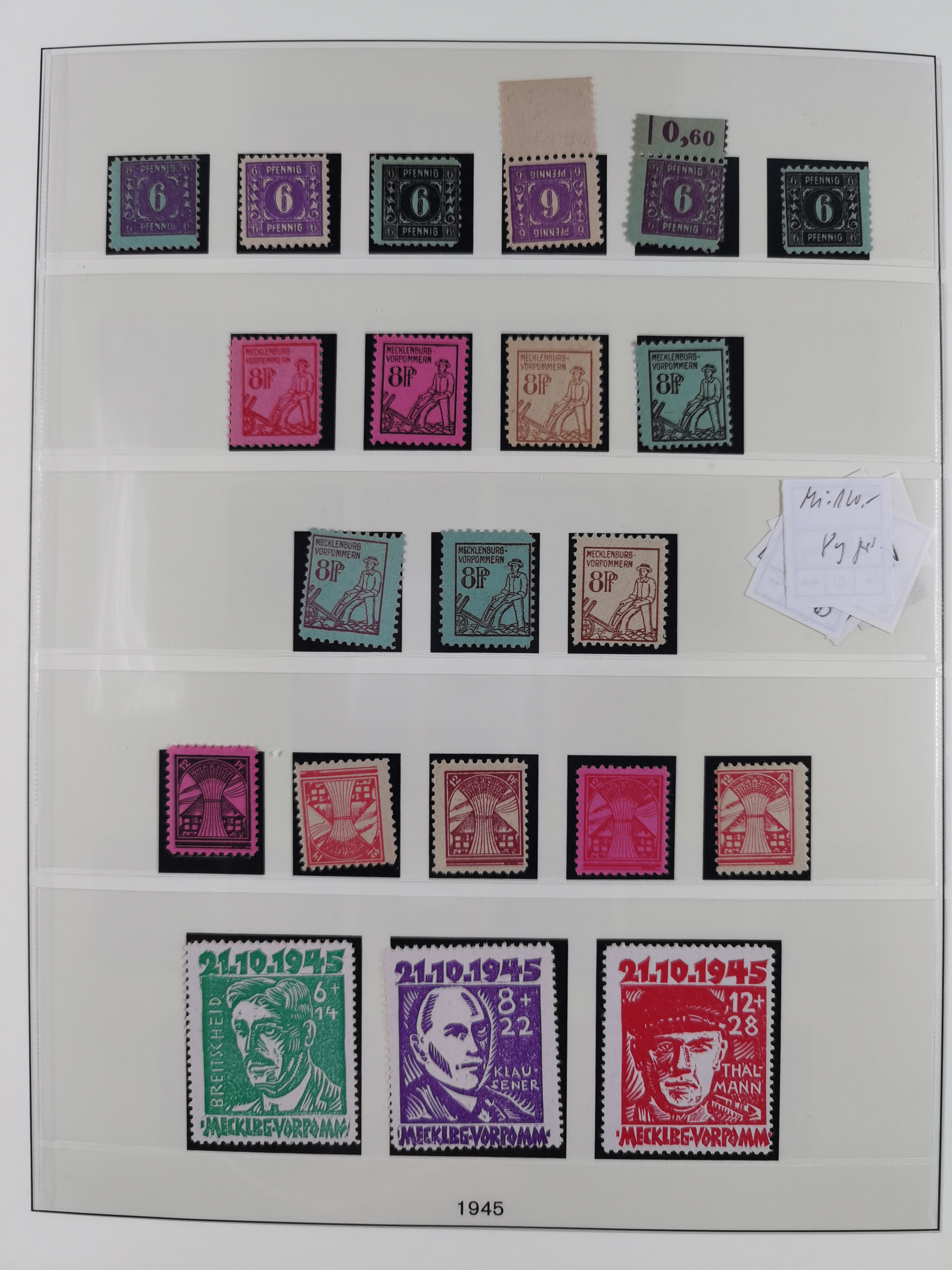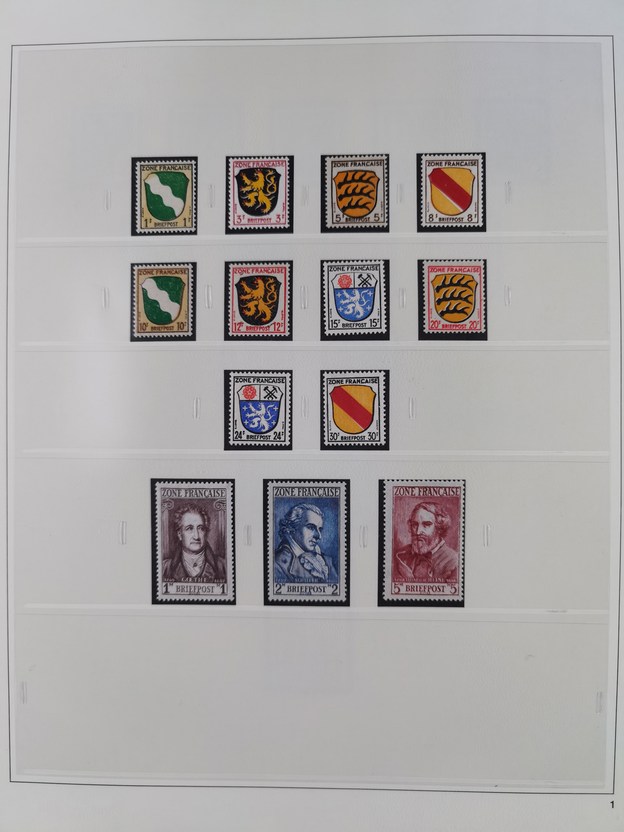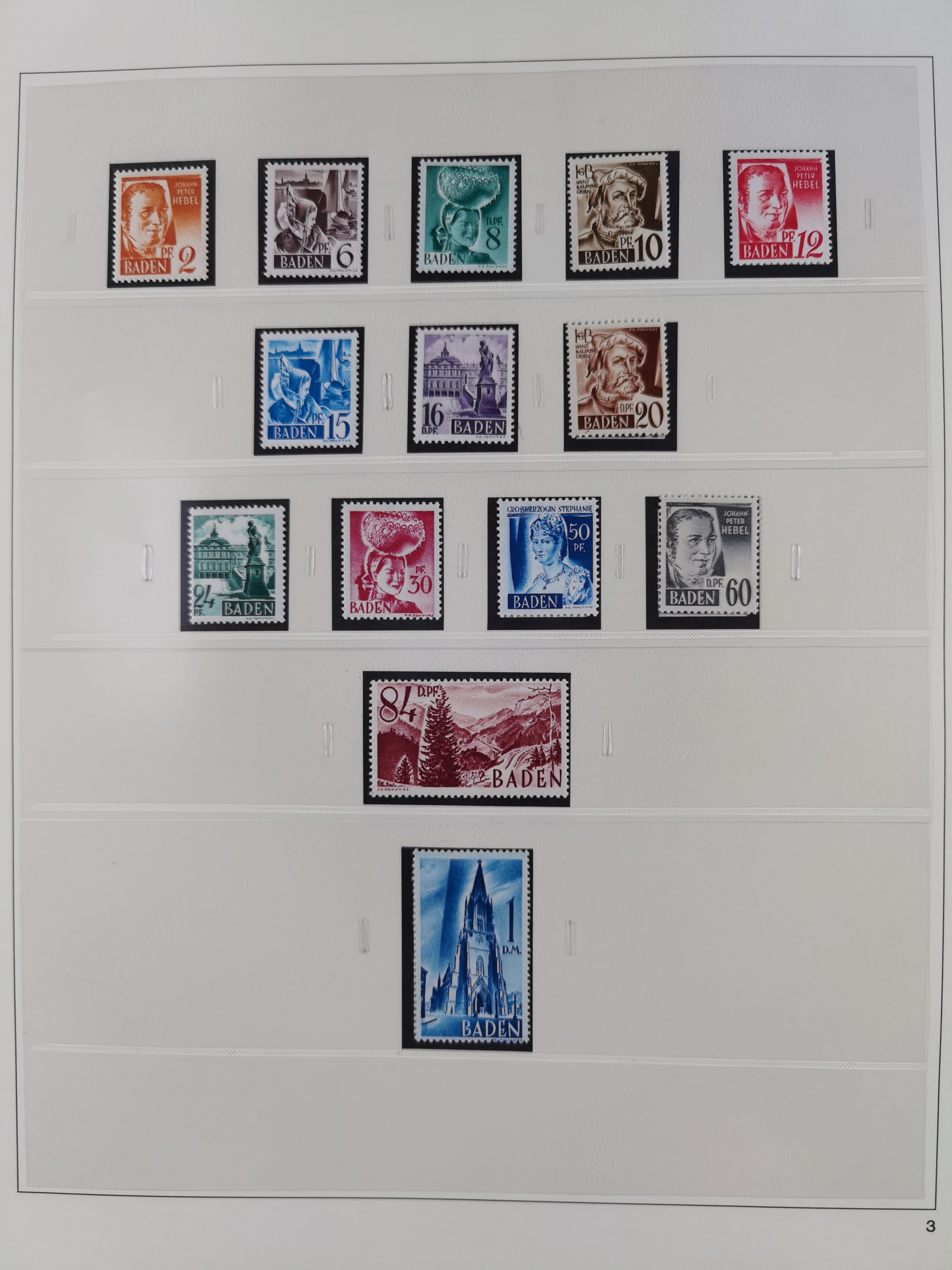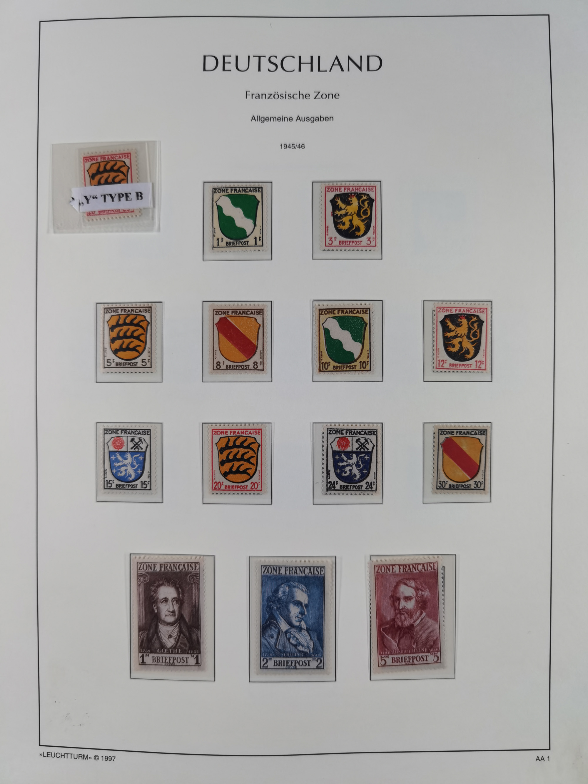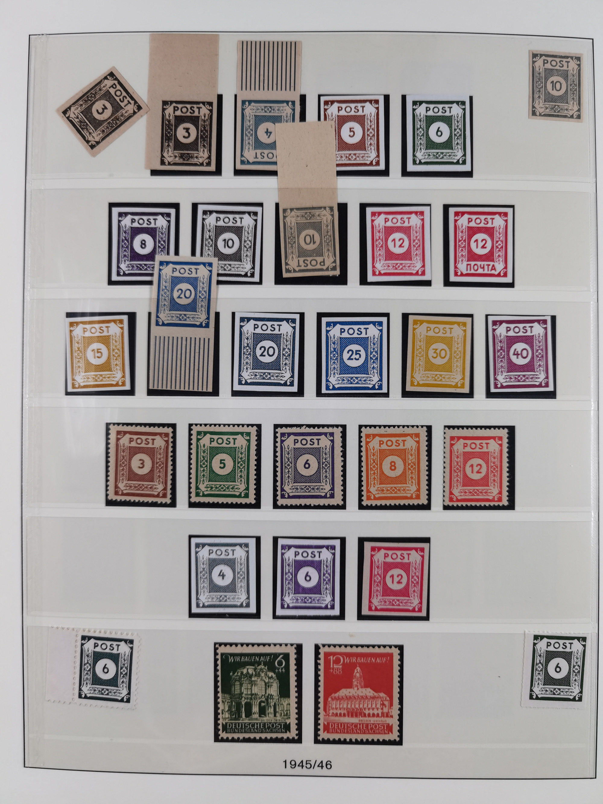 1945/49, in den Hauptnummern augenscheinlich bis auf Potschta (verlaufene Gummierung) postfrische komplette Sammlungen SBZ inkl. Blocks mit Bl. 1t und Französische Zone, inkl. Blocks mit Baden Mi.-Nr. 46II postfrisch sign. Schlegel BPP, dort einiges sign. Schlegel BPP, gute Erhaltung, im Vordruckalbum