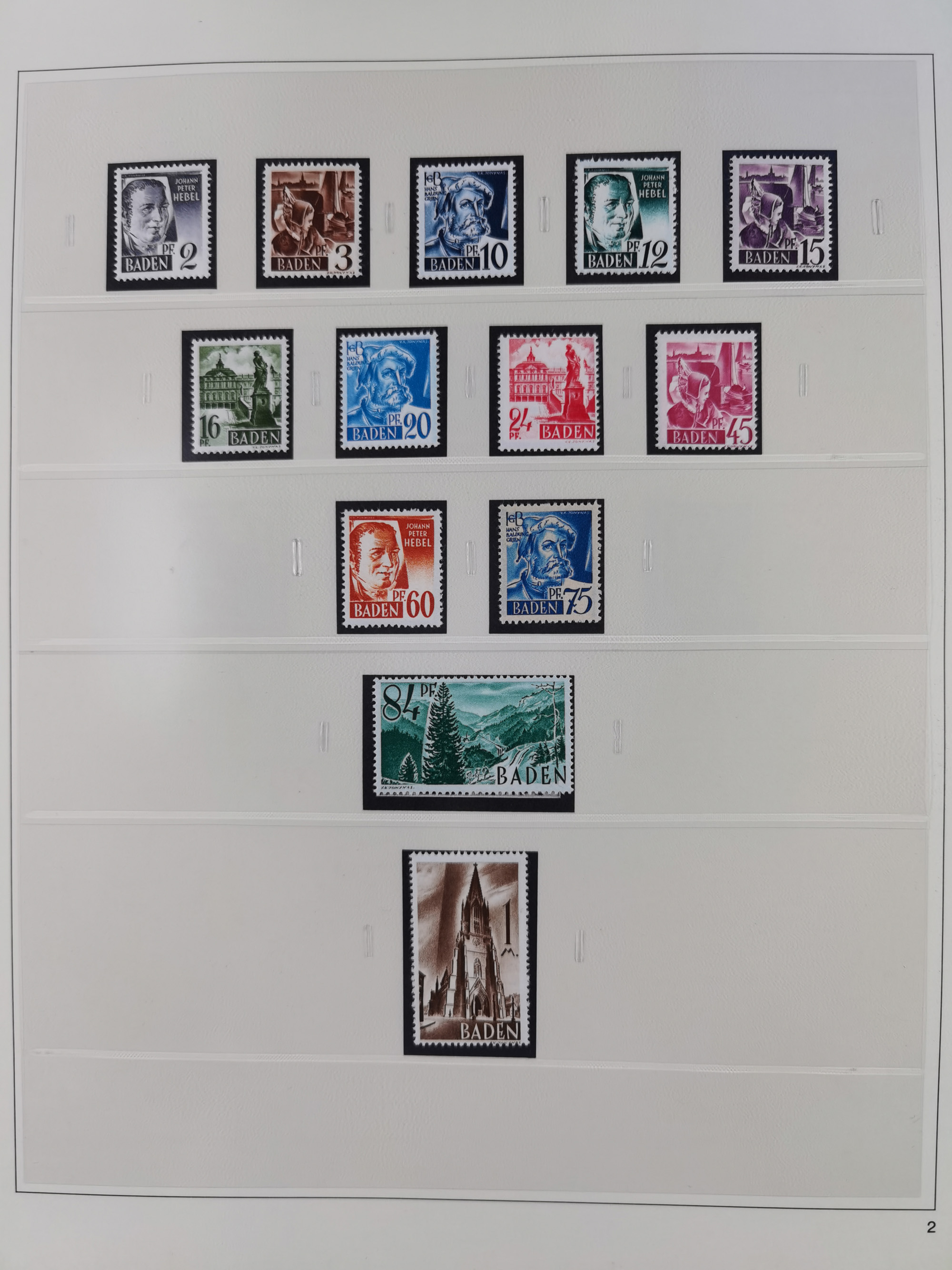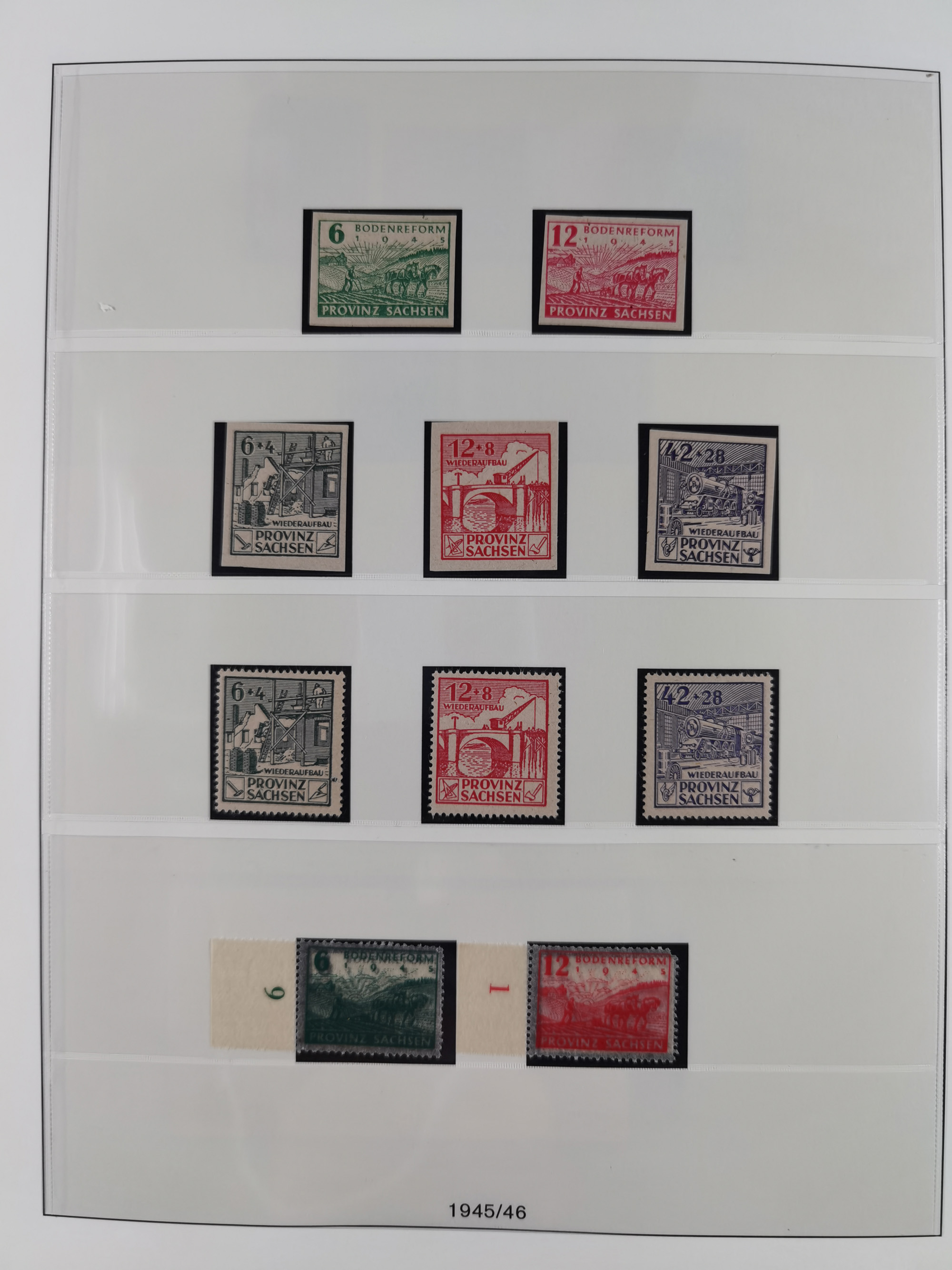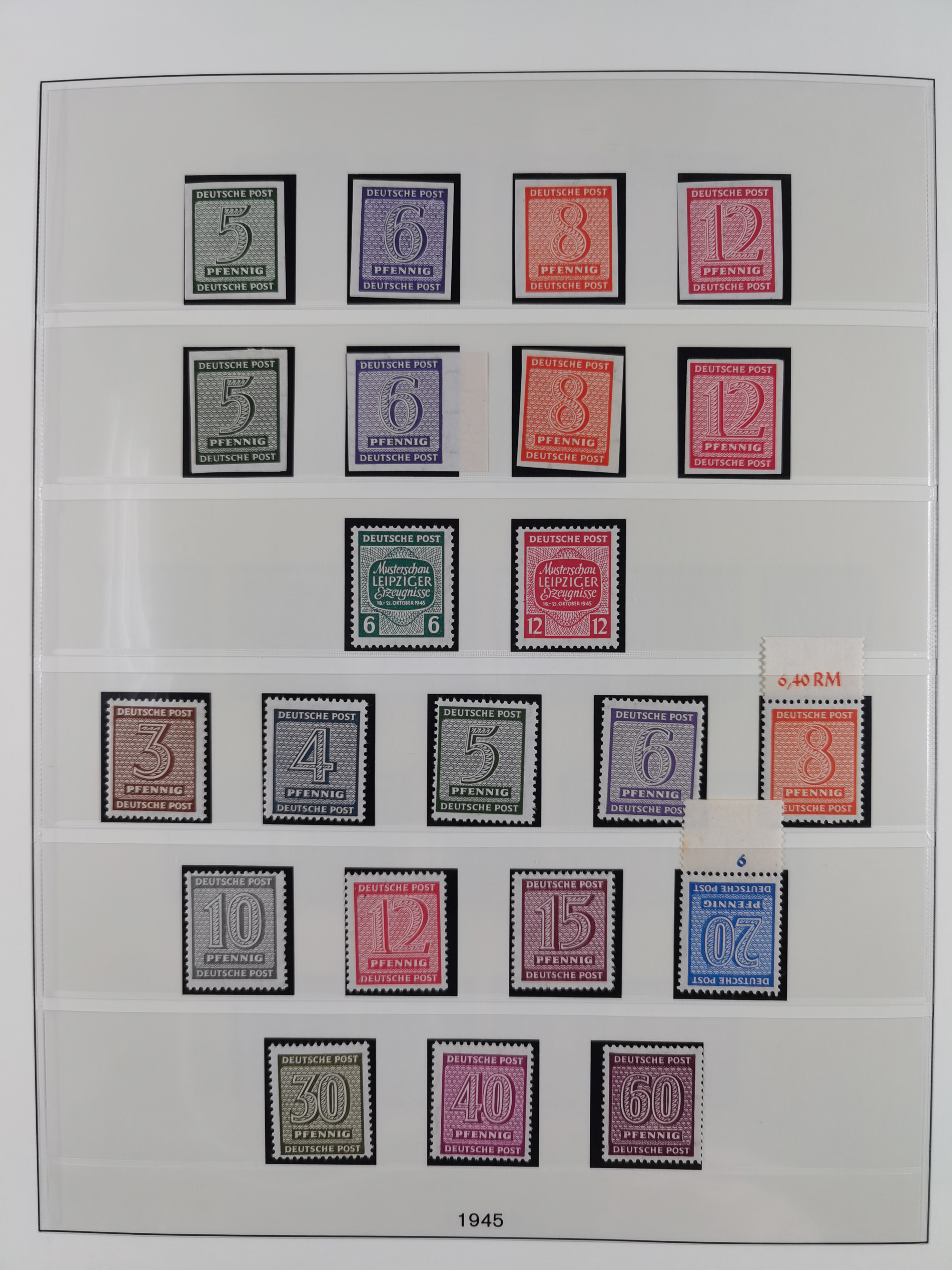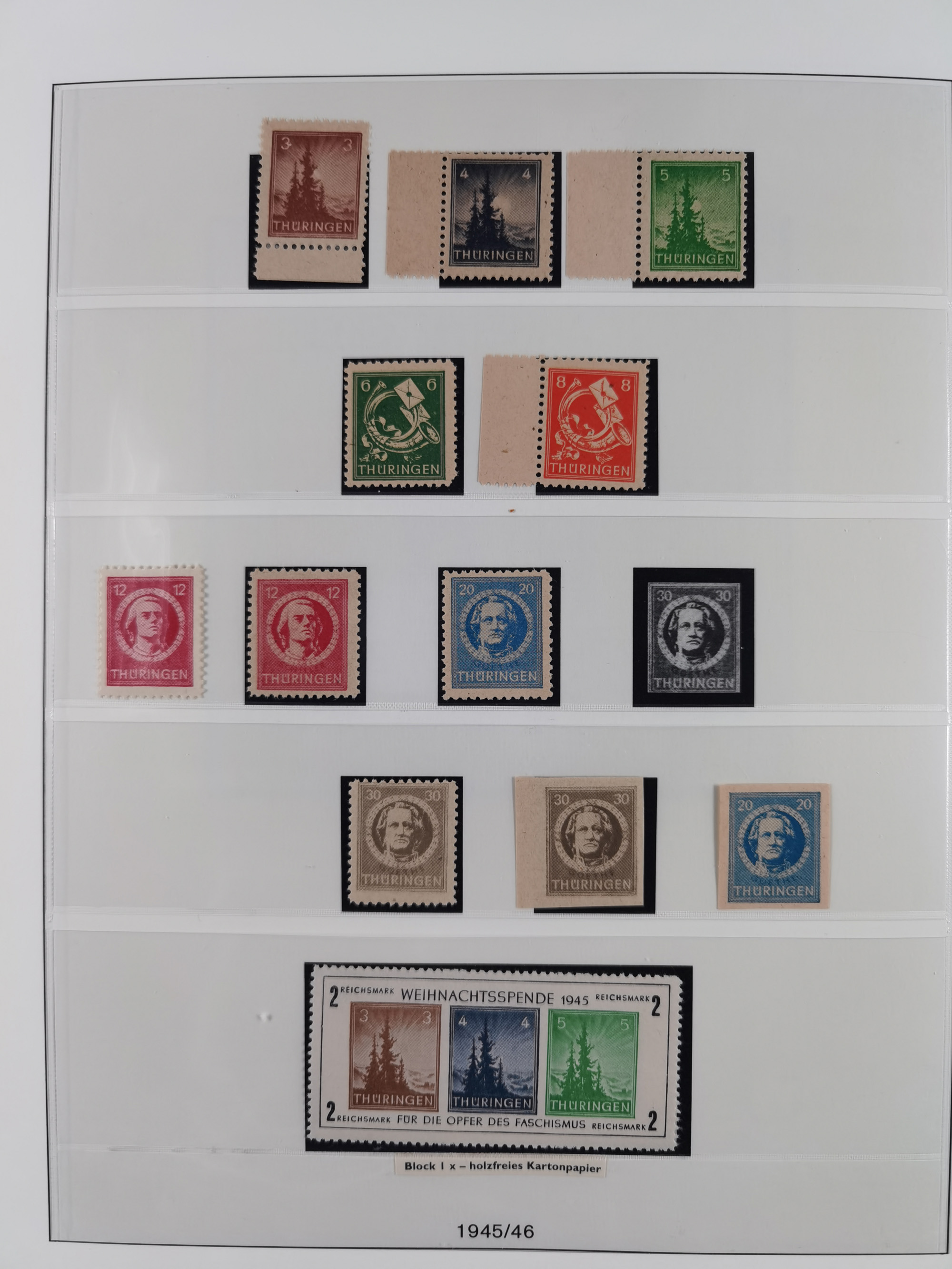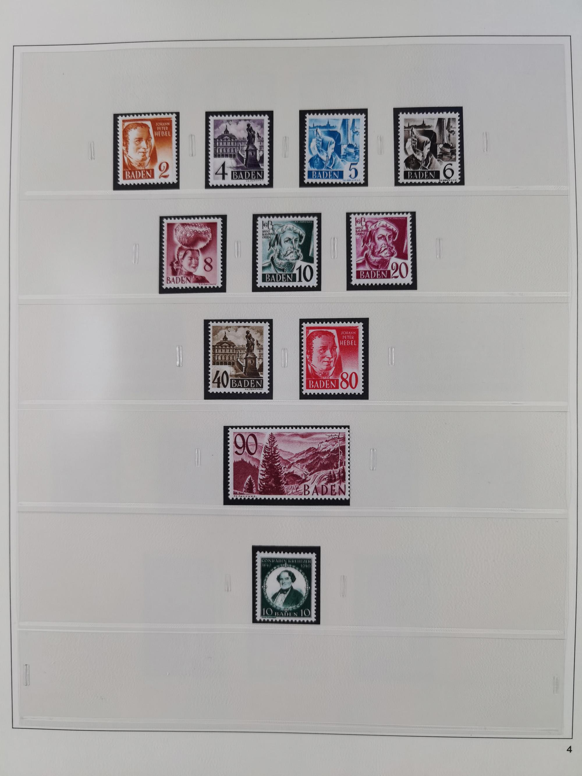 1945/49, in den Hauptnummern augenscheinlich bis auf Potschta (verlaufene Gummierung) postfrische komplette Sammlungen SBZ inkl. Blocks mit Bl. 1t und Französische Zone, inkl. Blocks mit Baden Mi.-Nr. 46II postfrisch sign. Schlegel BPP, dort einiges sign. Schlegel BPP, gute Erhaltung, im Vordruckalbum