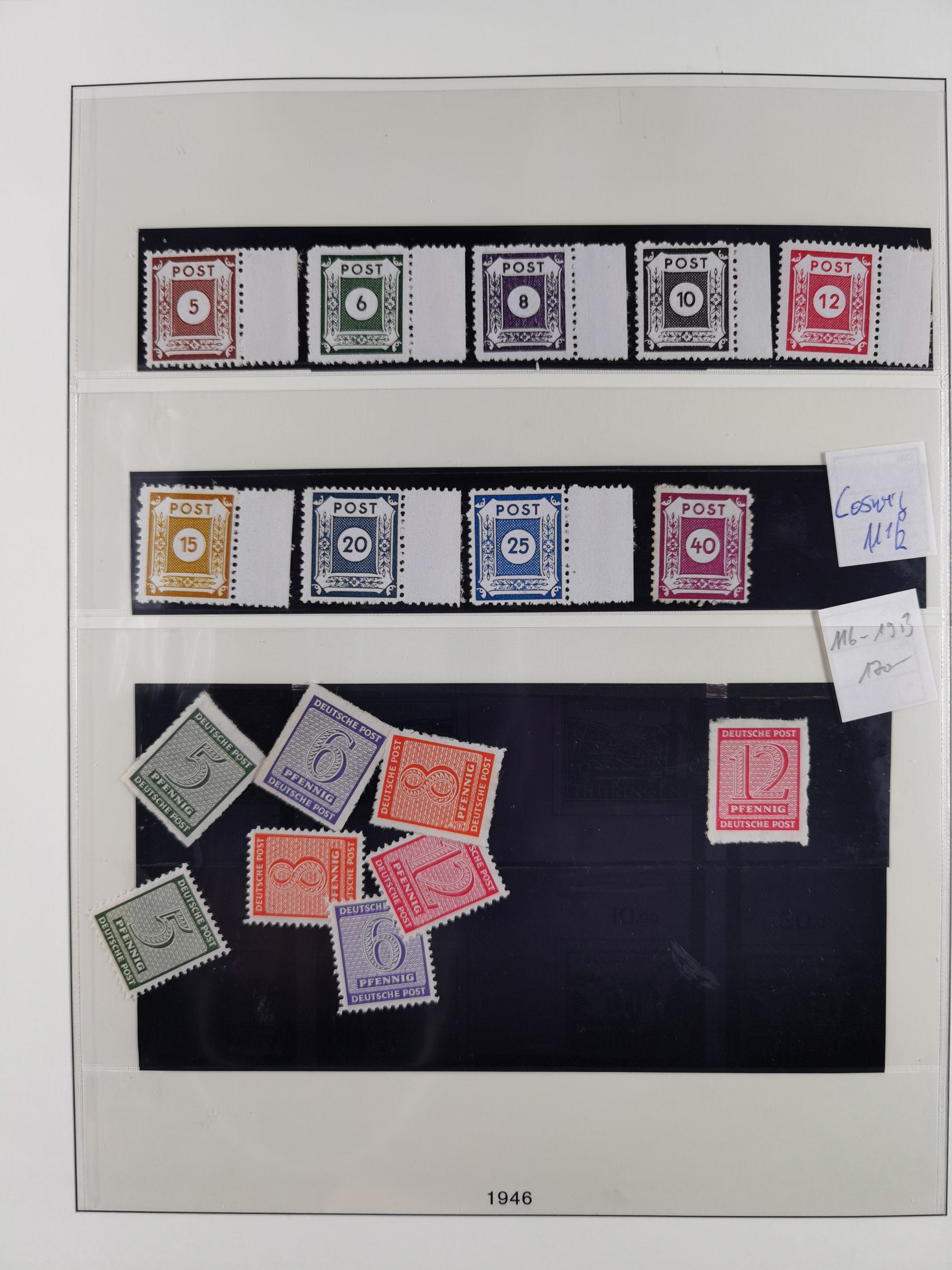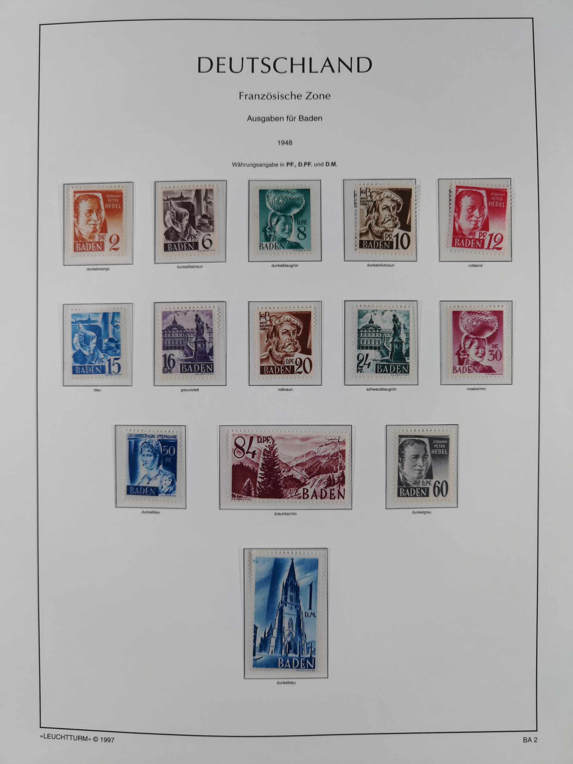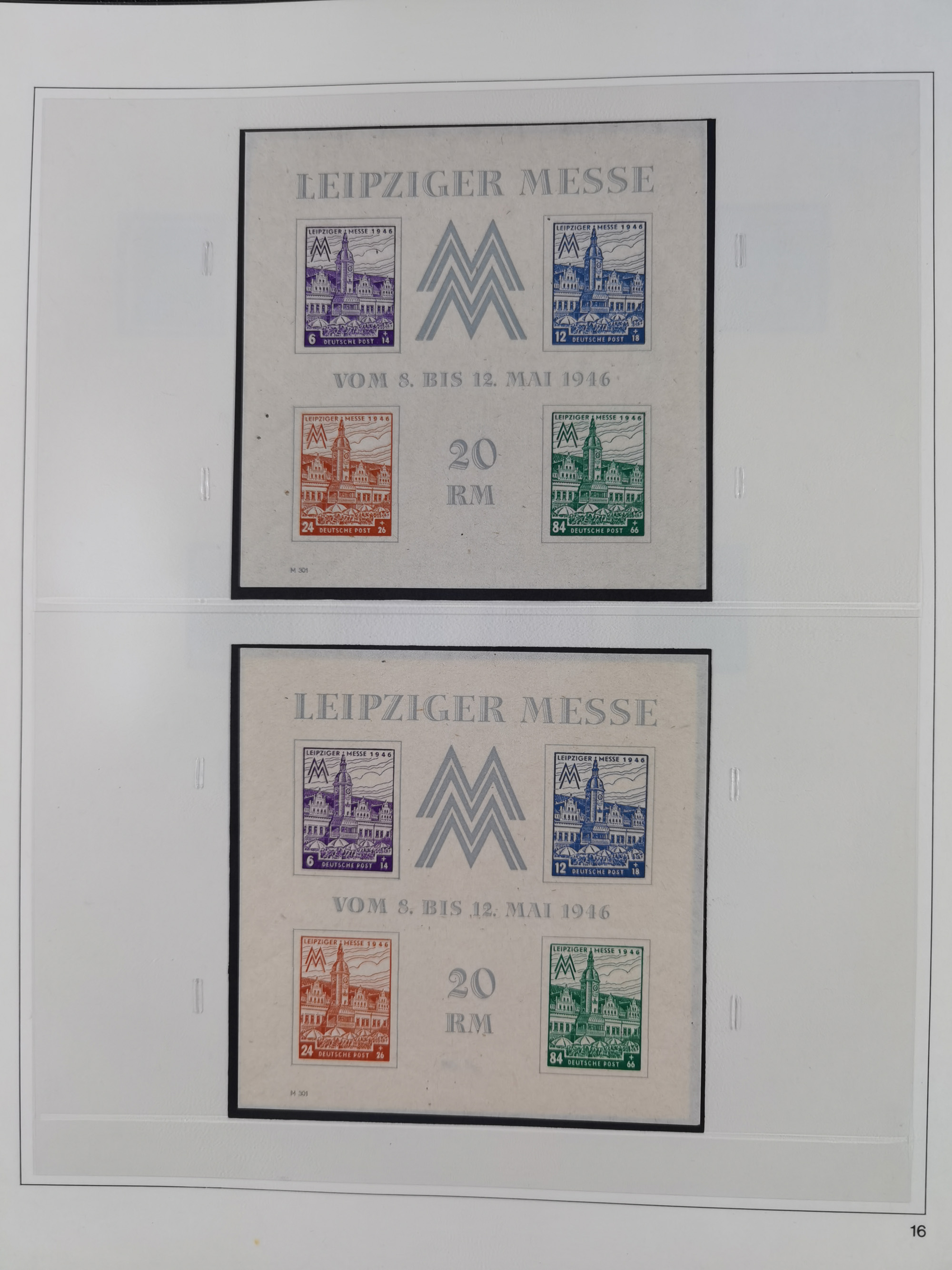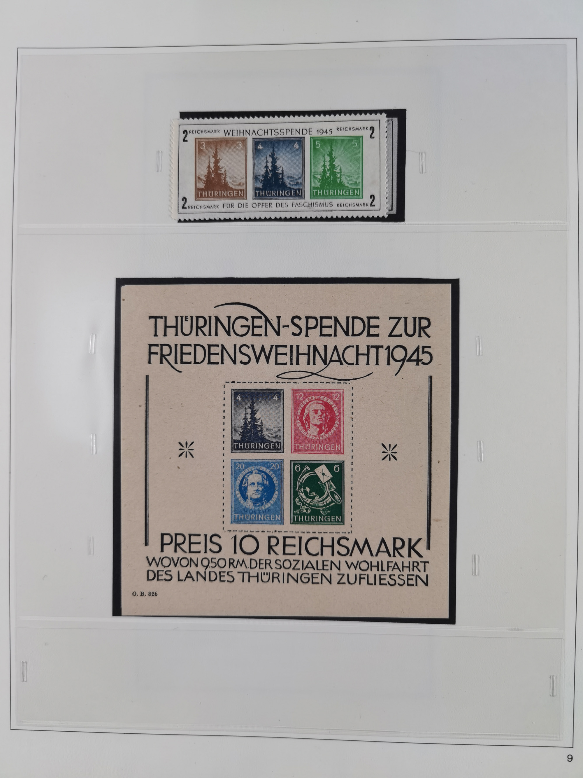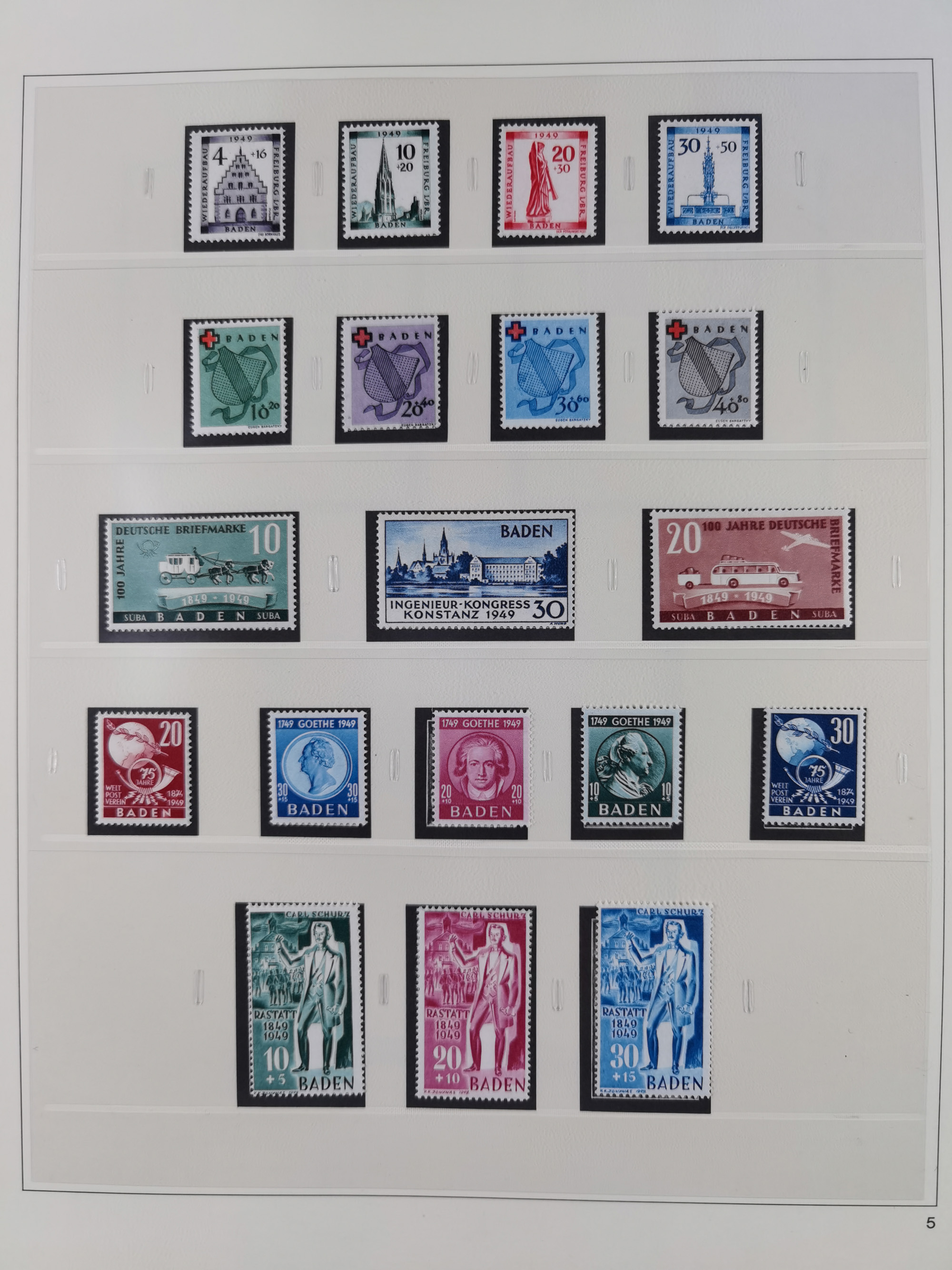 1945/49, in den Hauptnummern augenscheinlich bis auf Potschta (verlaufene Gummierung) postfrische komplette Sammlungen SBZ inkl. Blocks mit Bl. 1t und Französische Zone, inkl. Blocks mit Baden Mi.-Nr. 46II postfrisch sign. Schlegel BPP, dort einiges sign. Schlegel BPP, gute Erhaltung, im Vordruckalbum