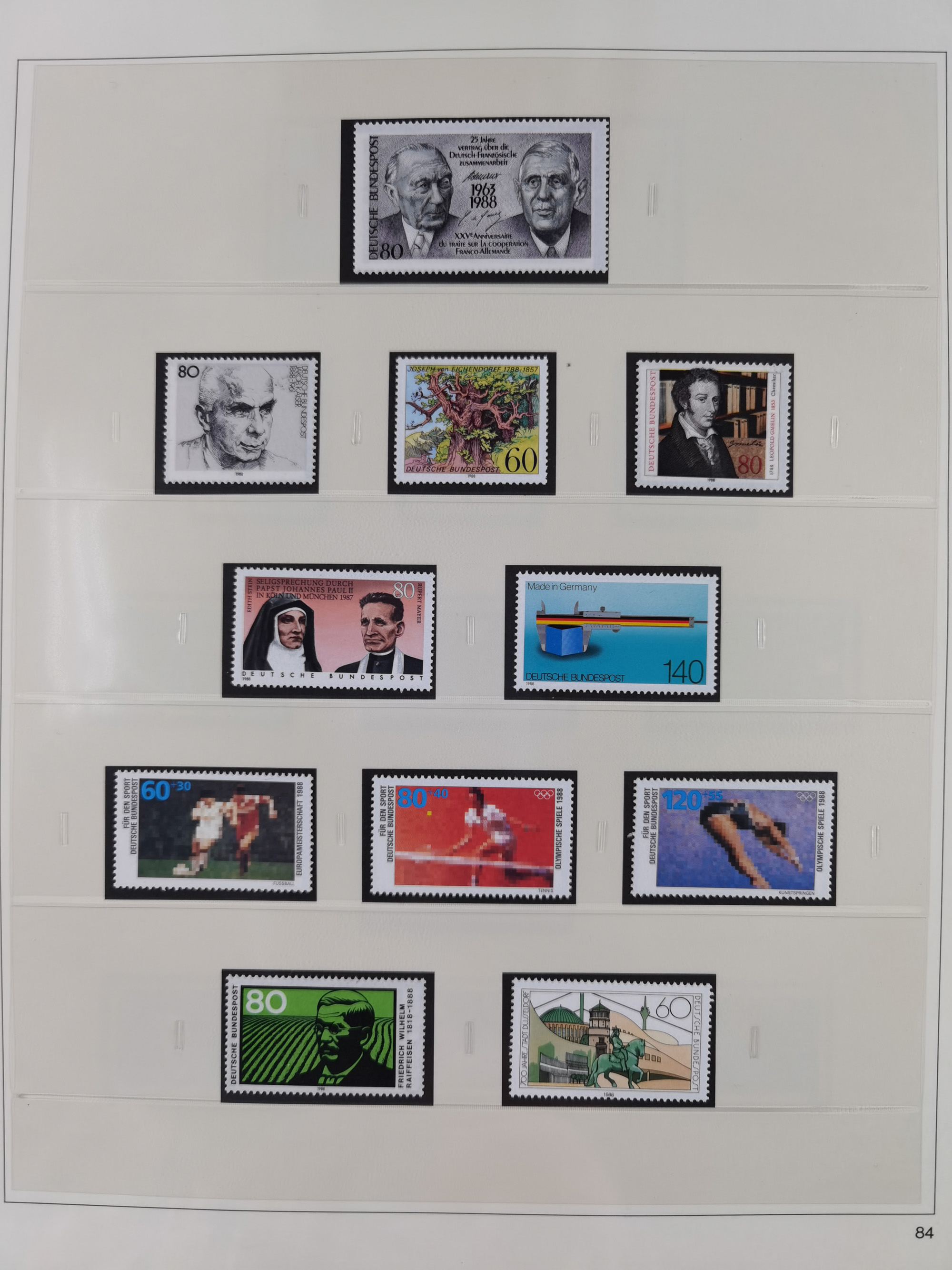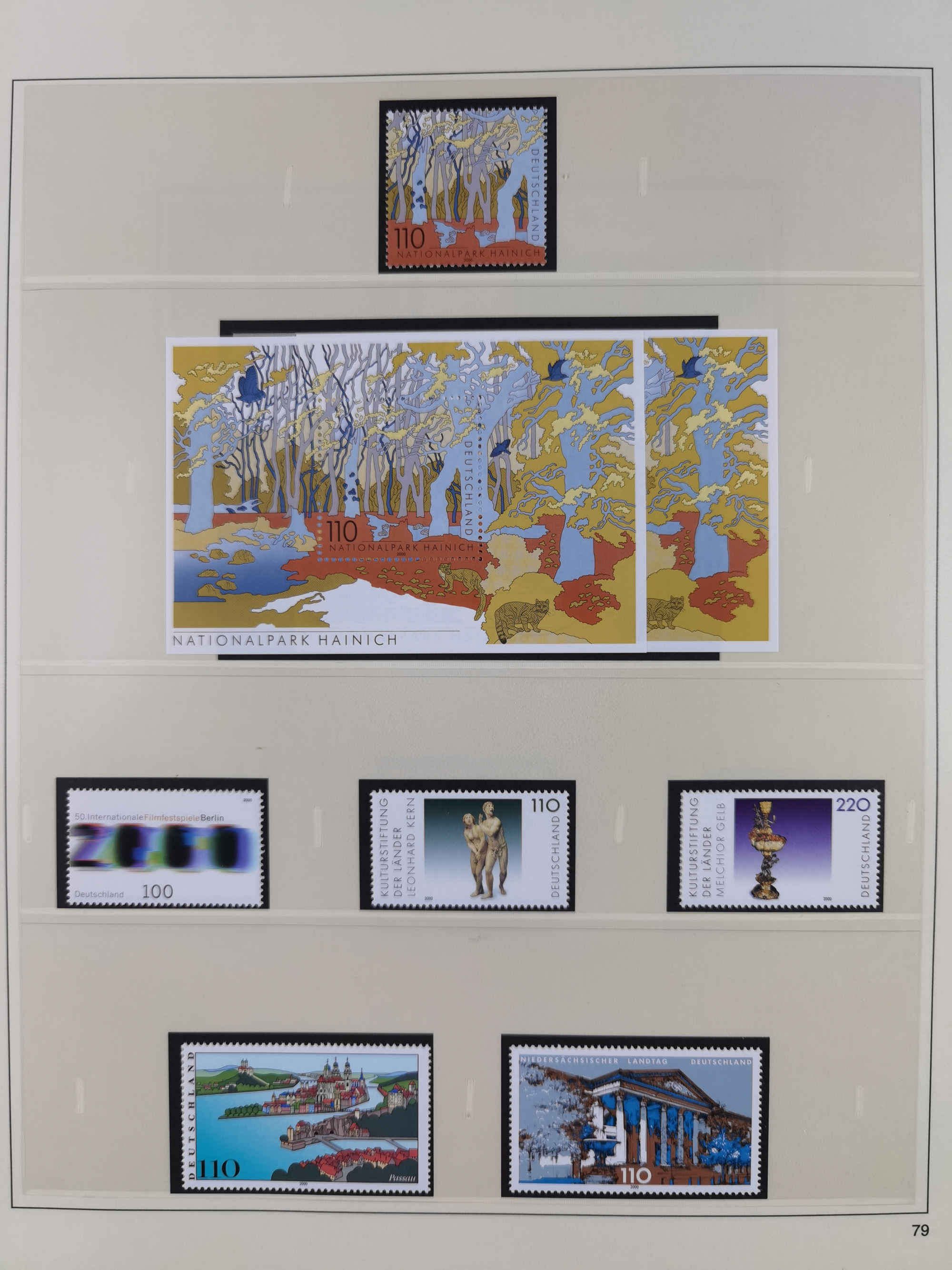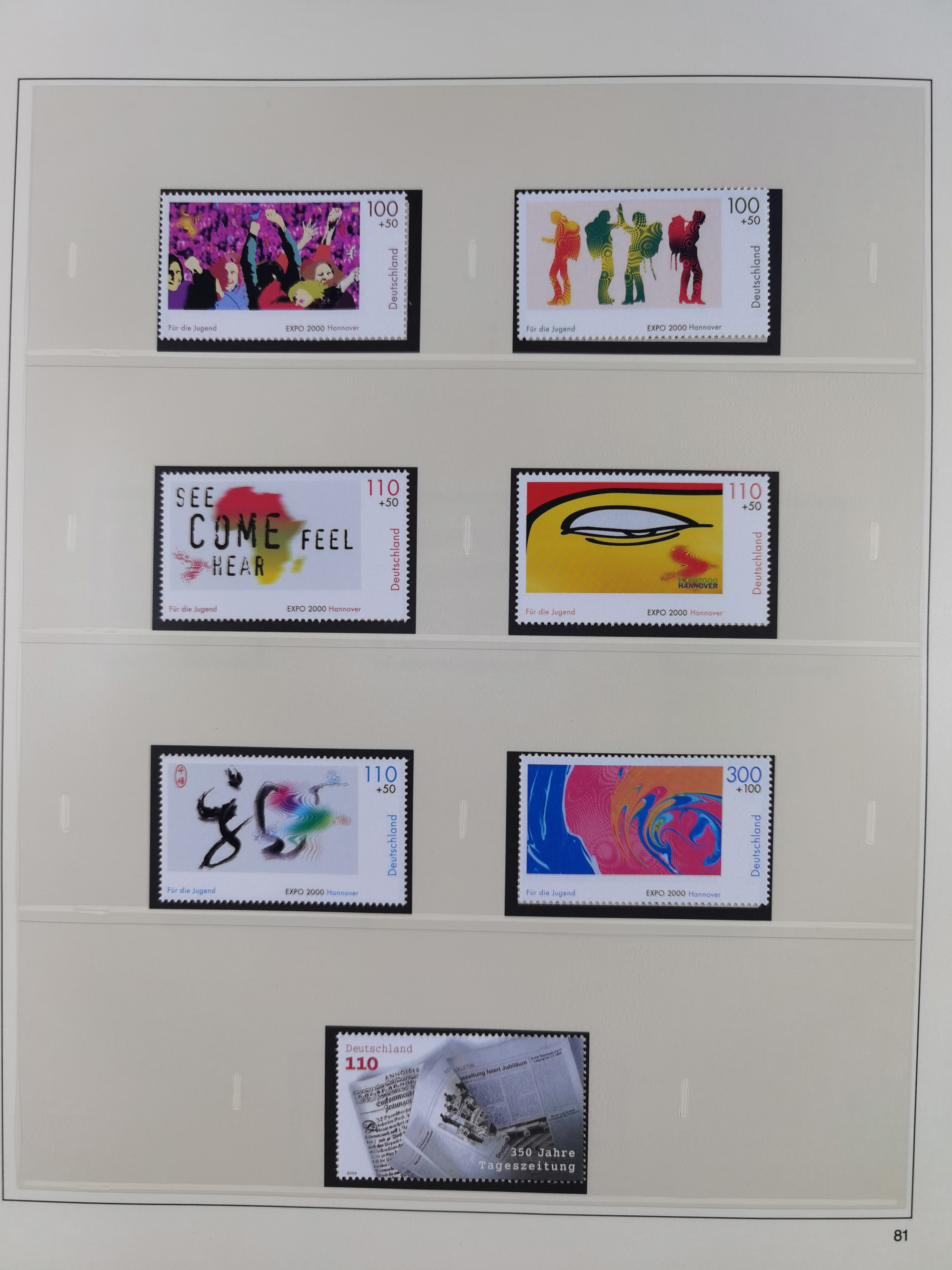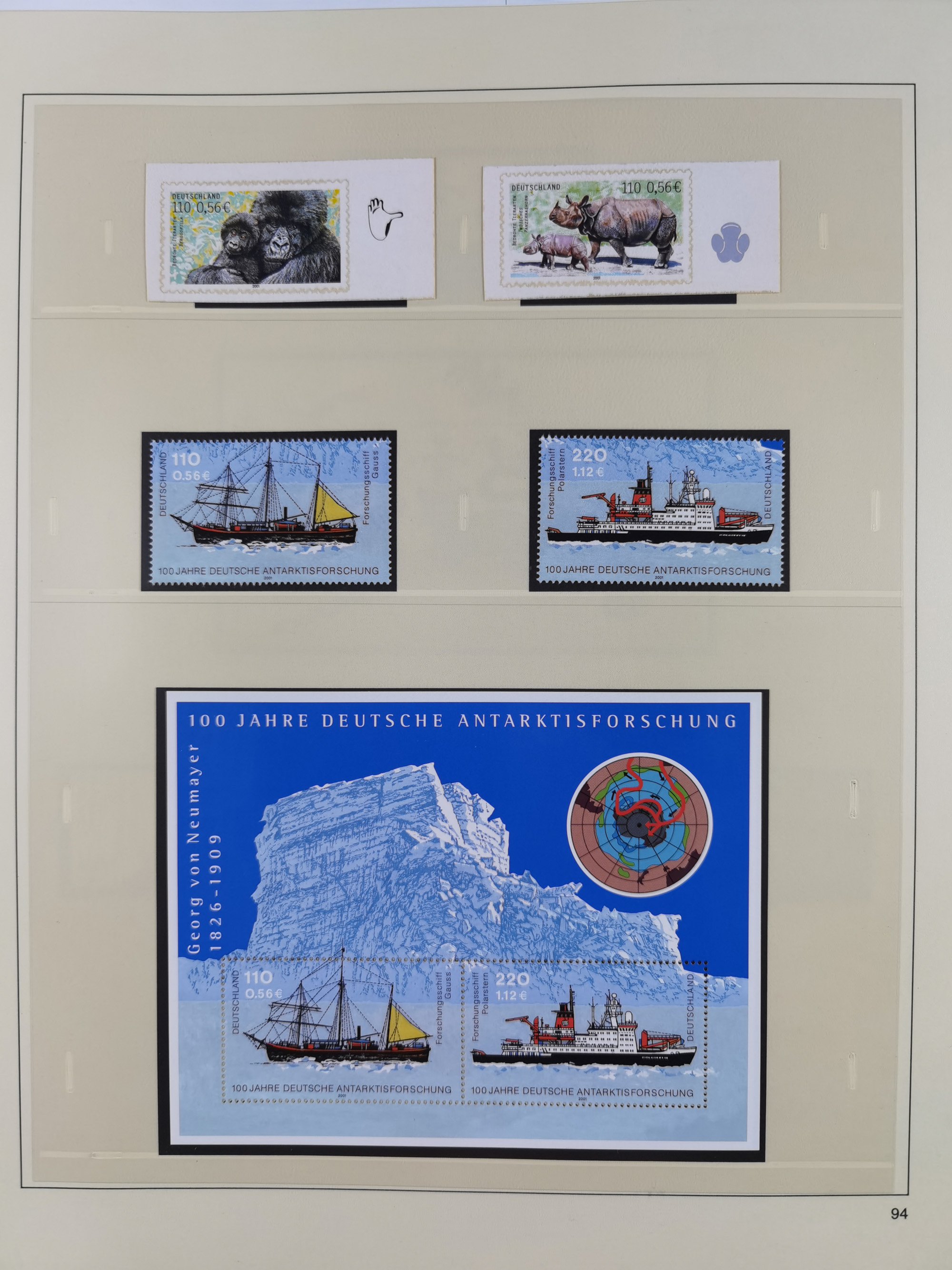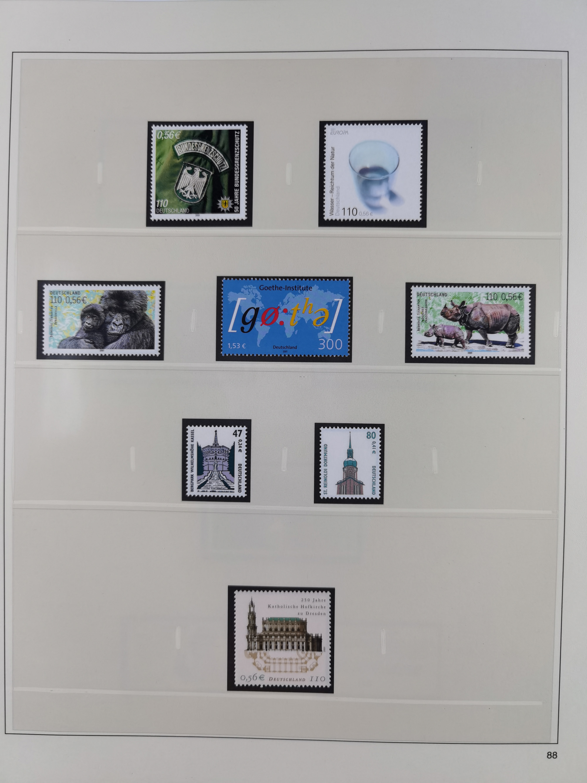 1948/2001, vorwiegend postfrische Sammlung, dabei Bund, Berlin und DDR in den Hauptnummern augenscheinlich komplett, außerdem Französische Zone und Saarland, bis auf einen Rot-Kreuz-Block komplett, SBZ mit besseren inkl. Blockausgaben, Bizone inkl. 52 Werte usw., wenige Werte ungebraucht bzw. nachgummiert, meist gute Erhaltung