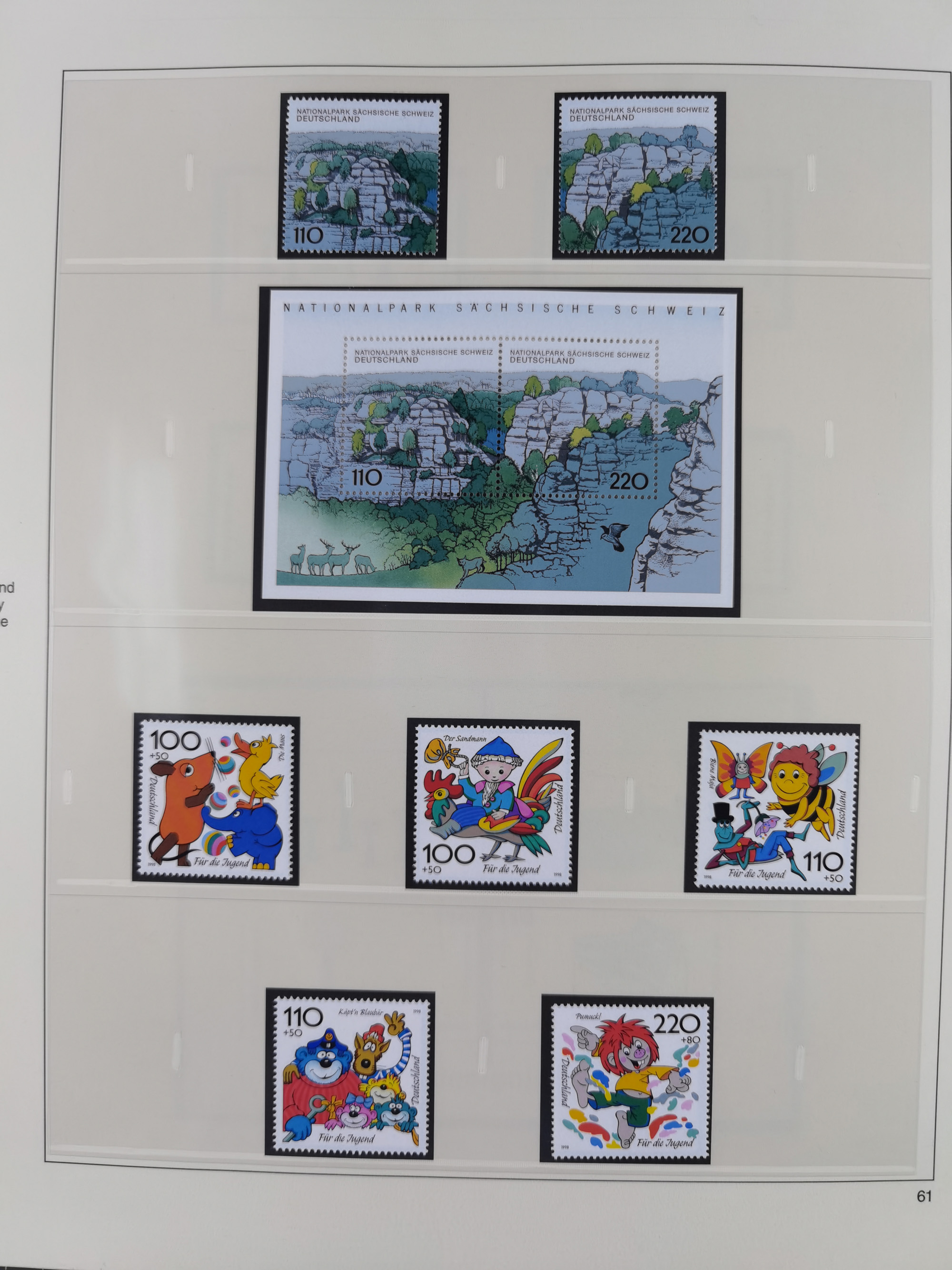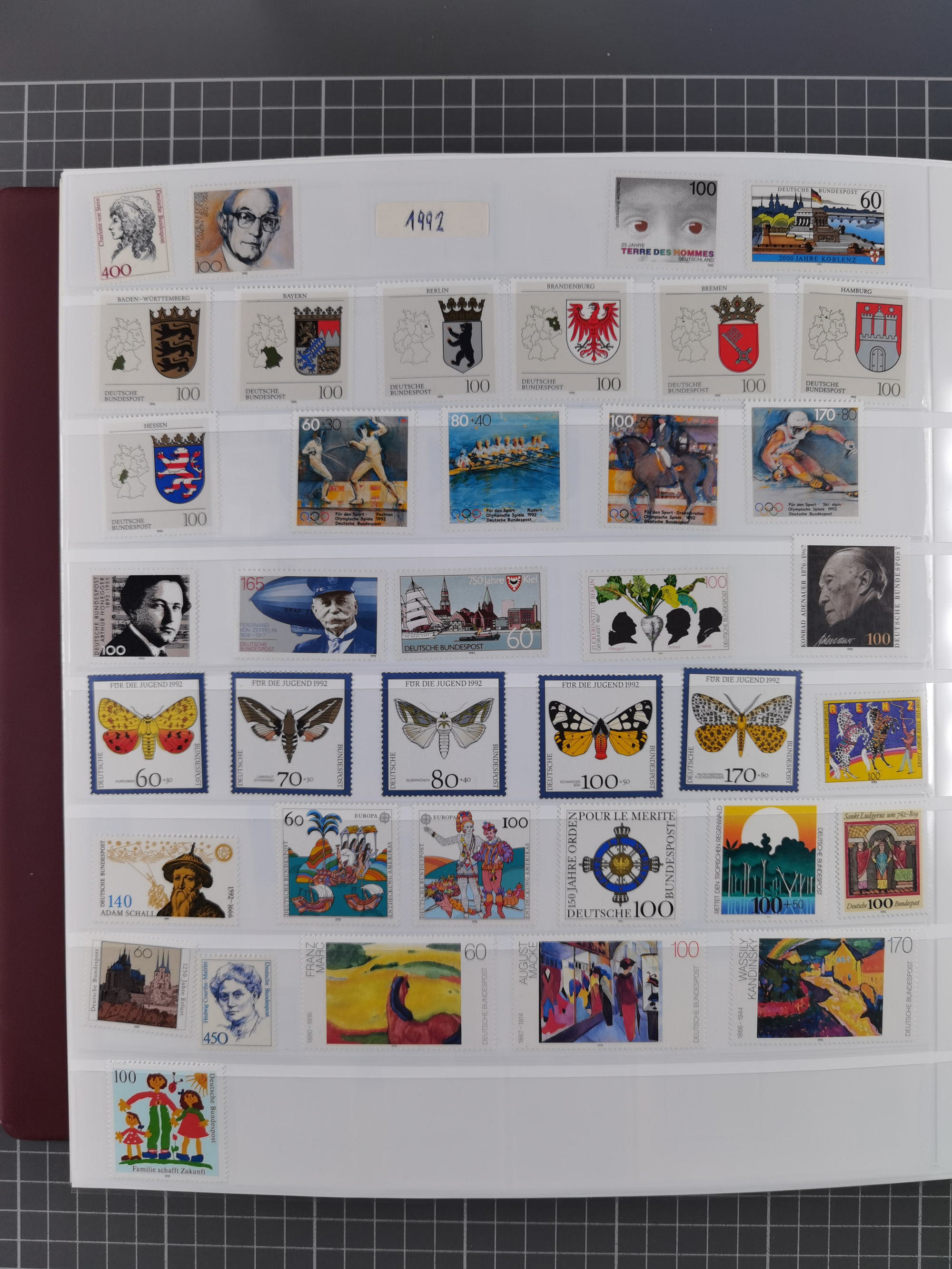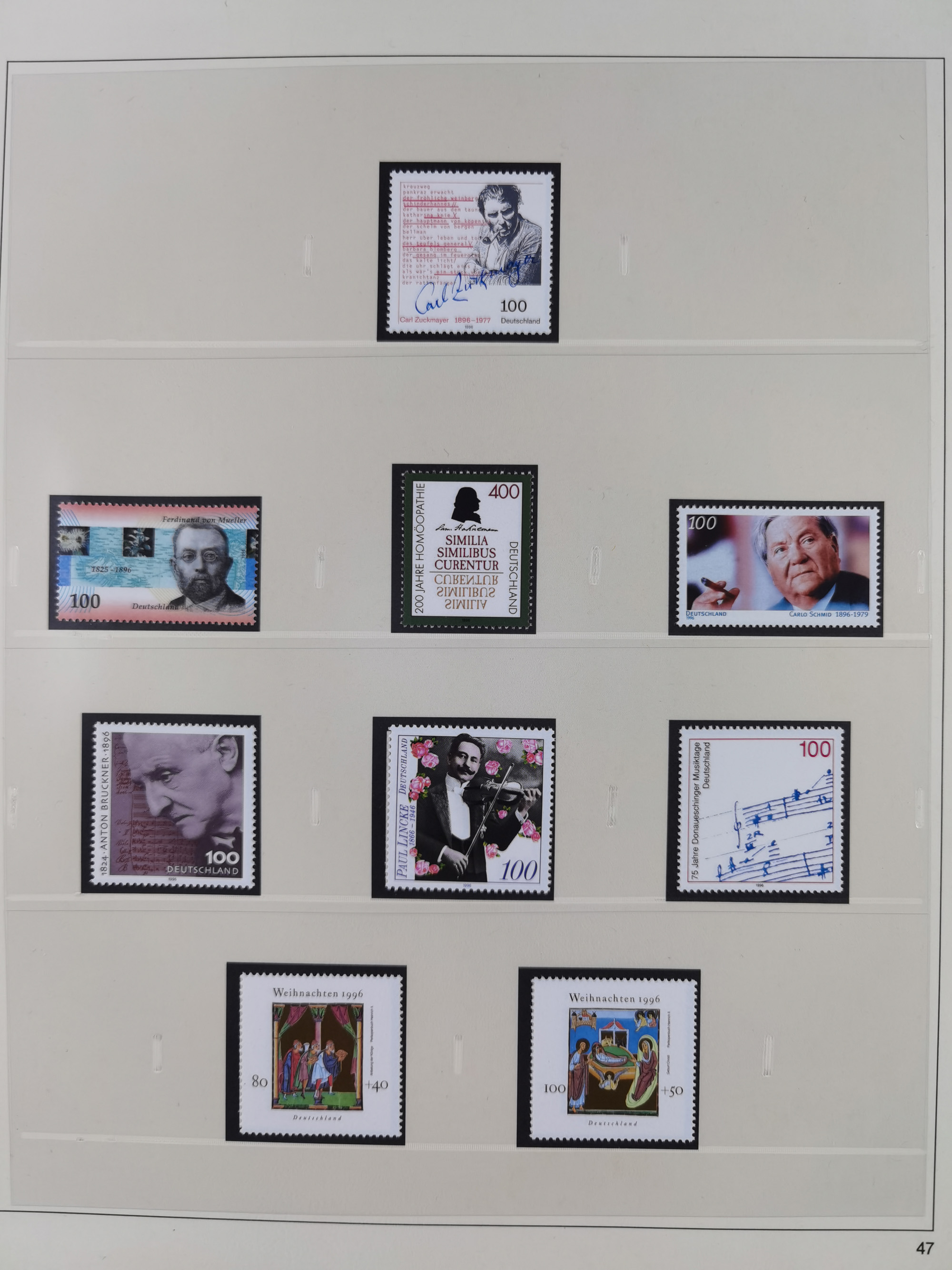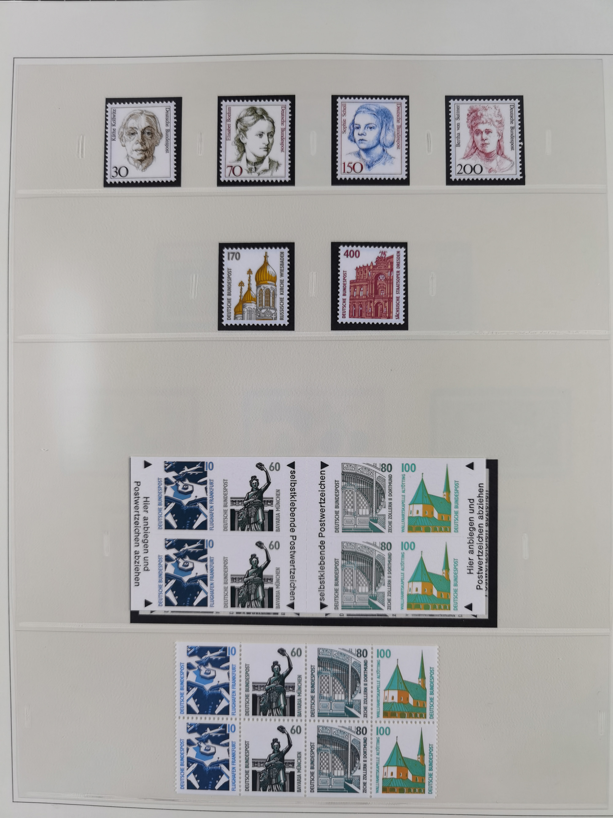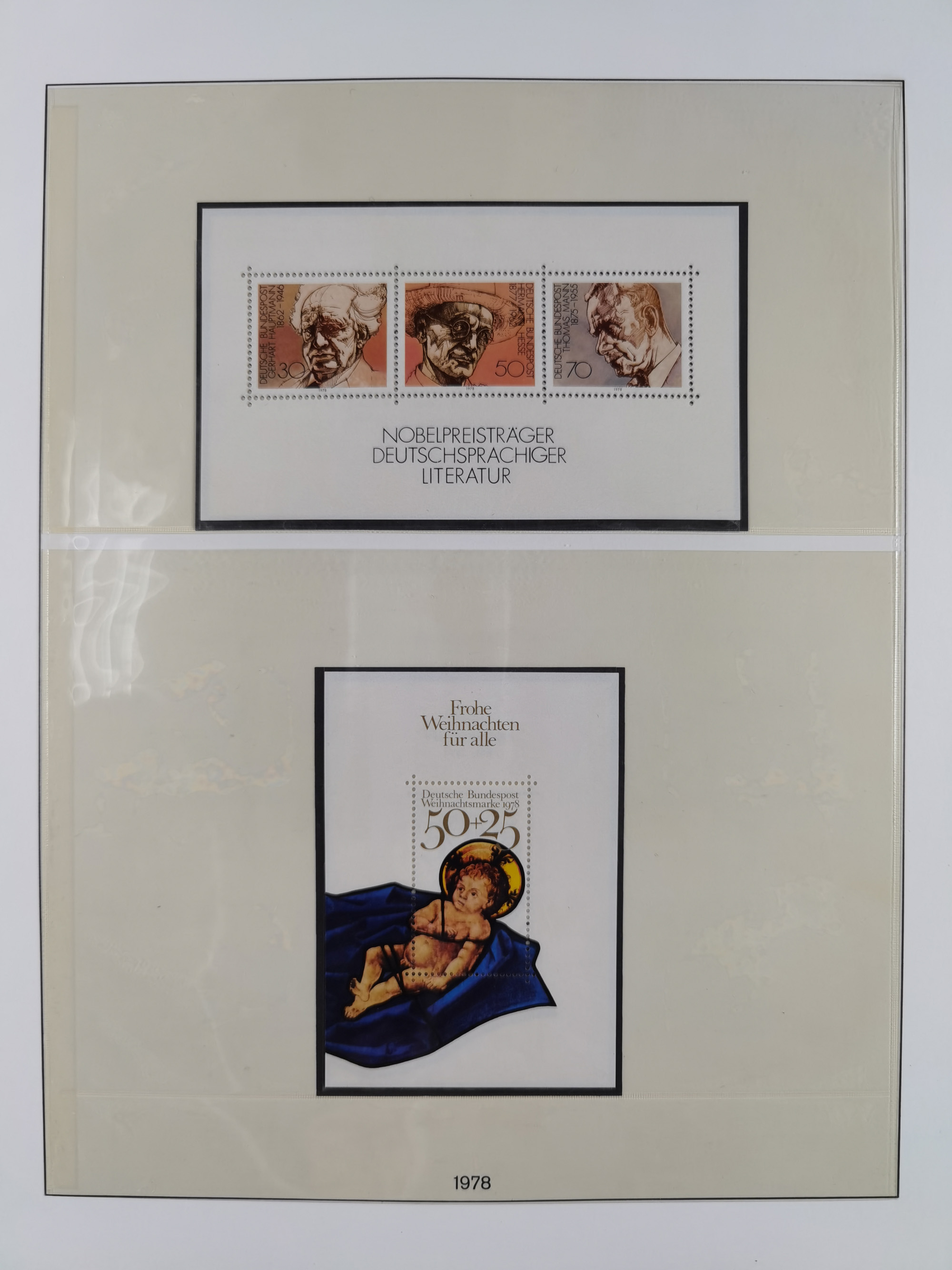 1948/2024, in den Hauptnummern komplette, fast ausschließlich postfrische Sammlungen, dabei Berlin 1948-90 (Bl. 1 mit Haftstellen), DDR 1949-90 und Bundesrepublik inkl. Posthornsatz postfrisch, waagerechte Paare ab Heuss, sowie selbstklebende Marken aus Markensets und Bogen, ATM, Zusammendrucke, Rollenmarken (5er-Streifen), Markenheftchen und Markensets ab 1969 bis 2023 komplett, enormer Frankaturwert, ferner einige Steckbücher mit gestempelten Marken, in vier großen Kartons