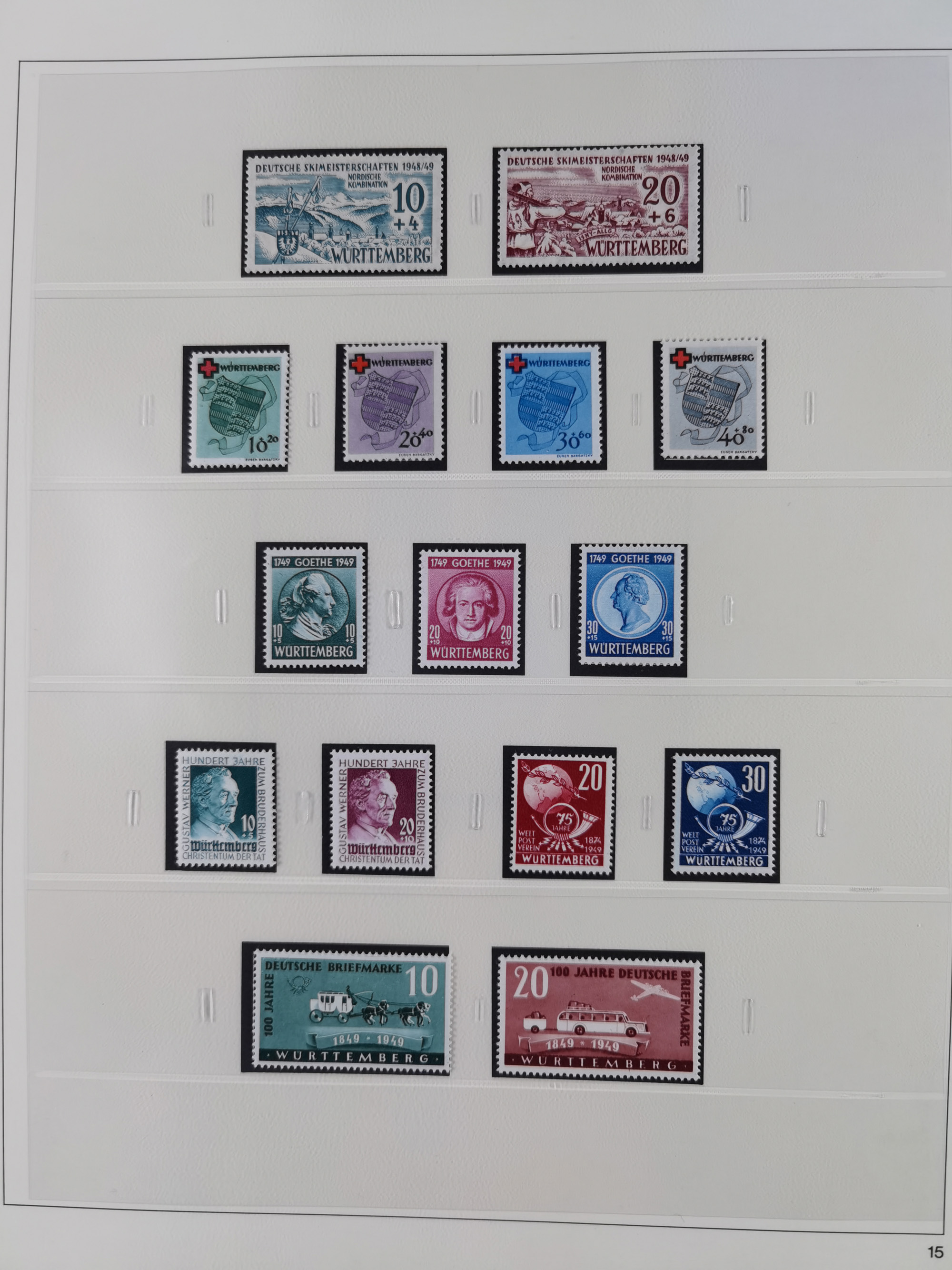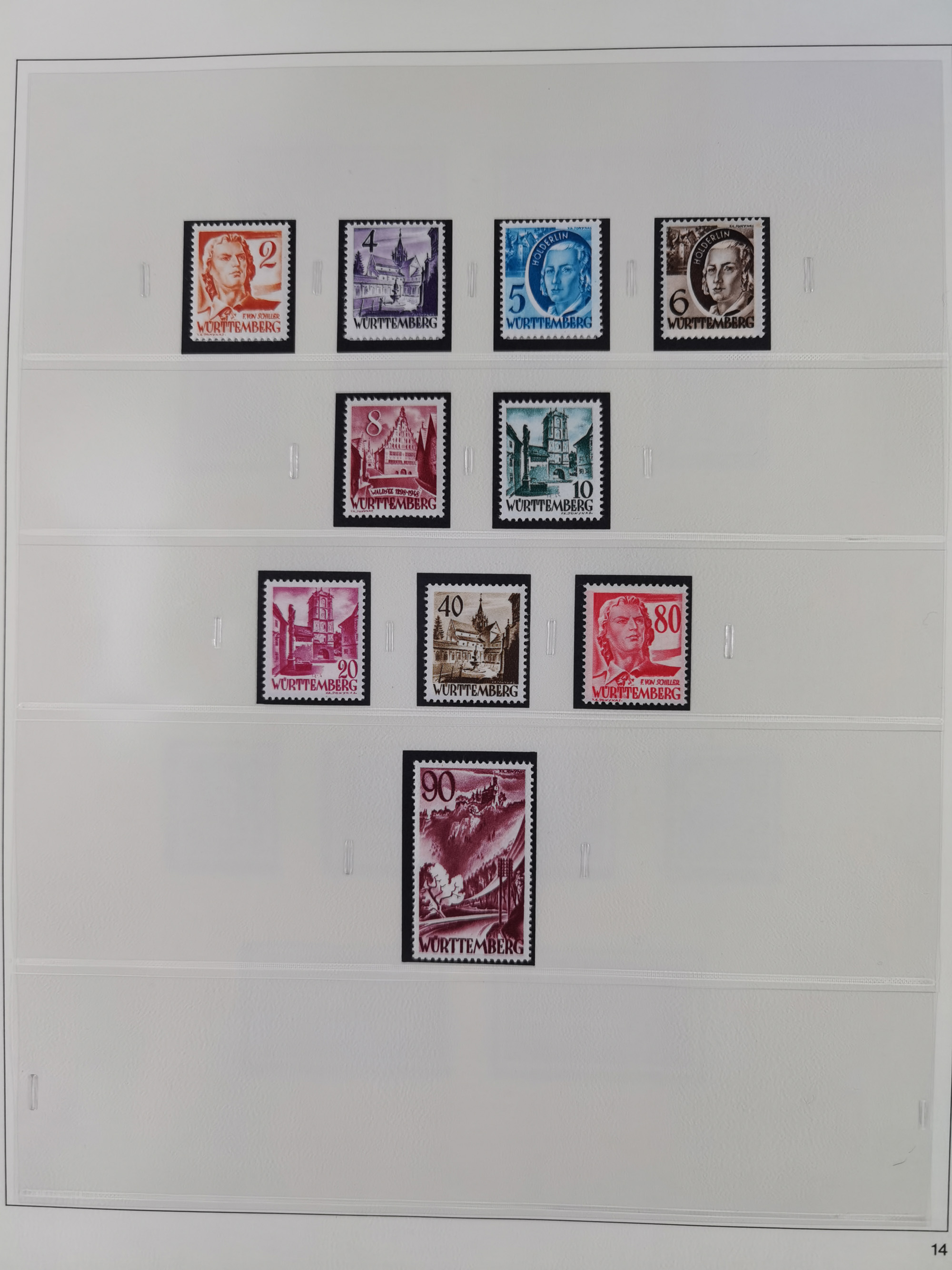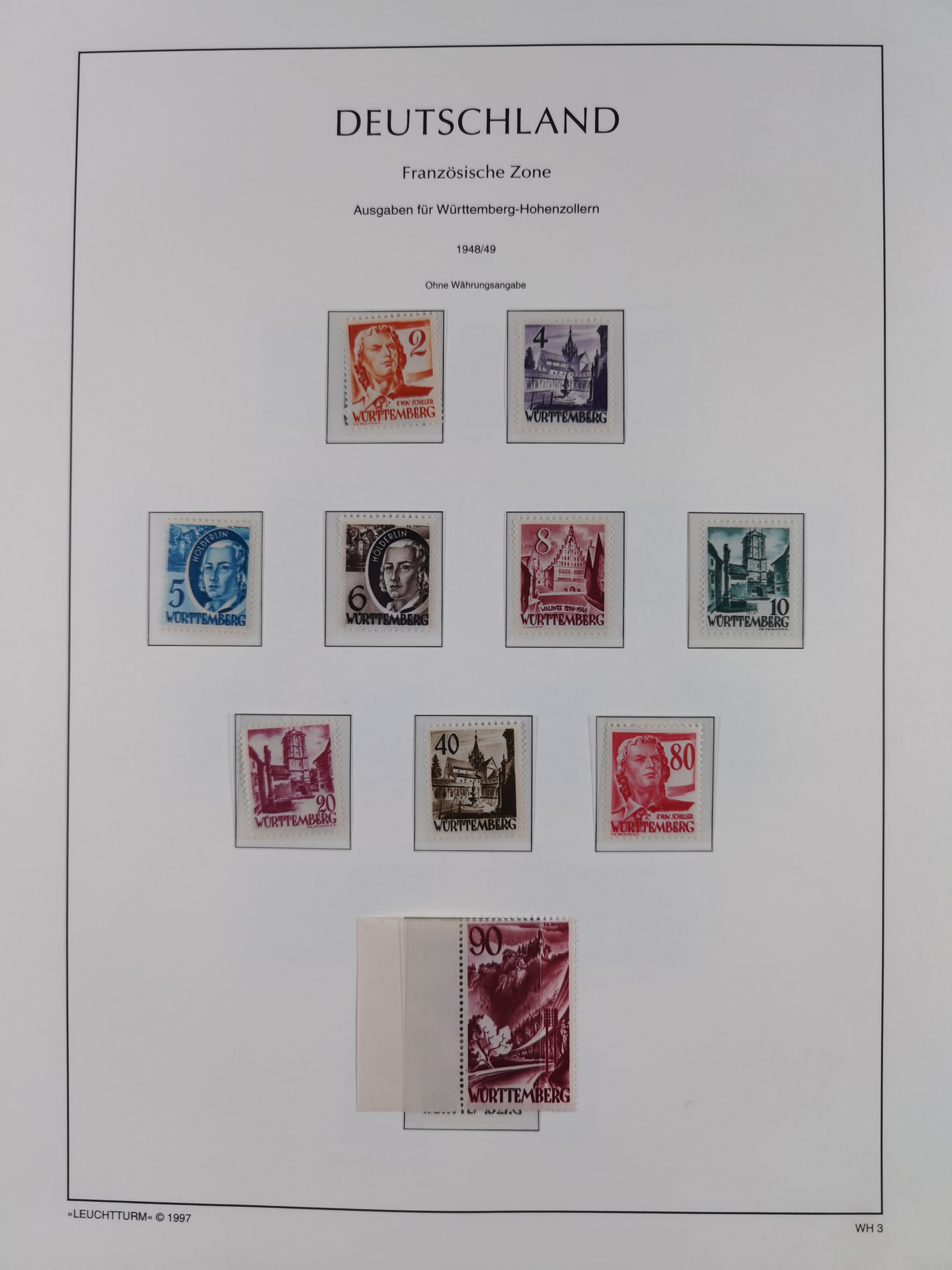 1945/49, postfrische Sammlungen Französische Zone bis auf Baden Mi.-Nr. 53 kpl. inkl. Blocks sowie Bizone in den Hauptnummern kpl. inkl. Mi.-Nr. 52-68I/II sign. Dub, Mi.-Nr. I-XI I/II sign. Dub und Schlegel BPP, sowie Bauten eng und weit gezähnt inkl. 97-100I/II, gute Erhaltung