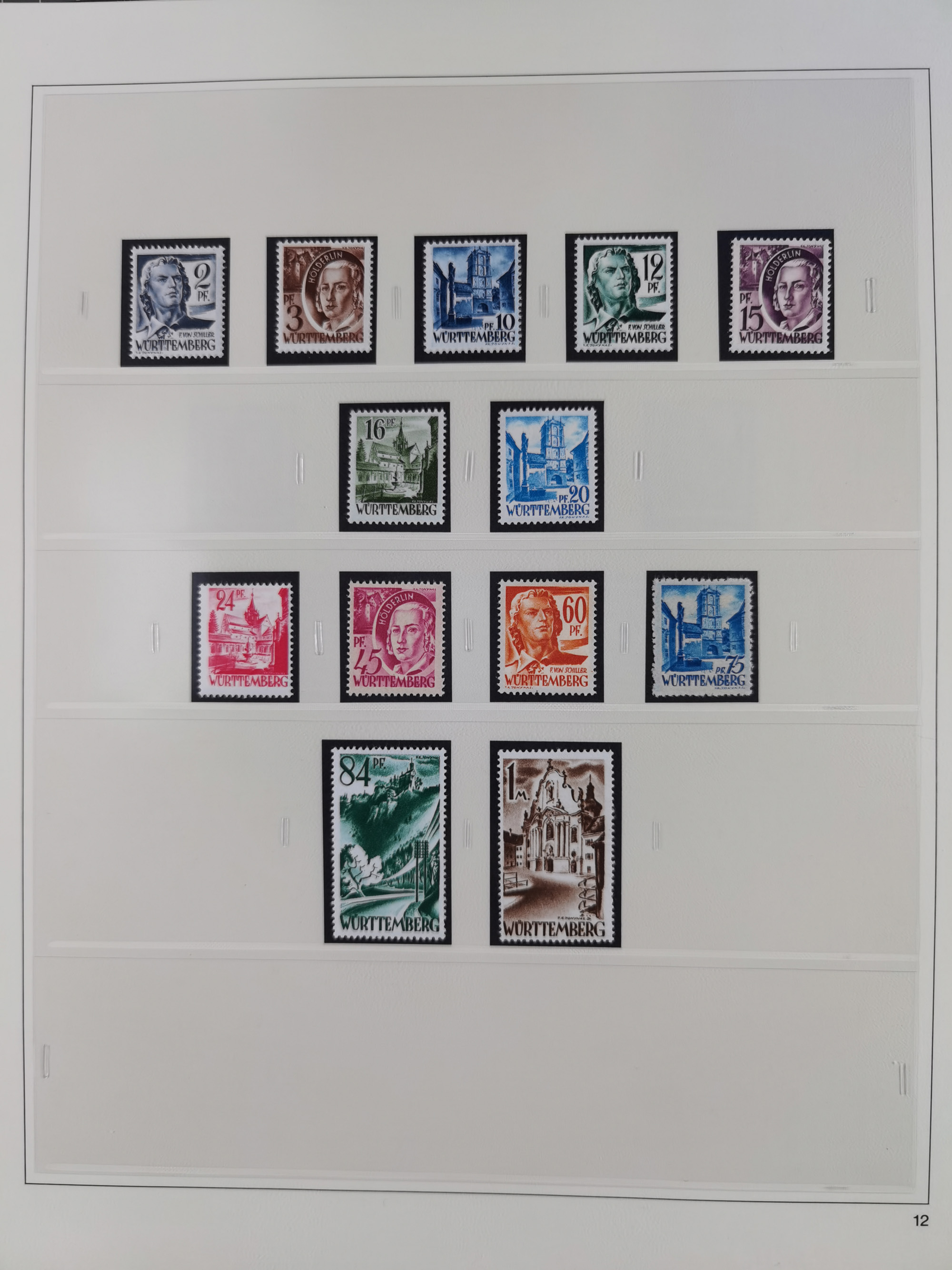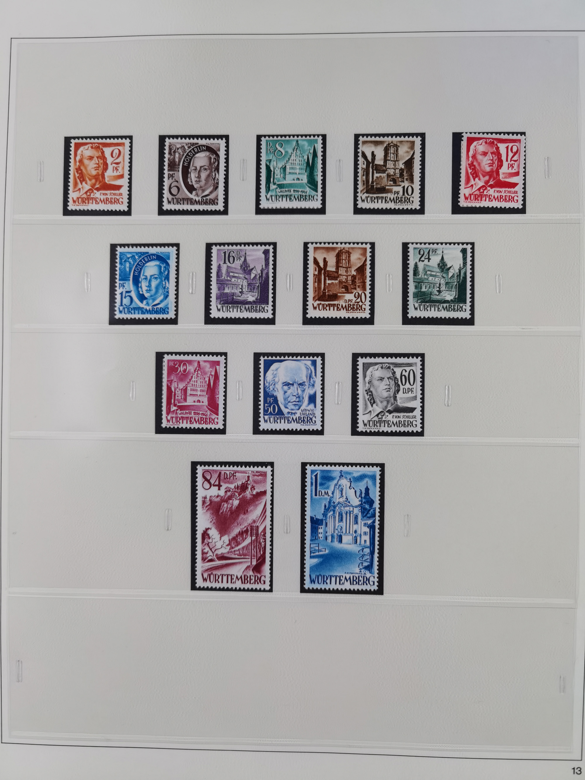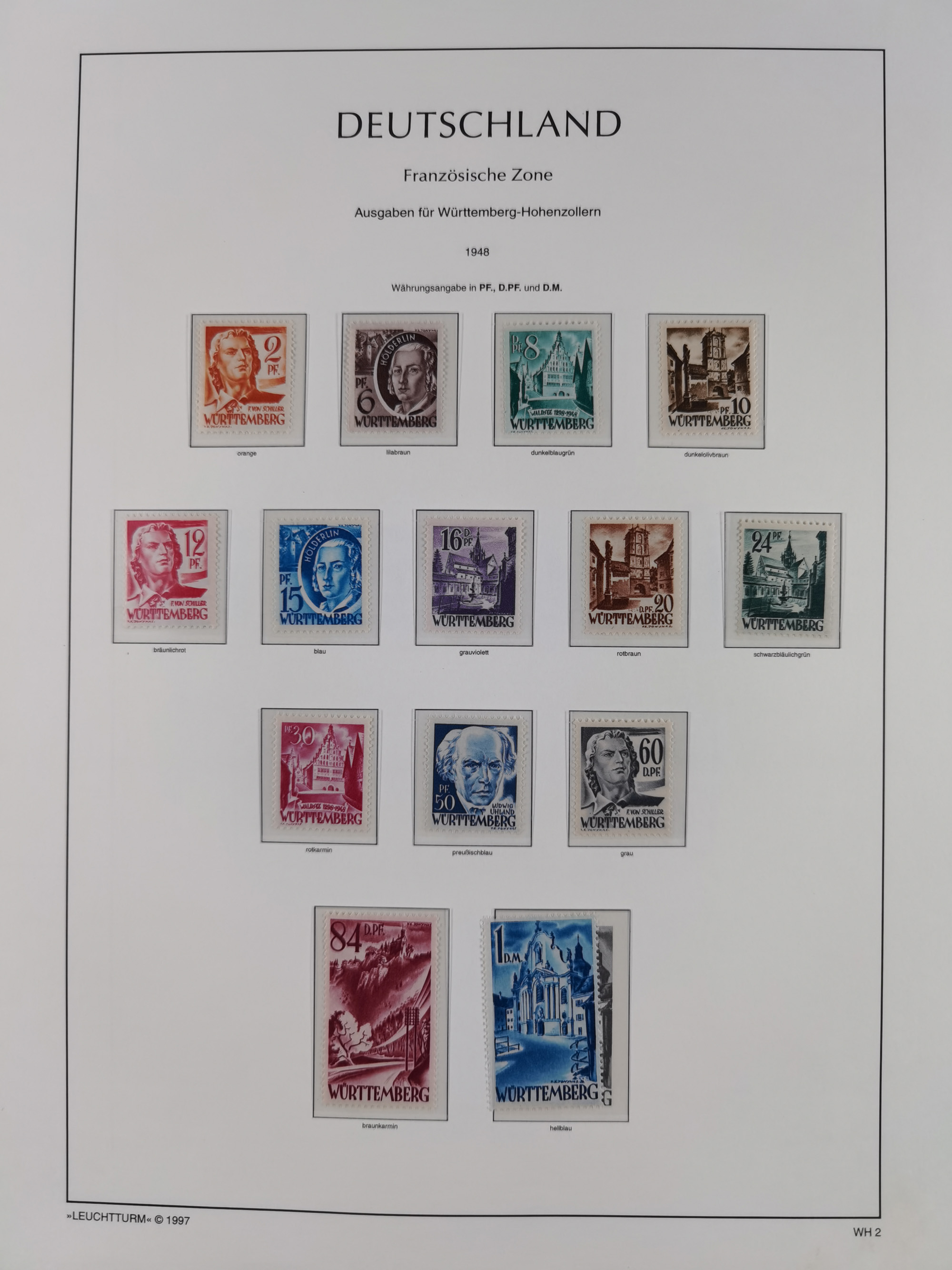 1945/49, postfrische Sammlungen Französische Zone bis auf Baden Mi.-Nr. 53 kpl. inkl. Blocks sowie Bizone in den Hauptnummern kpl. inkl. Mi.-Nr. 52-68I/II sign. Dub, Mi.-Nr. I-XI I/II sign. Dub und Schlegel BPP, sowie Bauten eng und weit gezähnt inkl. 97-100I/II, gute Erhaltung