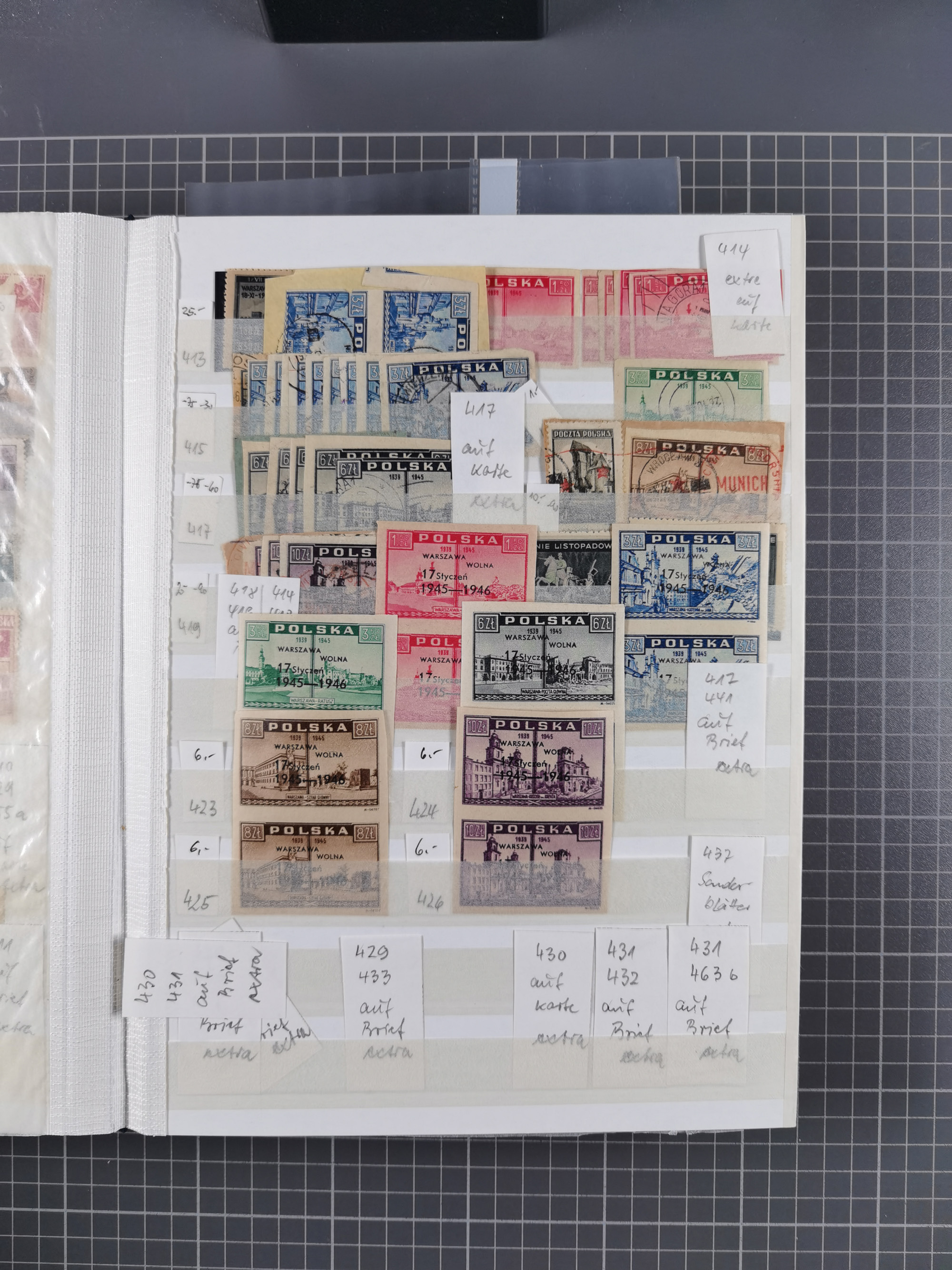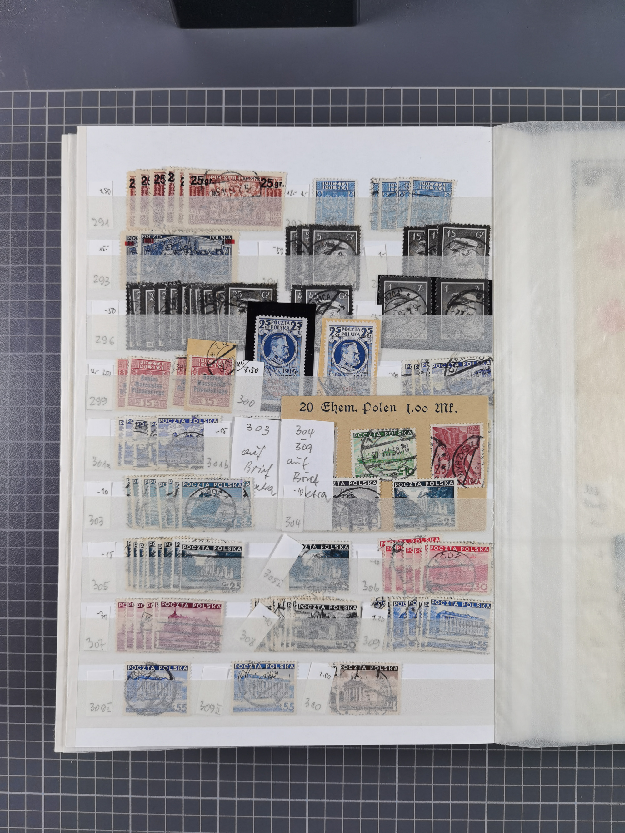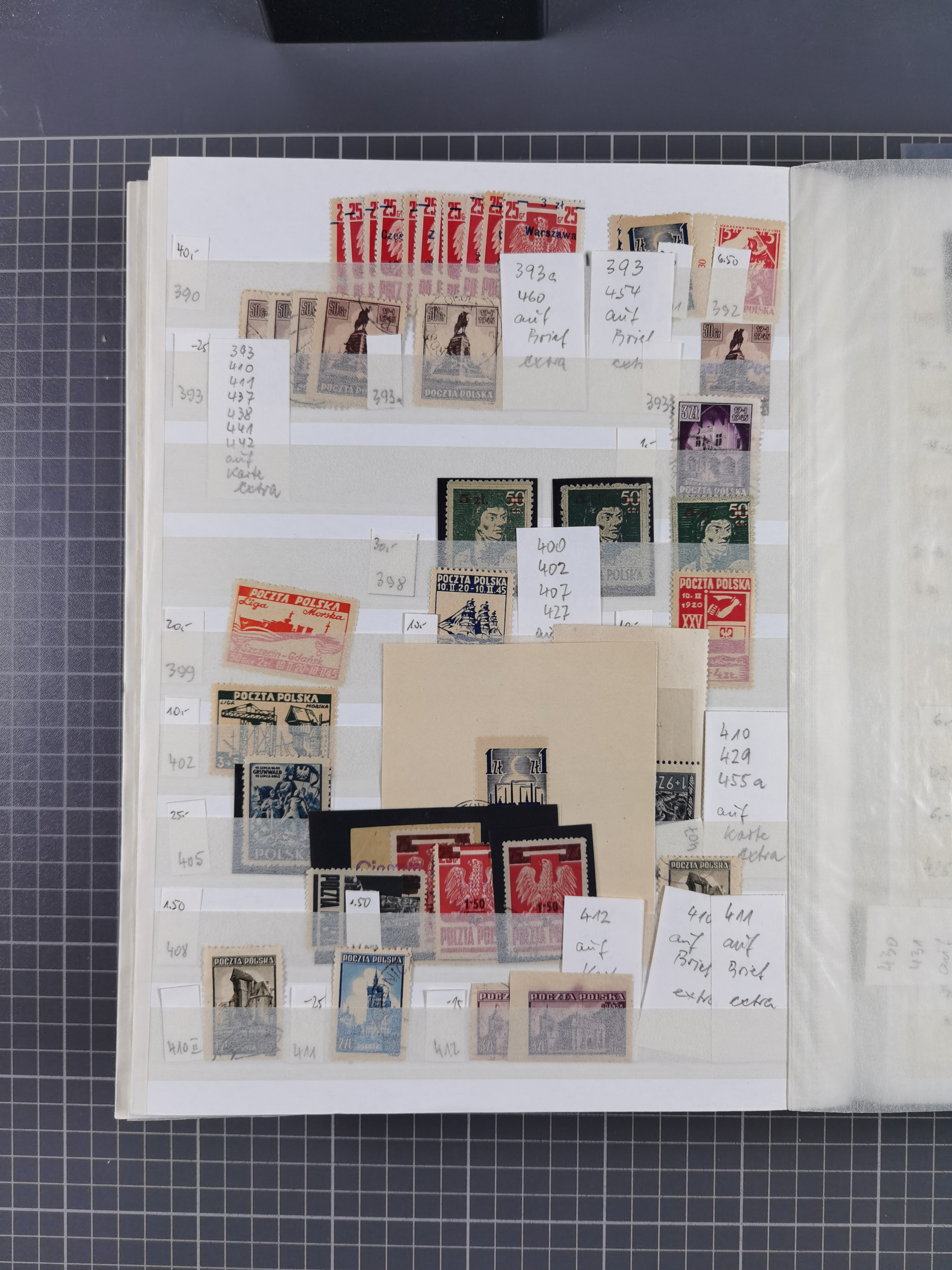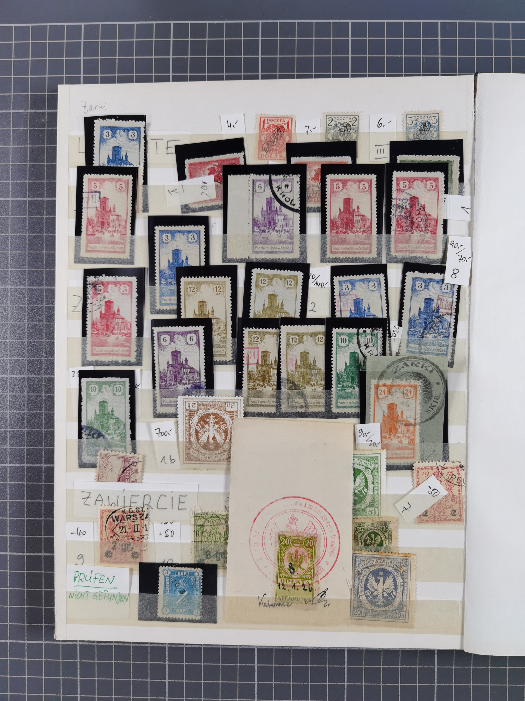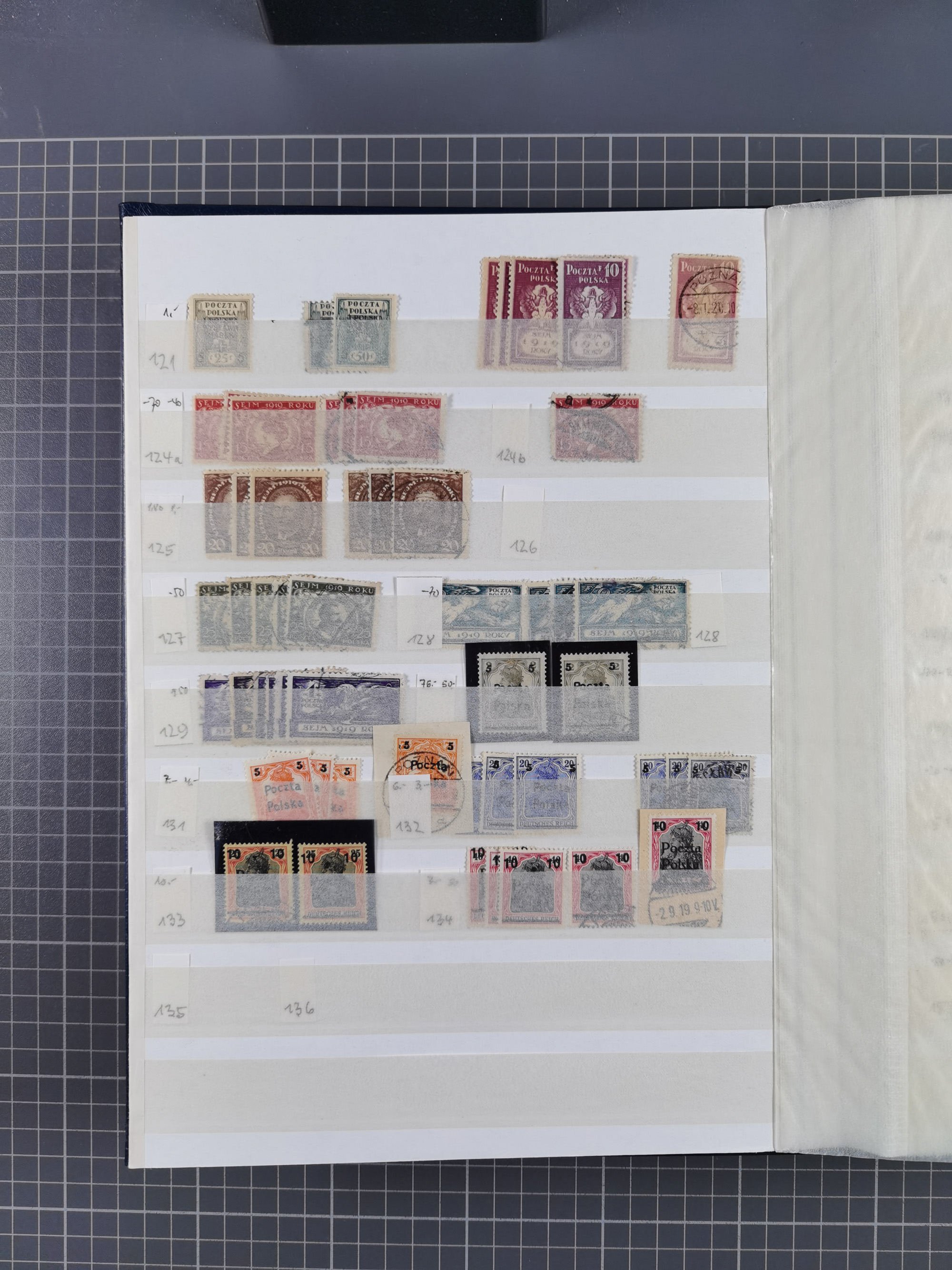 1918/19, interesting, unused/mint never hinged/used collection “Germania overprint issues,” including local issues with better items, including Mi.-No. 135-136, overprint varieties, stamps with margins, multiples, better postmarks, and some covers, including Mi.-No. 10 DD and 11 DD unused, Mi.-Nr. 135 as unused and mint never hinged block of four, and local issues including Brzeziny 2½-60 pfg. complete on letter fragments, Kolo Type II 2½-60 pfg. complete, unused, Ostroleka 40 pfg. unused, Ostrow with several values unused or on letter fragments, Pultusk with nine unused and used stamps, and Wloclawek with many stamps/overprints, including inverted overprints, many with good signatures Jungjohann BPP, Landré, etc. In addition, various overprint forgeries (some on covers) and some defective stamps from the so-called “Poznan find 1939,” mostly neatly on written-up album pages