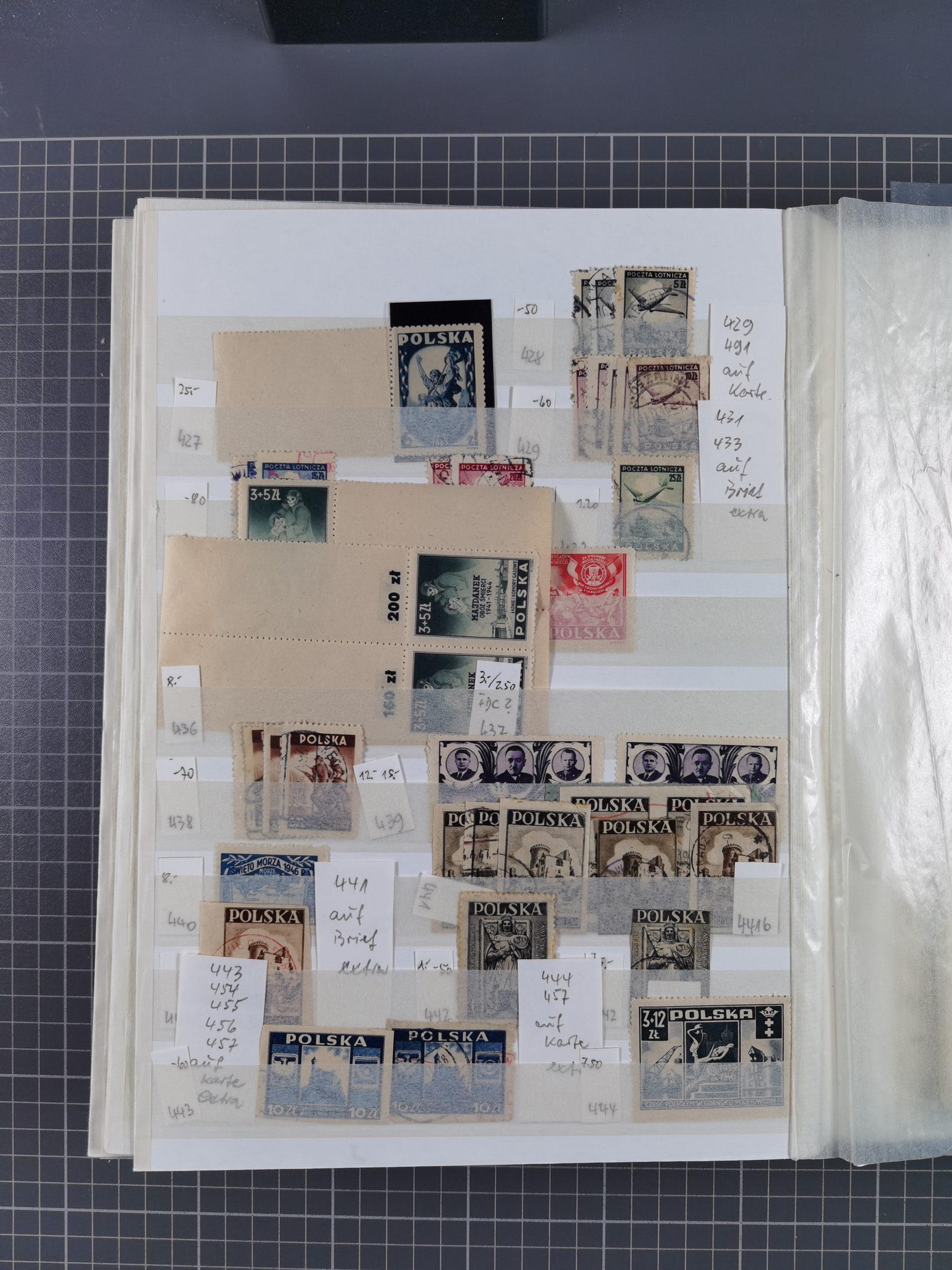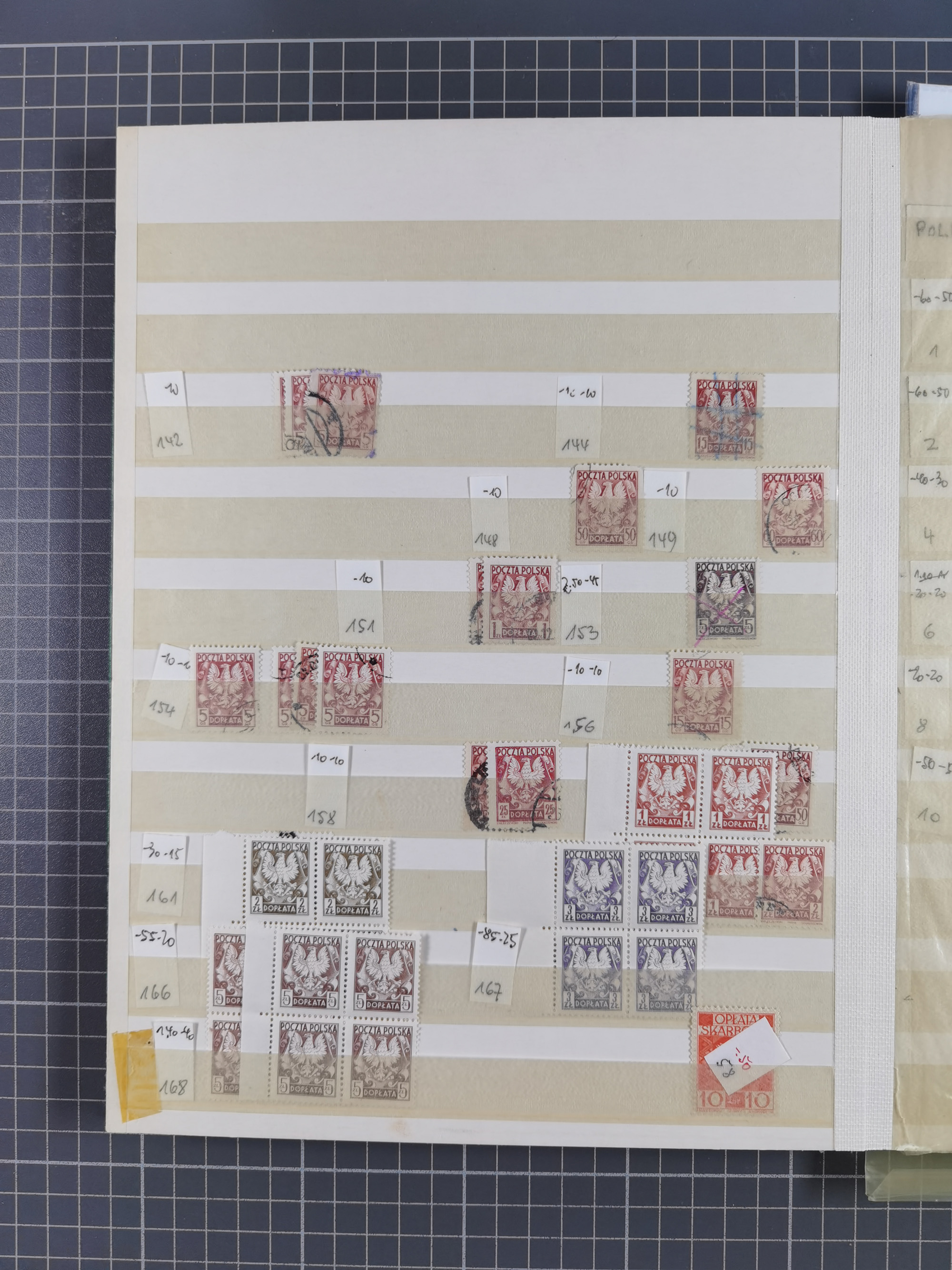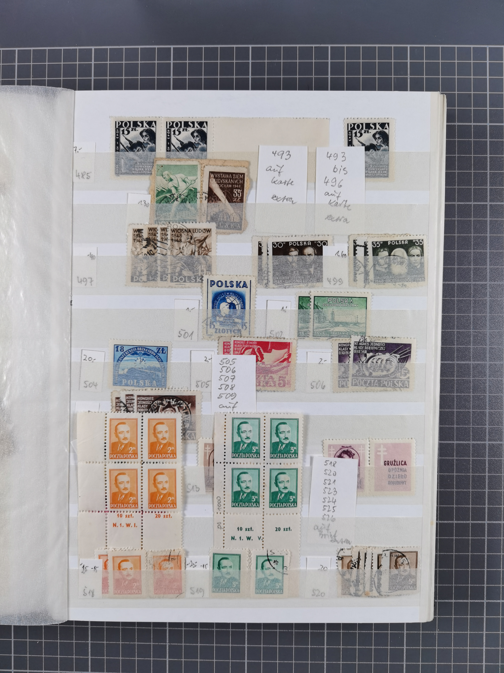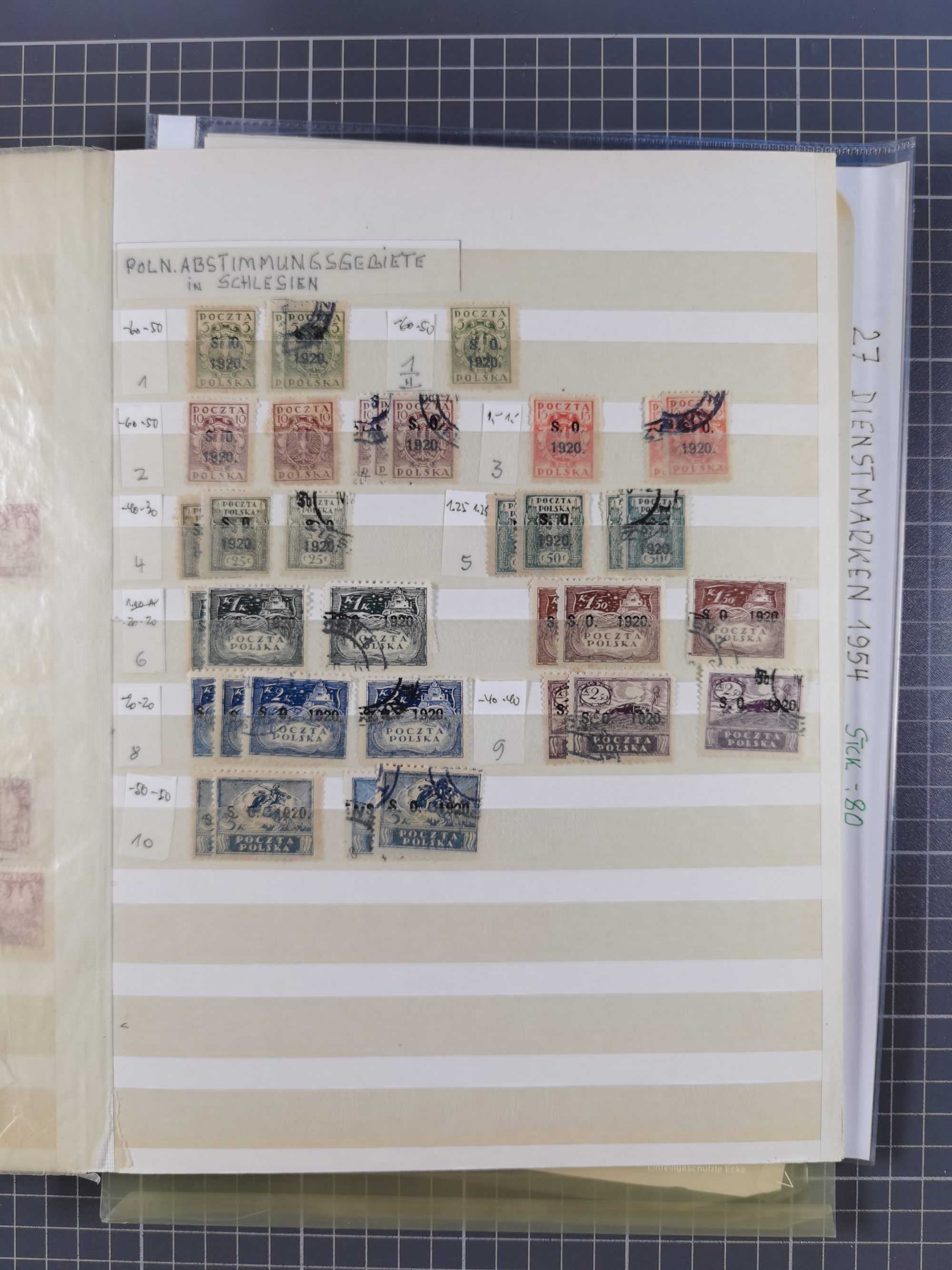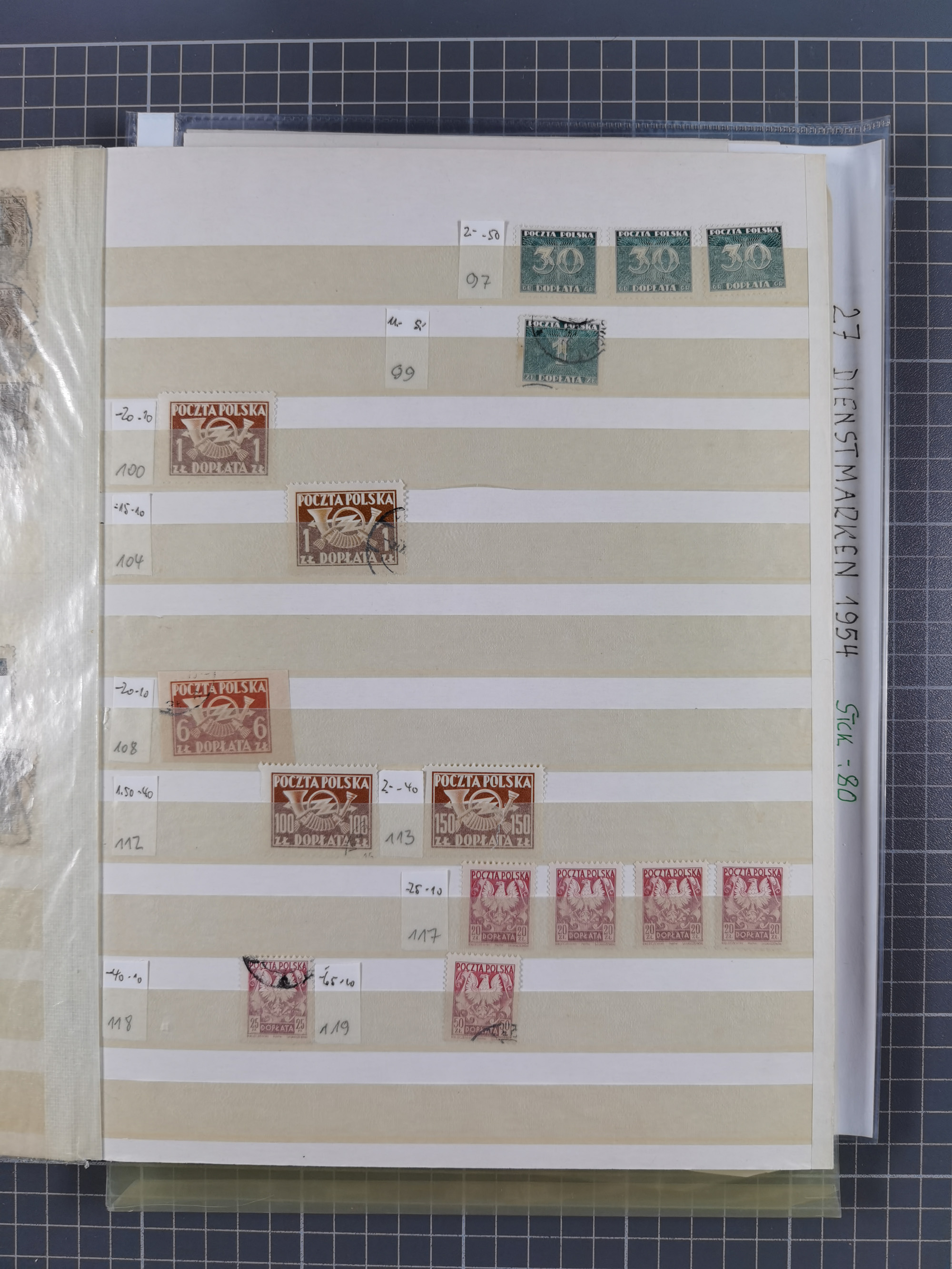 1918/19, interesting, unused/mint never hinged/used collection “Germania overprint issues,” including local issues with better items, including Mi.-No. 135-136, overprint varieties, stamps with margins, multiples, better postmarks, and some covers, including Mi.-No. 10 DD and 11 DD unused, Mi.-Nr. 135 as unused and mint never hinged block of four, and local issues including Brzeziny 2½-60 pfg. complete on letter fragments, Kolo Type II 2½-60 pfg. complete, unused, Ostroleka 40 pfg. unused, Ostrow with several values unused or on letter fragments, Pultusk with nine unused and used stamps, and Wloclawek with many stamps/overprints, including inverted overprints, many with good signatures Jungjohann BPP, Landré, etc. In addition, various overprint forgeries (some on covers) and some defective stamps from the so-called “Poznan find 1939,” mostly neatly on written-up album pages