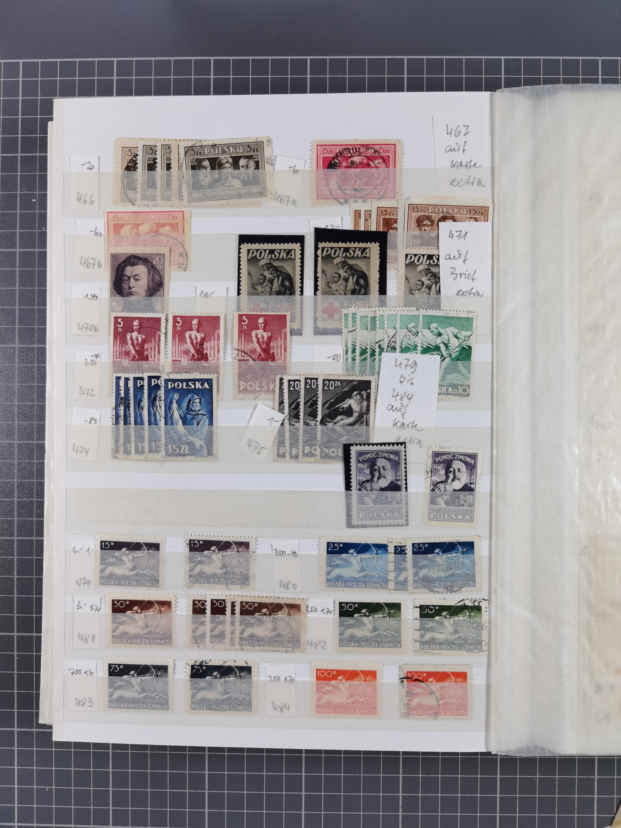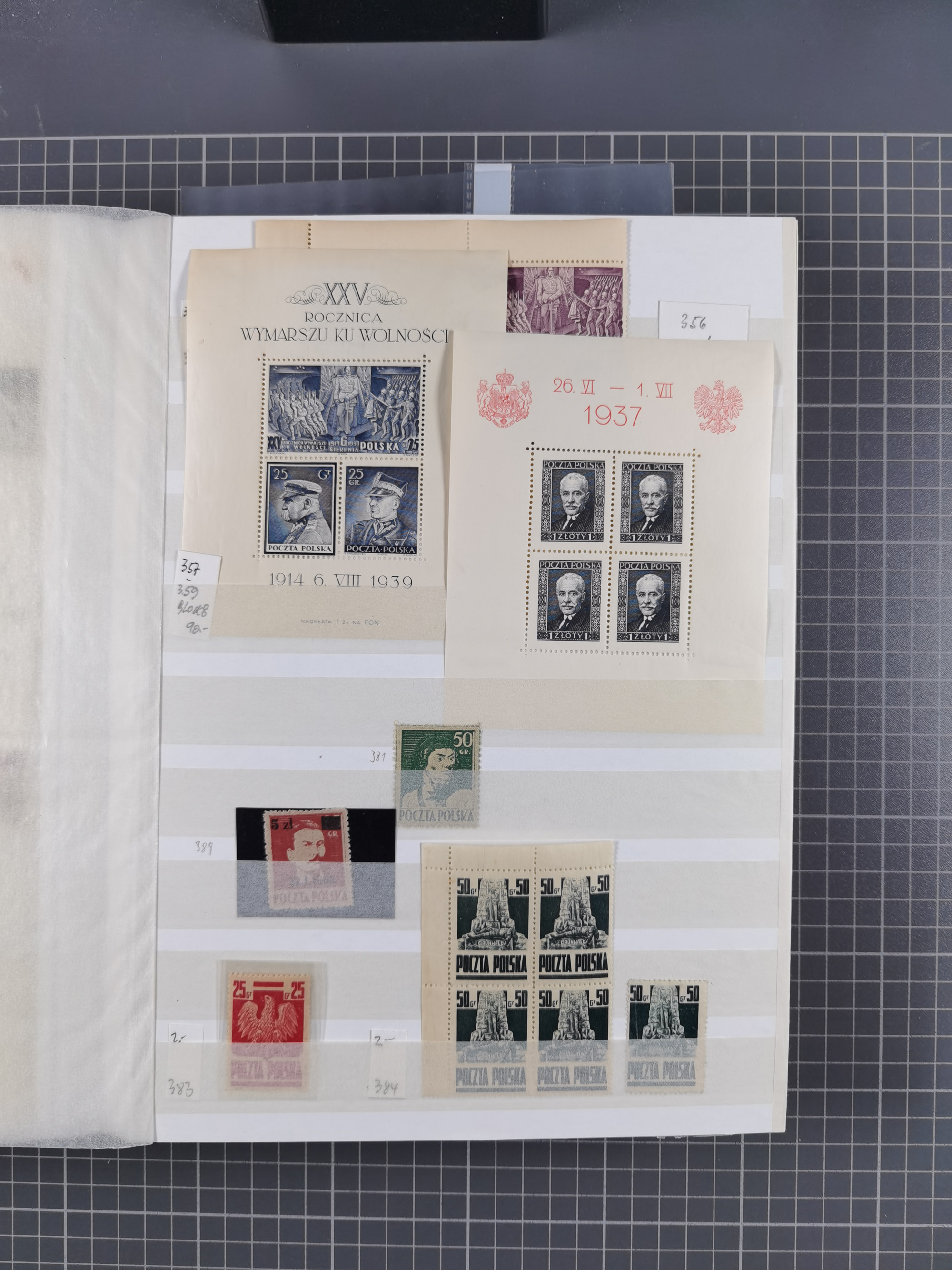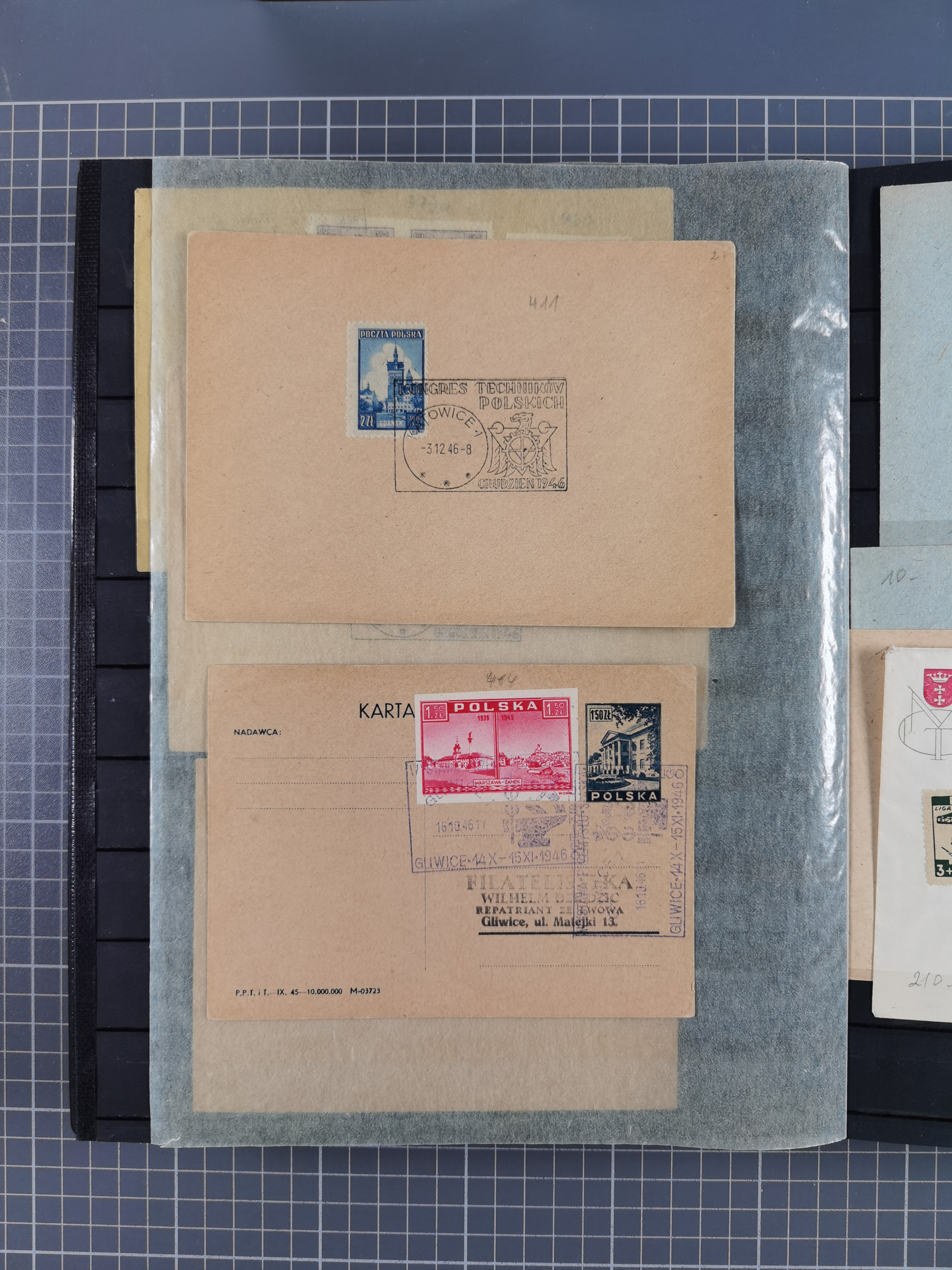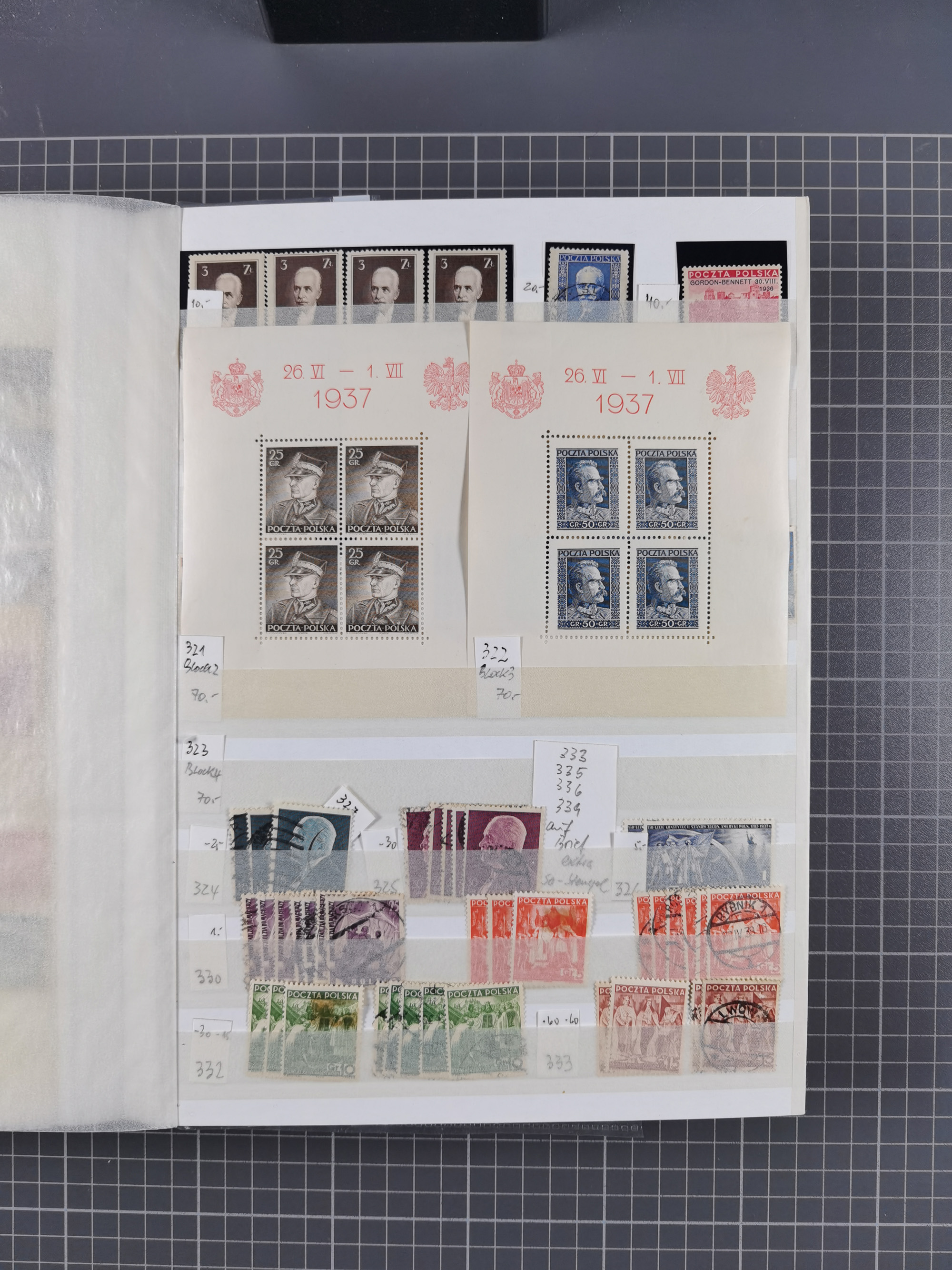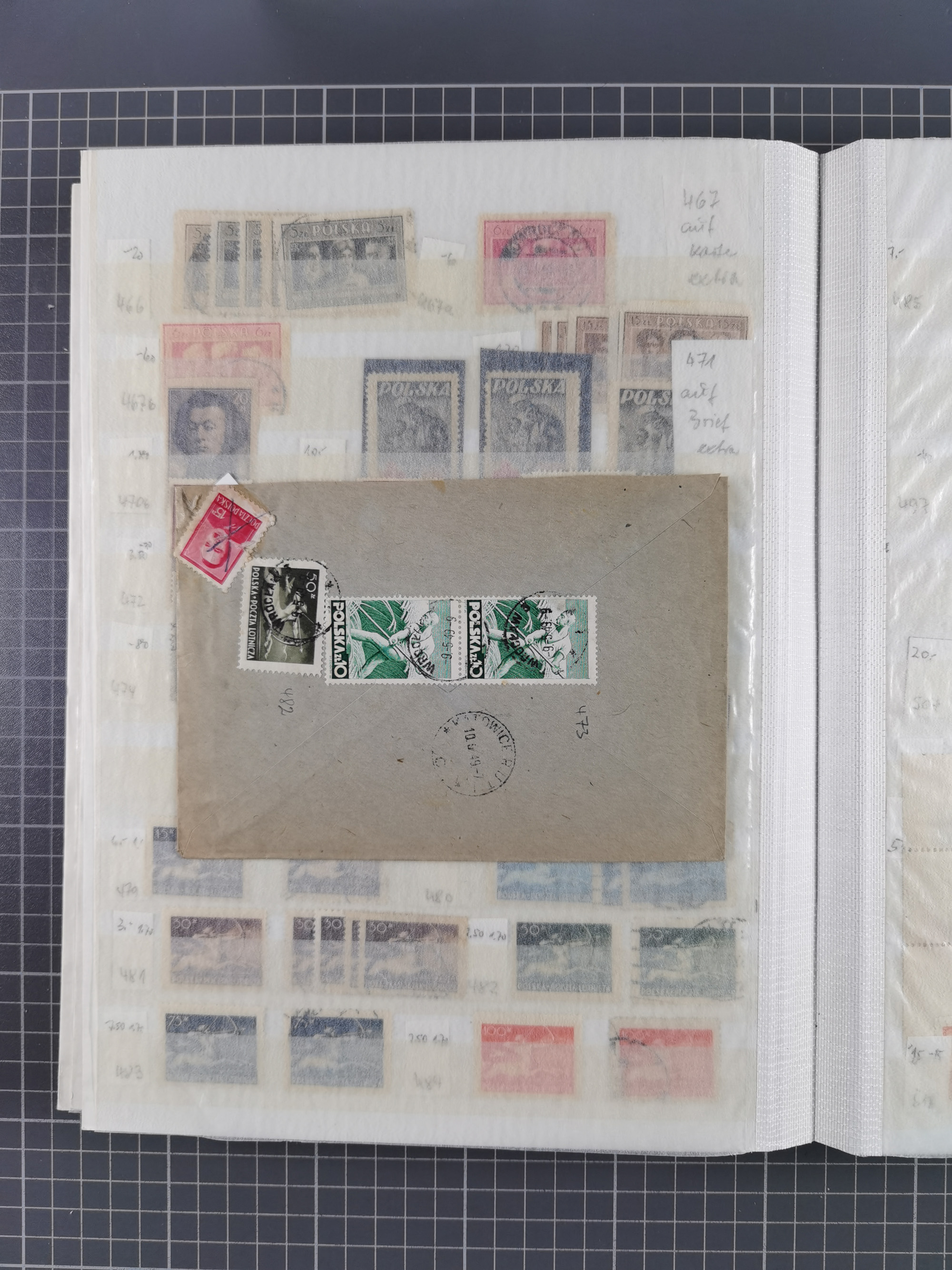 1918/19, interesting, unused/mint never hinged/used collection “Germania overprint issues,” including local issues with better items, including Mi.-No. 135-136, overprint varieties, stamps with margins, multiples, better postmarks, and some covers, including Mi.-No. 10 DD and 11 DD unused, Mi.-Nr. 135 as unused and mint never hinged block of four, and local issues including Brzeziny 2½-60 pfg. complete on letter fragments, Kolo Type II 2½-60 pfg. complete, unused, Ostroleka 40 pfg. unused, Ostrow with several values unused or on letter fragments, Pultusk with nine unused and used stamps, and Wloclawek with many stamps/overprints, including inverted overprints, many with good signatures Jungjohann BPP, Landré, etc. In addition, various overprint forgeries (some on covers) and some defective stamps from the so-called “Poznan find 1939,” mostly neatly on written-up album pages