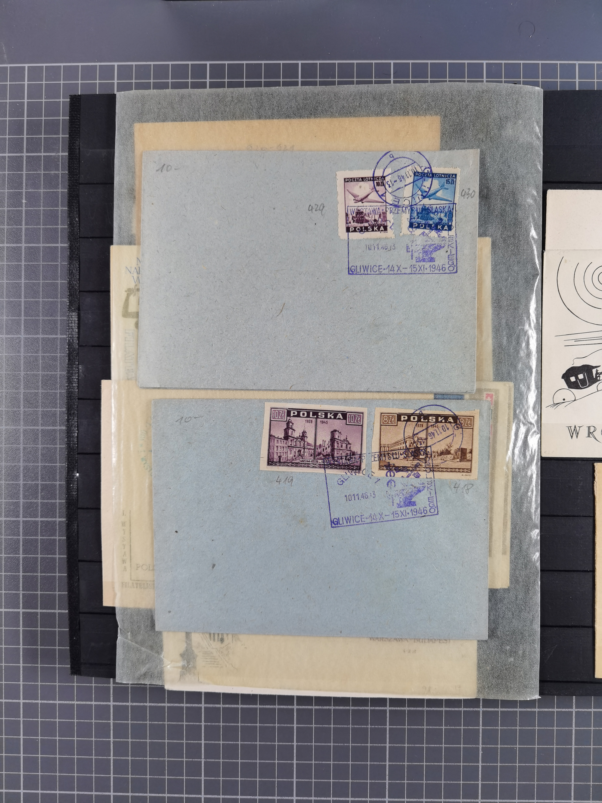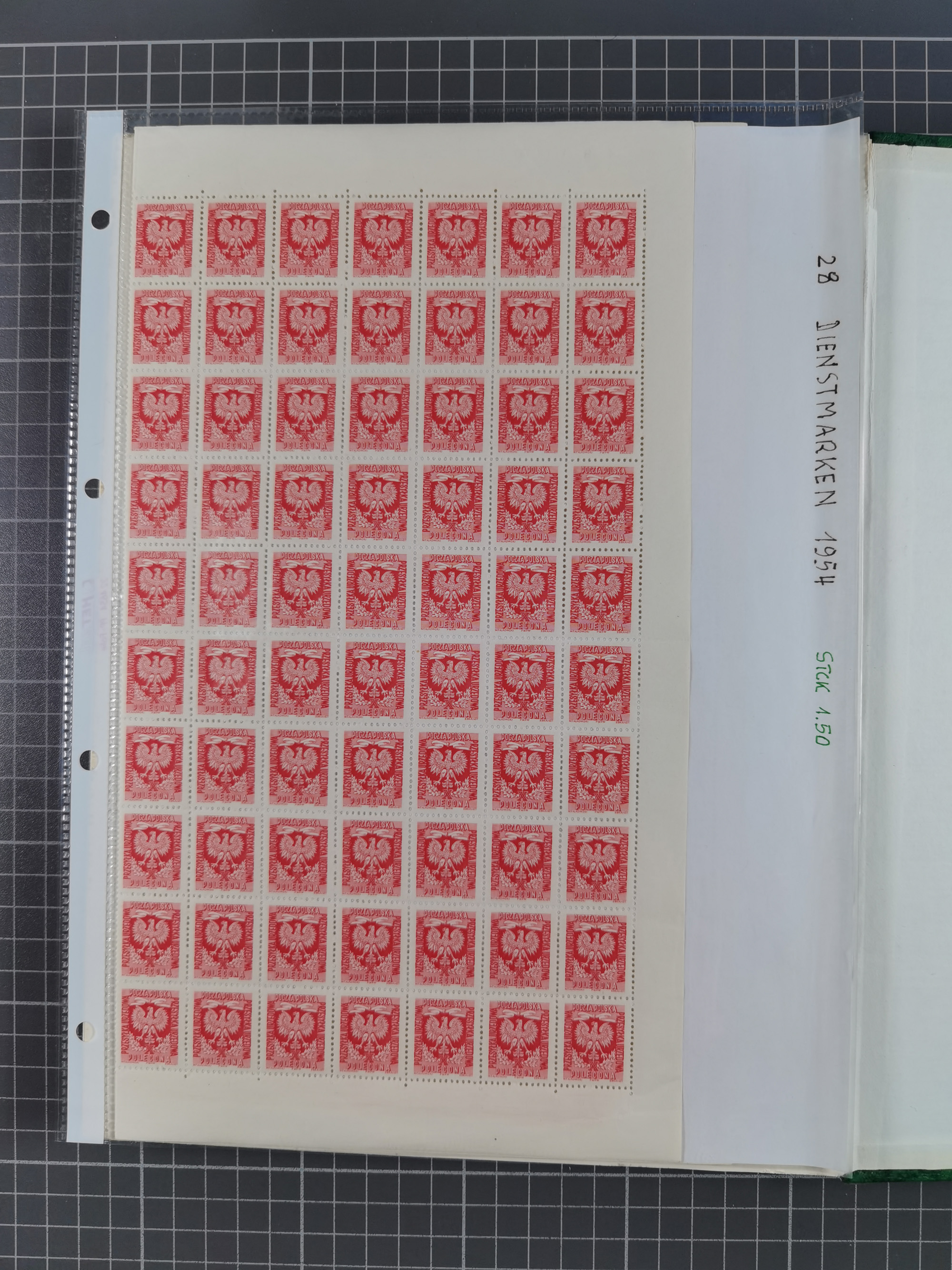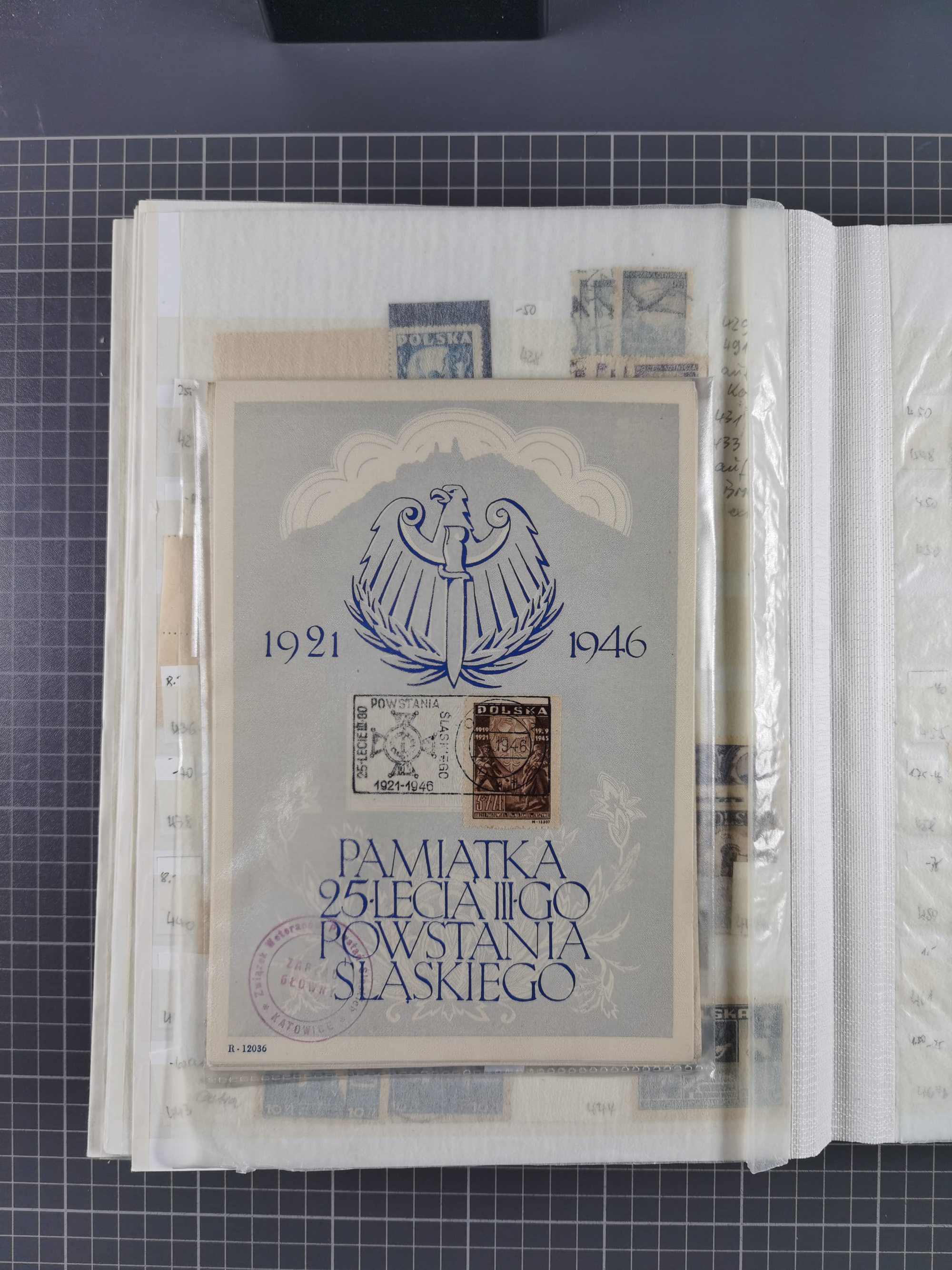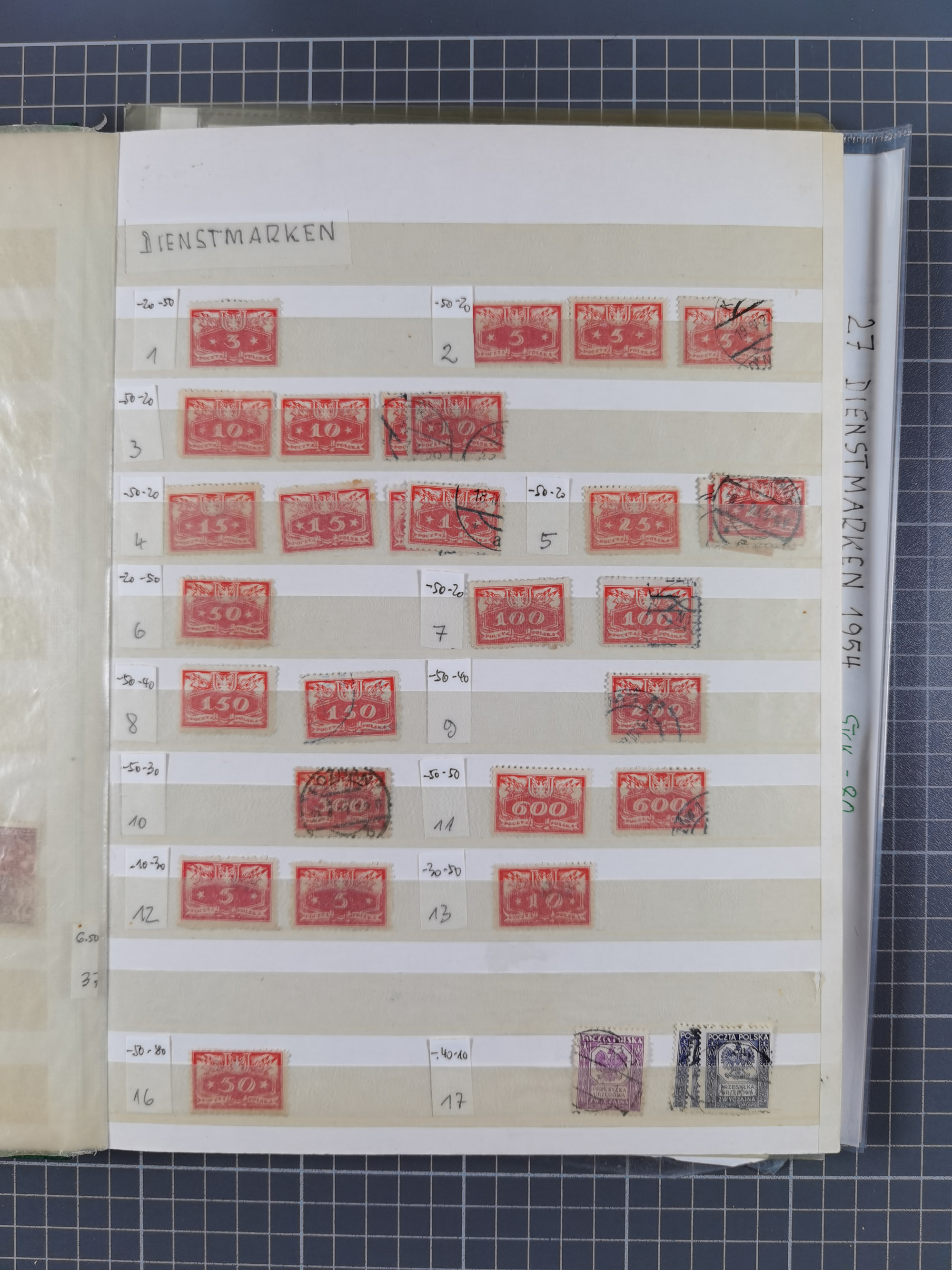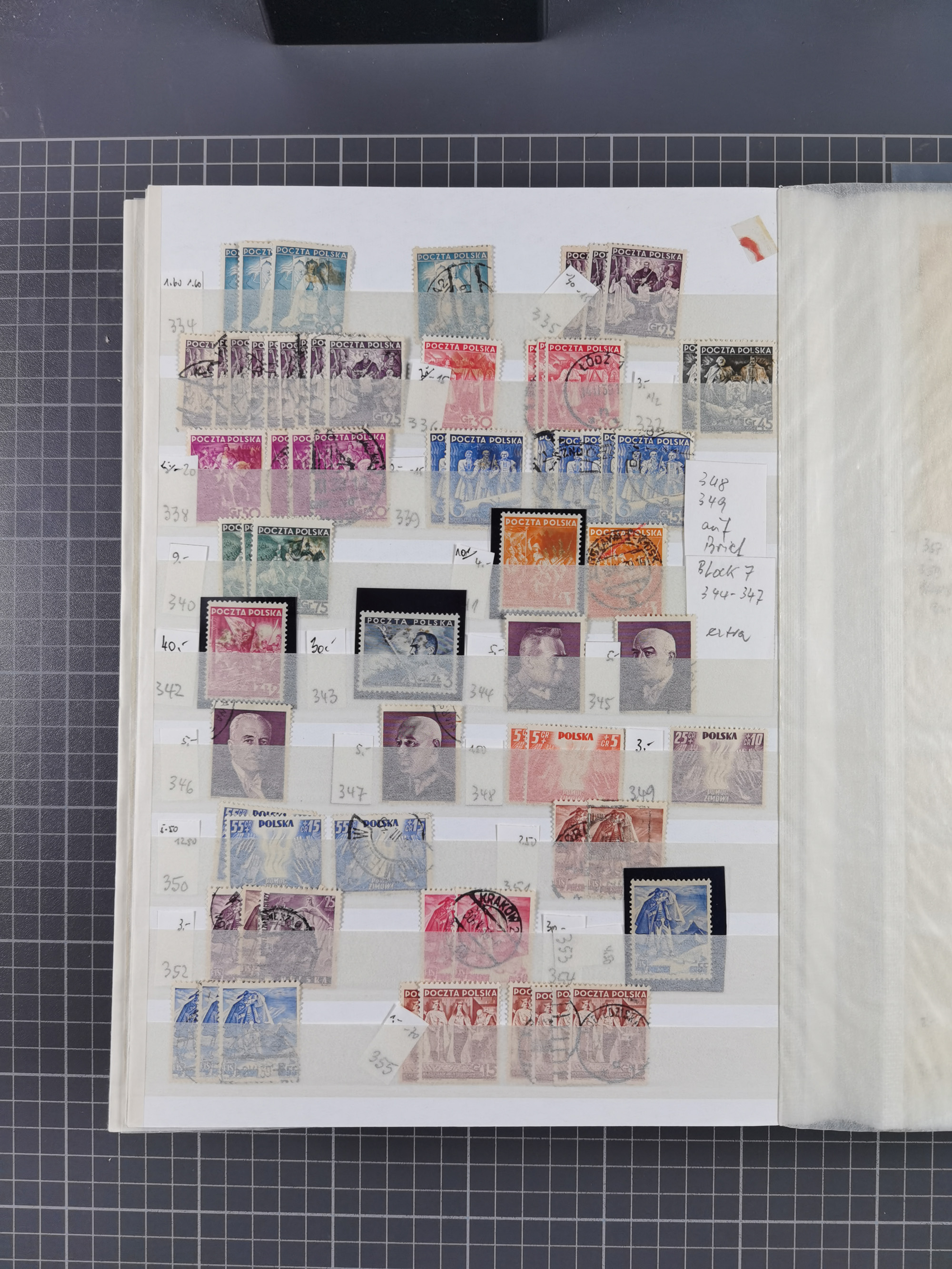 1918/19, interesting, unused/mint never hinged/used collection “Germania overprint issues,” including local issues with better items, including Mi.-No. 135-136, overprint varieties, stamps with margins, multiples, better postmarks, and some covers, including Mi.-No. 10 DD and 11 DD unused, Mi.-Nr. 135 as unused and mint never hinged block of four, and local issues including Brzeziny 2½-60 pfg. complete on letter fragments, Kolo Type II 2½-60 pfg. complete, unused, Ostroleka 40 pfg. unused, Ostrow with several values unused or on letter fragments, Pultusk with nine unused and used stamps, and Wloclawek with many stamps/overprints, including inverted overprints, many with good signatures Jungjohann BPP, Landré, etc. In addition, various overprint forgeries (some on covers) and some defective stamps from the so-called “Poznan find 1939,” mostly neatly on written-up album pages