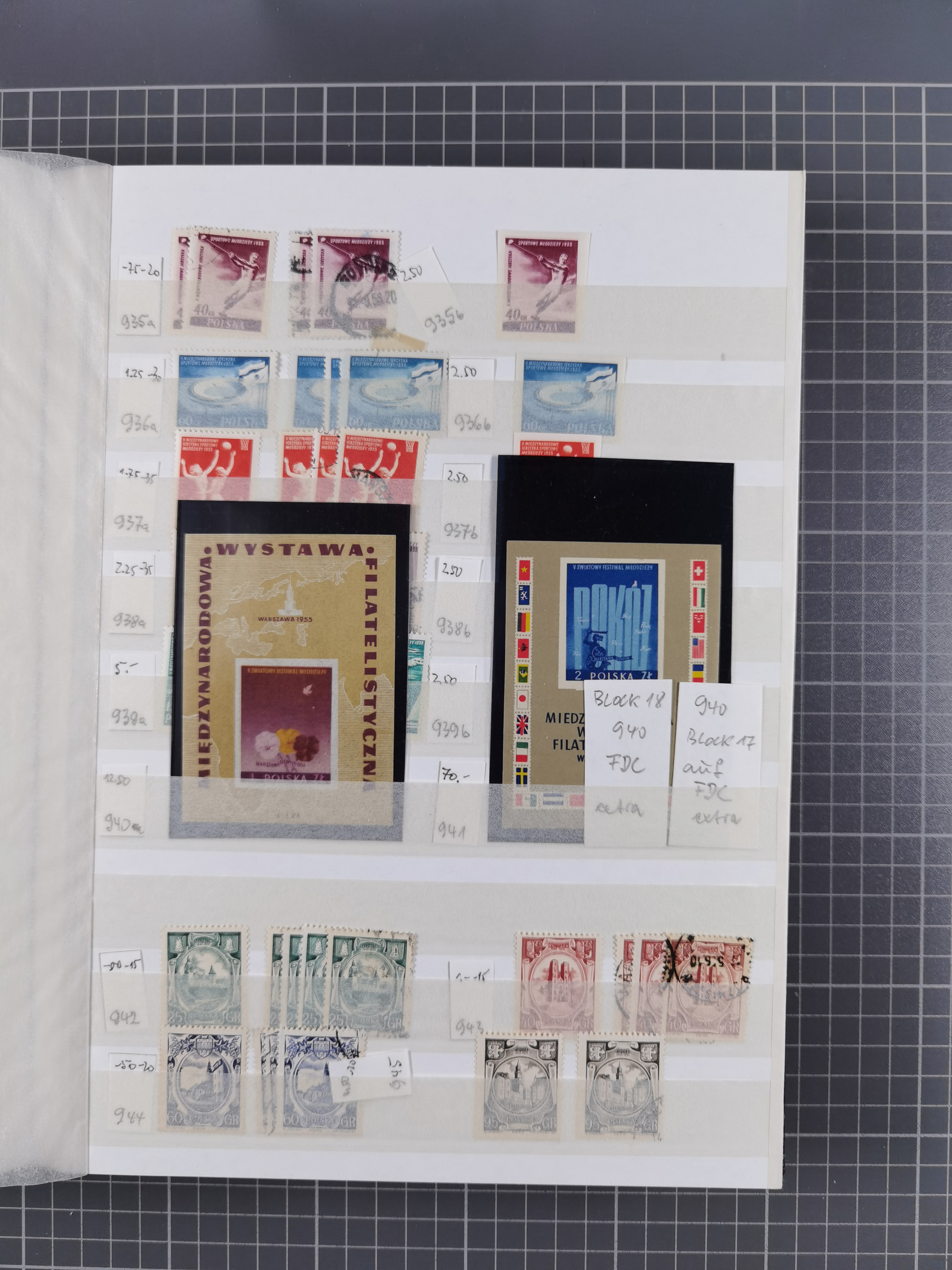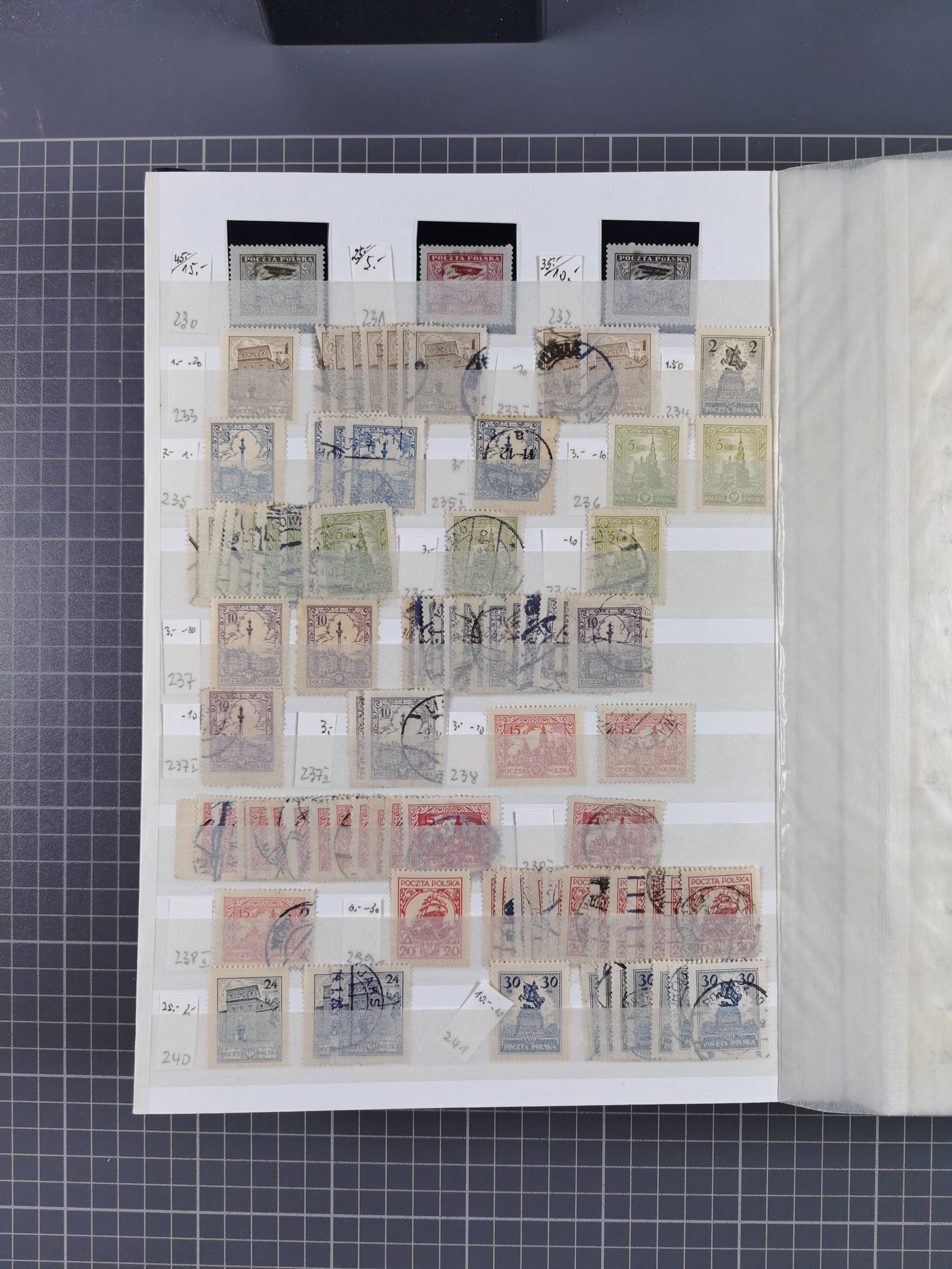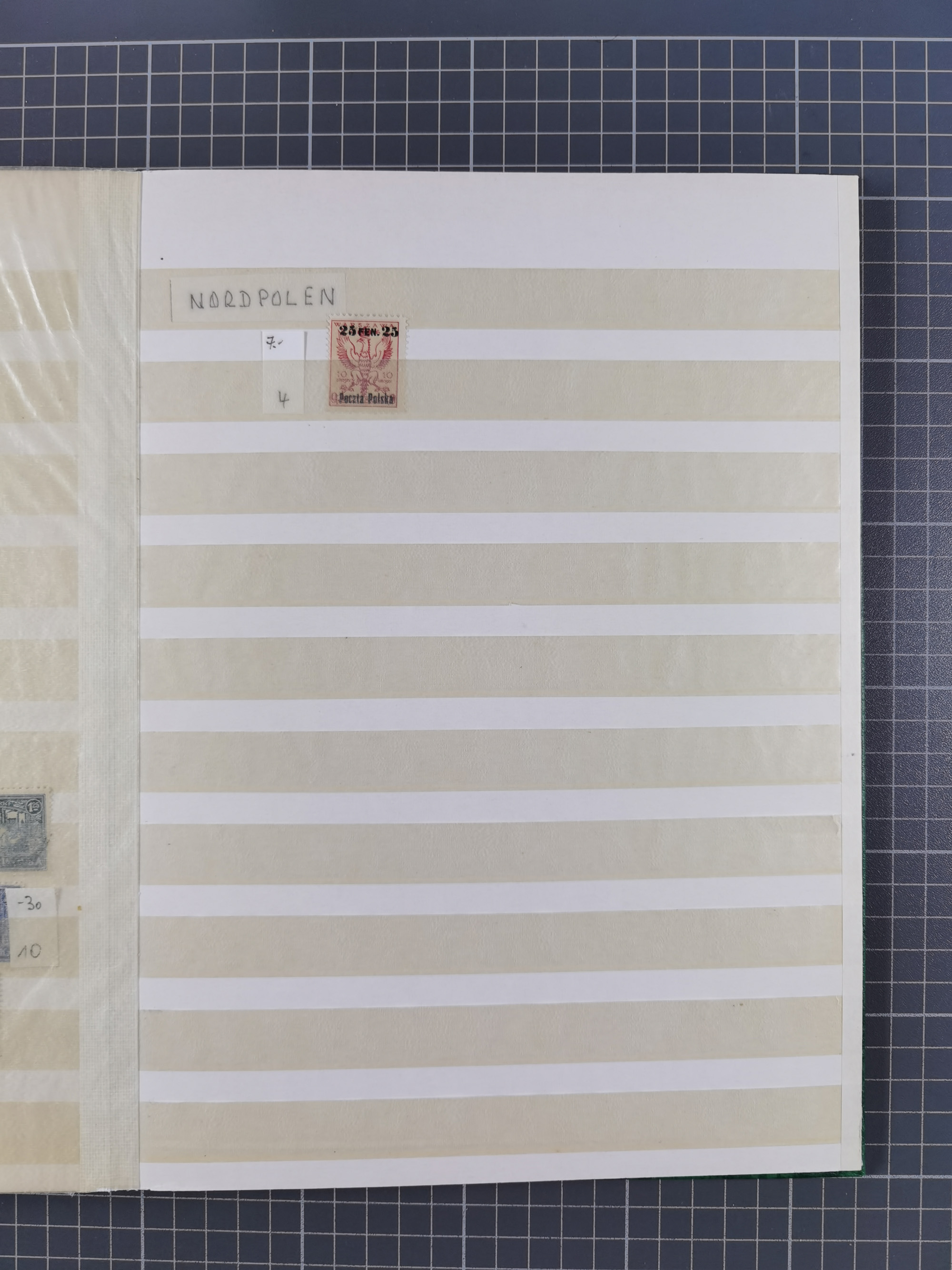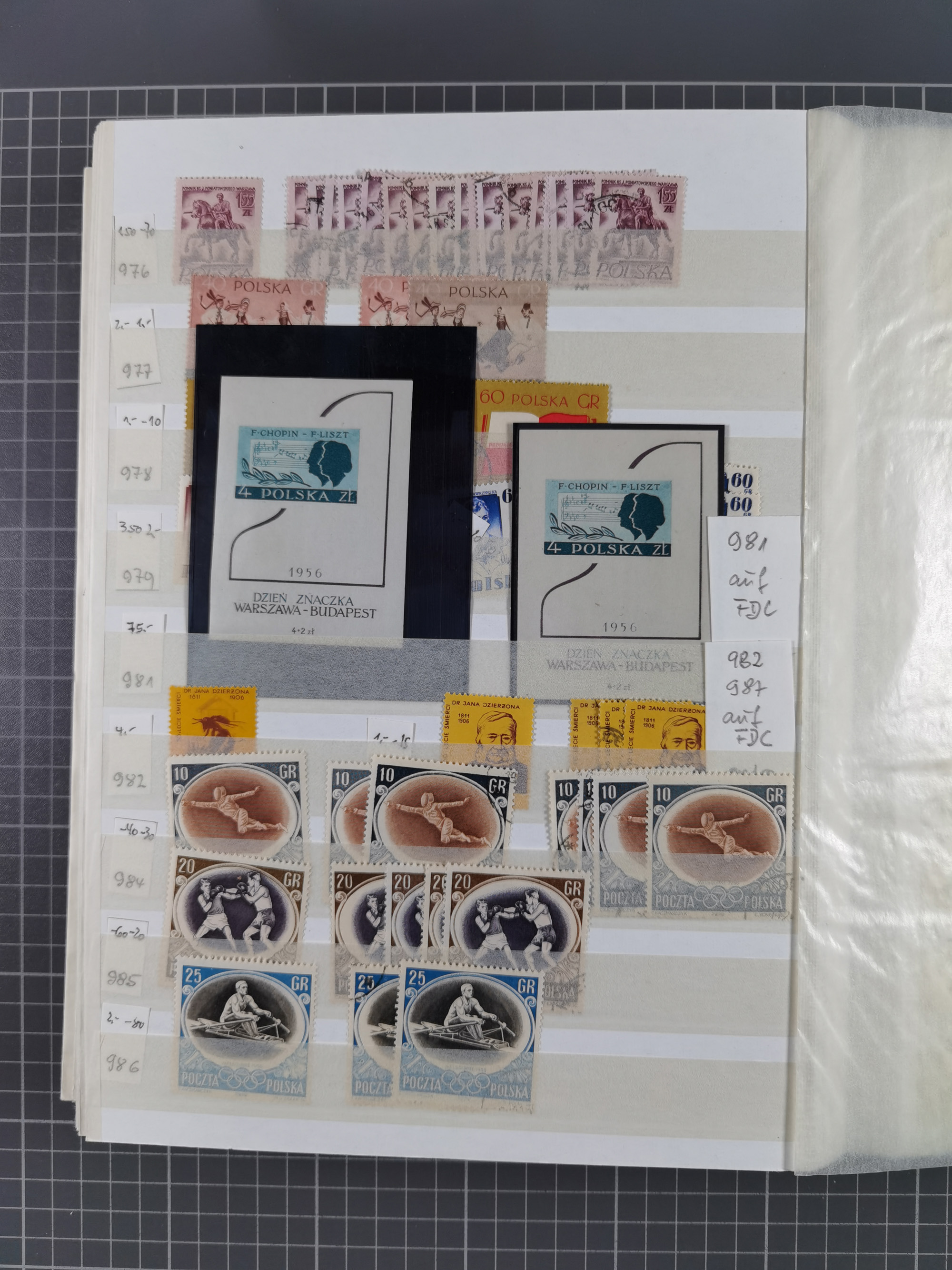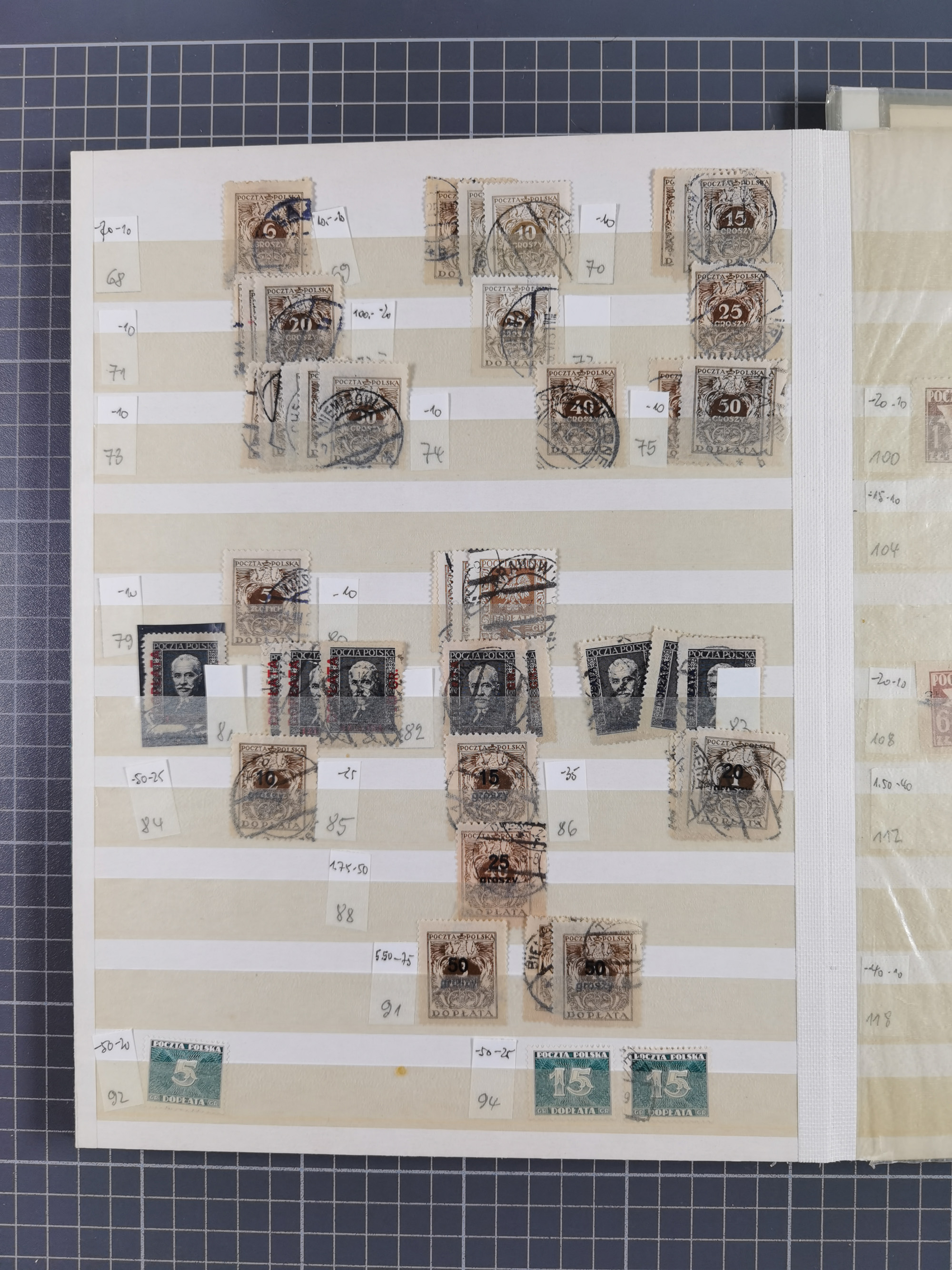 1918/19, interesting, unused/mint never hinged/used collection “Germania overprint issues,” including local issues with better items, including Mi.-No. 135-136, overprint varieties, stamps with margins, multiples, better postmarks, and some covers, including Mi.-No. 10 DD and 11 DD unused, Mi.-Nr. 135 as unused and mint never hinged block of four, and local issues including Brzeziny 2½-60 pfg. complete on letter fragments, Kolo Type II 2½-60 pfg. complete, unused, Ostroleka 40 pfg. unused, Ostrow with several values unused or on letter fragments, Pultusk with nine unused and used stamps, and Wloclawek with many stamps/overprints, including inverted overprints, many with good signatures Jungjohann BPP, Landré, etc. In addition, various overprint forgeries (some on covers) and some defective stamps from the so-called “Poznan find 1939,” mostly neatly on written-up album pages