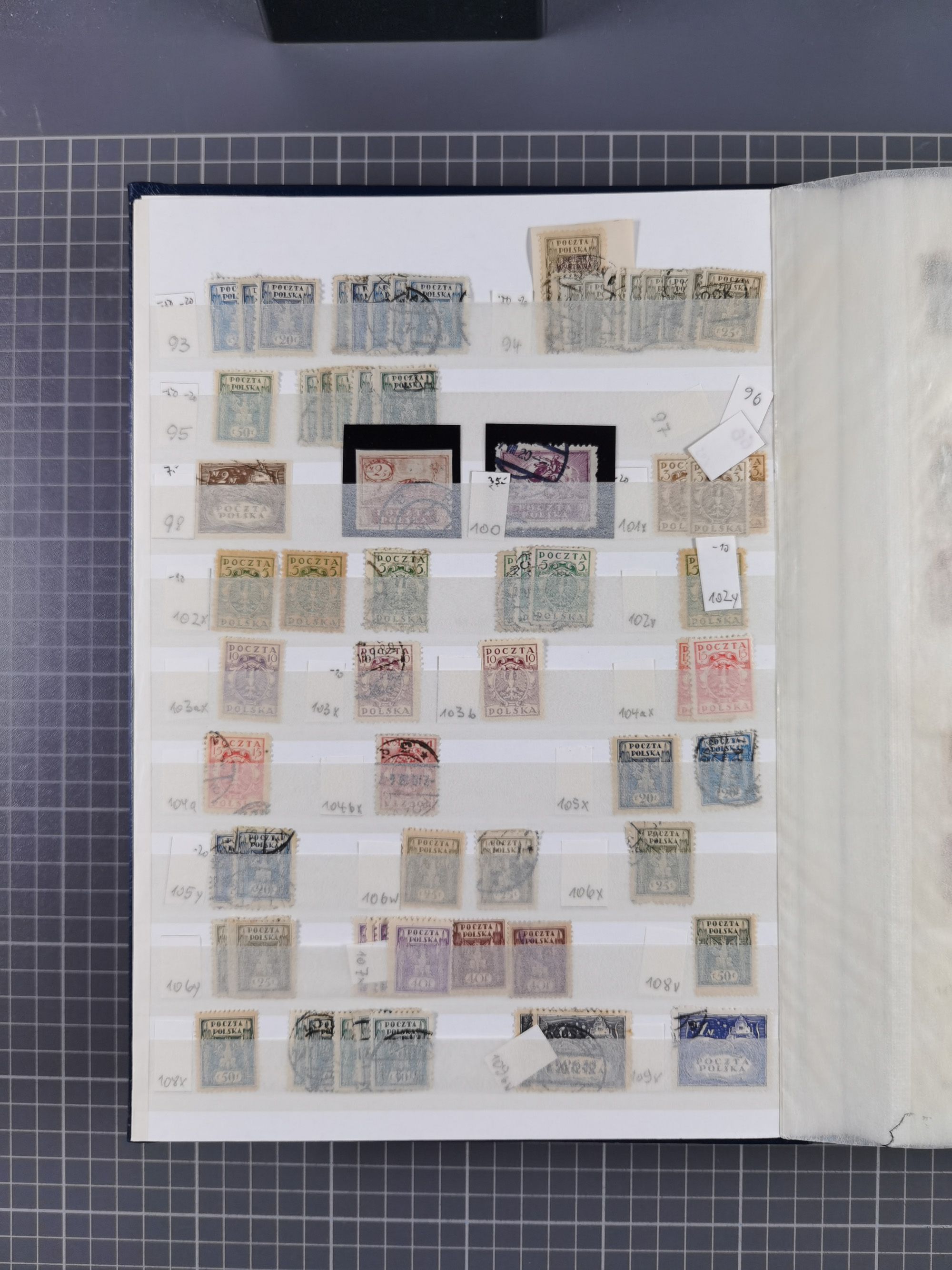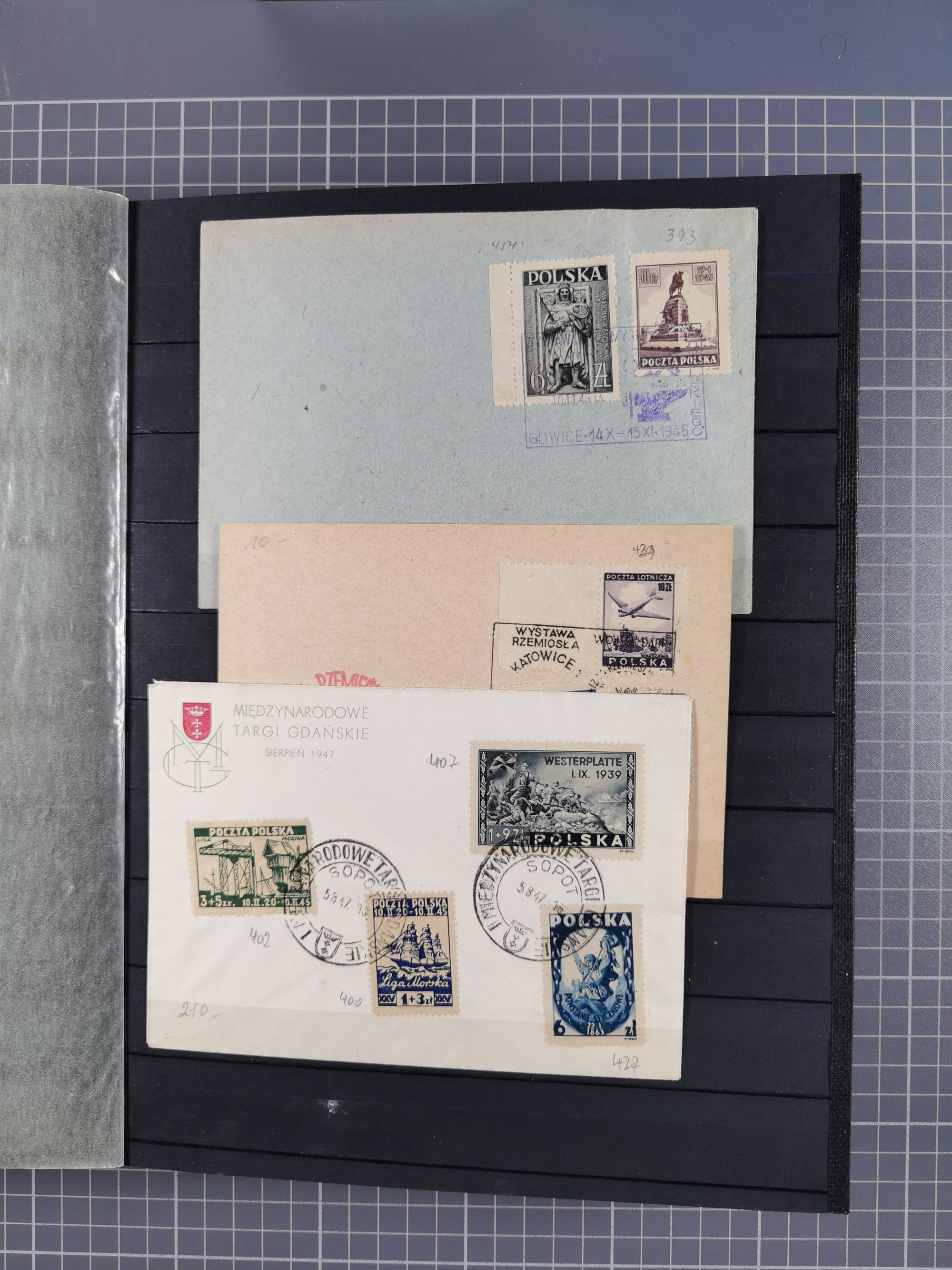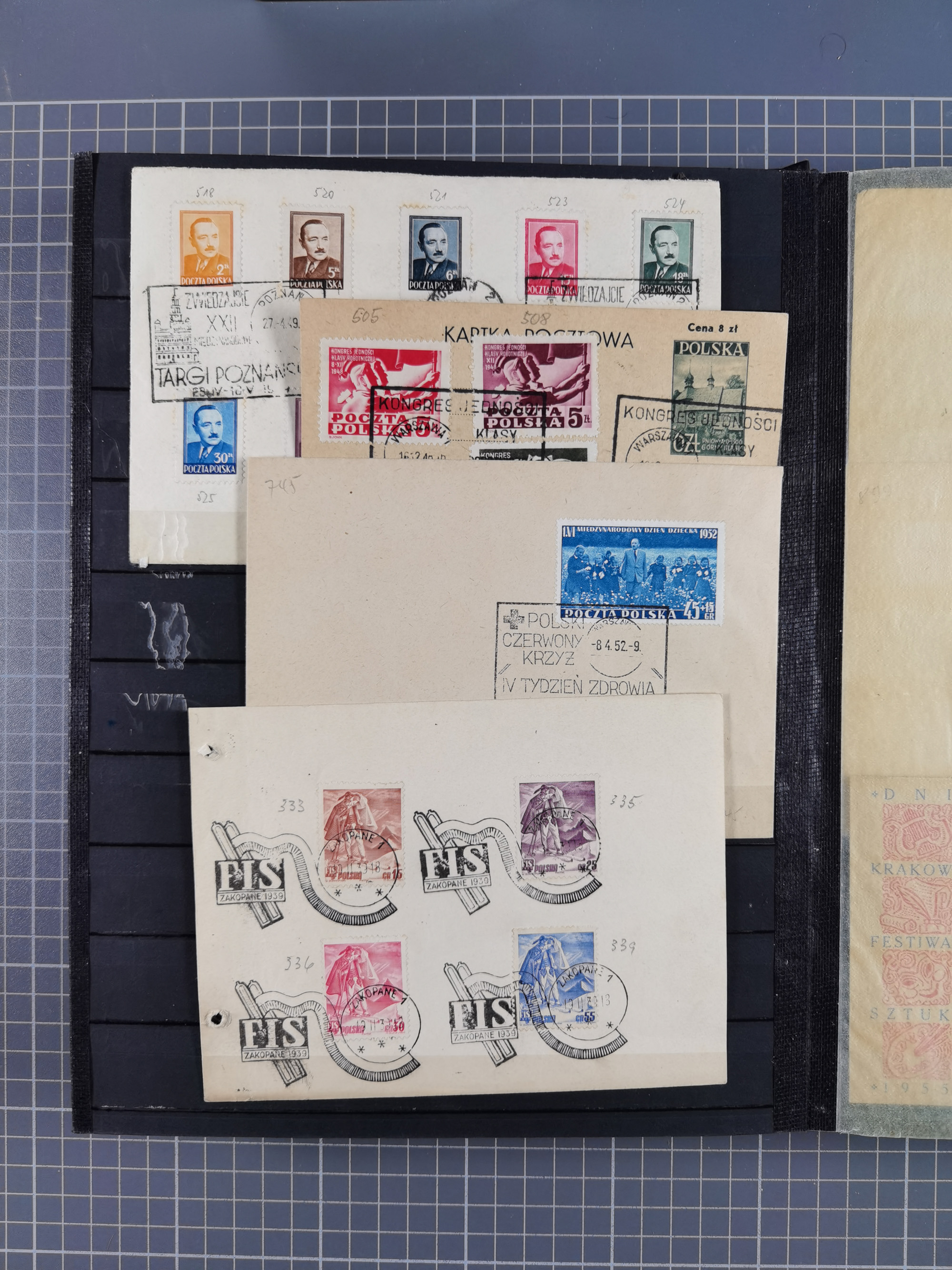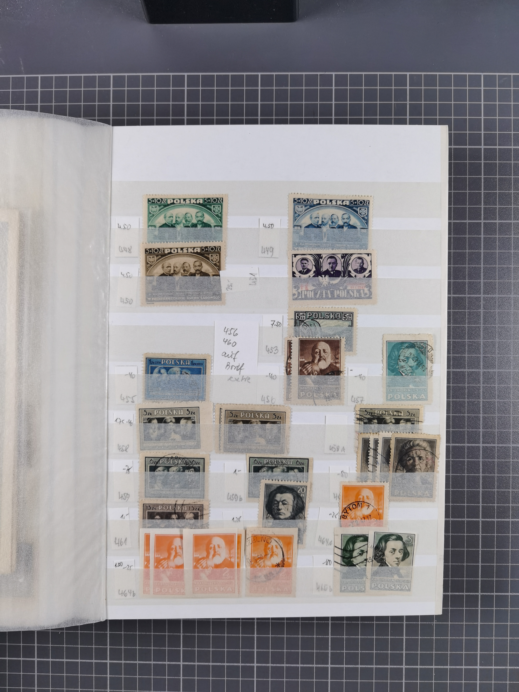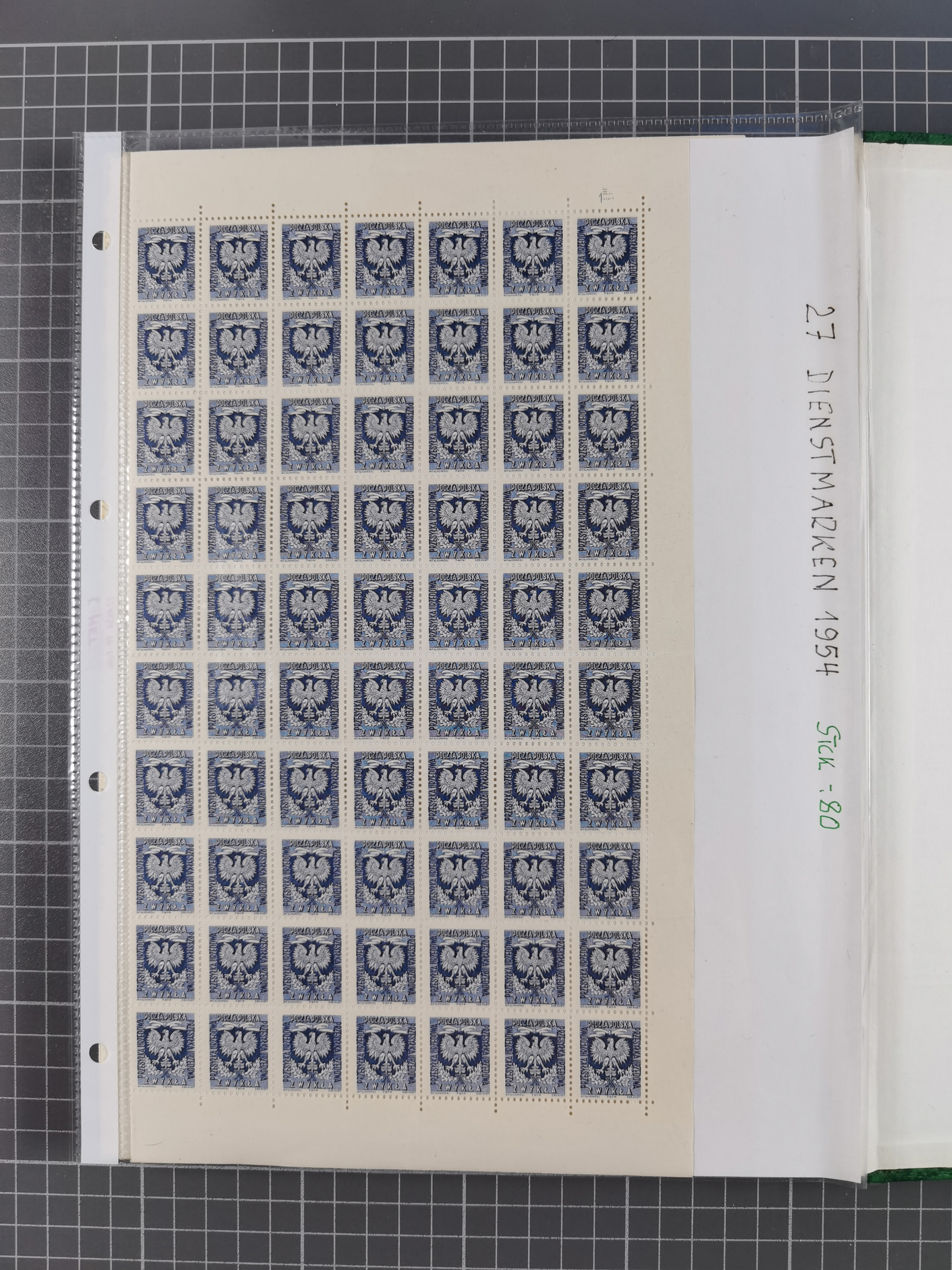 1918/19, interesting, unused/mint never hinged/used collection “Germania overprint issues,” including local issues with better items, including Mi.-No. 135-136, overprint varieties, stamps with margins, multiples, better postmarks, and some covers, including Mi.-No. 10 DD and 11 DD unused, Mi.-Nr. 135 as unused and mint never hinged block of four, and local issues including Brzeziny 2½-60 pfg. complete on letter fragments, Kolo Type II 2½-60 pfg. complete, unused, Ostroleka 40 pfg. unused, Ostrow with several values unused or on letter fragments, Pultusk with nine unused and used stamps, and Wloclawek with many stamps/overprints, including inverted overprints, many with good signatures Jungjohann BPP, Landré, etc. In addition, various overprint forgeries (some on covers) and some defective stamps from the so-called “Poznan find 1939,” mostly neatly on written-up album pages