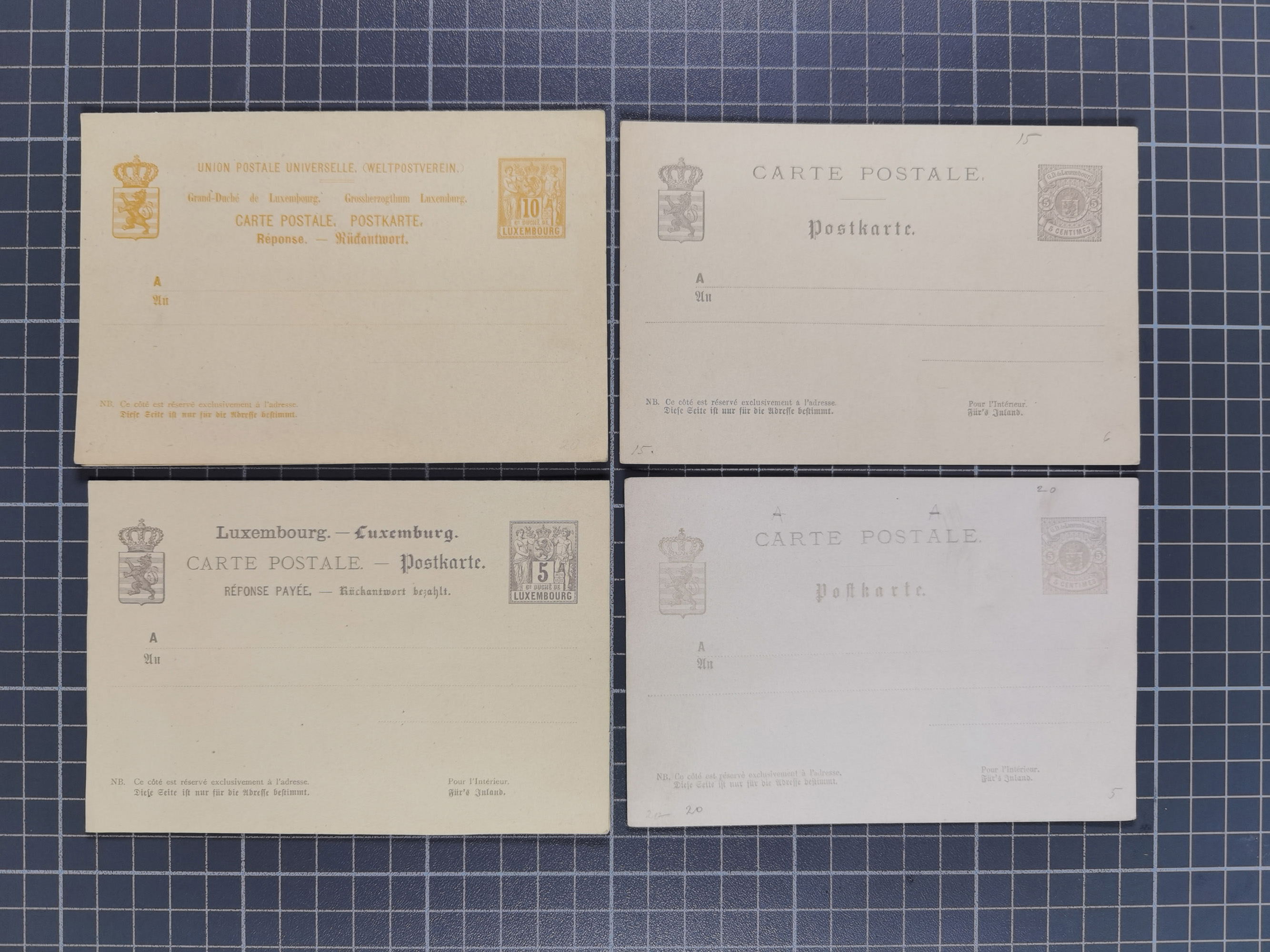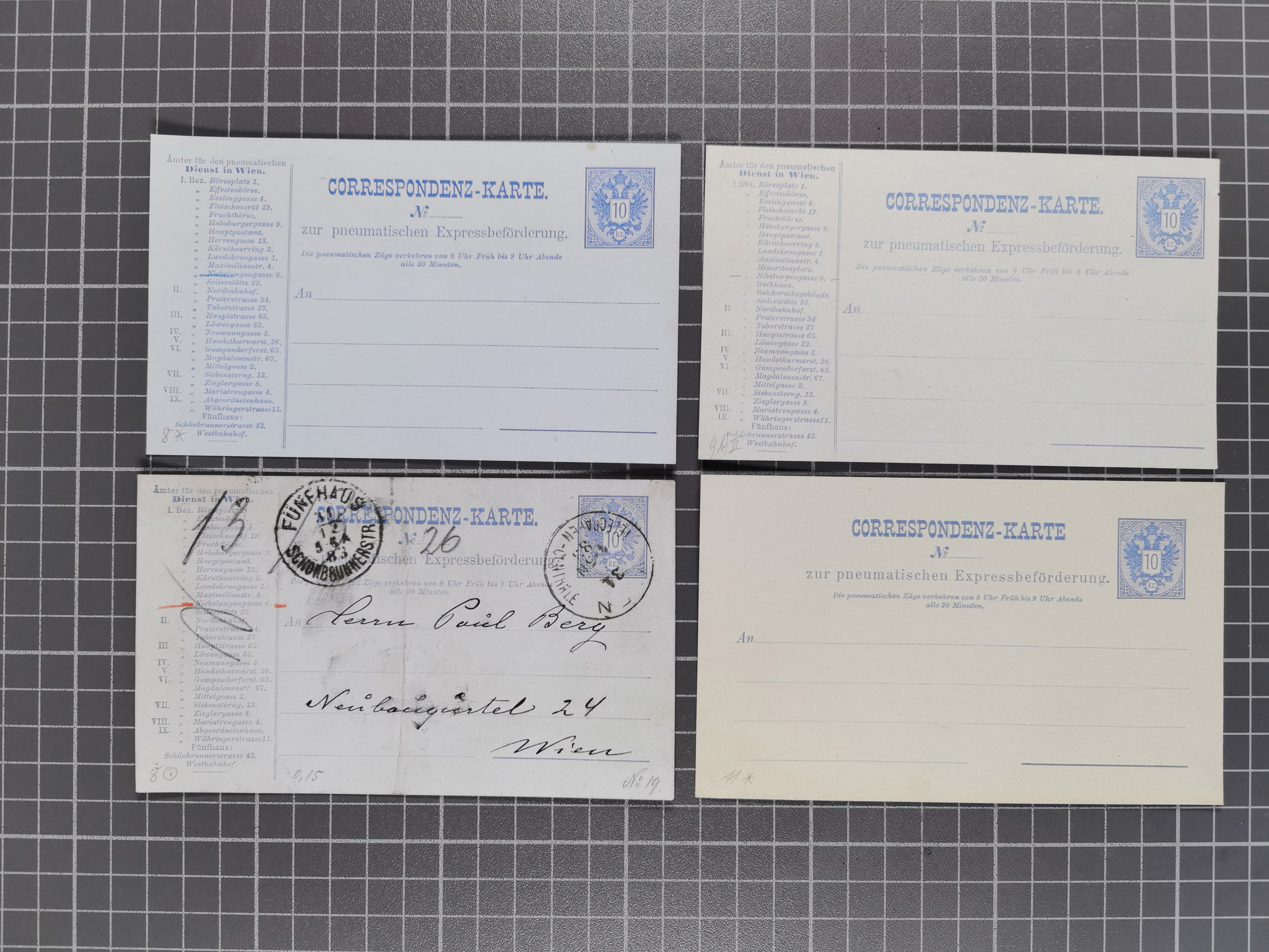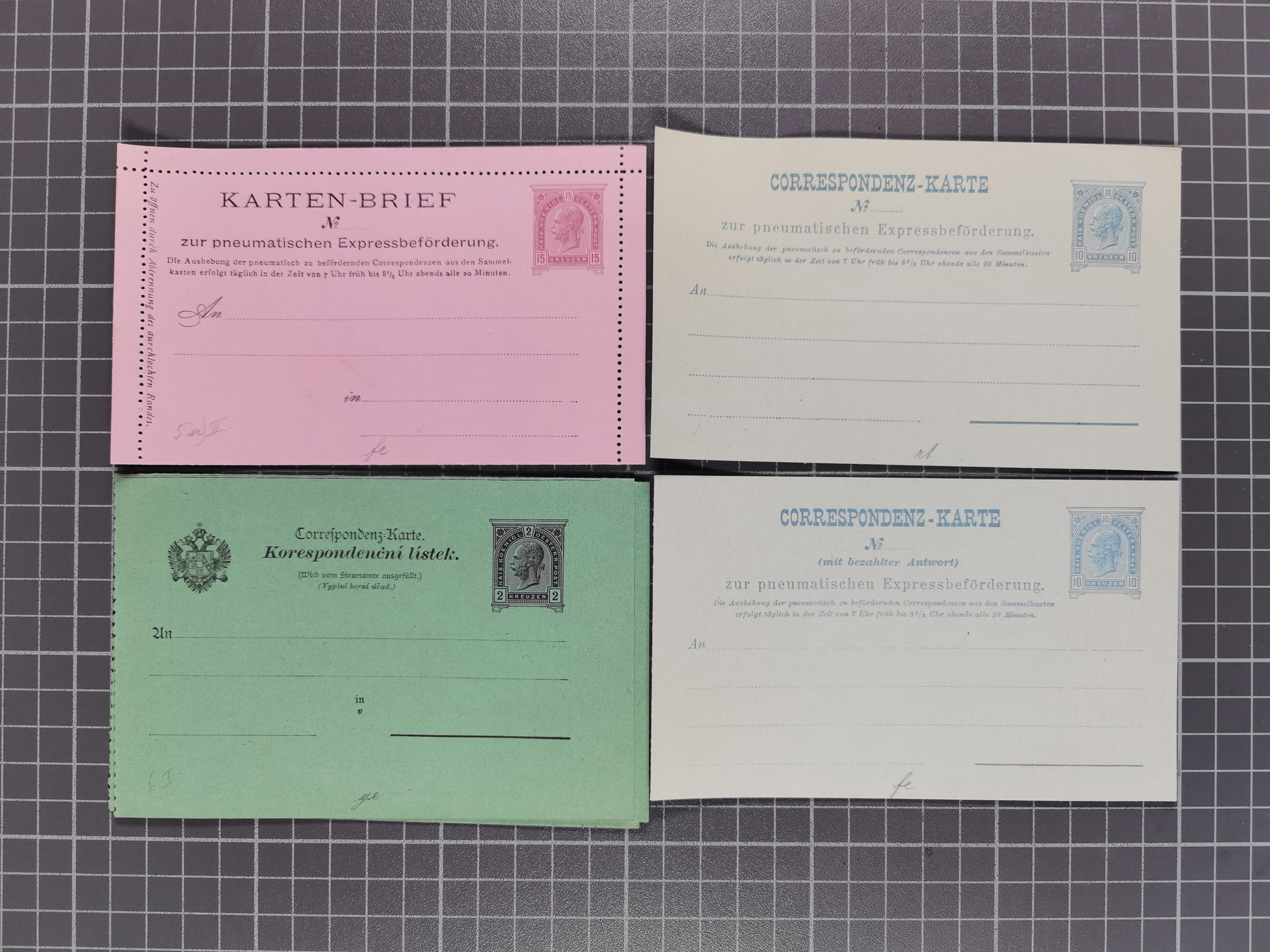 1879/1900, Sammlung von 15 meist verschiedenen Ganzsachenkarten zur pneumatischen Expressbeförderung, überwiegend ungebraucht, dabei auch Steuer-Postanweisungen, dazu einige ältere Karten, teils mit Falzresten, ansonsten überwiegend tadellos.