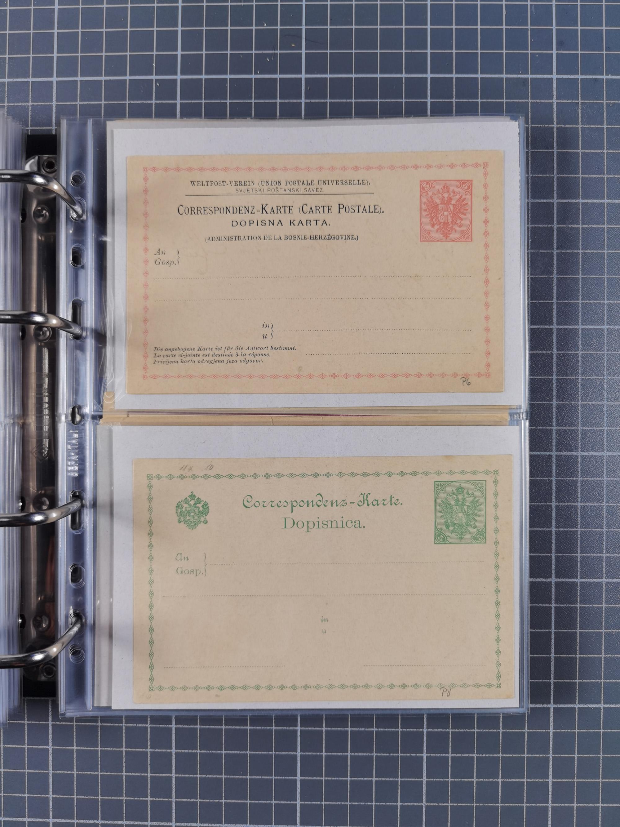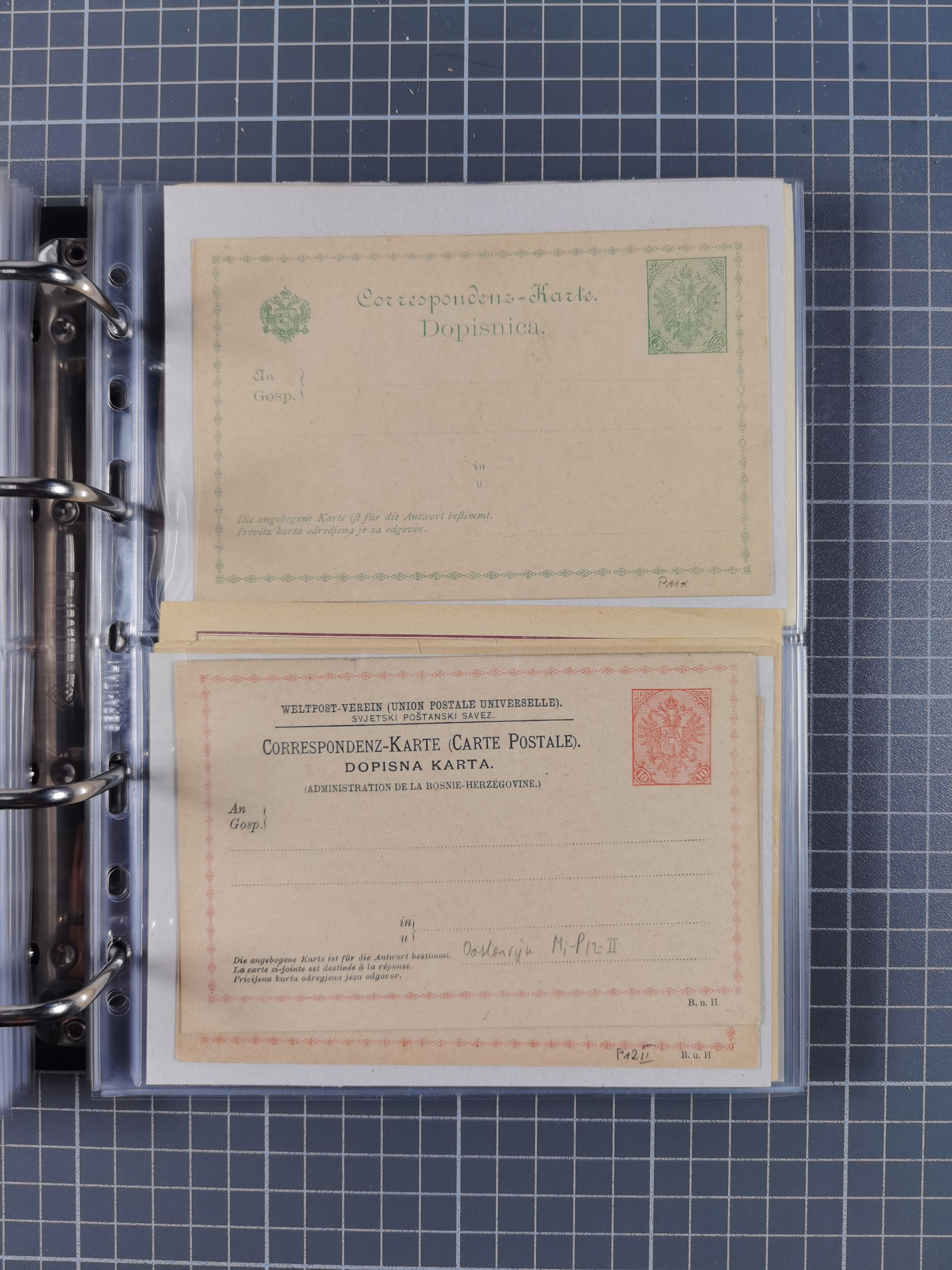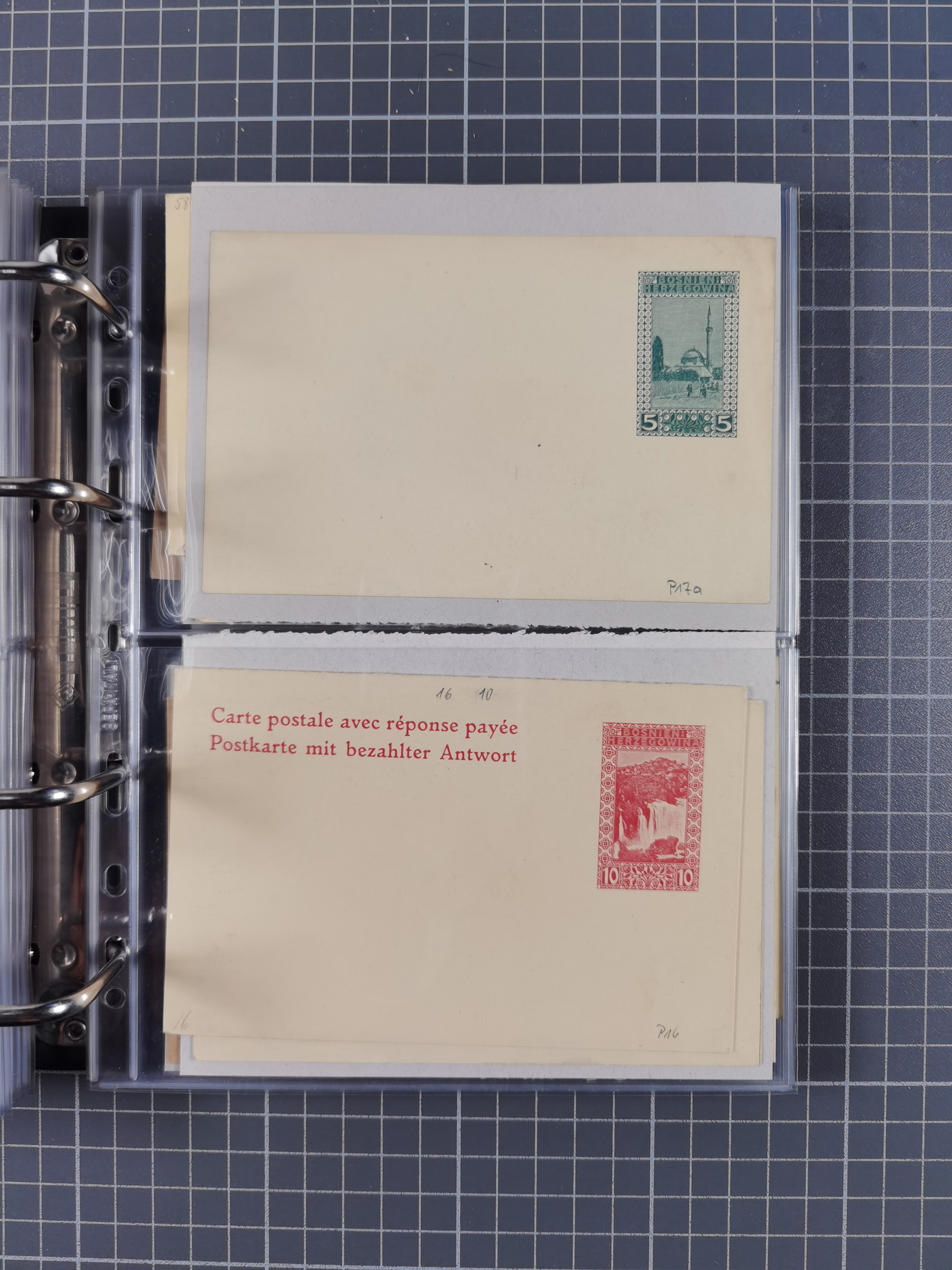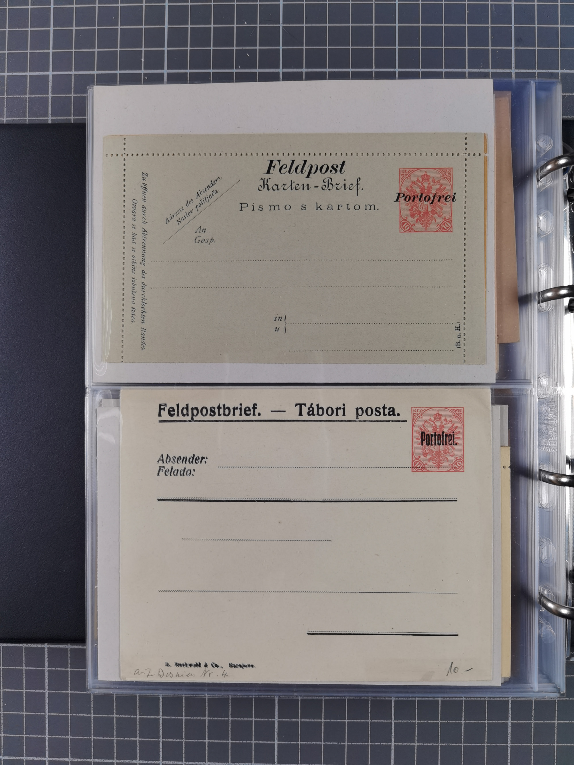 1879/1918, Ganzsachensammlung im Album mit Antwortkarten und Kartenbriefen, insgesamt über 60 Stück. Doppelzensurkarte nach Konstantinopel 1915 mit Bericht über das Kriegsgeschehen, meist gebraucht mit gesuchten Stempeln, dabei Gracanica, Samac, Tuzla-Doboj, Gorazda, Drvar, Trebinje, Foca, Livno und einige Feldpost.