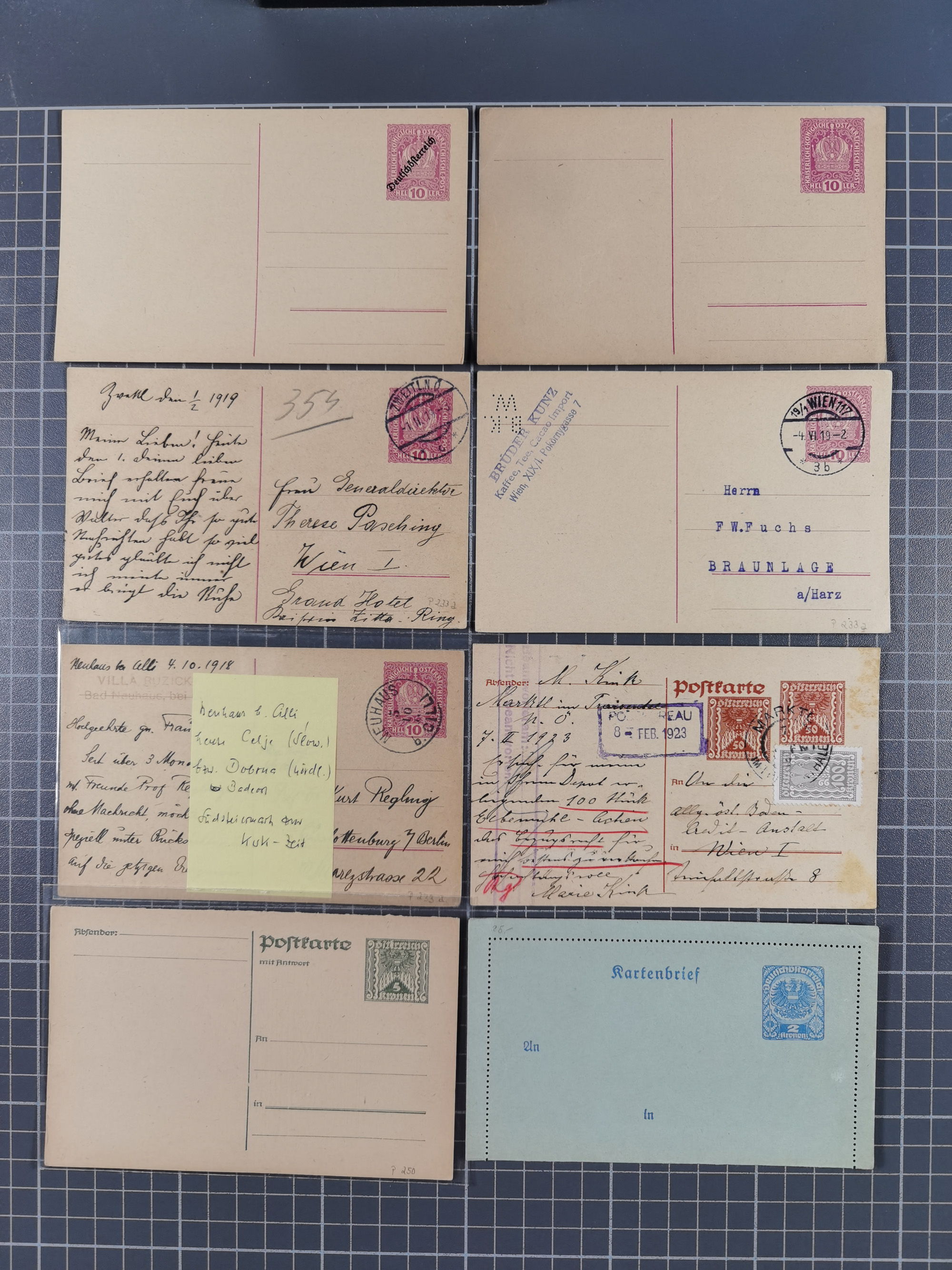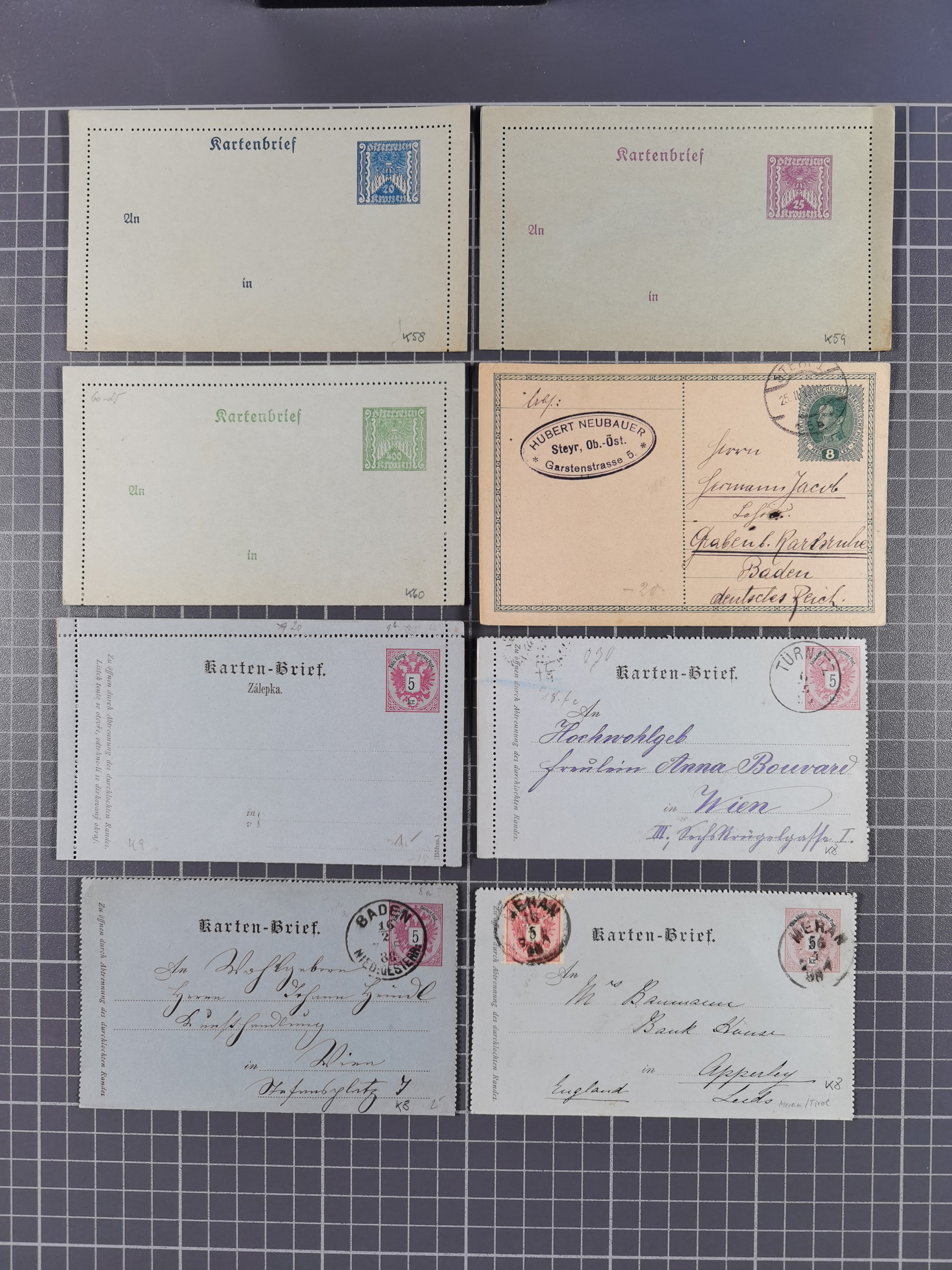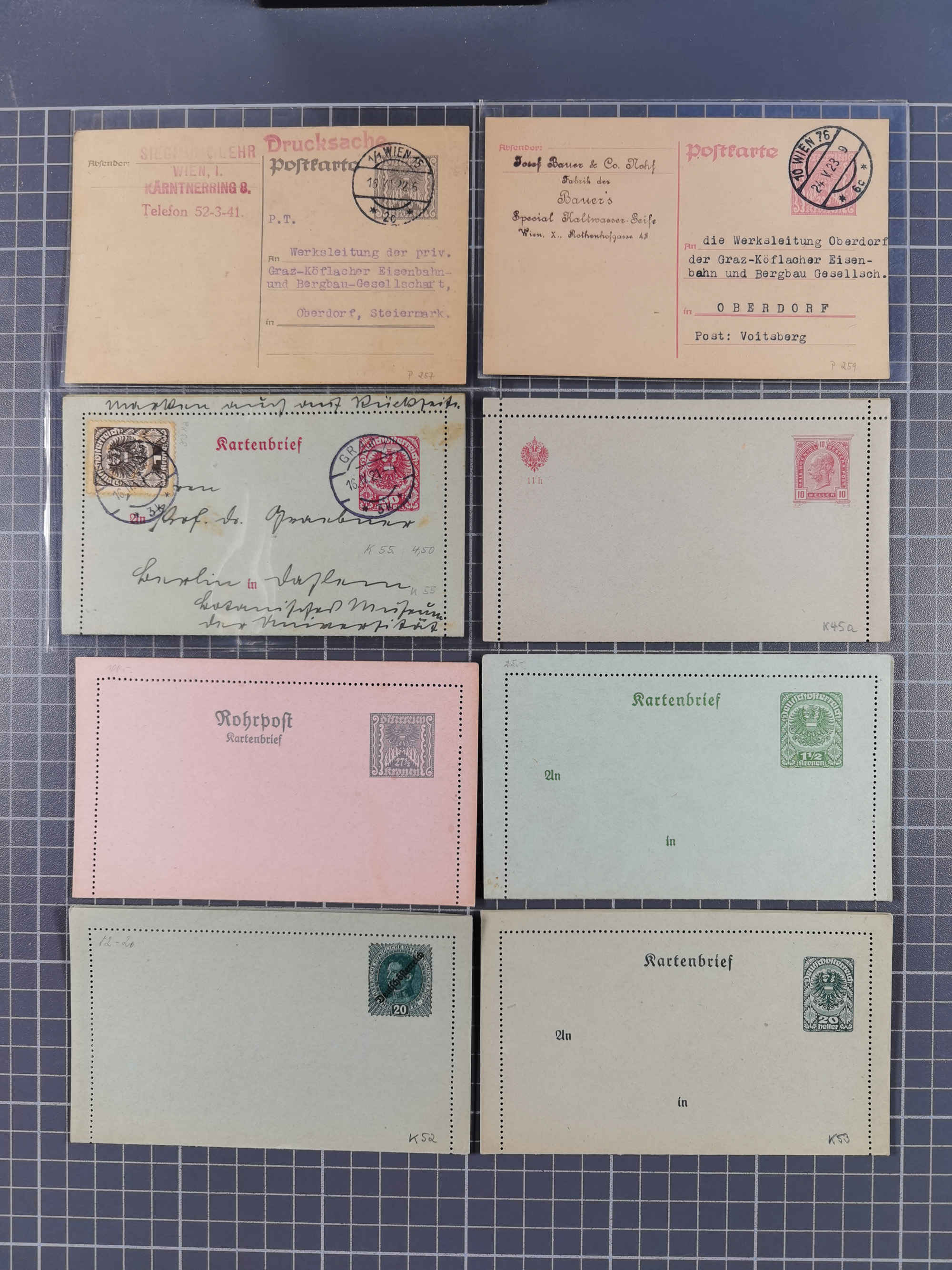 1870/1913 (ca.), umfangreiche aufgezogene Heimat-Sammlung “Herzogtum Steiermark (Styria)”, Bruck bis Windischgraz, mit über 1400 Briefen und Karten, bessere Frankaturen, Ansichtkarten und Illustriertenkarten mit Lithos, Paketkarten und Postscheine, R-Briefe, Ortsbriefe, Ganzsachenkarten- und Umschläge, etc., Schwerpunkt bei den Ausgaben 1883 bis 1899, schöne Auswahl an Poststempeln inkl. Fingerhutstempeln und handschriftlicher Entwertungen, dabei u.a. Express-Ganzsachekarte mit Zufrankatur aus “IRDNING 7 2 97” nach Wörschach, etc., sowie zahlreiche lose Marken und Briefstücke mit meist klaren Stempel-Abschlägen. Ein außerordentlich reichaltiges und interessantes Objekt, zusammen in 22 Alben