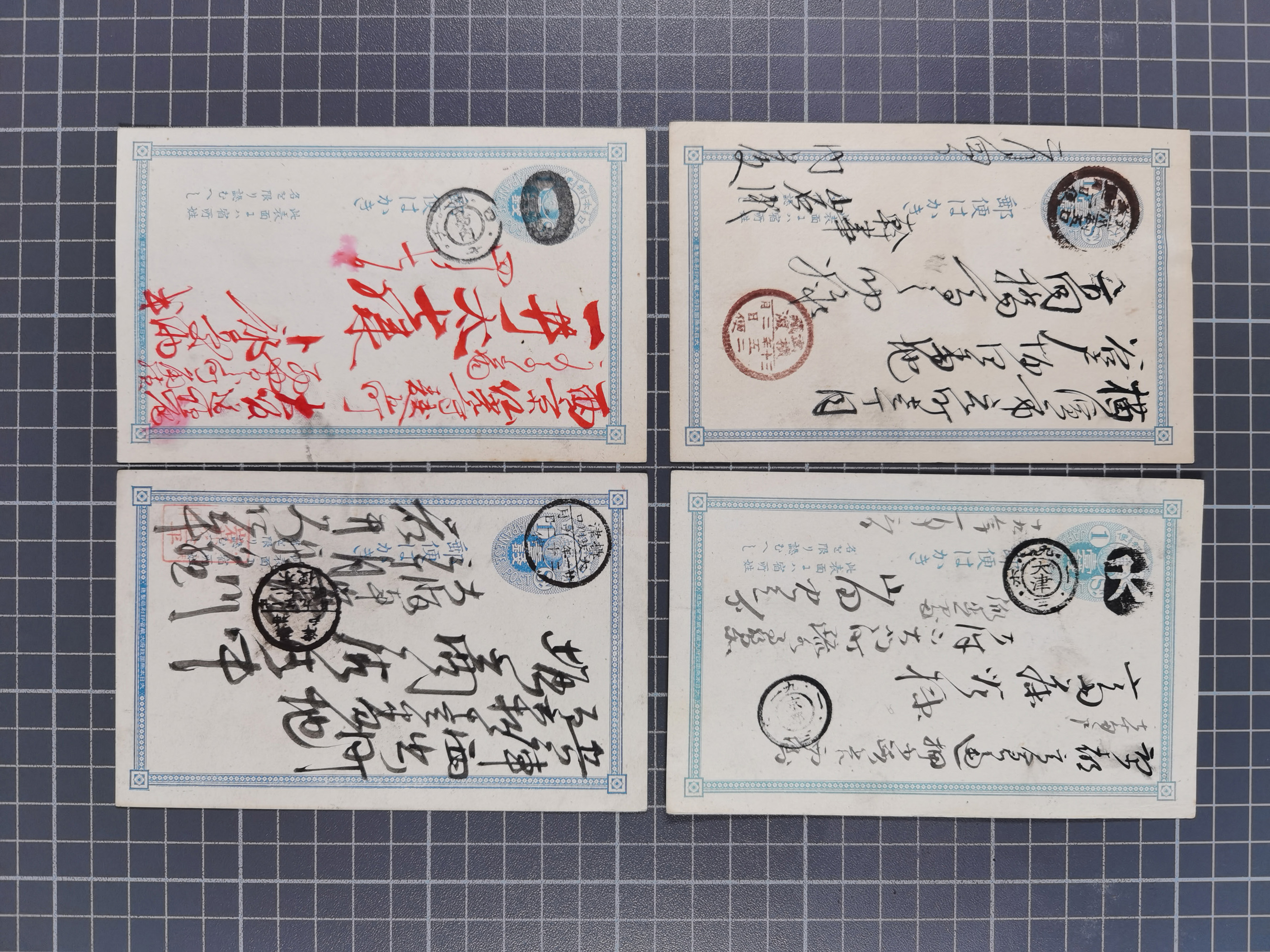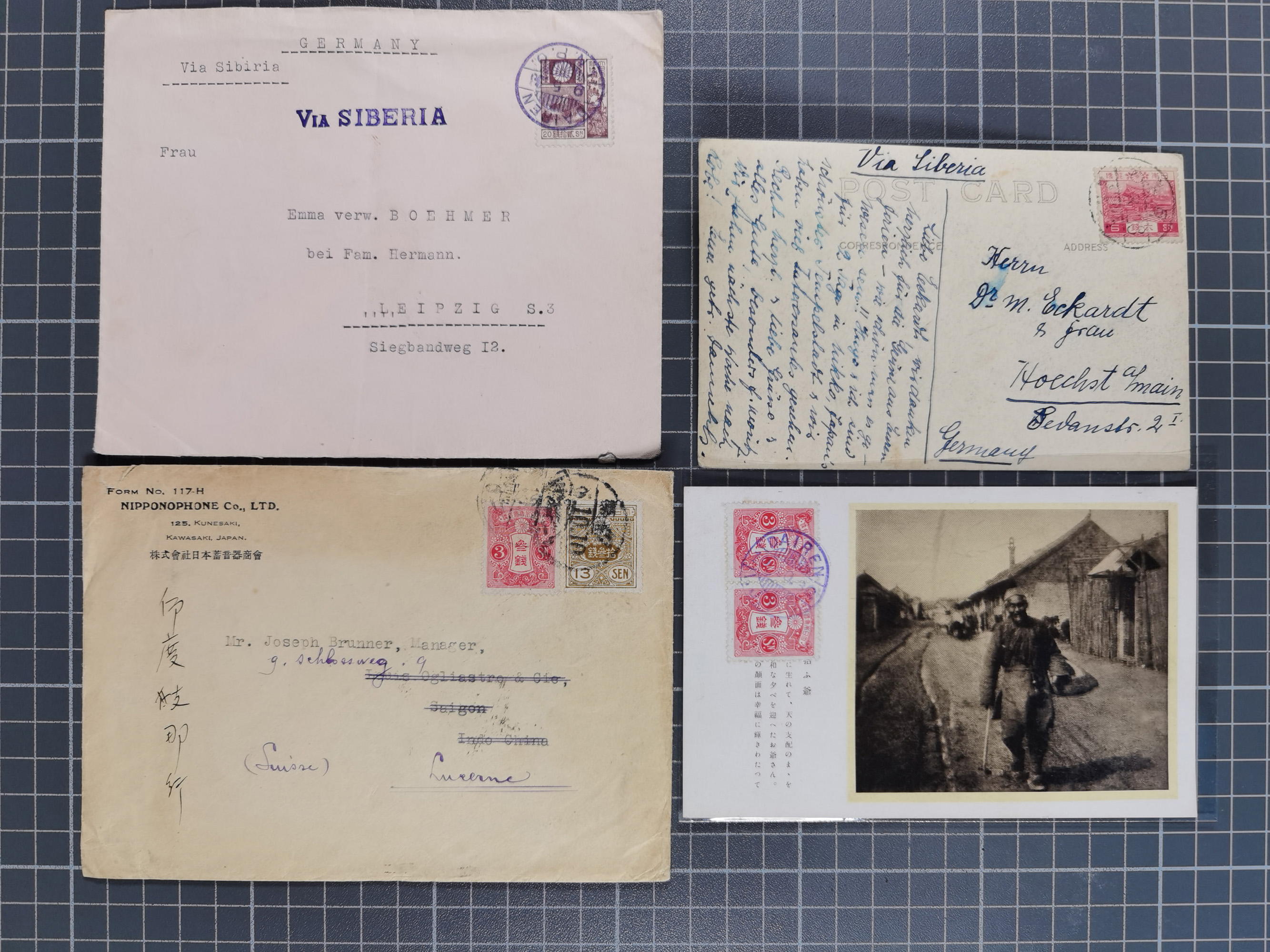 1912/20 (ca.), Chinese Republic early years, group of 13 covers and cards, noted 1 c. overprinted coiled dragon (x4) used with “PEKING” to 1913 postcard to Italy with unusual “ITALY = VIA SIBERIA” straight-line marking, also some stampless mail, printed matter, etc., together with 5 postcards franked with Japanese issues with cds. "TIENTSIN", “DAIREN”, etc., overall in good condition
