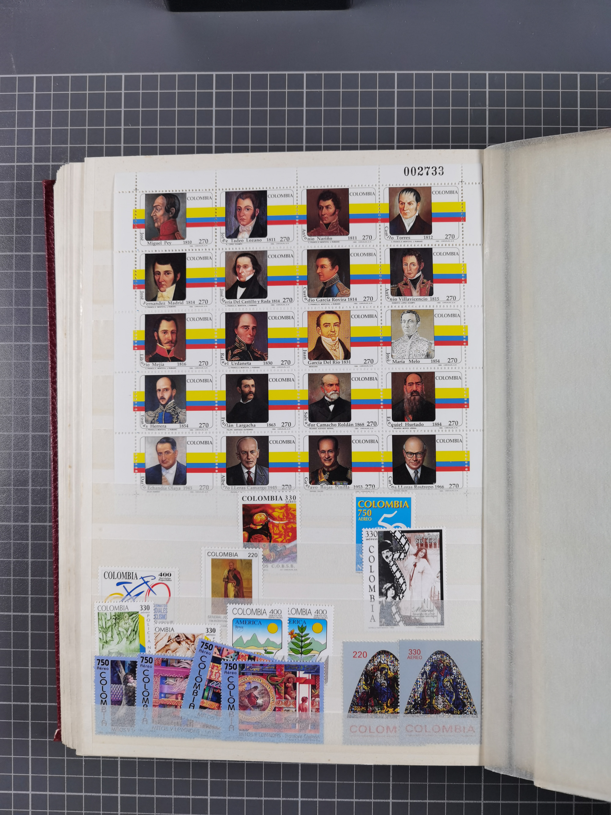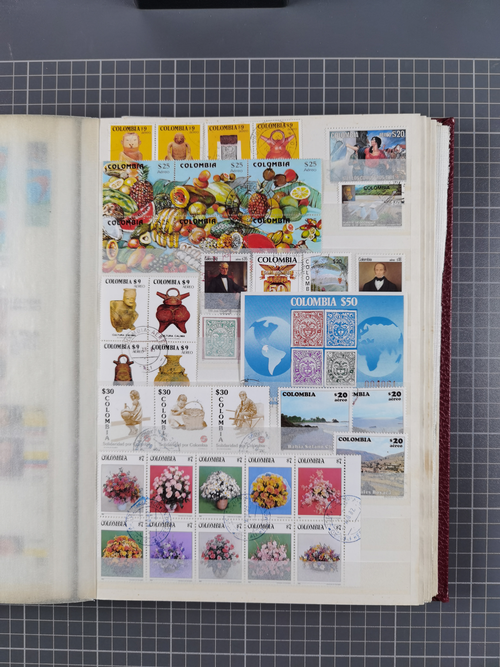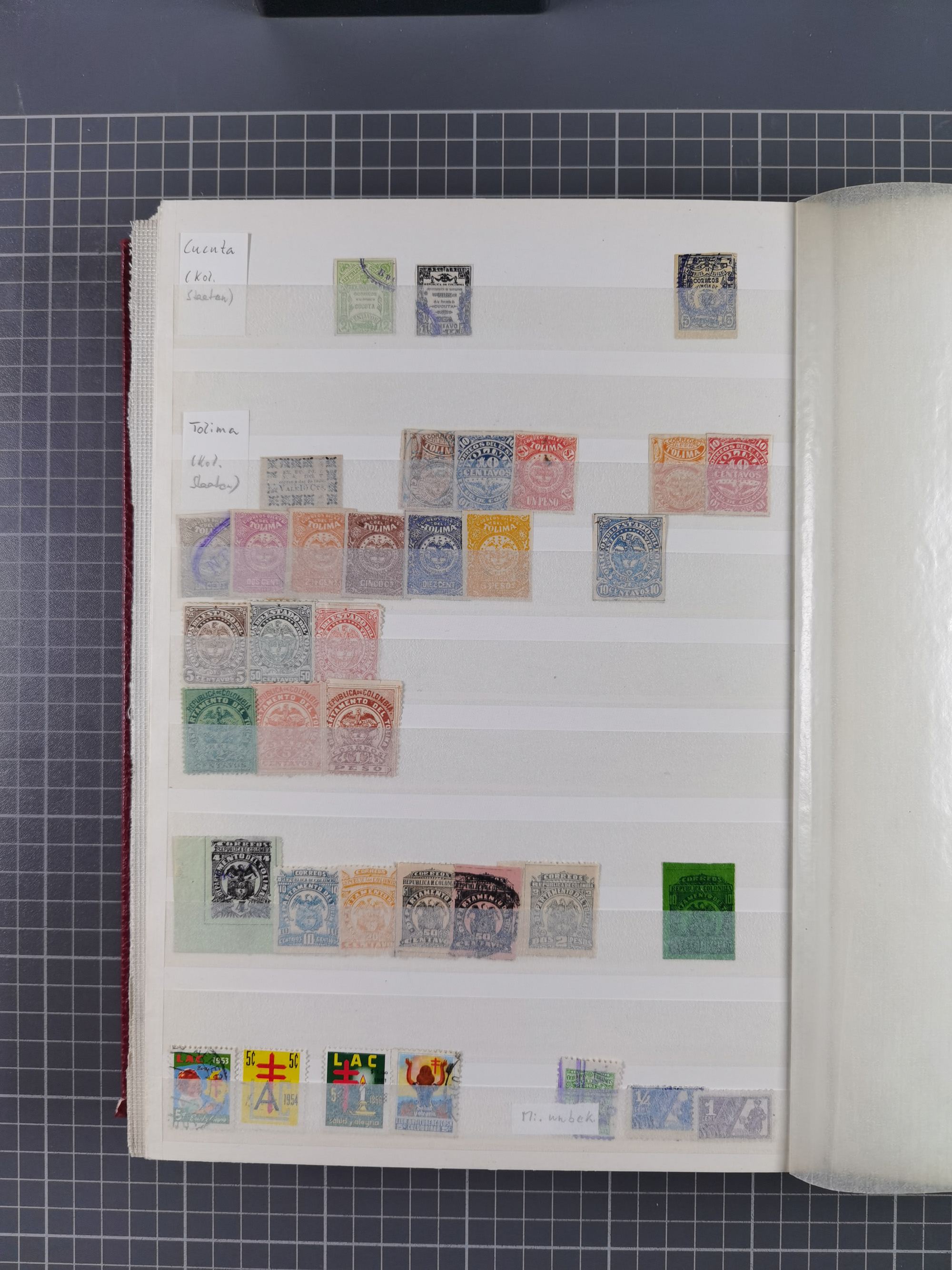 1917, Camilo Torres 1 c., plate proofs in black, green, sepia and orange, each in block of ten without gum, the orange block with horizontal crease affecting the bottom row, the sepia one toned and a few minor faults, otherwise fine, scarce assembly
