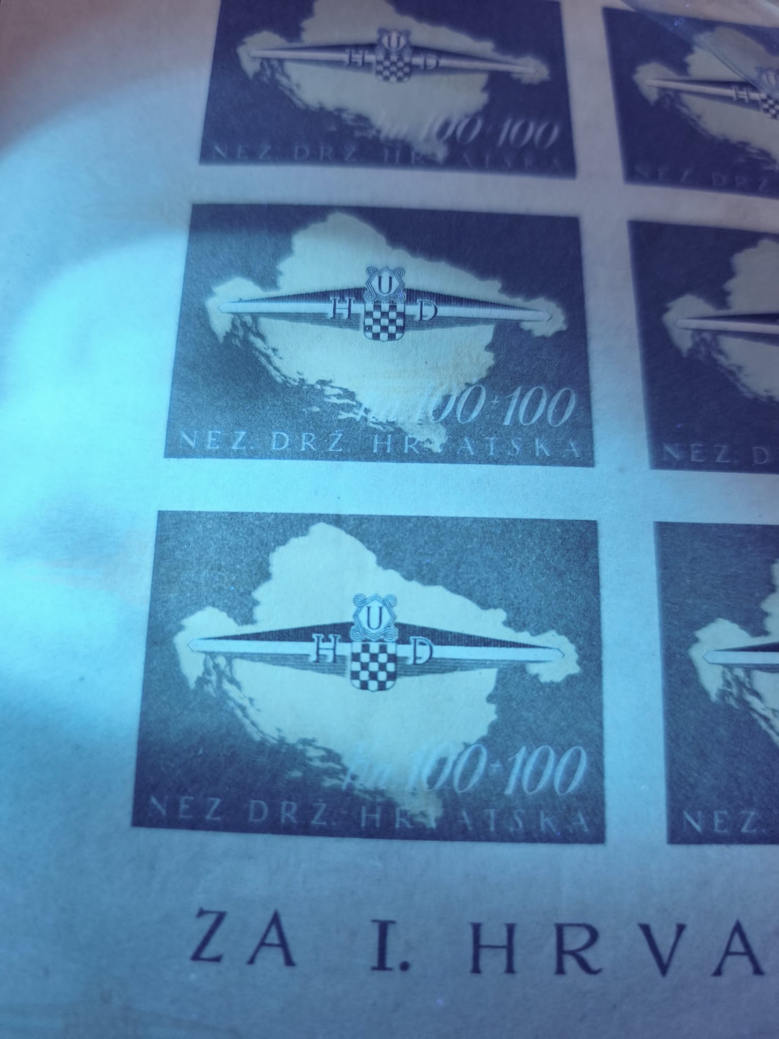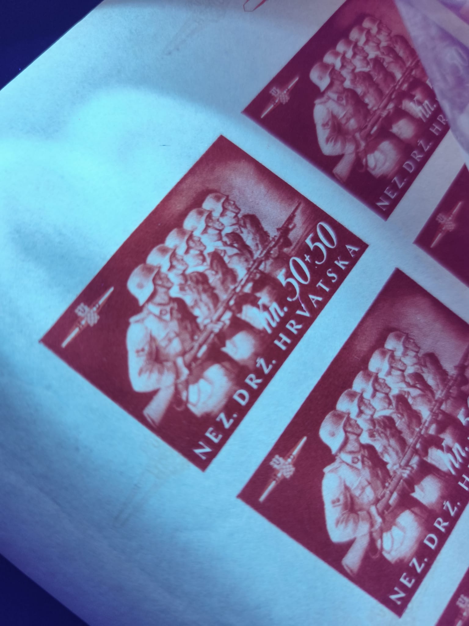 1943. Croatian legionnaires souvenir sheet imperforate in printer's sheet with six souvenir sheet, mint never hinged, vertical folded at right, otherwise fine, rare