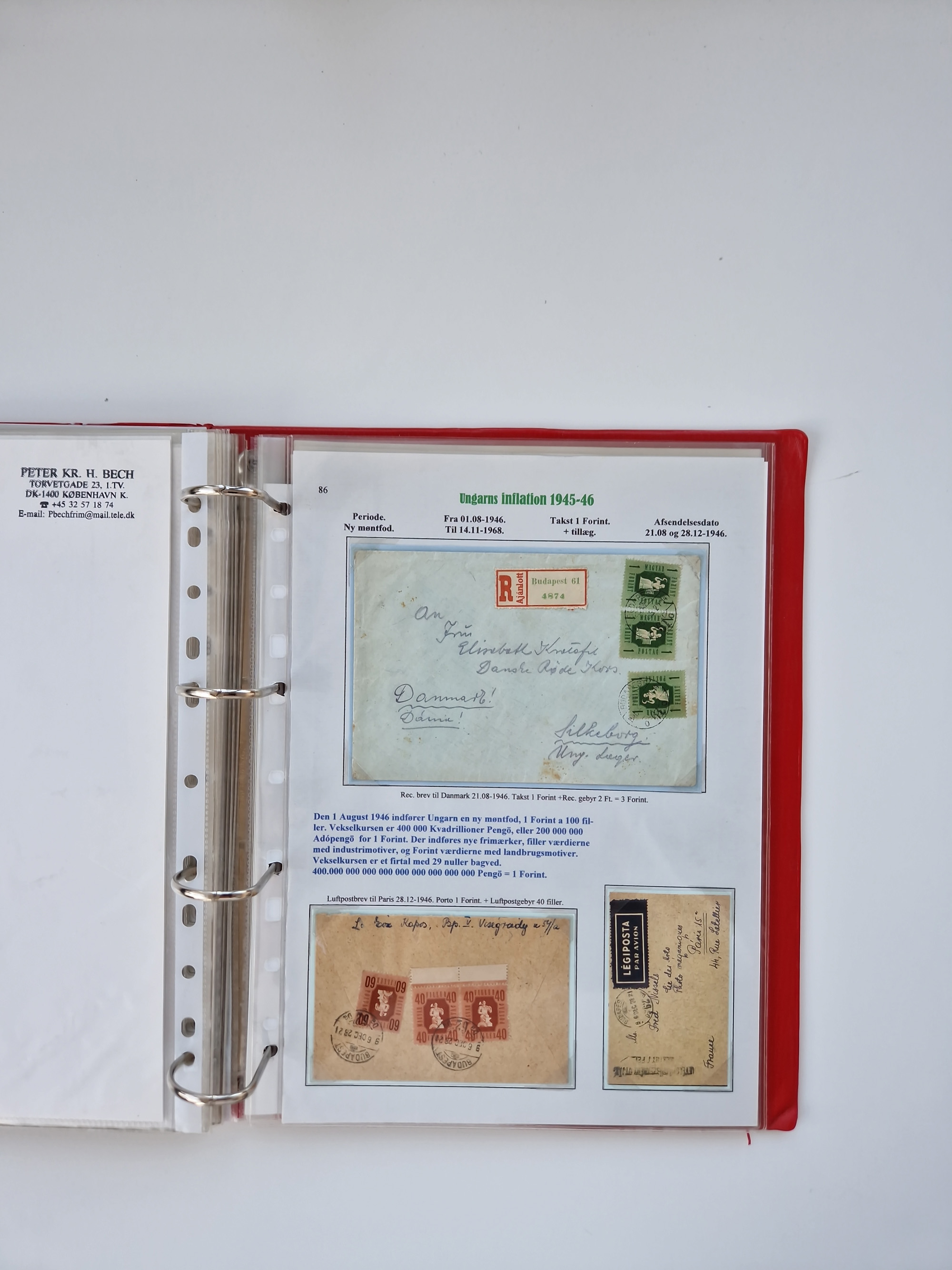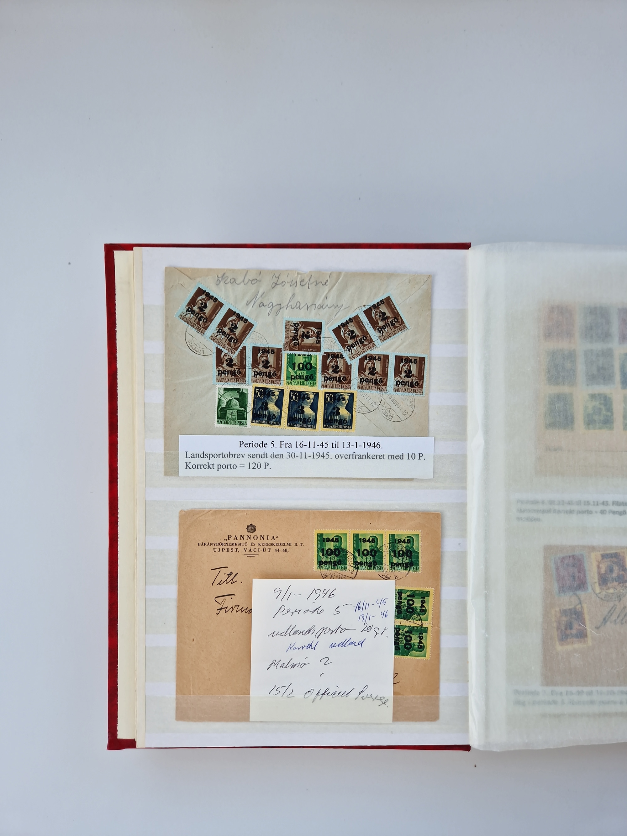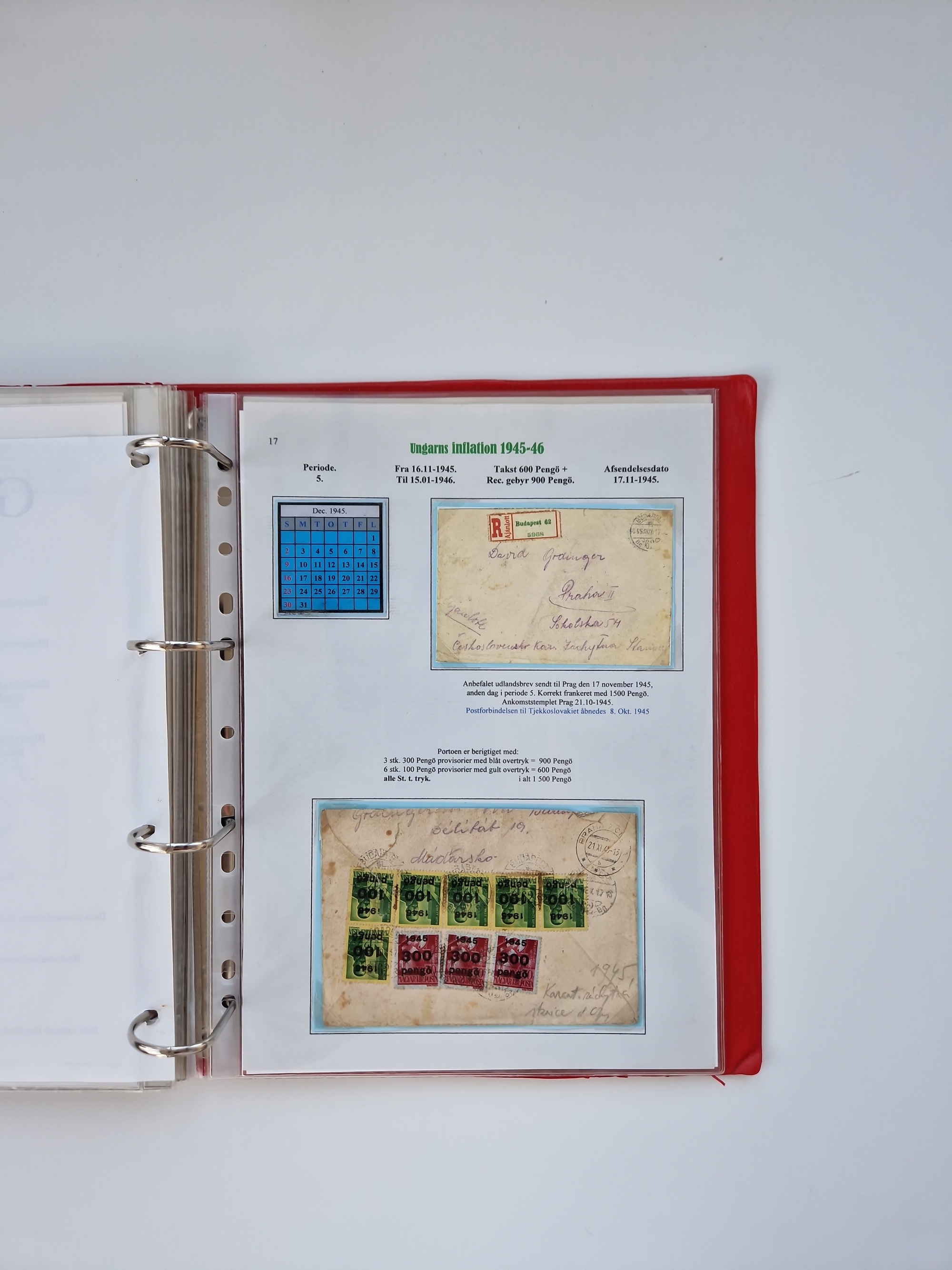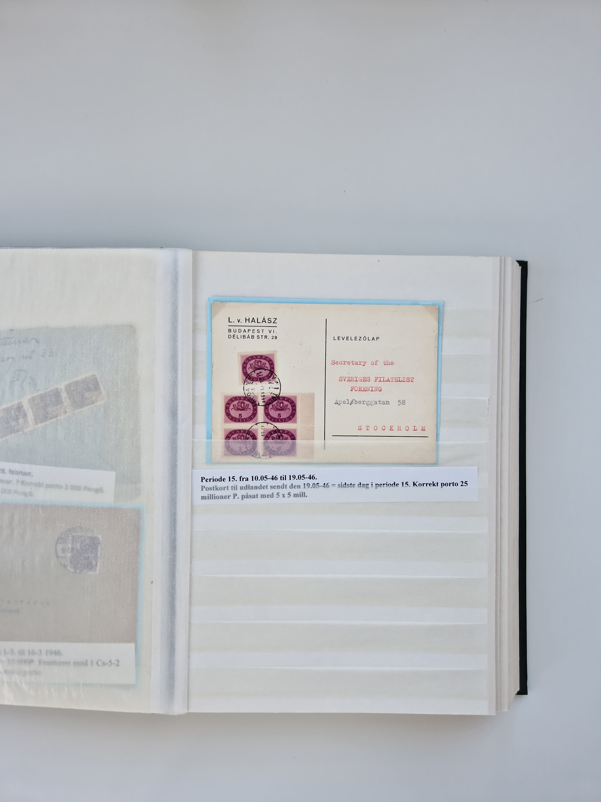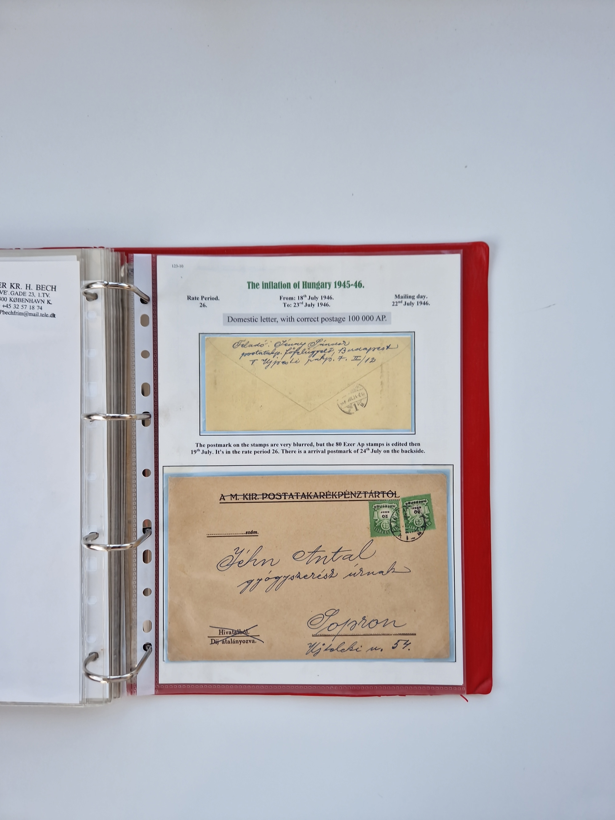 HYPERINFLATION: 1945/46, magnificent award-winning exhibit collection consisting of ca. 165 covers and parcel cards, showing a wonderful range of rates from all periods (1 to 27), with an abundance of better usages and interesting frankings, including Paid in Cash, Printed Matters, mail sent during the Grace Period (posted at the correct former rate), foreign destinations following - or preceding - the official reopening of international connection, etc.,; among the waterfall of better items we noted several covers from the 10th period (x5), 17th (x3), 19th (x4, including first day of rate), the scarcer 22th (x4, rate valid three days only), 23rd (x2) and 24th (x2), high franking achieved with fewer values including registered mail to USA correctly franked with 1 millio adópengö (x4), December 1945 cover to USA (5th period) with mixed franking of postage adhesives and paid in cash, provisional usage of the Holy Crown of St Istvan on parcel card (strictly controlled by the postal personal), February 1946 registered cover to London (7th period) correctly franked with few denomination of 3000 pengö, March 1946 cover to Canada (10th period) with large franking of the earlier Ezerp values, April 1946 correct Printed Matter rate to USA (12th Period), June 1946 underfranked cover with postage due during the Grace period, extremely rare use of the Milliard adhesives (100 m., 200m and 500 m. in multiples) on June 1946 Registered Express cover to Czechoslovakia (certificate Visnyovszki AIEP), exceptional 23rd Grace Period Paid in cash at the previous rate (one day Grace only), rare July 1946 (25th Period) cover to Wien franked with Billion values (certificate Visnyovszki AIEP), July 1946 (25th period) airmail cover to London, etc. A delighful collection, with an overall selection for quality, neatly mounted and expertly described in English on album pages, in 4 albums