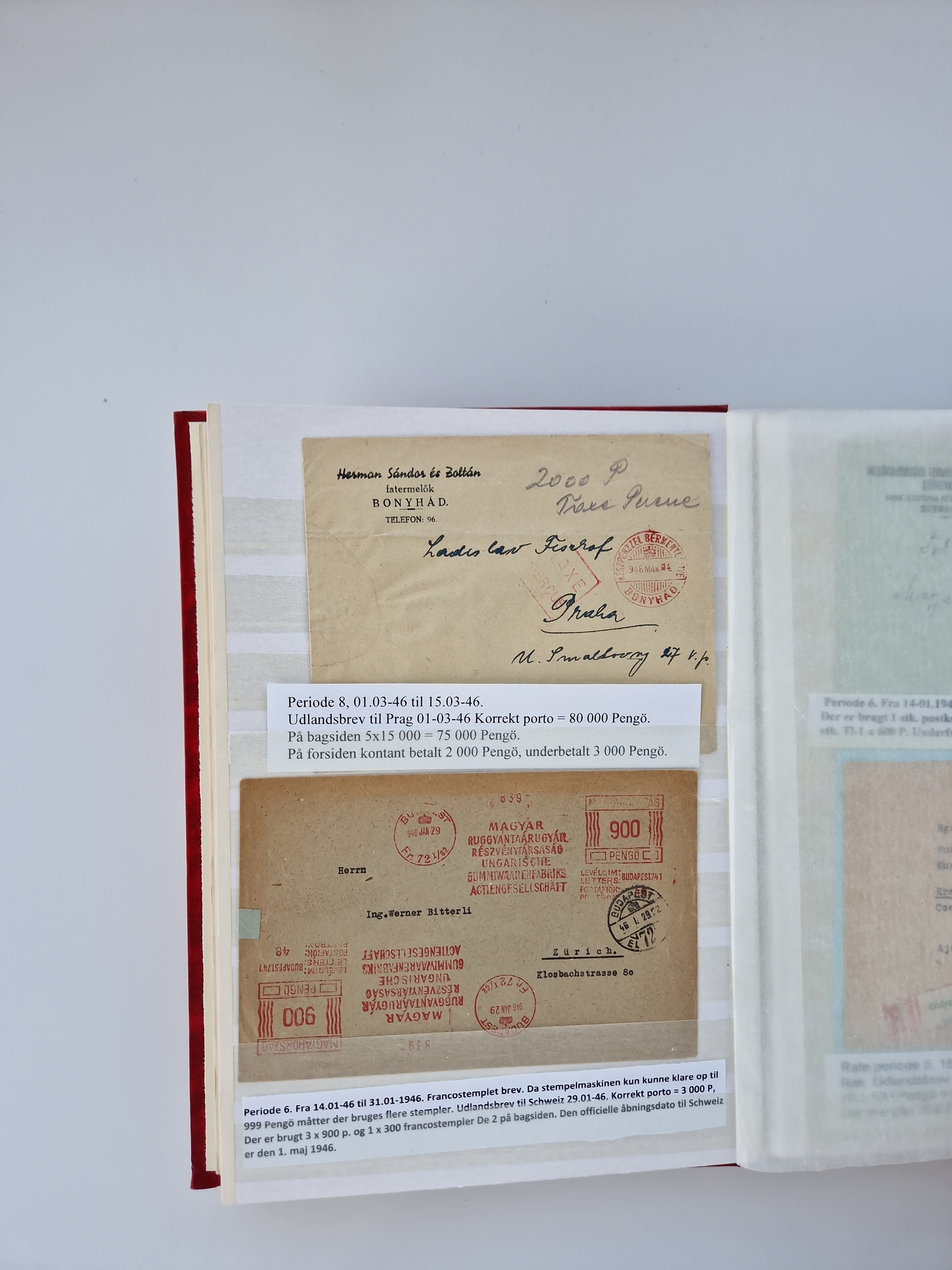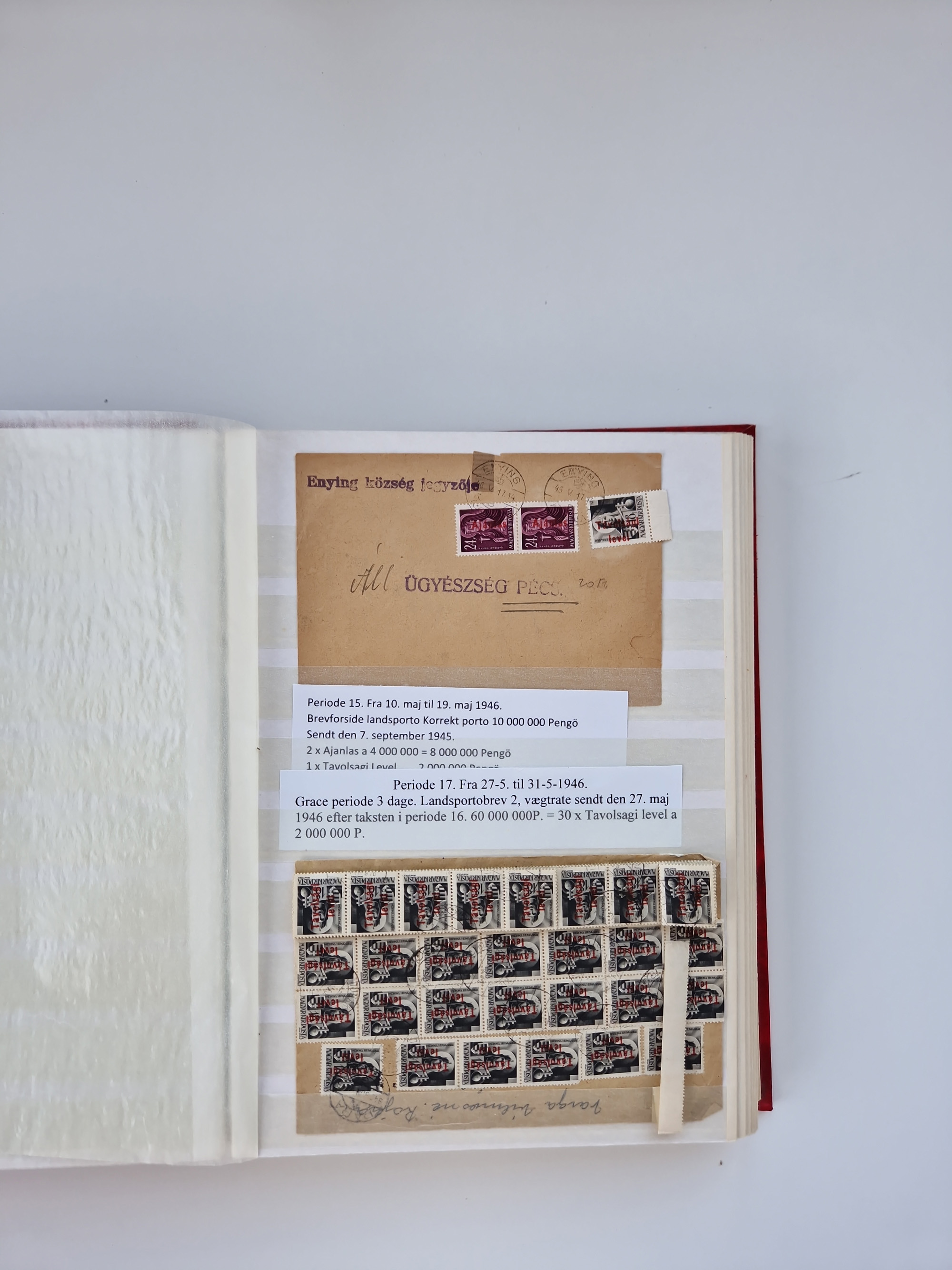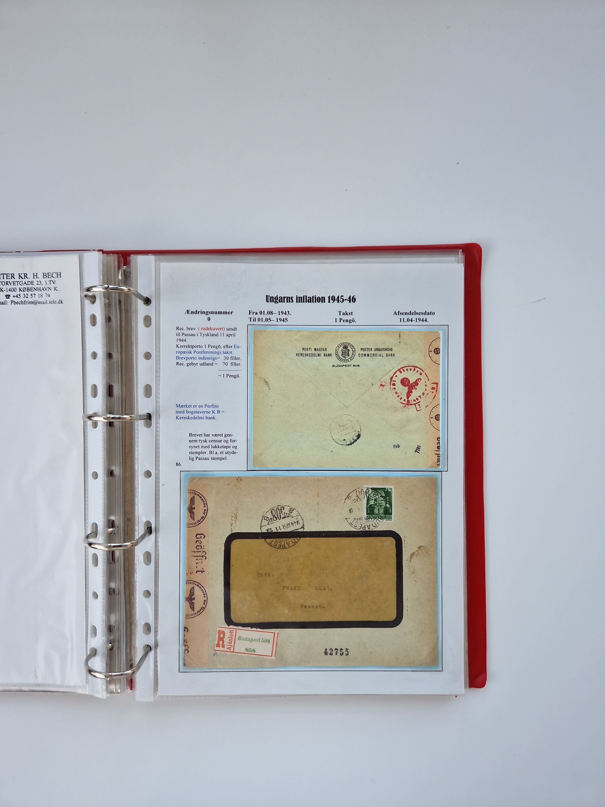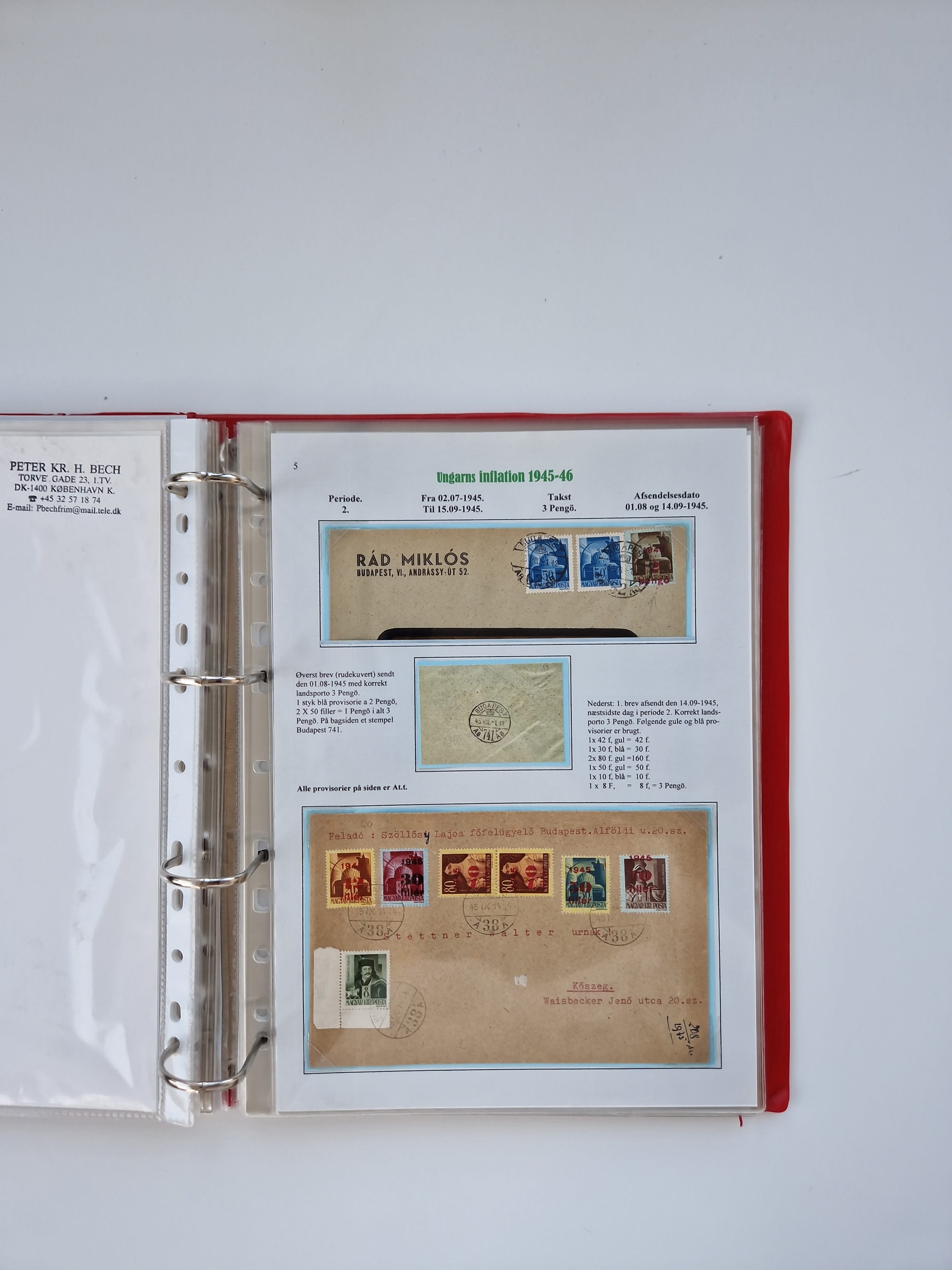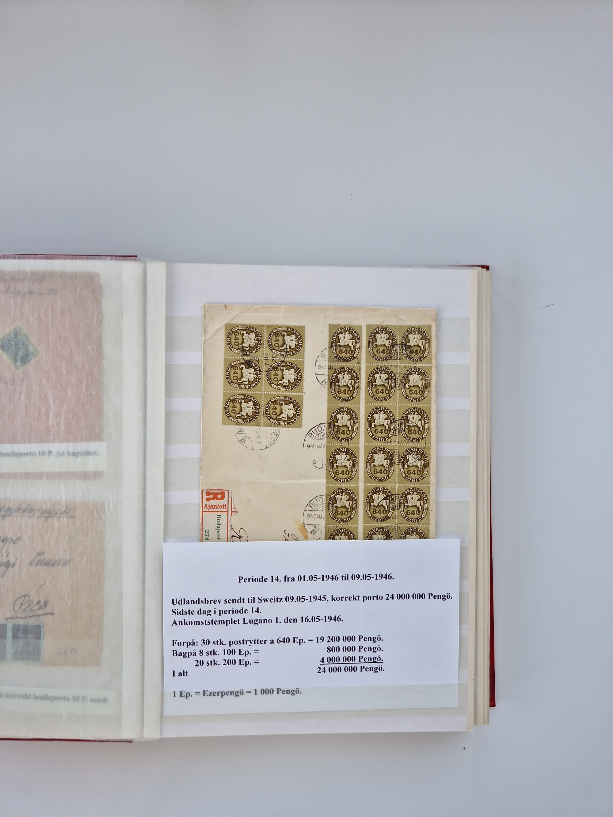 HYPERINFLATION: 1945/46, magnificent award-winning exhibit collection consisting of ca. 165 covers and parcel cards, showing a wonderful range of rates from all periods (1 to 27), with an abundance of better usages and interesting frankings, including Paid in Cash, Printed Matters, mail sent during the Grace Period (posted at the correct former rate), foreign destinations following - or preceding - the official reopening of international connection, etc.,; among the waterfall of better items we noted several covers from the 10th period (x5), 17th (x3), 19th (x4, including first day of rate), the scarcer 22th (x4, rate valid three days only), 23rd (x2) and 24th (x2), high franking achieved with fewer values including registered mail to USA correctly franked with 1 millio adópengö (x4), December 1945 cover to USA (5th period) with mixed franking of postage adhesives and paid in cash, provisional usage of the Holy Crown of St Istvan on parcel card (strictly controlled by the postal personal), February 1946 registered cover to London (7th period) correctly franked with few denomination of 3000 pengö, March 1946 cover to Canada (10th period) with large franking of the earlier Ezerp values, April 1946 correct Printed Matter rate to USA (12th Period), June 1946 underfranked cover with postage due during the Grace period, extremely rare use of the Milliard adhesives (100 m., 200m and 500 m. in multiples) on June 1946 Registered Express cover to Czechoslovakia (certificate Visnyovszki AIEP), exceptional 23rd Grace Period Paid in cash at the previous rate (one day Grace only), rare July 1946 (25th Period) cover to Wien franked with Billion values (certificate Visnyovszki AIEP), July 1946 (25th period) airmail cover to London, etc. A delighful collection, with an overall selection for quality, neatly mounted and expertly described in English on album pages, in 4 albums