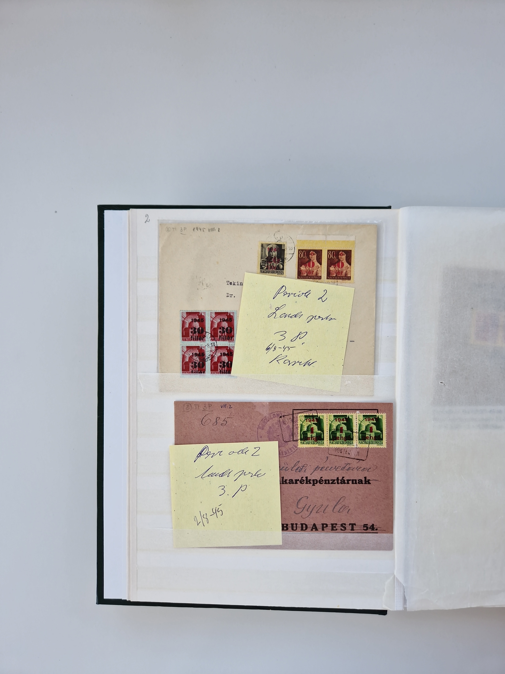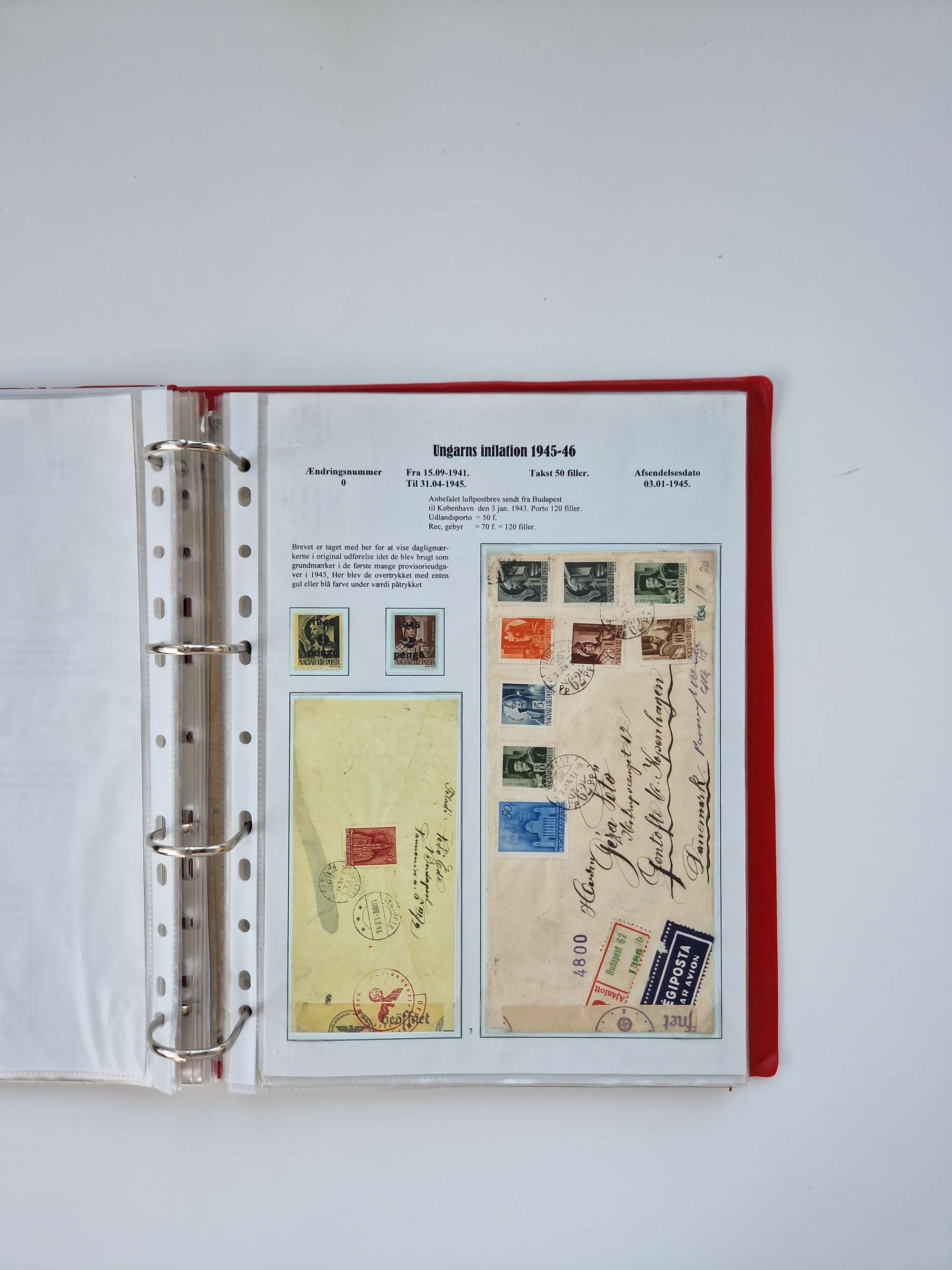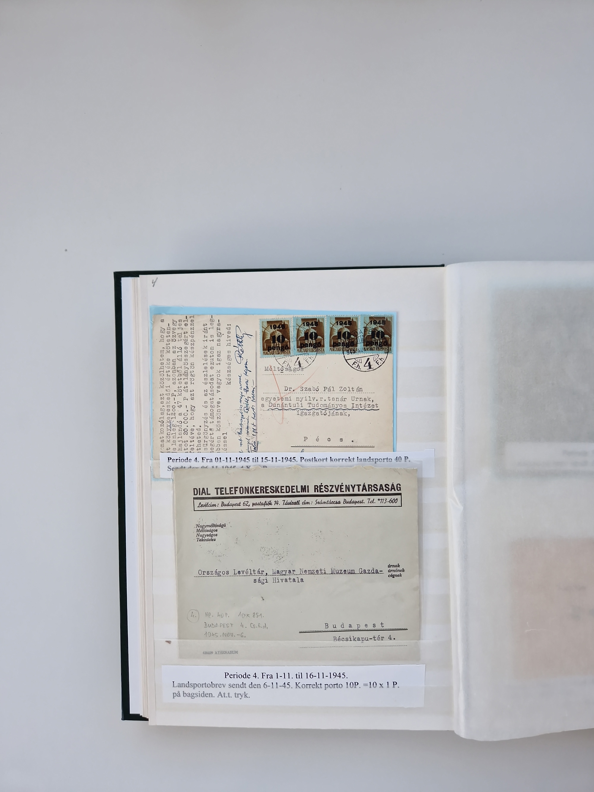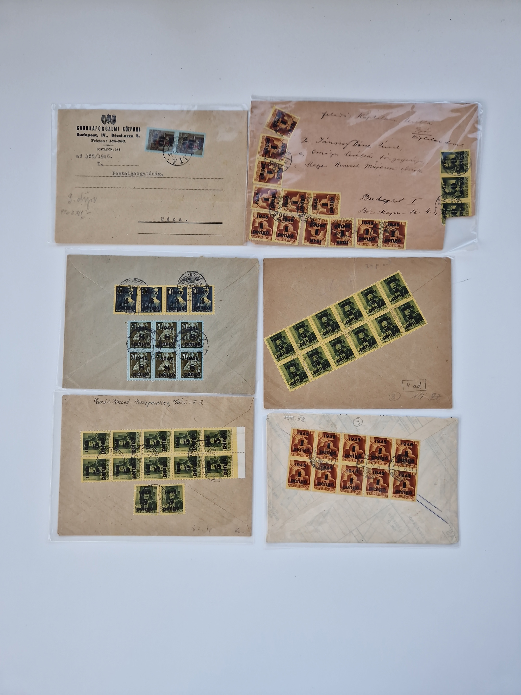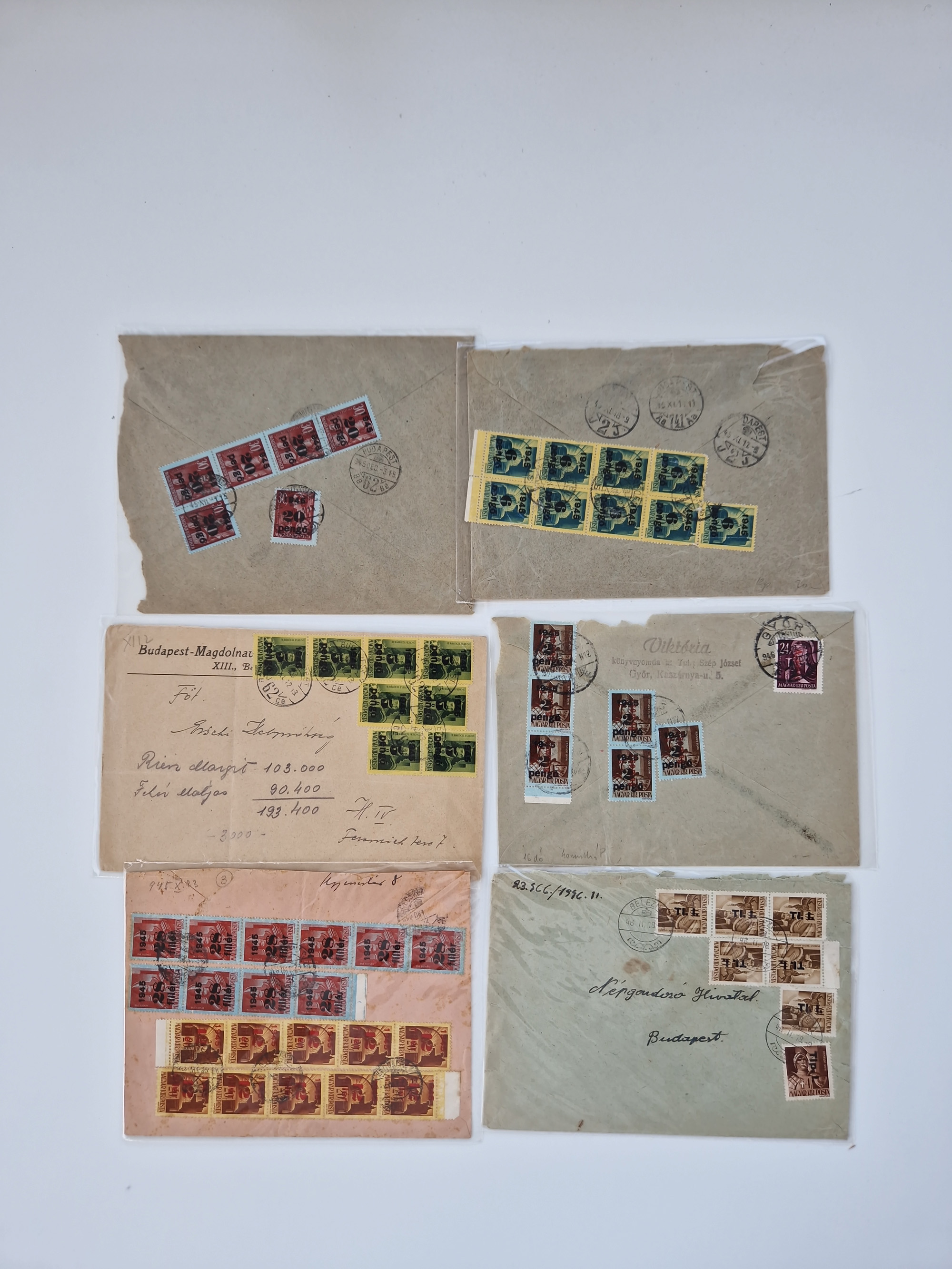 HYPERINFLATION: 1945/46, magnificent award-winning exhibit collection consisting of ca. 165 covers and parcel cards, showing a wonderful range of rates from all periods (1 to 27), with an abundance of better usages and interesting frankings, including Paid in Cash, Printed Matters, mail sent during the Grace Period (posted at the correct former rate), foreign destinations following - or preceding - the official reopening of international connection, etc.,; among the waterfall of better items we noted several covers from the 10th period (x5), 17th (x3), 19th (x4, including first day of rate), the scarcer 22th (x4, rate valid three days only), 23rd (x2) and 24th (x2), high franking achieved with fewer values including registered mail to USA correctly franked with 1 millio adópengö (x4), December 1945 cover to USA (5th period) with mixed franking of postage adhesives and paid in cash, provisional usage of the Holy Crown of St Istvan on parcel card (strictly controlled by the postal personal), February 1946 registered cover to London (7th period) correctly franked with few denomination of 3000 pengö, March 1946 cover to Canada (10th period) with large franking of the earlier Ezerp values, April 1946 correct Printed Matter rate to USA (12th Period), June 1946 underfranked cover with postage due during the Grace period, extremely rare use of the Milliard adhesives (100 m., 200m and 500 m. in multiples) on June 1946 Registered Express cover to Czechoslovakia (certificate Visnyovszki AIEP), exceptional 23rd Grace Period Paid in cash at the previous rate (one day Grace only), rare July 1946 (25th Period) cover to Wien franked with Billion values (certificate Visnyovszki AIEP), July 1946 (25th period) airmail cover to London, etc. A delighful collection, with an overall selection for quality, neatly mounted and expertly described in English on album pages, in 4 albums
