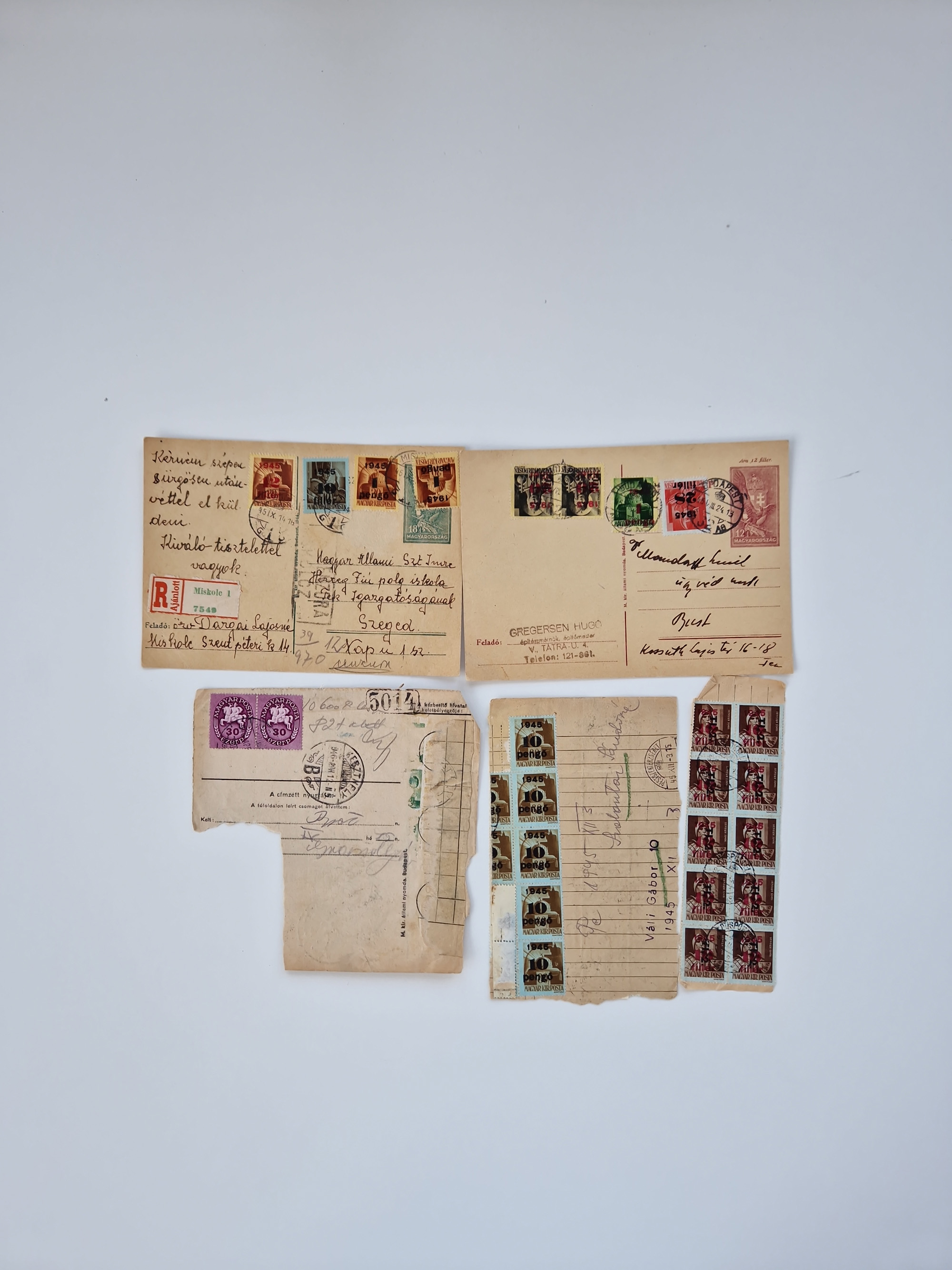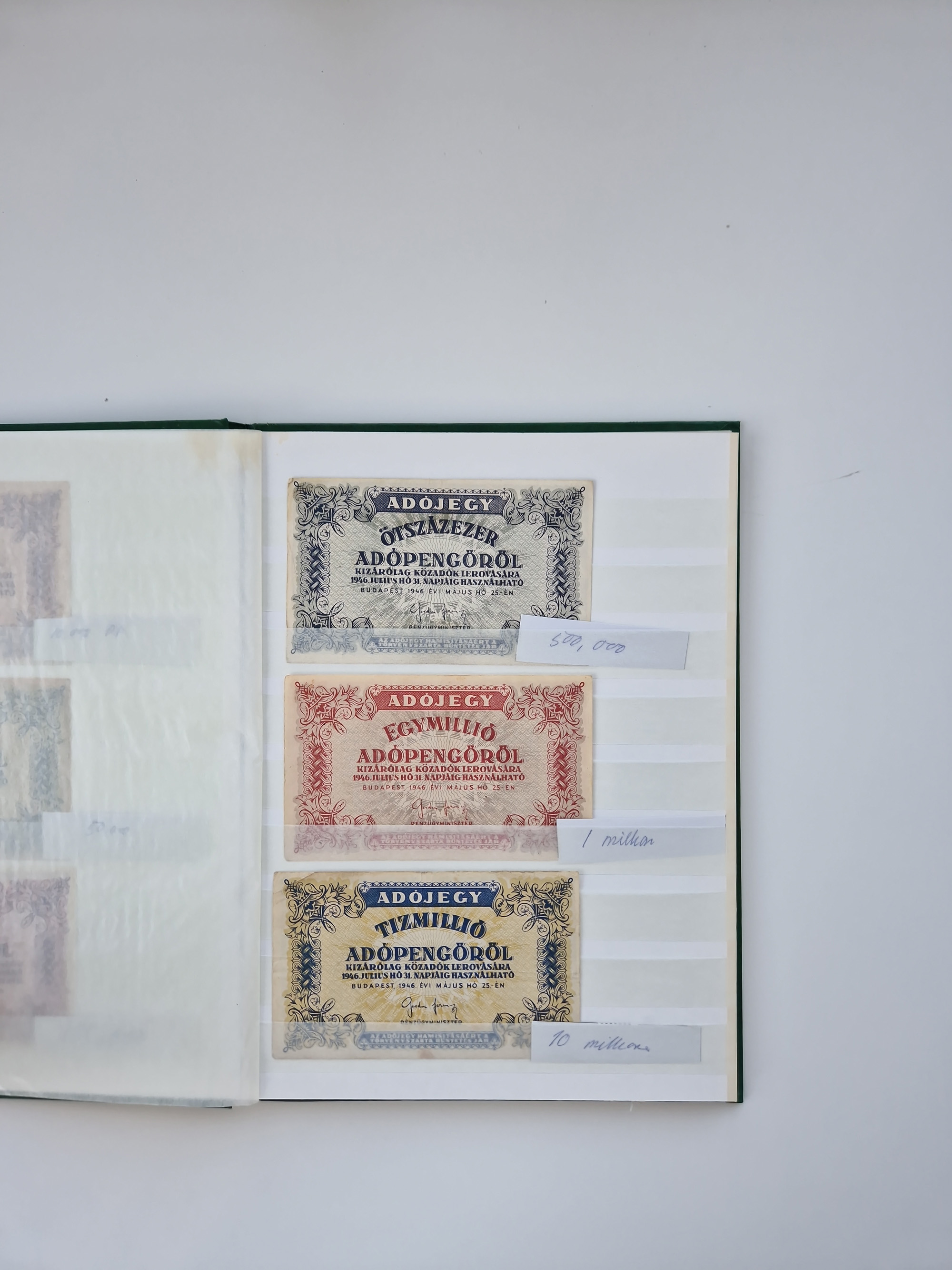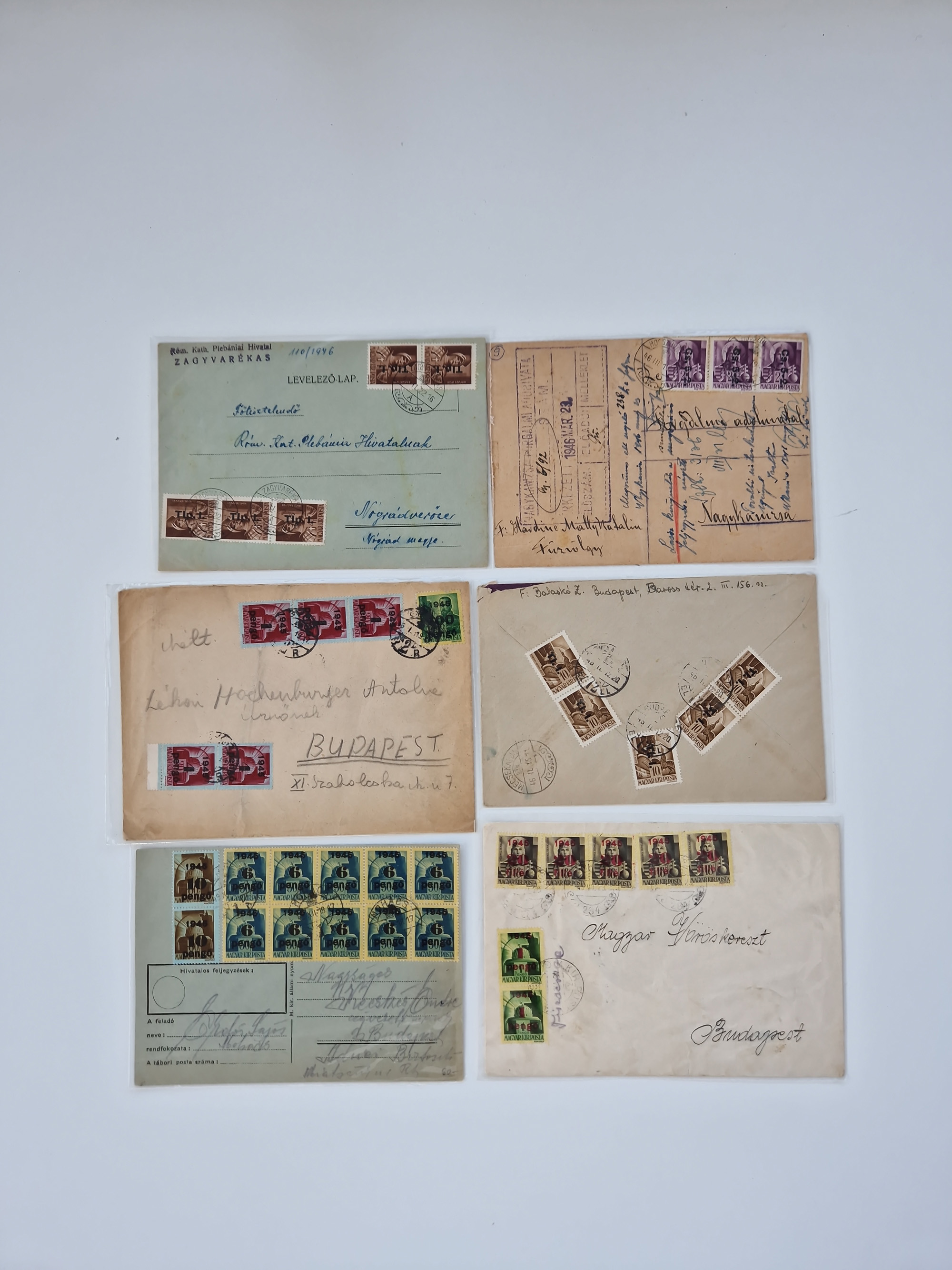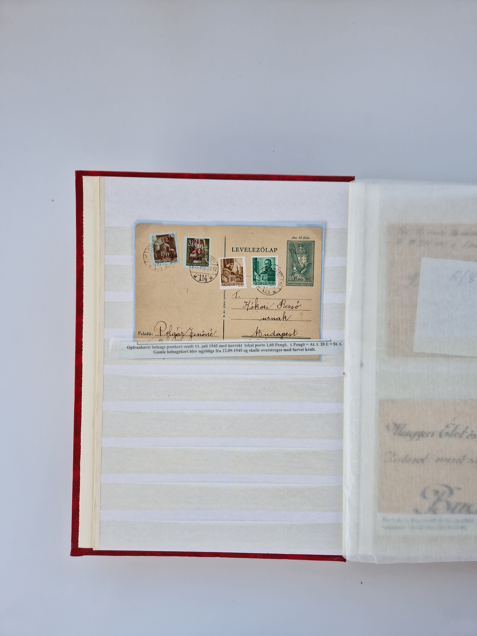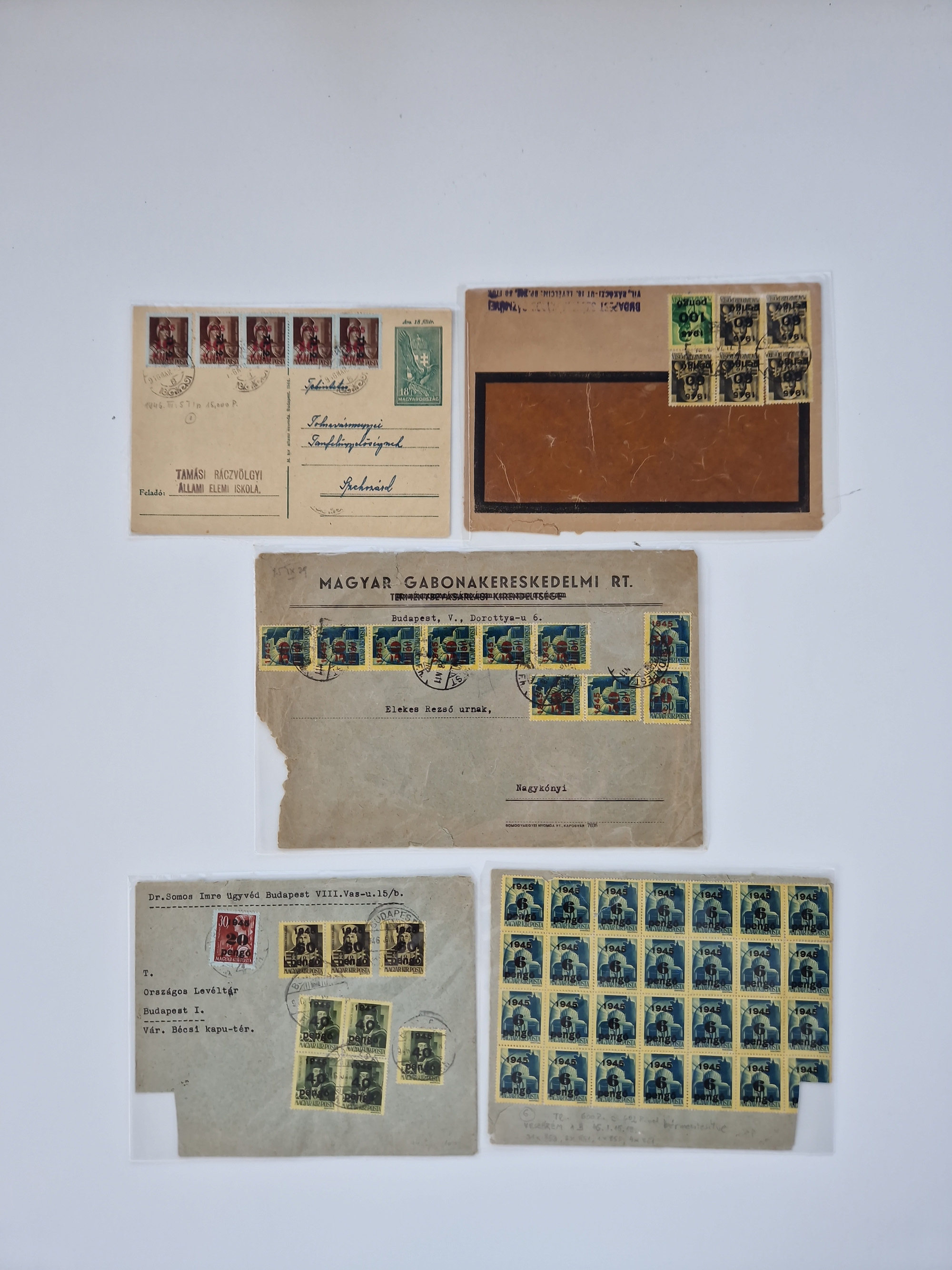 HYPERINFLATION: 1945/46, magnificent award-winning exhibit collection consisting of ca. 165 covers and parcel cards, showing a wonderful range of rates from all periods (1 to 27), with an abundance of better usages and interesting frankings, including Paid in Cash, Printed Matters, mail sent during the Grace Period (posted at the correct former rate), foreign destinations following - or preceding - the official reopening of international connection, etc.,; among the waterfall of better items we noted several covers from the 10th period (x5), 17th (x3), 19th (x4, including first day of rate), the scarcer 22th (x4, rate valid three days only), 23rd (x2) and 24th (x2), high franking achieved with fewer values including registered mail to USA correctly franked with 1 millio adópengö (x4), December 1945 cover to USA (5th period) with mixed franking of postage adhesives and paid in cash, provisional usage of the Holy Crown of St Istvan on parcel card (strictly controlled by the postal personal), February 1946 registered cover to London (7th period) correctly franked with few denomination of 3000 pengö, March 1946 cover to Canada (10th period) with large franking of the earlier Ezerp values, April 1946 correct Printed Matter rate to USA (12th Period), June 1946 underfranked cover with postage due during the Grace period, extremely rare use of the Milliard adhesives (100 m., 200m and 500 m. in multiples) on June 1946 Registered Express cover to Czechoslovakia (certificate Visnyovszki AIEP), exceptional 23rd Grace Period Paid in cash at the previous rate (one day Grace only), rare July 1946 (25th Period) cover to Wien franked with Billion values (certificate Visnyovszki AIEP), July 1946 (25th period) airmail cover to London, etc. A delighful collection, with an overall selection for quality, neatly mounted and expertly described in English on album pages, in 4 albums