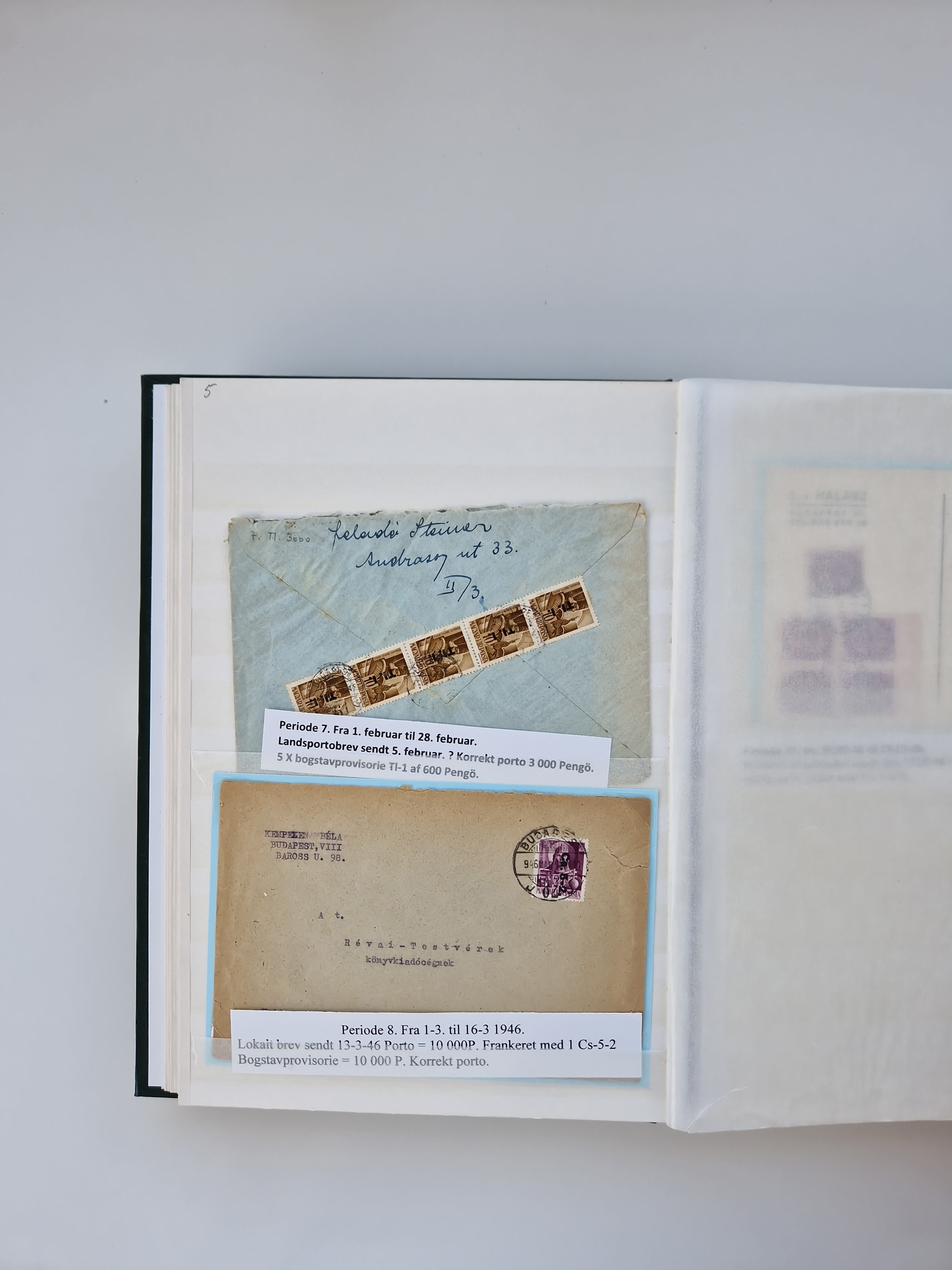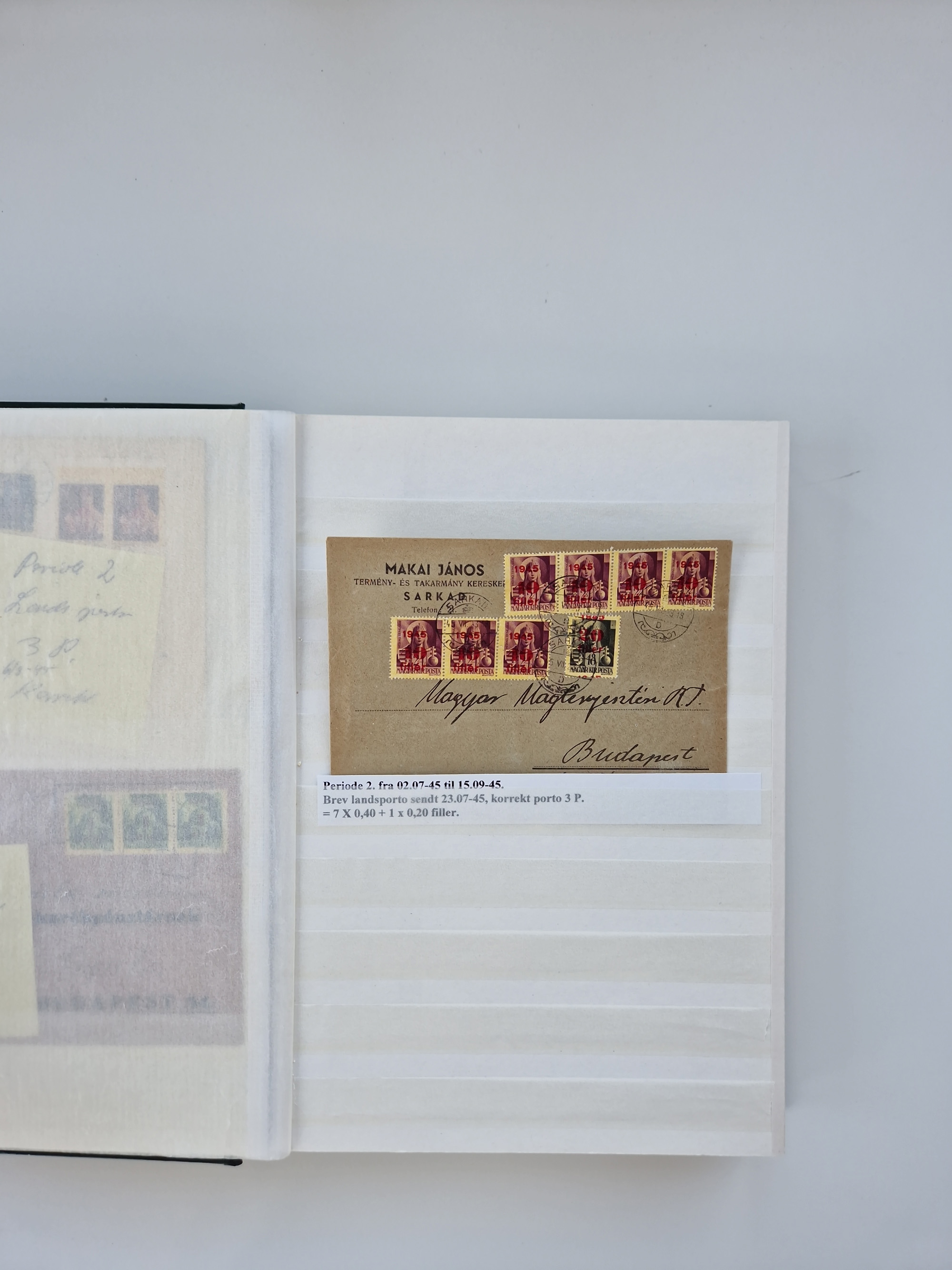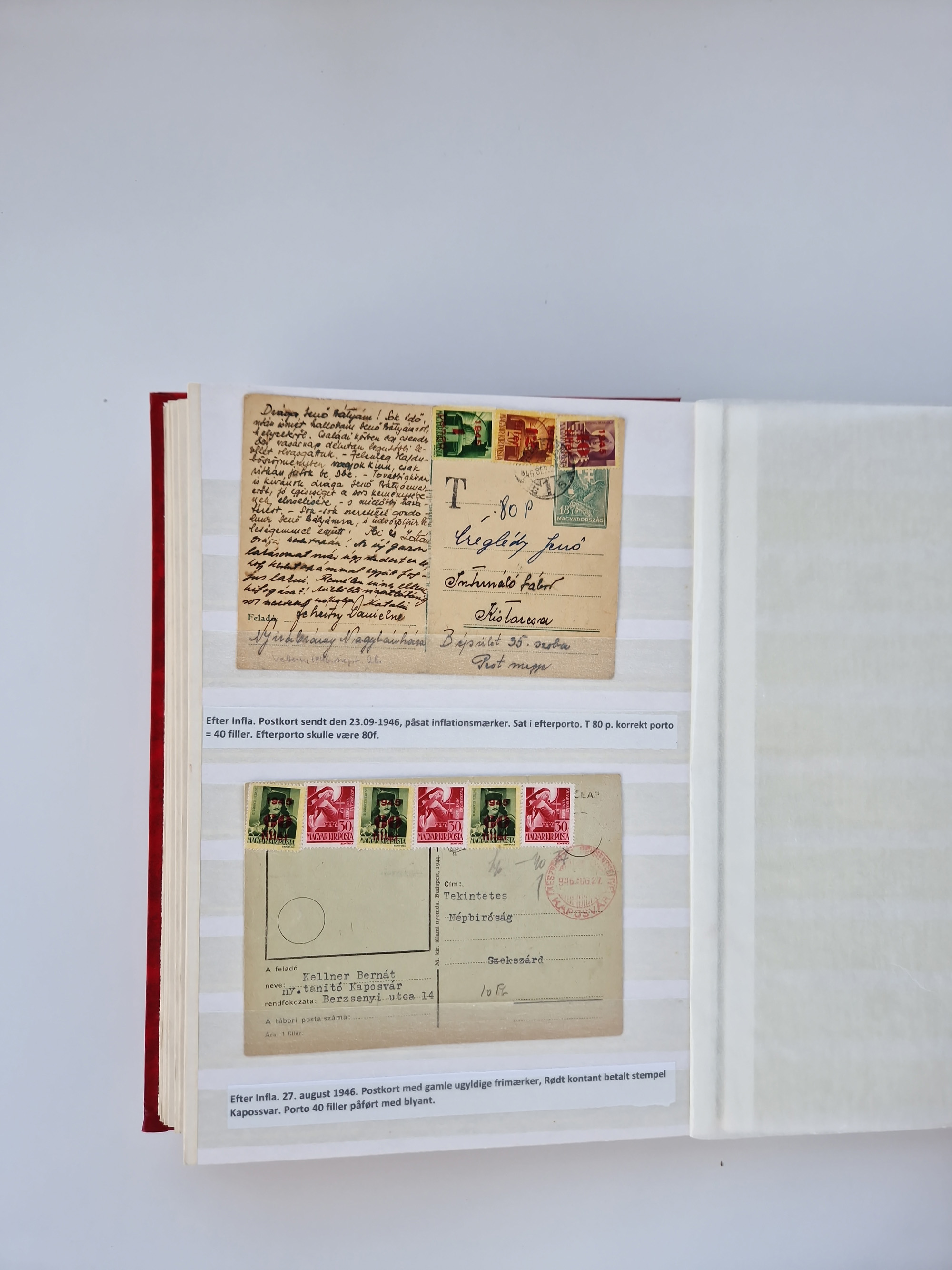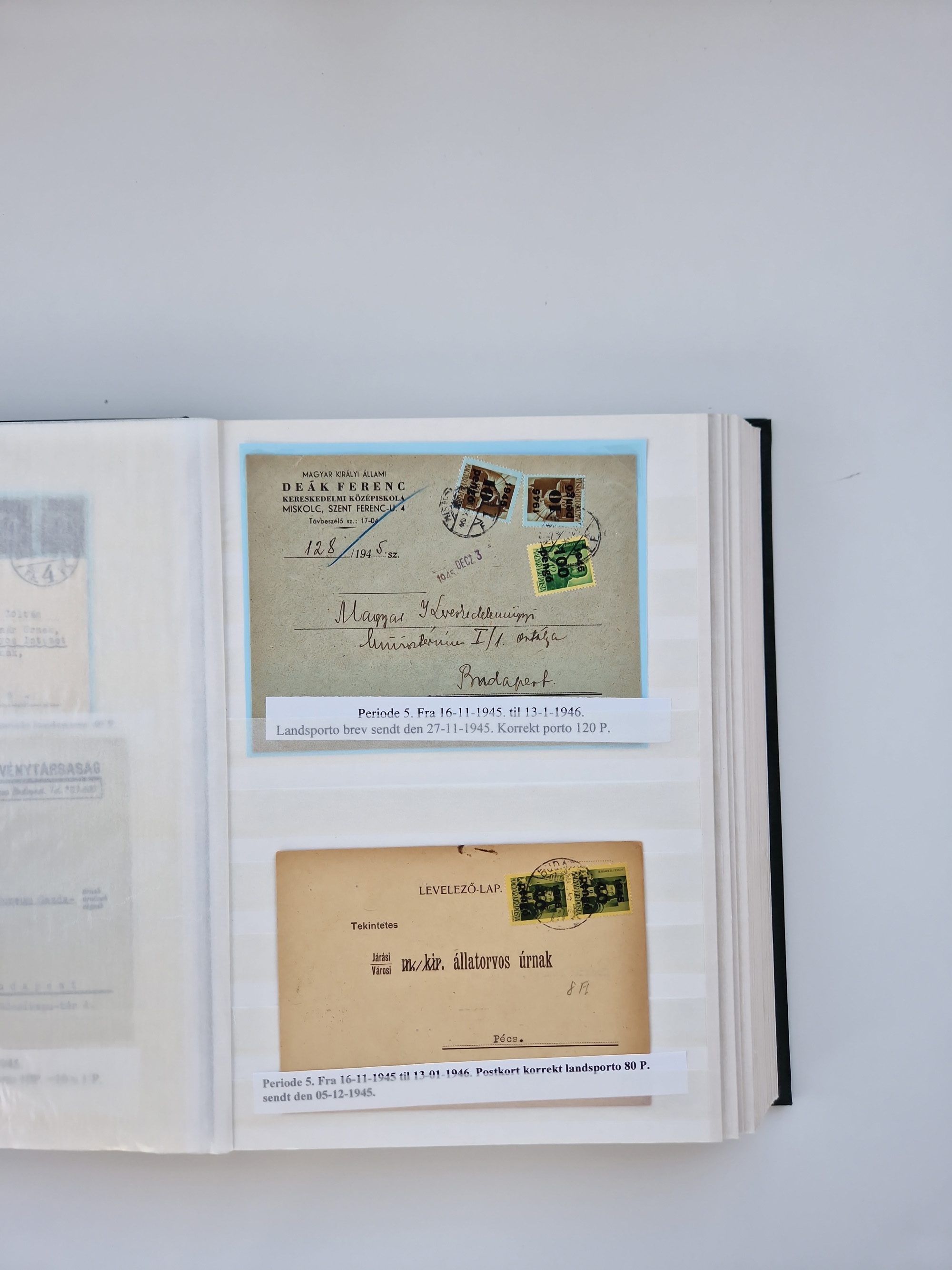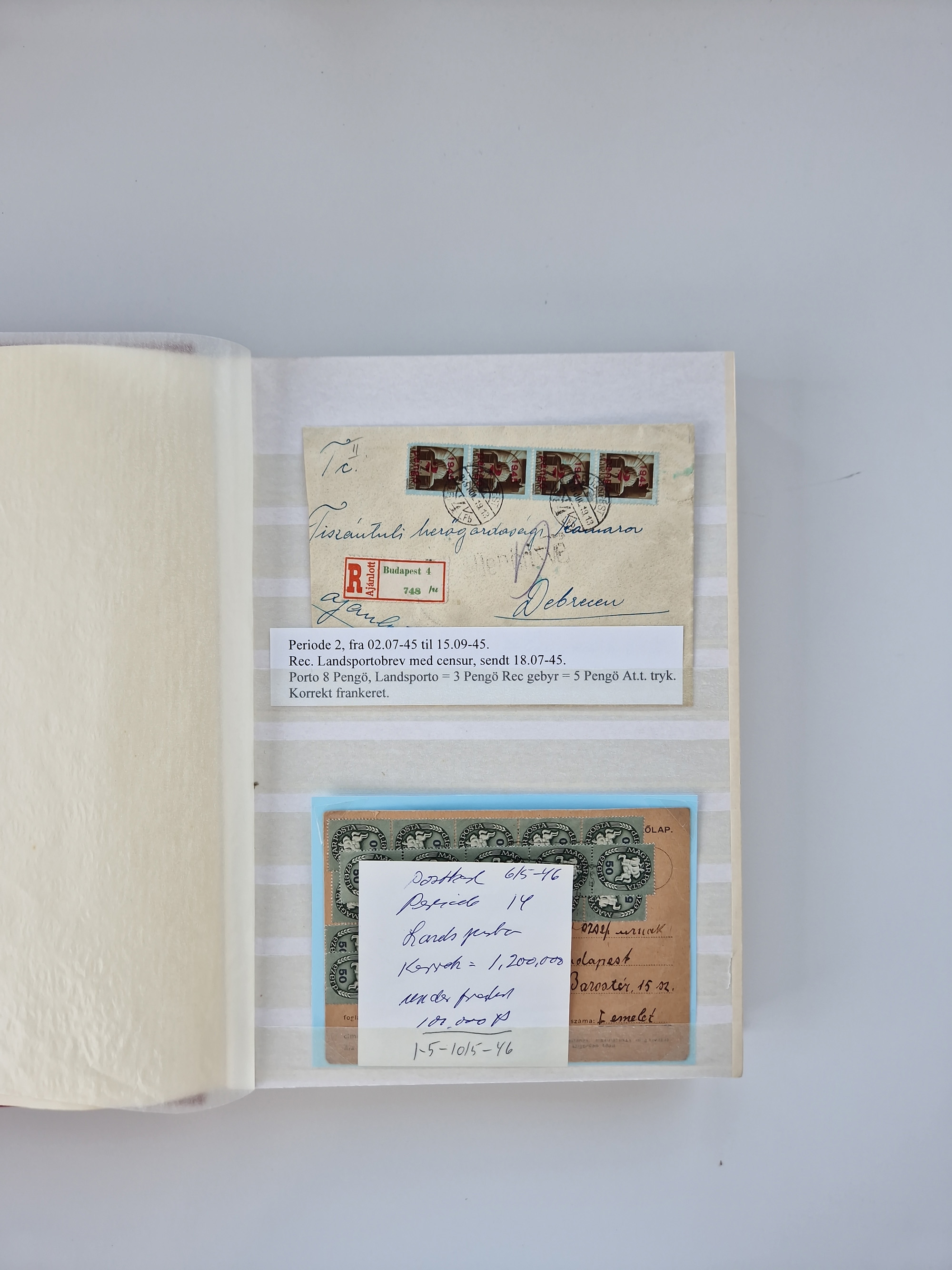 HYPERINFLATION: 1945/46, extensive exhibit collection with over 125 covers and postcards, spanning periods 1 to 21 and 25-26, showing a fine range of rates with an abundance of usages and better frankings, including Paid in Cash, foreign destinations, massive inflation frankings, mail sent during the Grace Period or under military free frank concession, etc., many better items throughout with March 1946 cover (10th Period) correctly franked at 90,000P, May 1946 Printed Matter (14th Period) during the Grace Period at the previous rate, mail from the scarcer 25th (x2) and 26th (x6) periods, April 1946 registered cover (13th Period) with fewer denominations of the earlier Ezerp values, July 1946 underpaid Printed Matter (26th Period) with Revenue 100 Ezer as single franking postage due, etc. A delightful assembly, neatly mounted and described, in one album