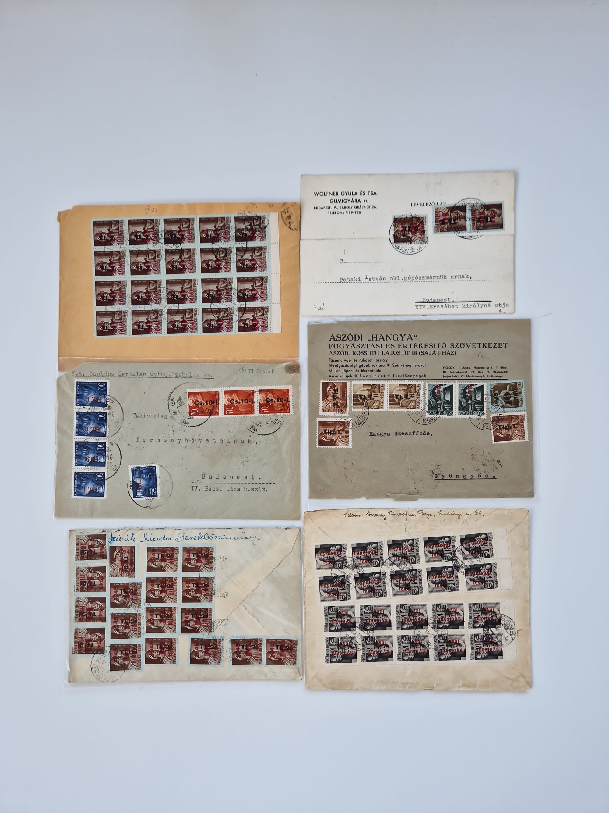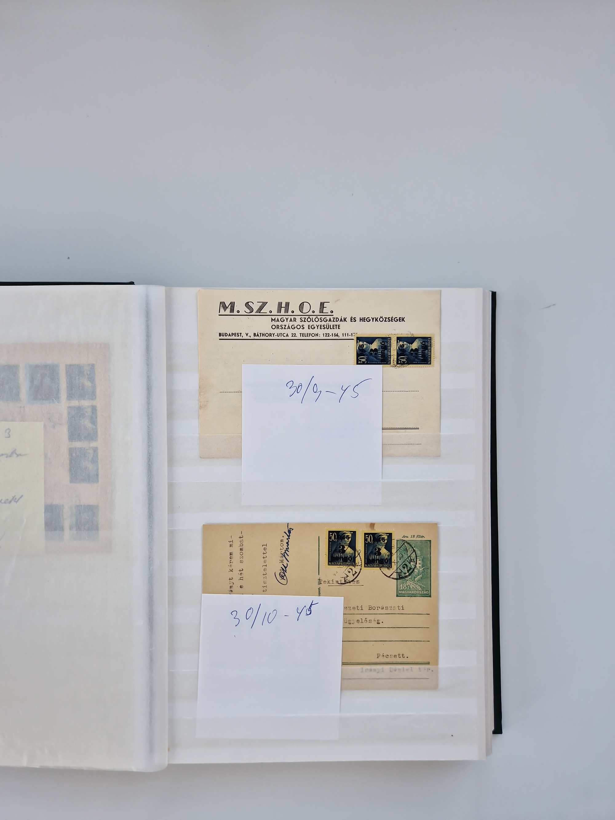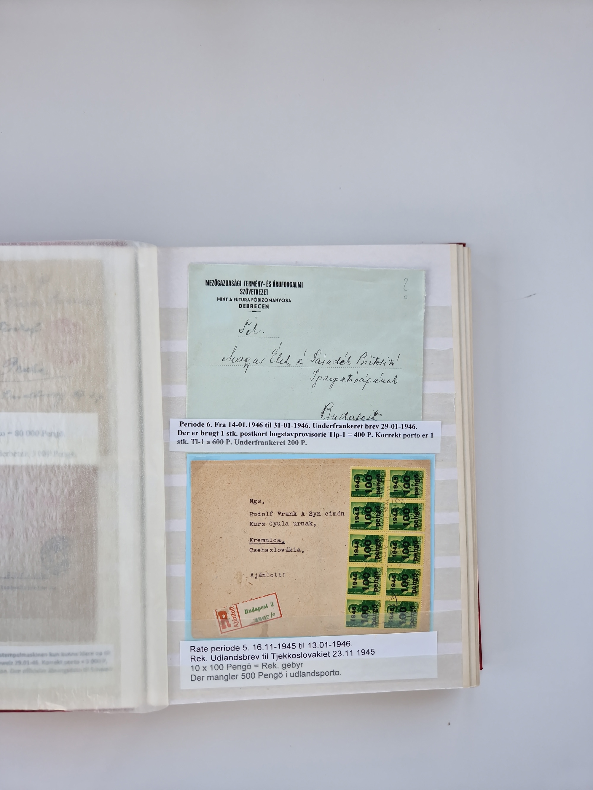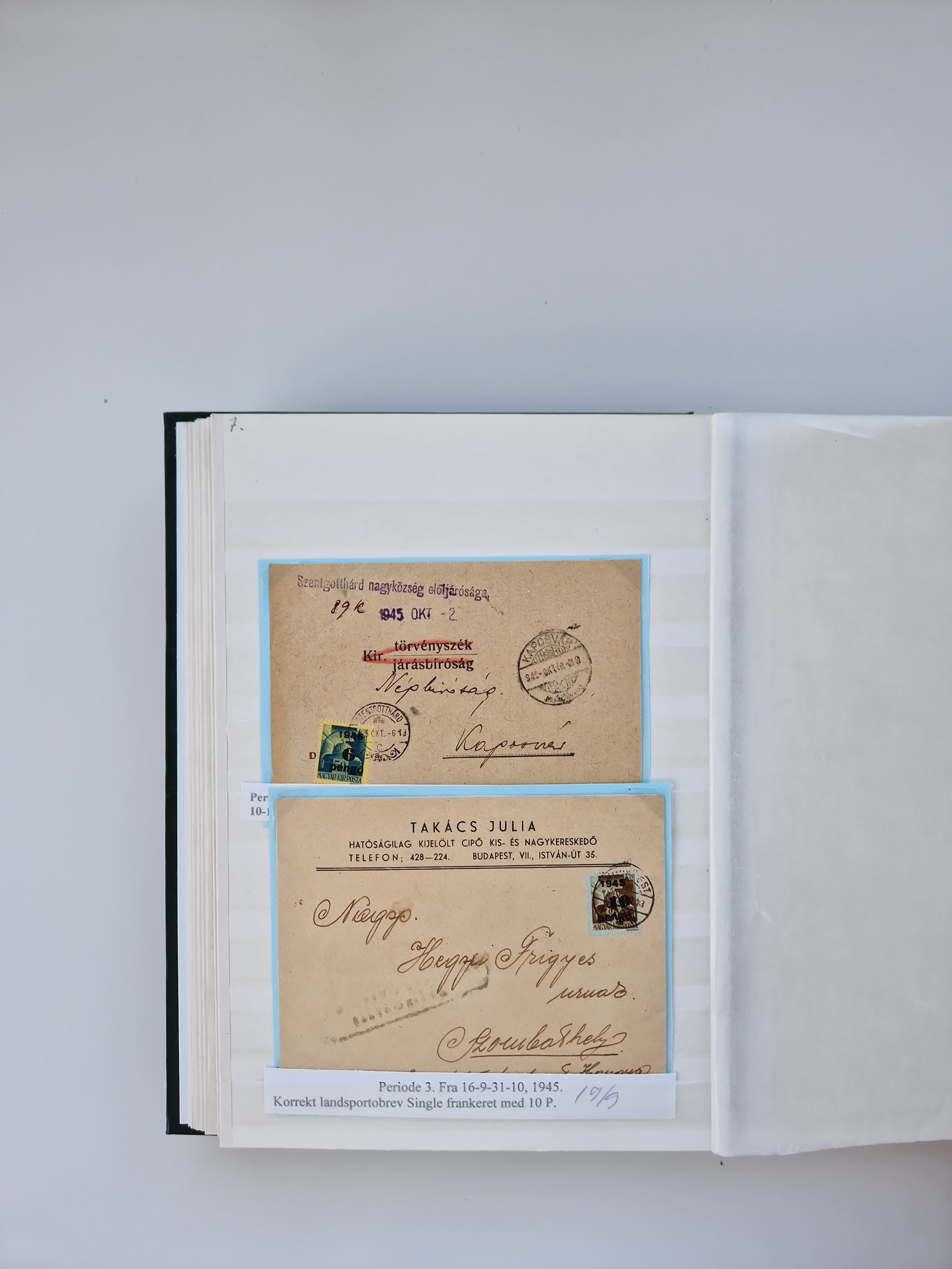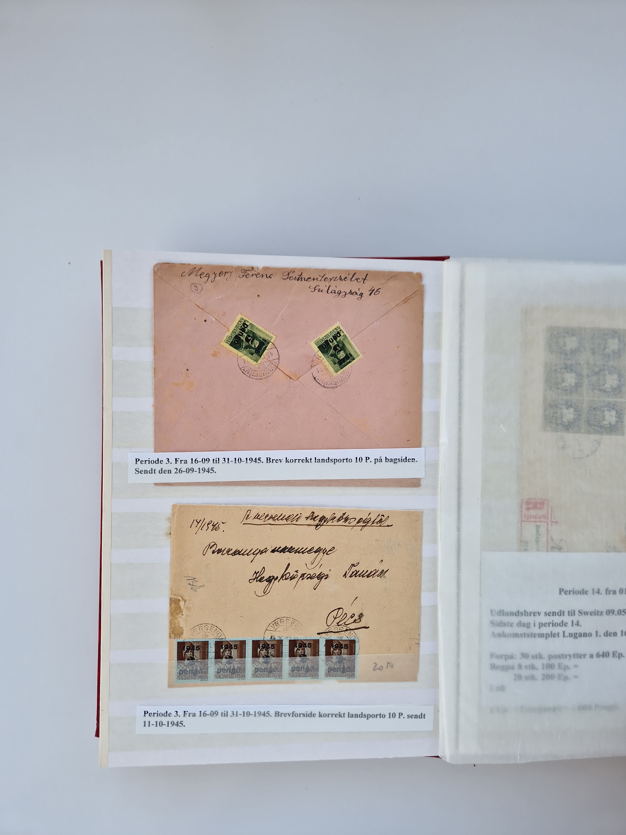 HYPERINFLATION: 1945/46, extensive exhibit collection with over 125 covers and postcards, spanning periods 1 to 21 and 25-26, showing a fine range of rates with an abundance of usages and better frankings, including Paid in Cash, foreign destinations, massive inflation frankings, mail sent during the Grace Period or under military free frank concession, etc., many better items throughout with March 1946 cover (10th Period) correctly franked at 90,000P, May 1946 Printed Matter (14th Period) during the Grace Period at the previous rate, mail from the scarcer 25th (x2) and 26th (x6) periods, April 1946 registered cover (13th Period) with fewer denominations of the earlier Ezerp values, July 1946 underpaid Printed Matter (26th Period) with Revenue 100 Ezer as single franking postage due, etc. A delightful assembly, neatly mounted and described, in one album