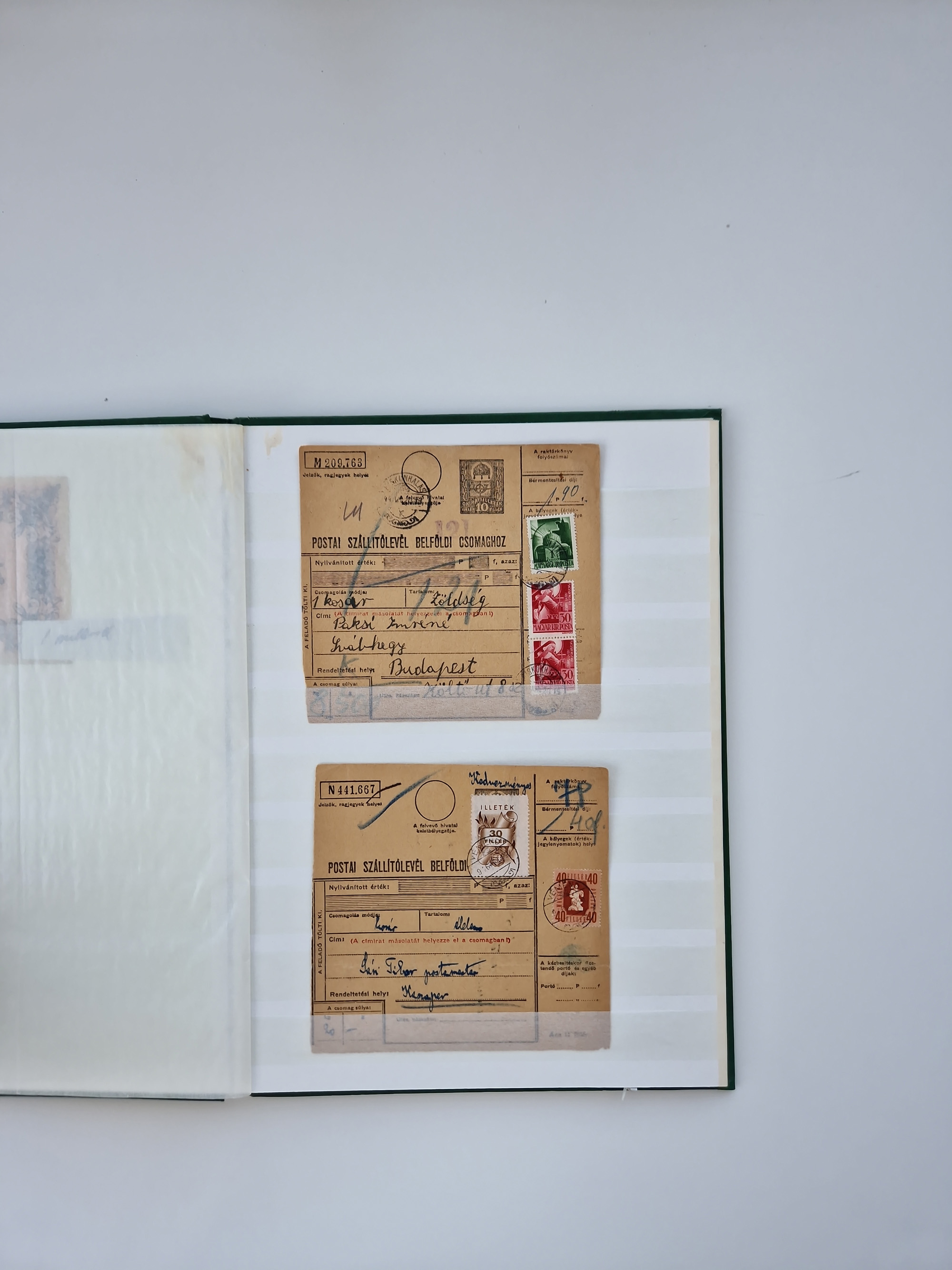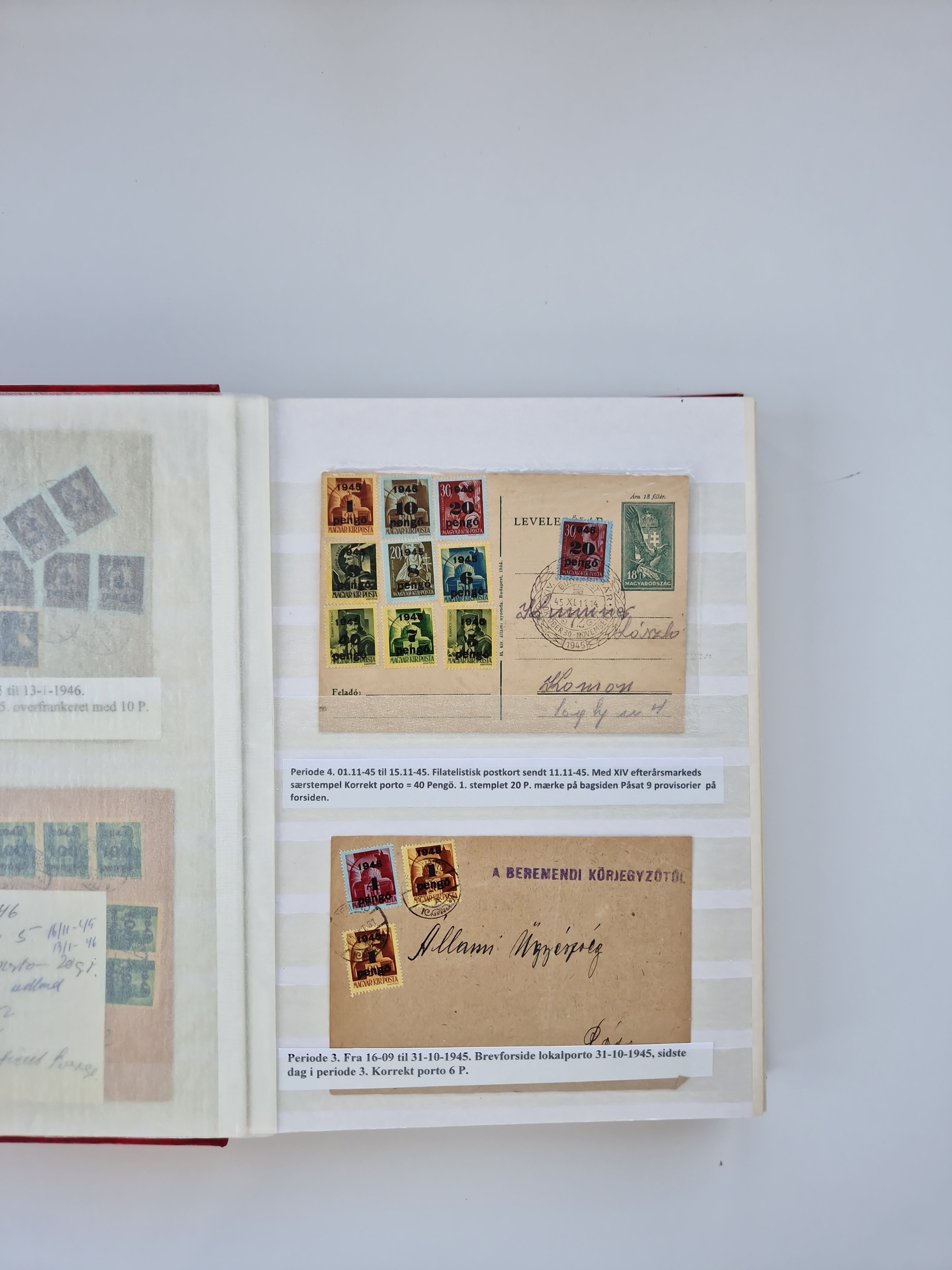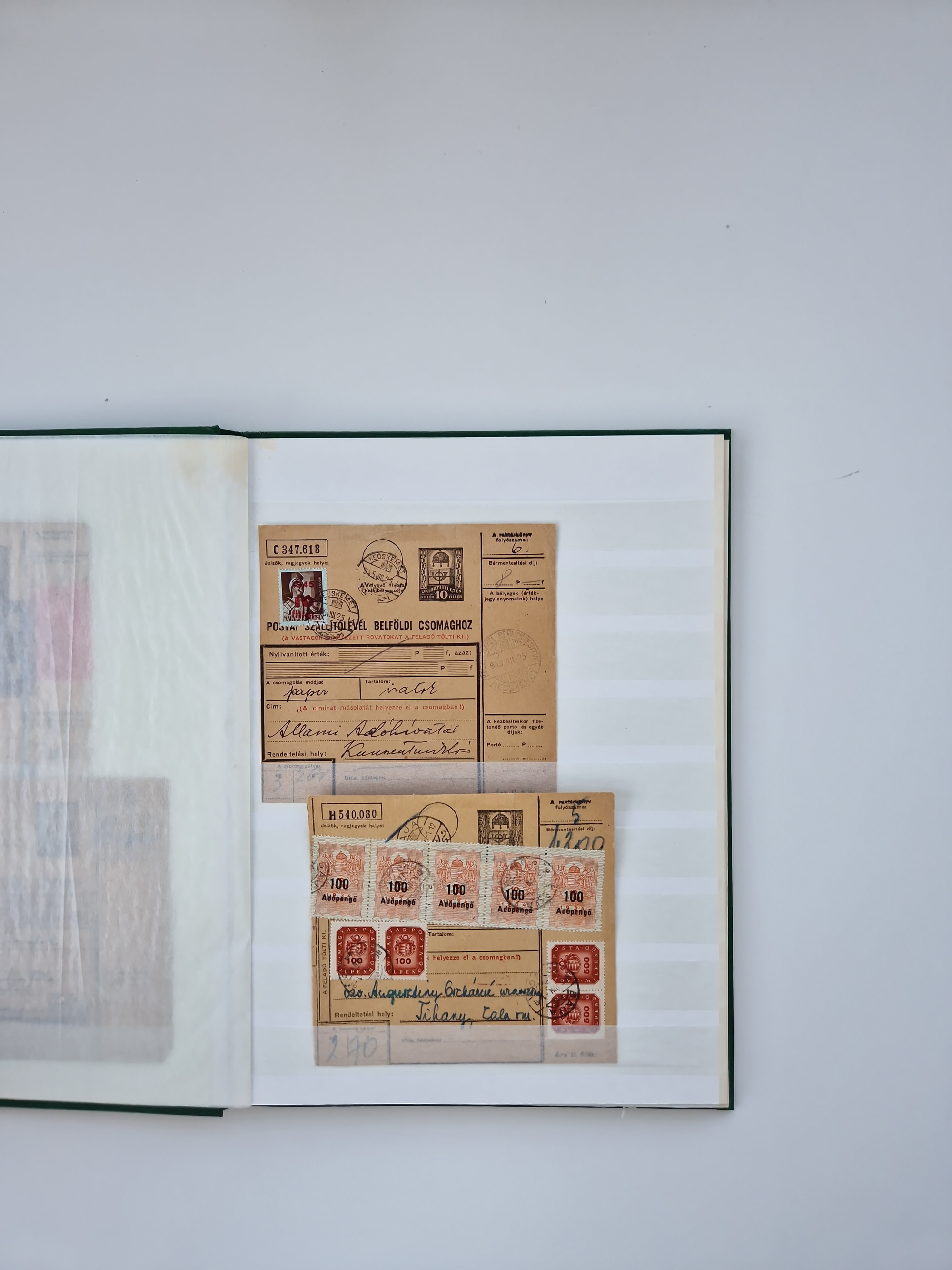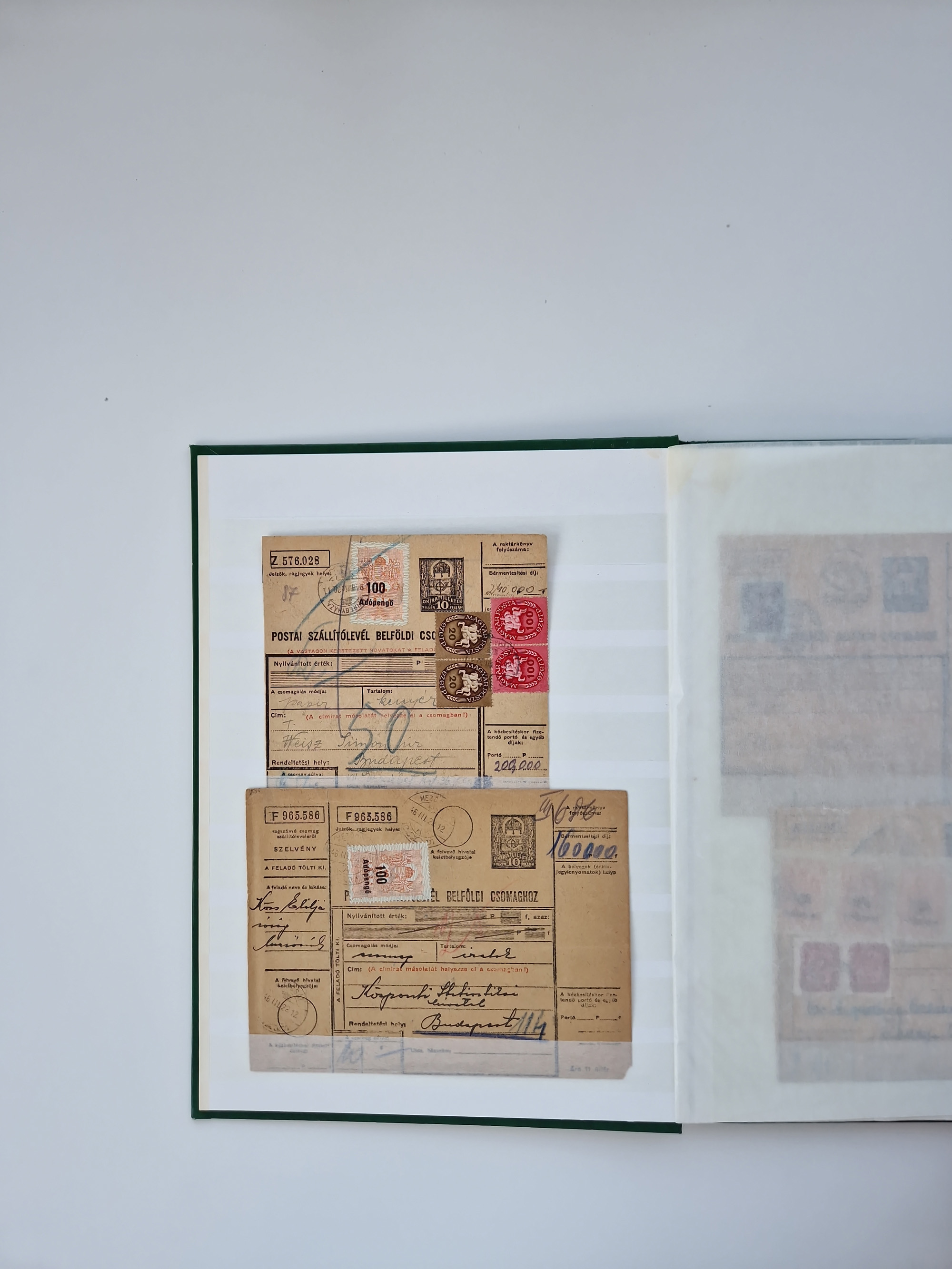 HYPERINFLATION: 1945/46, highly specialized Parcel Cards exhibit collection with around 80 items, showing a fine range of frankings and spanning periods 2 to 21 and 26-27, including interesting usages with Express mailing and Adópengö frankings, noted some of the scarcer periods with 10th (x5), 13th 8x3), 16th, 17th (x3, rate valid only 5 days), 19th (x3), 26th (x2) and 27th (x23), some better usages throughout with September 1945 scarce parcel card for a 20 kg sending (2nd Period), etc.; a fine assembly in overall good condition, neatly mounted and expertly described in Danish, in one album