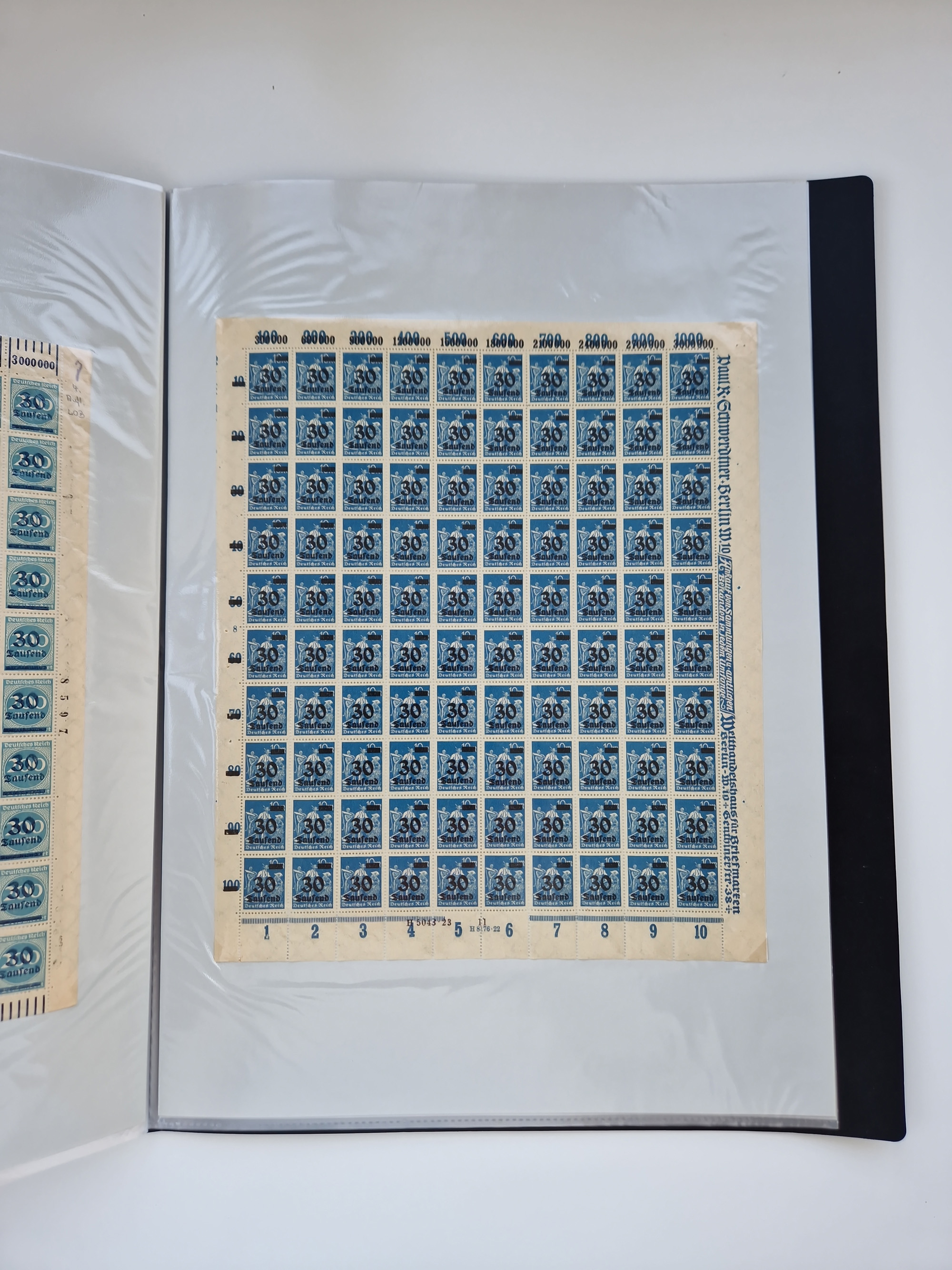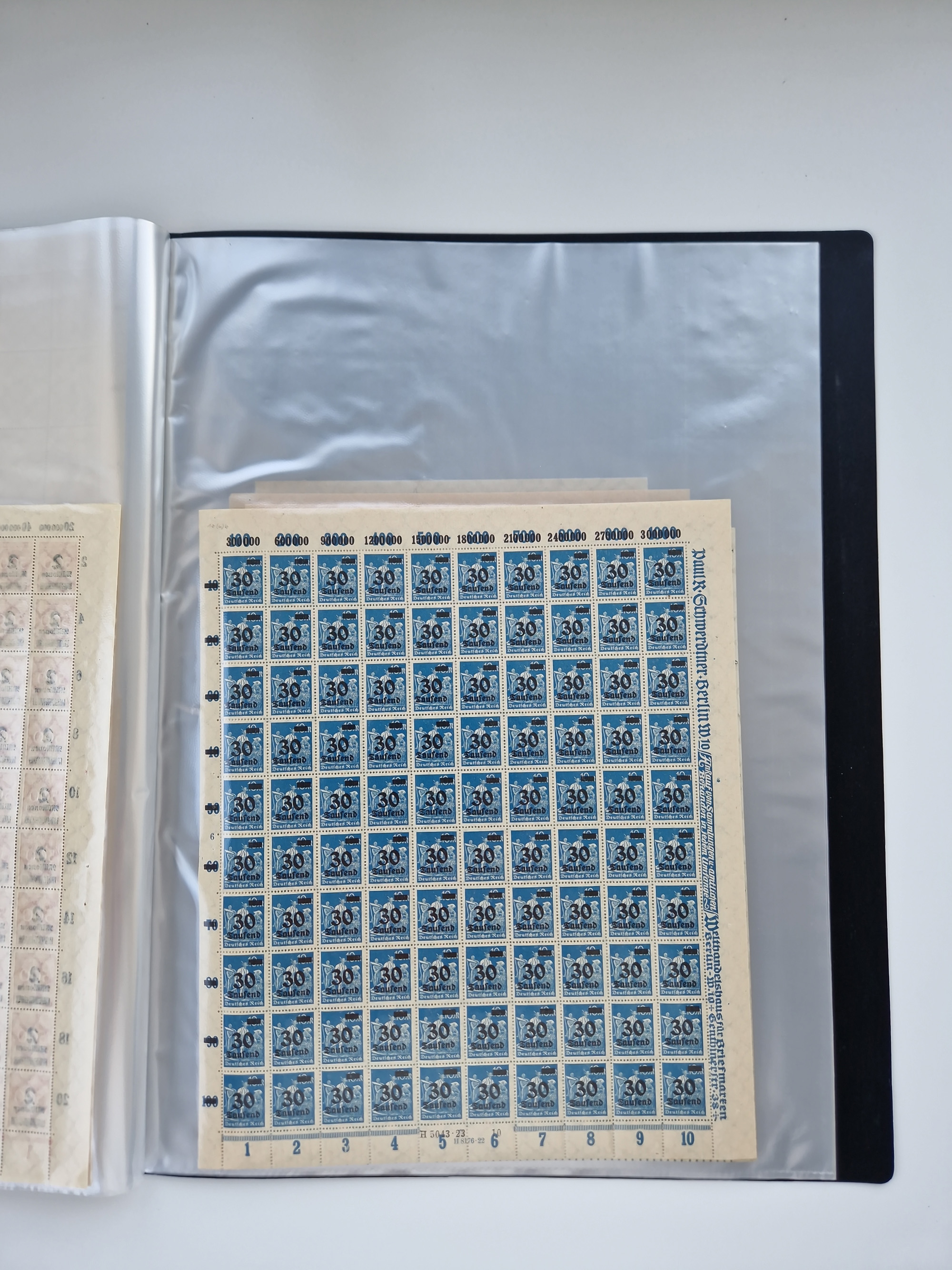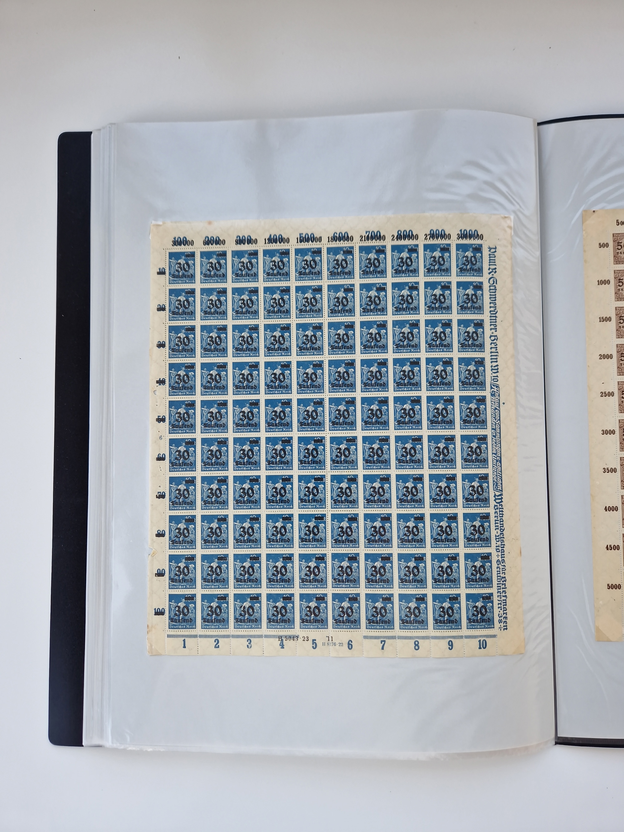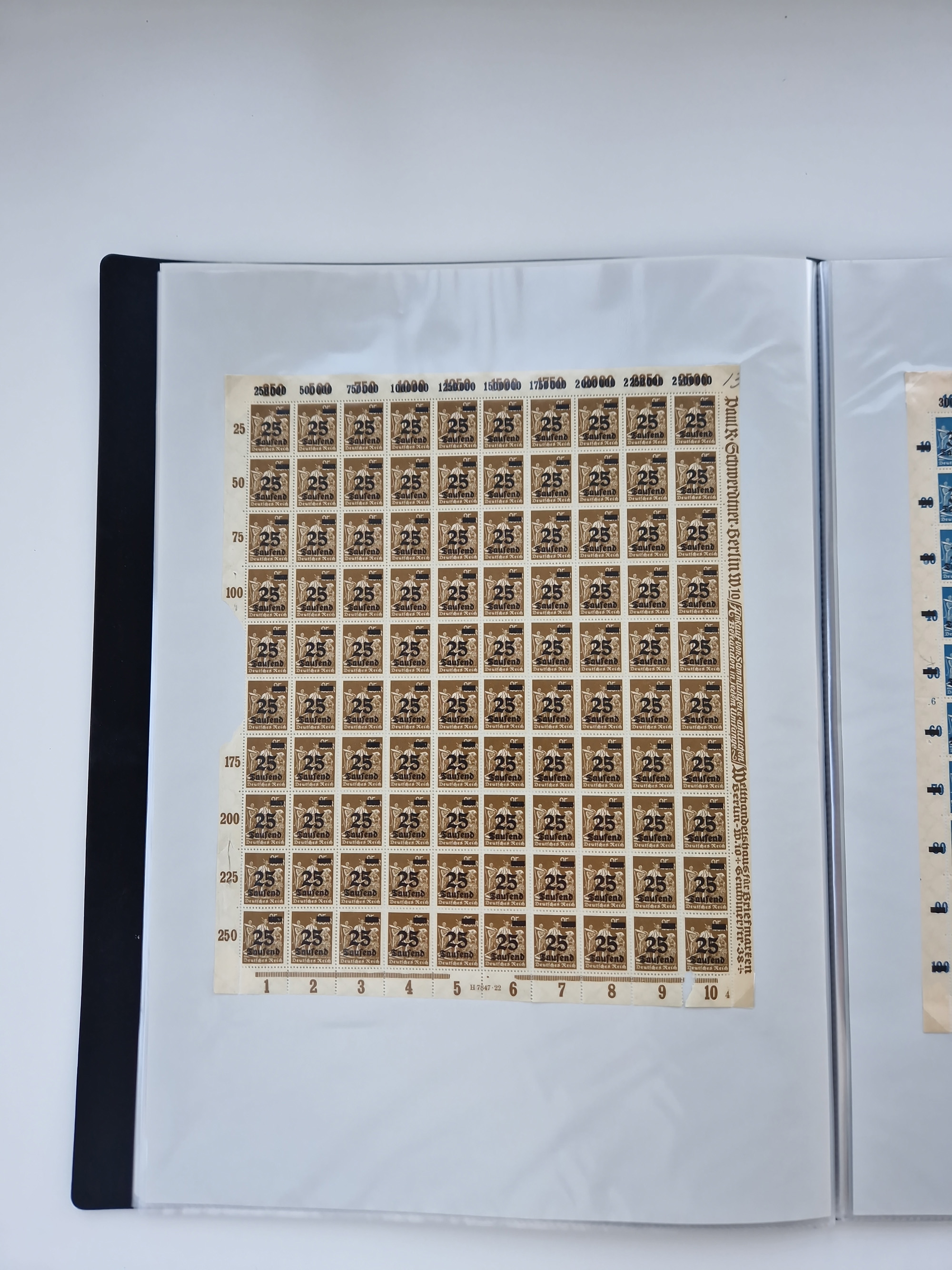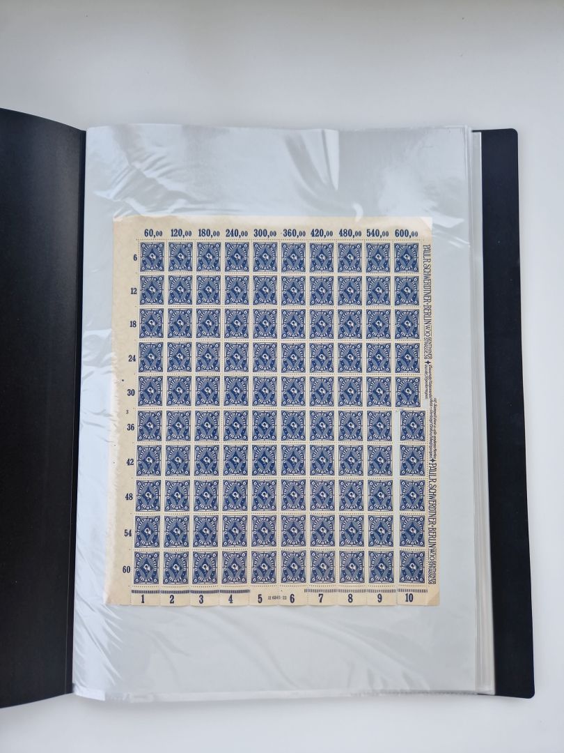 1921/22, postfrischer und ungebrauchter Bestand mit etwas über 200 Bogen und Bogenteilen, dabei Walzen- und Plattenbogen, HAN, Druckereizeichen, Pl.-Nr., auch Wz. Waffeln und Bogentaschen, teils sign. INFLA Berlin, etwas unterschiedliche Erhaltung, in zwei Ordnern