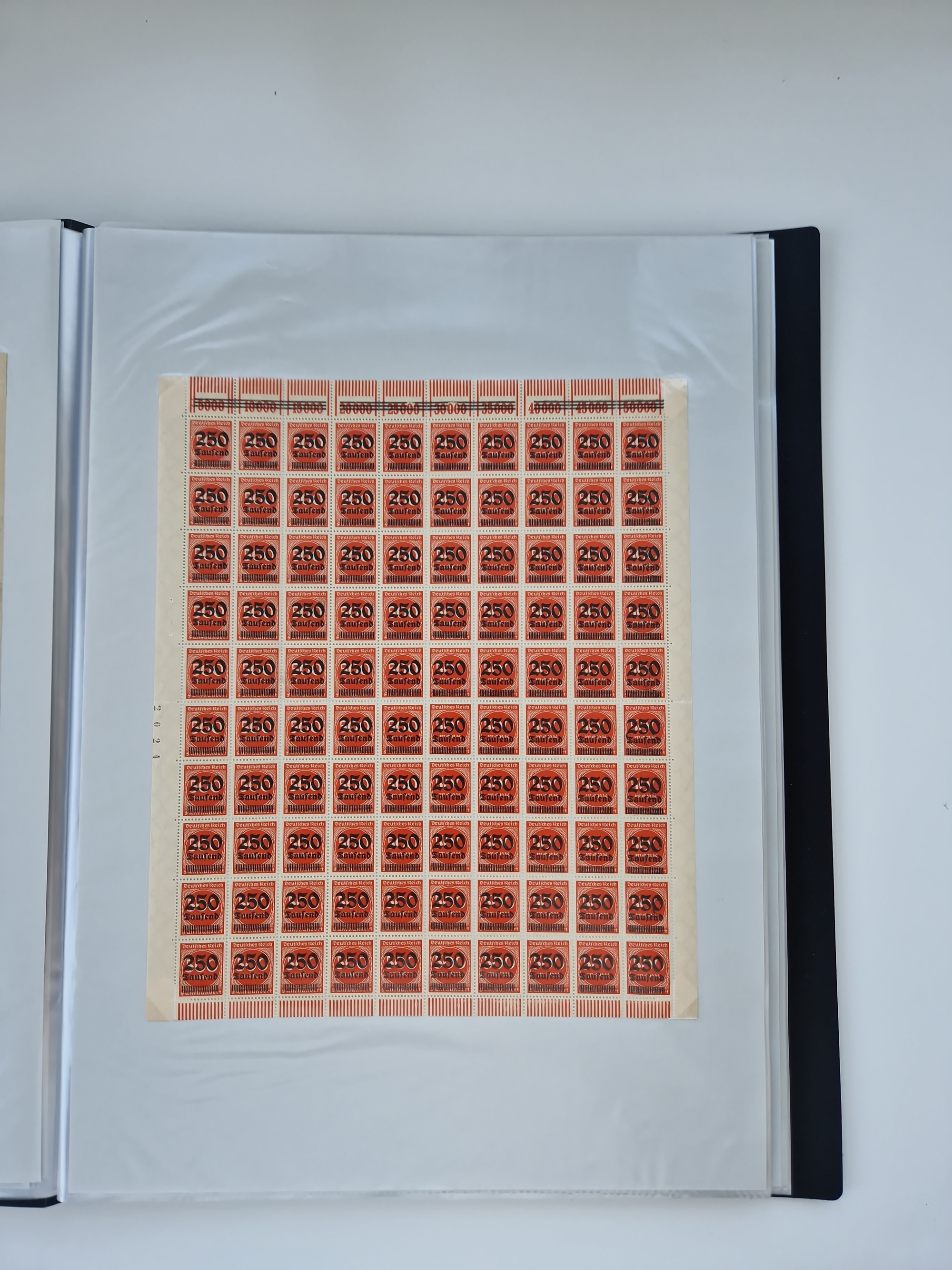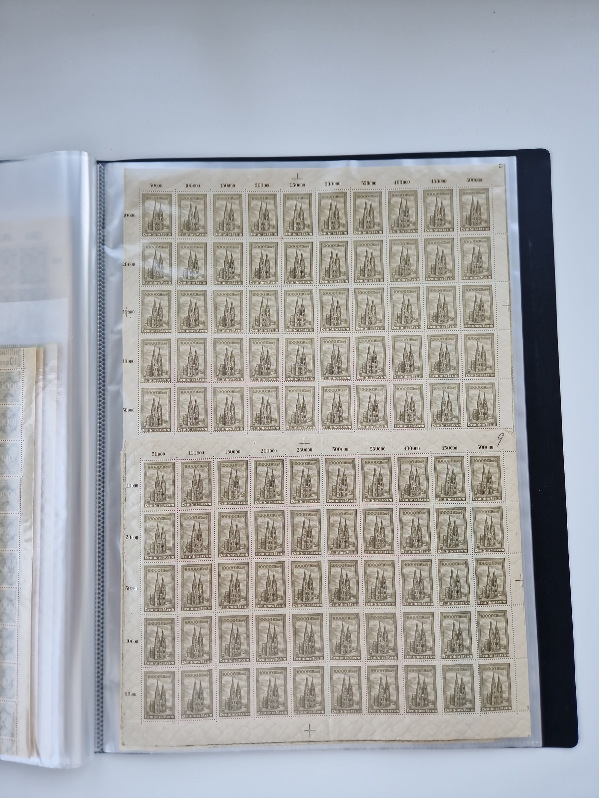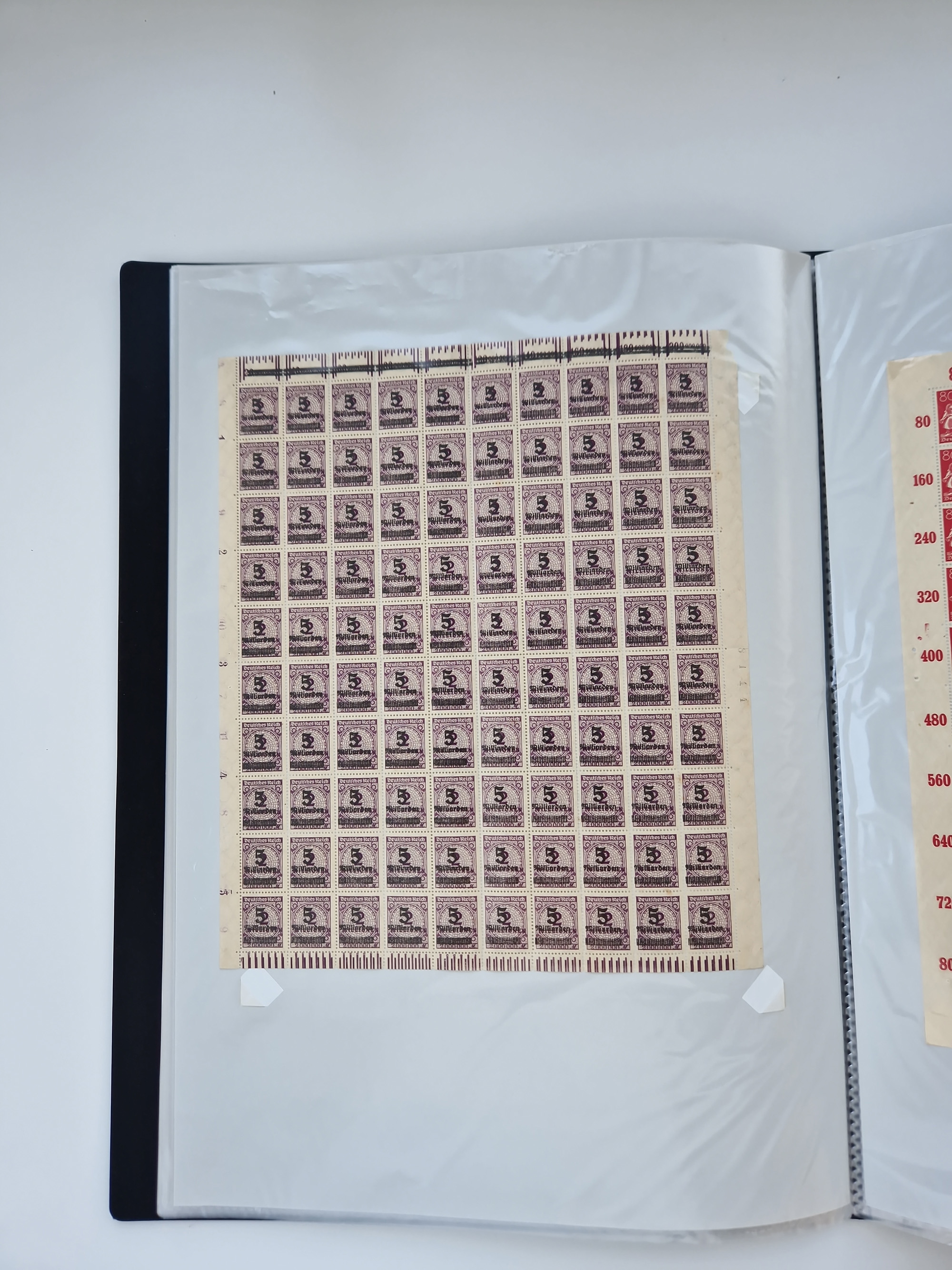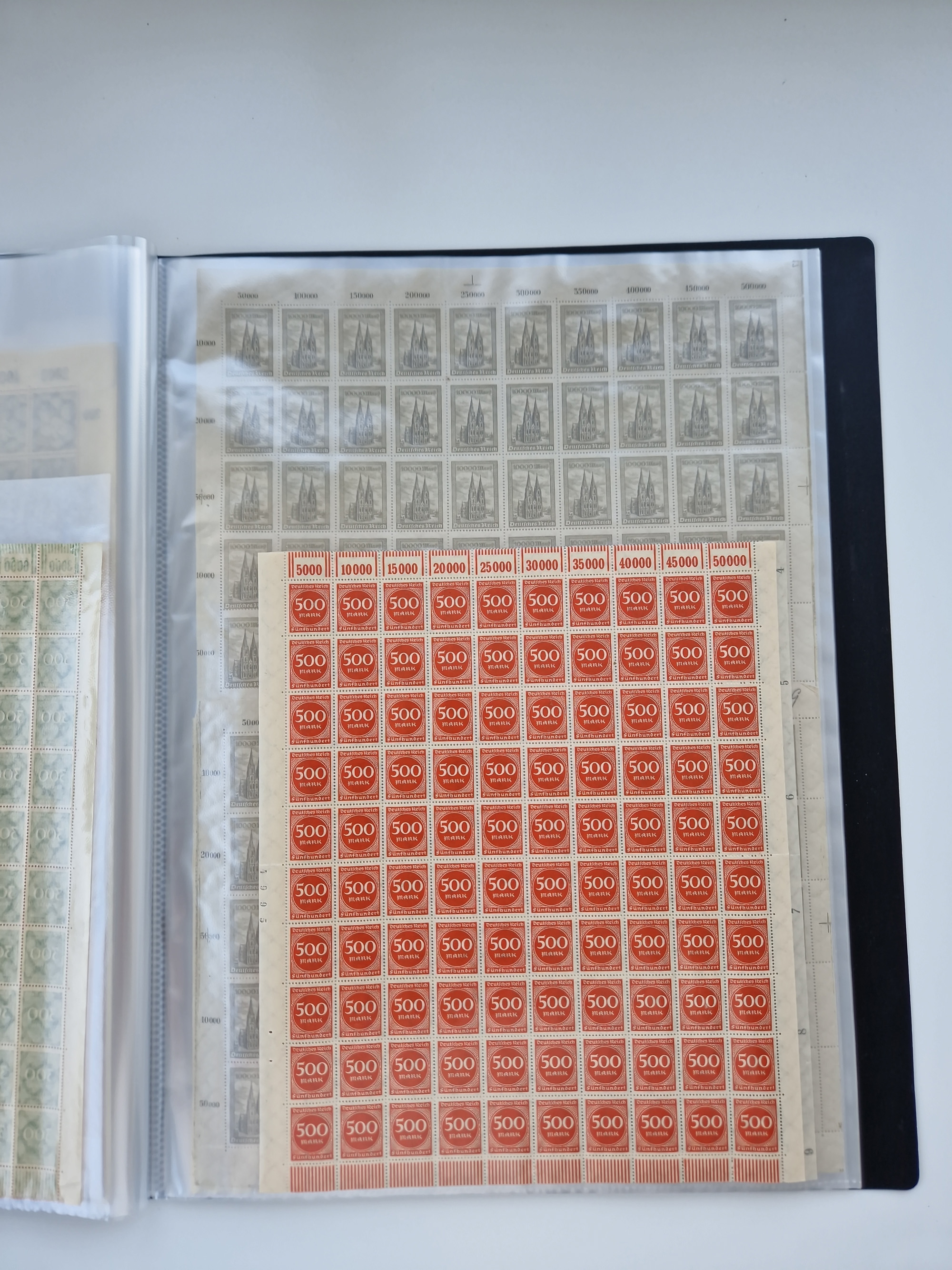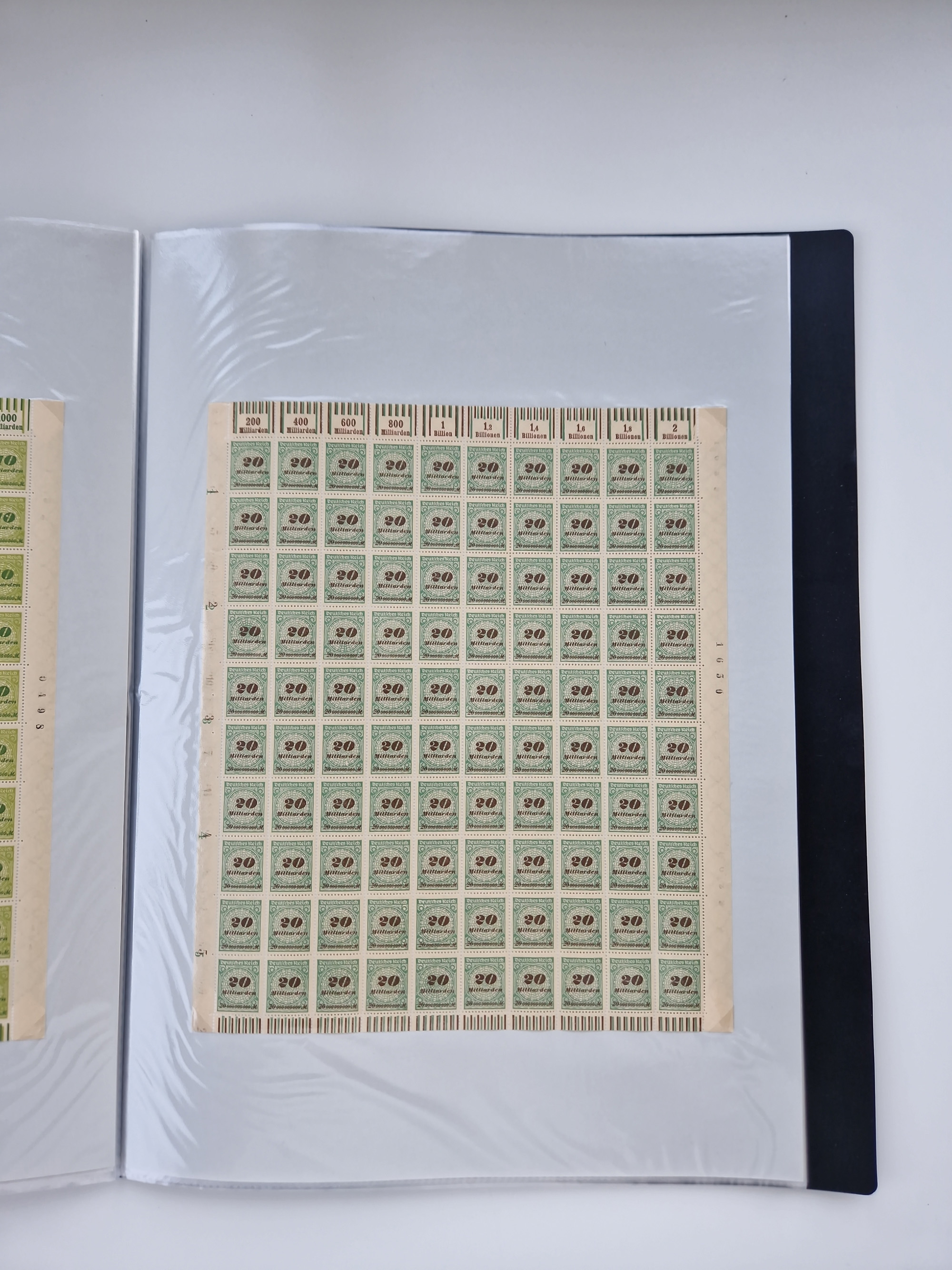 1920, postfrischer Bestand Germania 1.25 auf 1M. (2), 1.5 auf 1 M. (2) sowie 2.5 auf 2 M. (1), in kompletten Bögen, postfrisch, teils gefaltet mit Randfehlern (Mi.-Nr. 116-118)