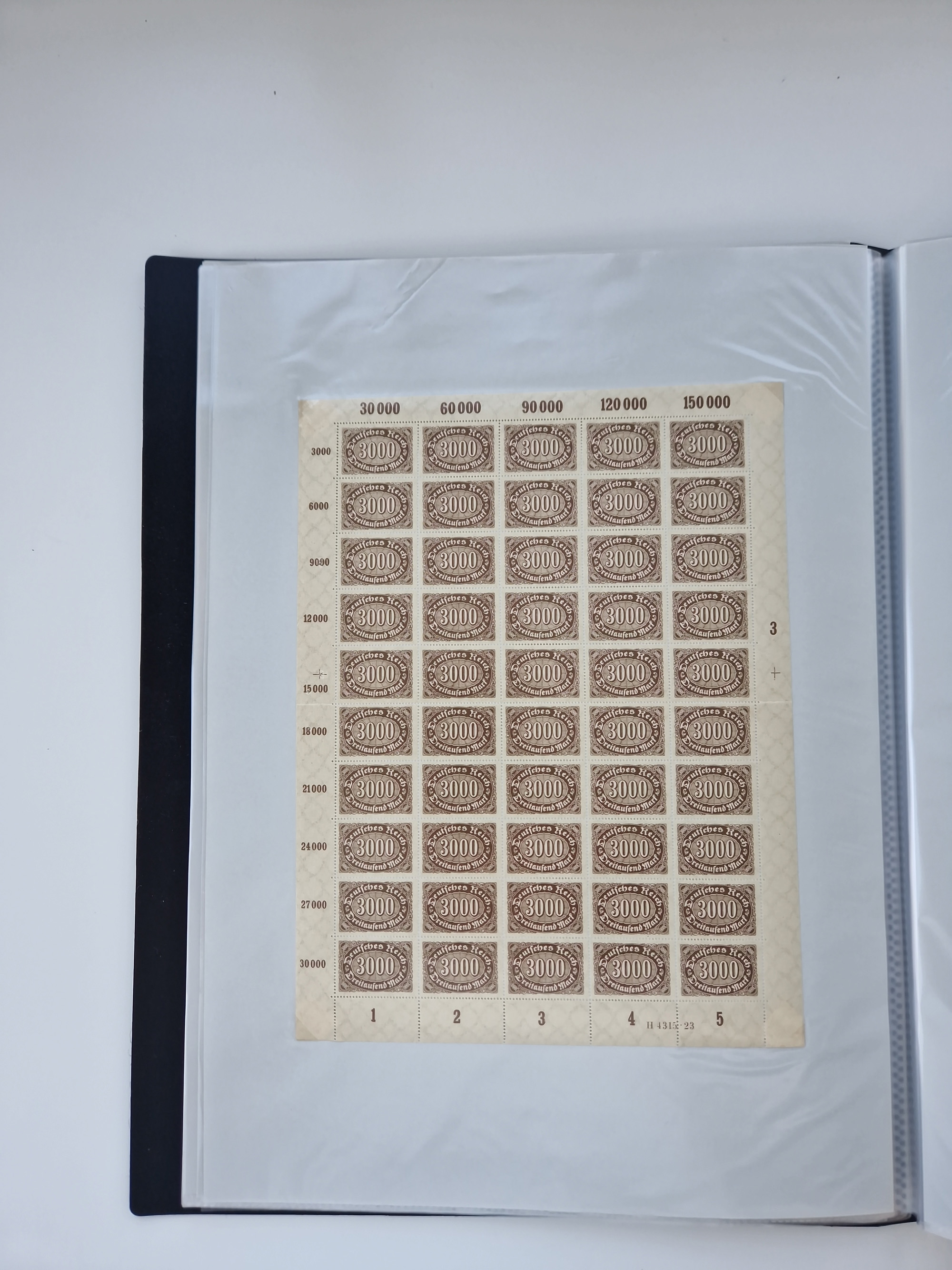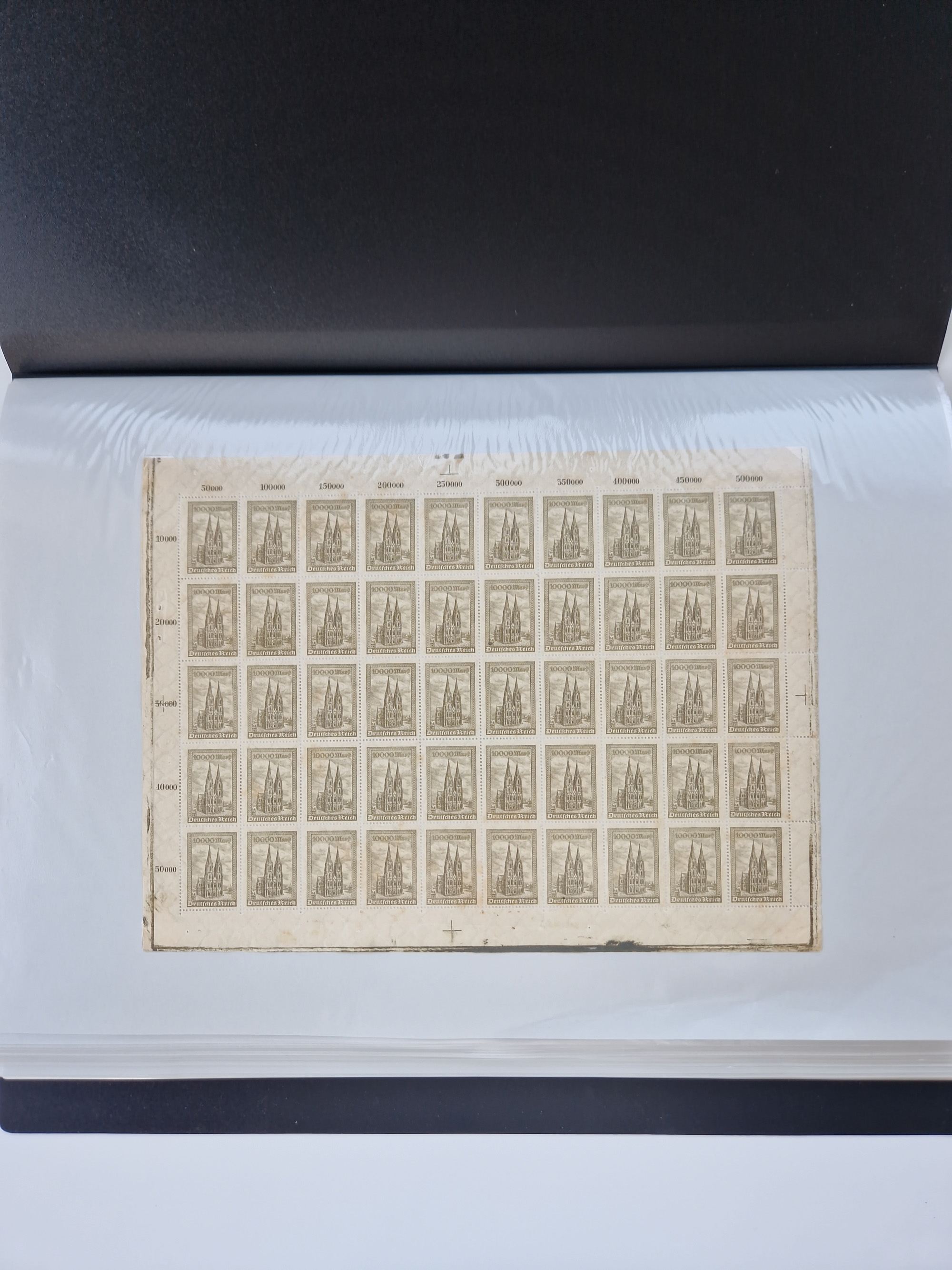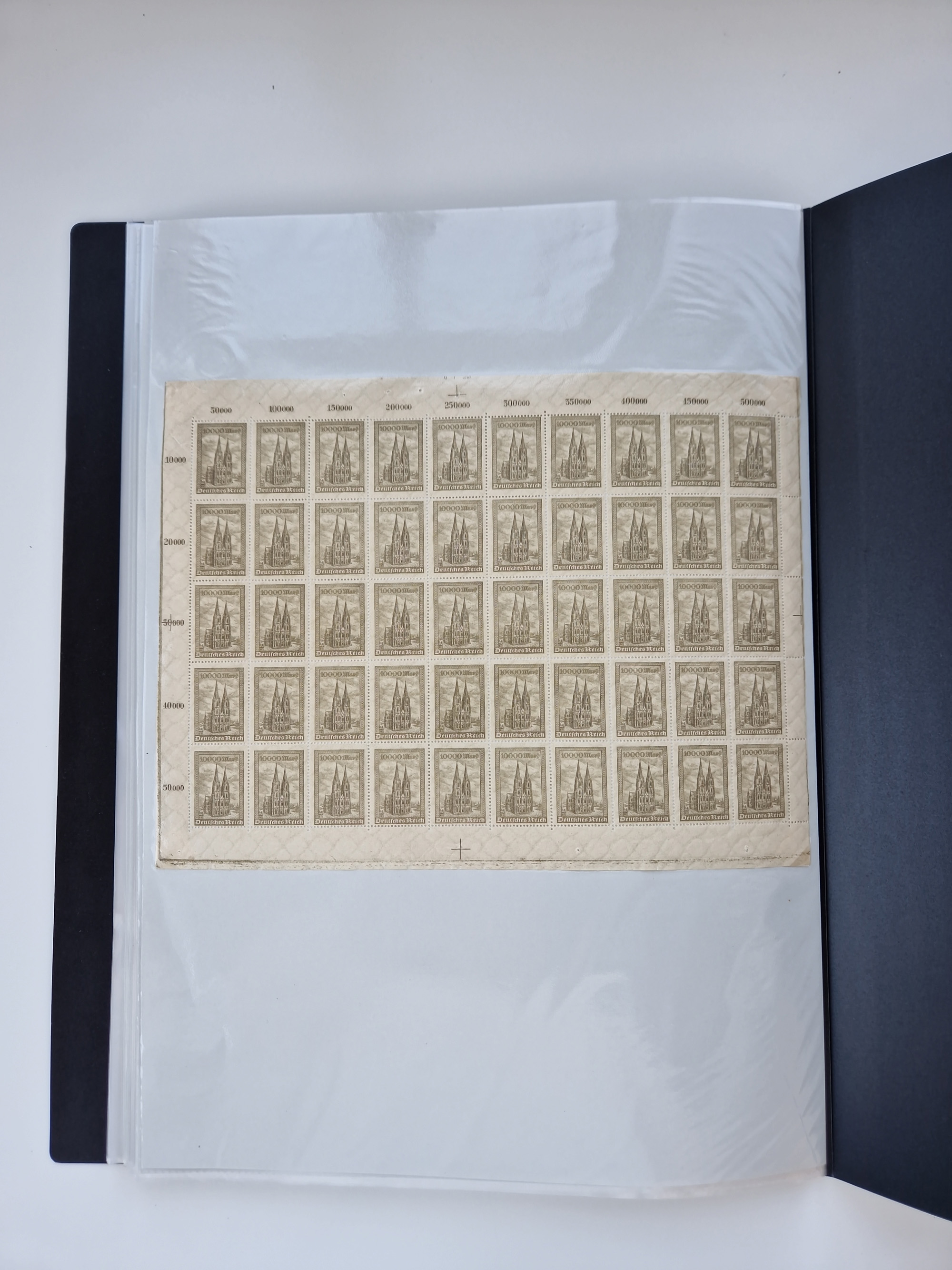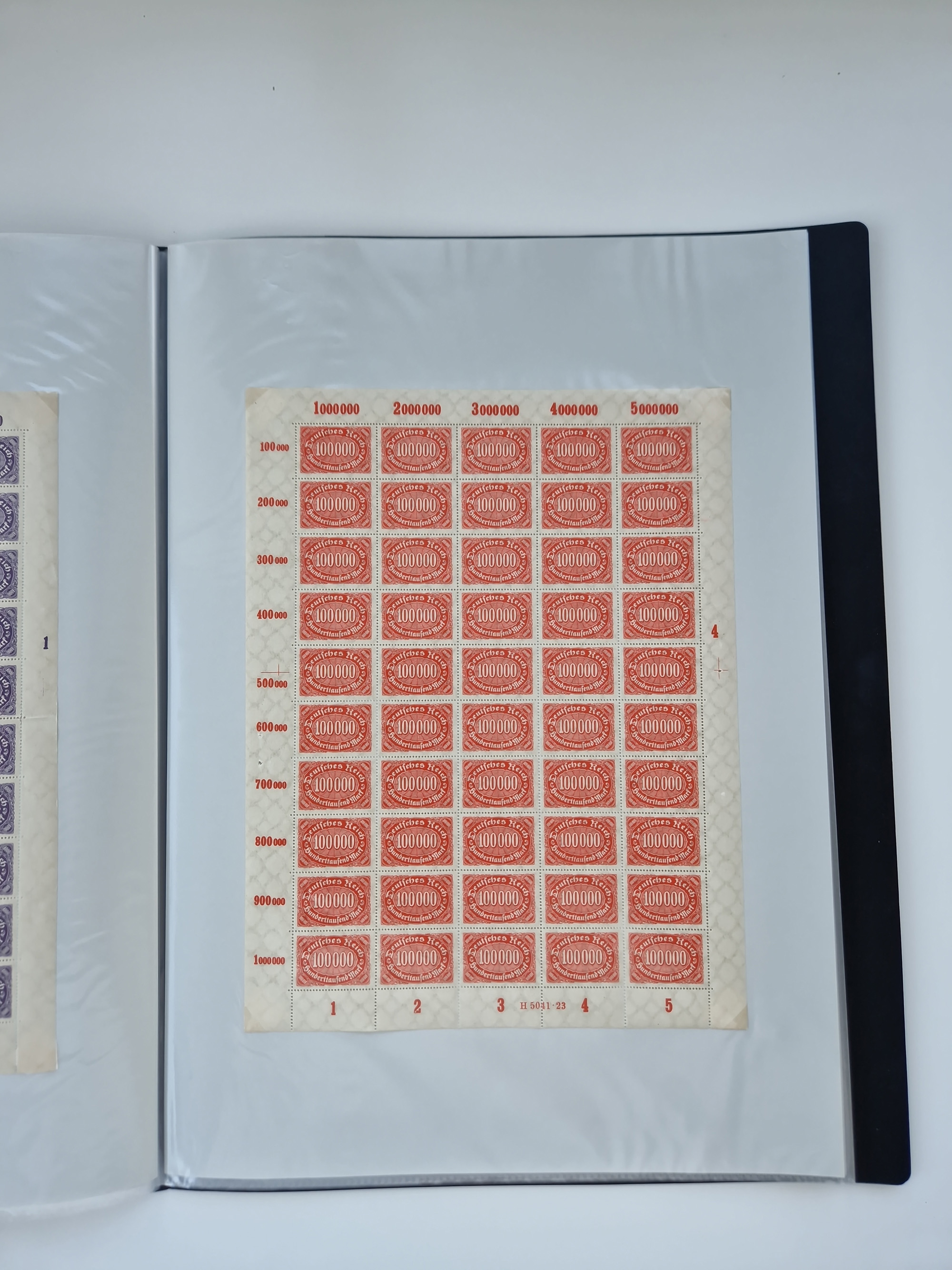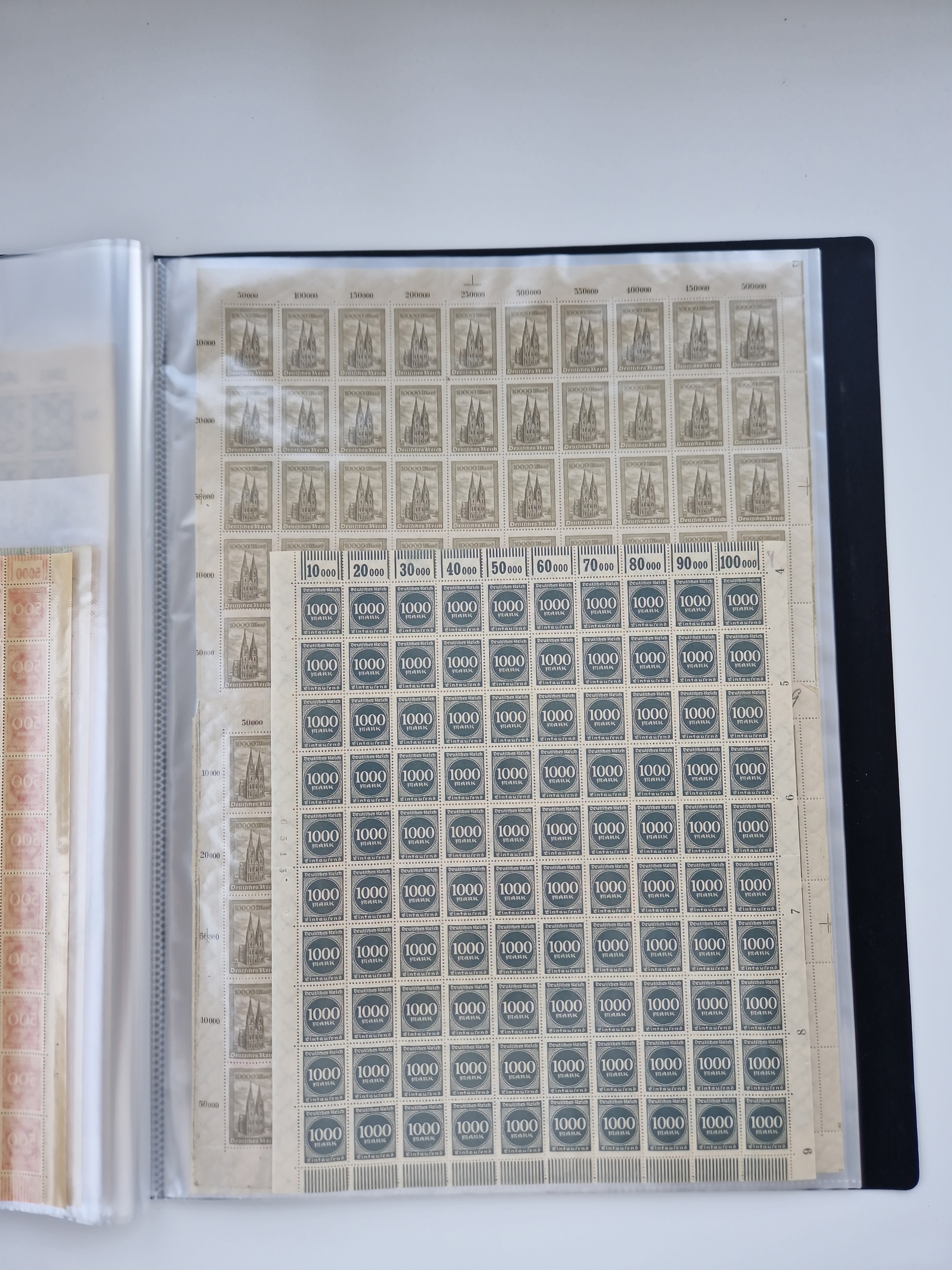 1920, postfrischer Bestand Germania 1.25 auf 1M. (2), 1.5 auf 1 M. (2) sowie 2.5 auf 2 M. (1), in kompletten Bögen, postfrisch, teils gefaltet mit Randfehlern (Mi.-Nr. 116-118)