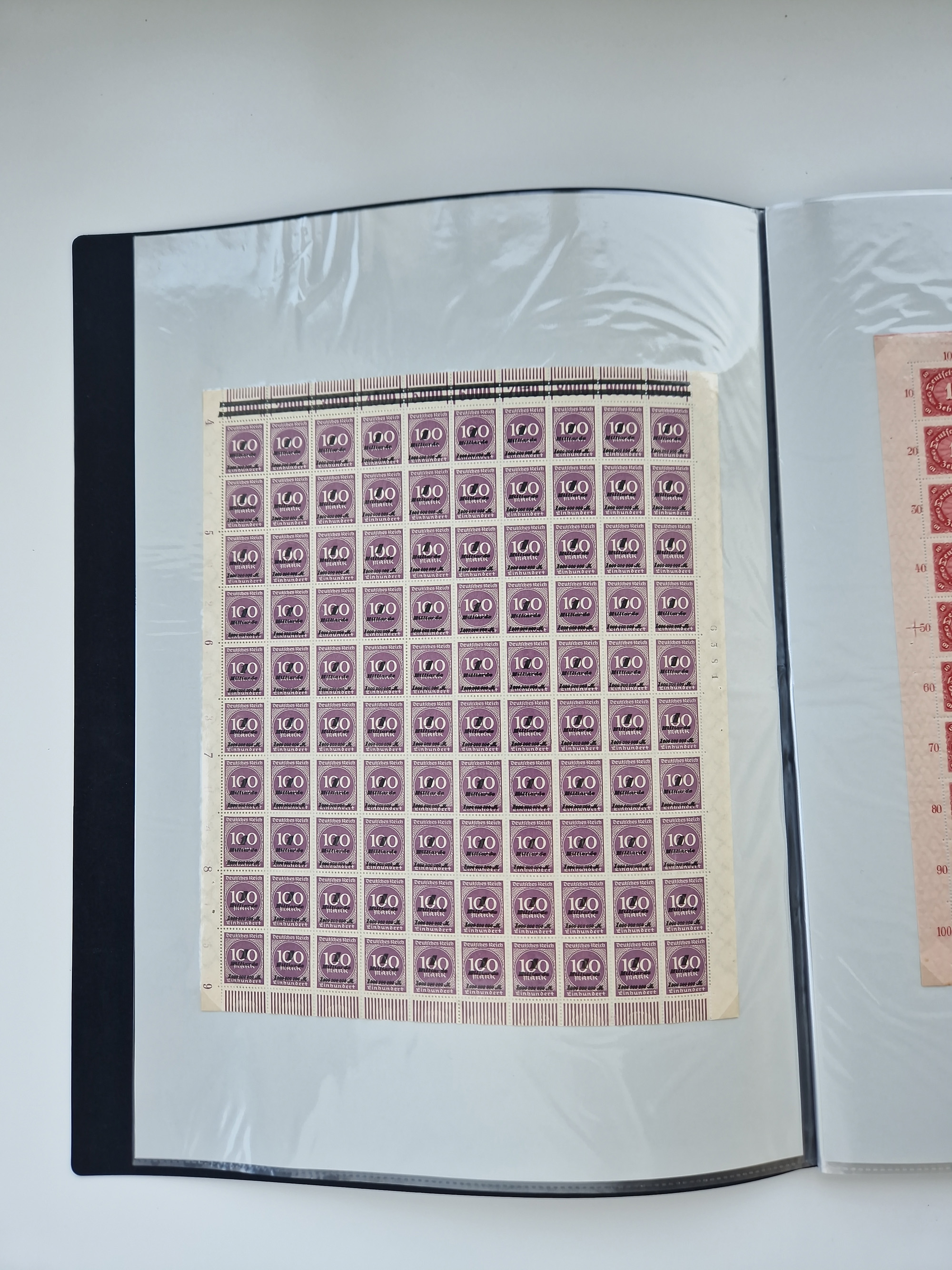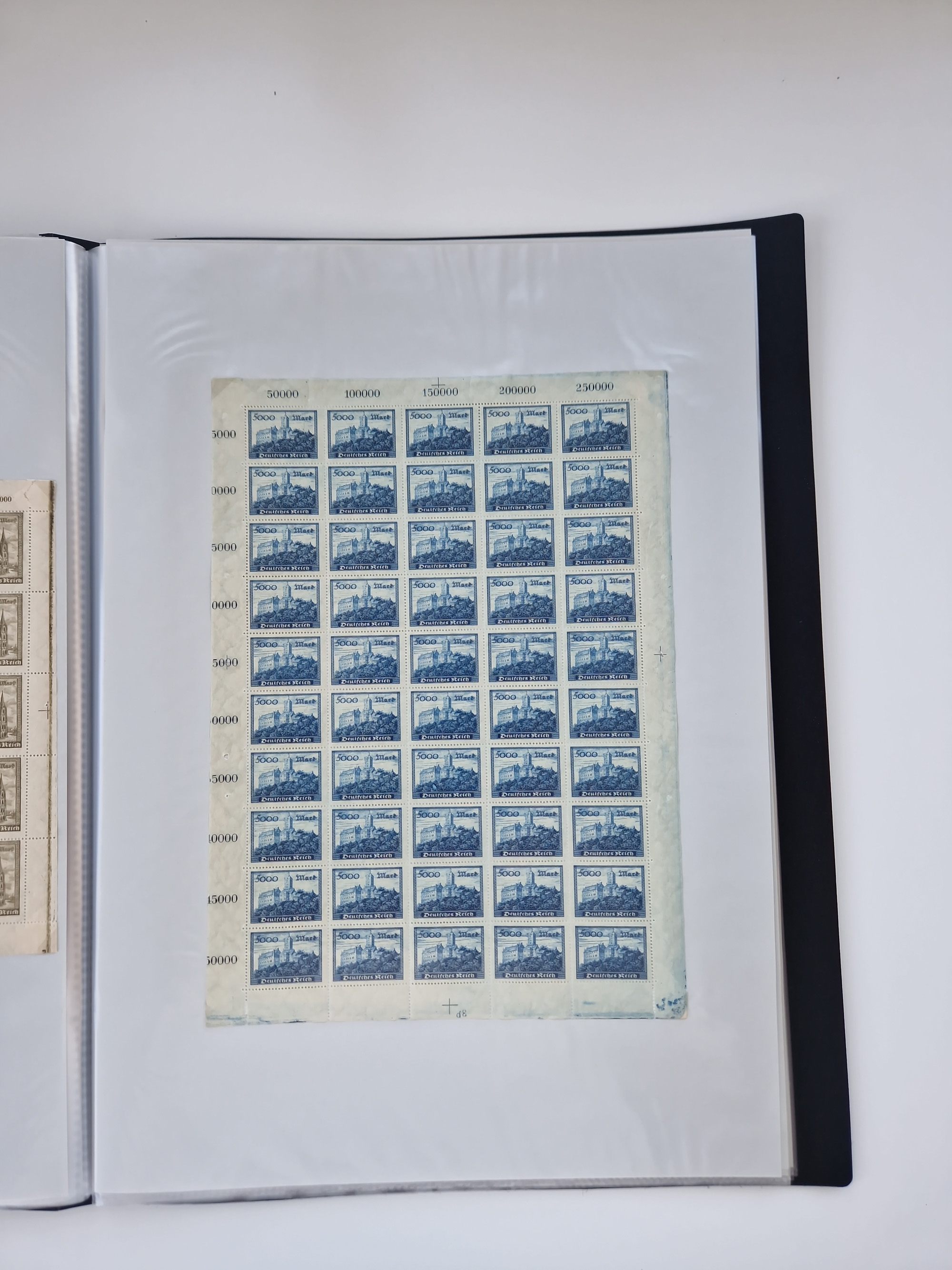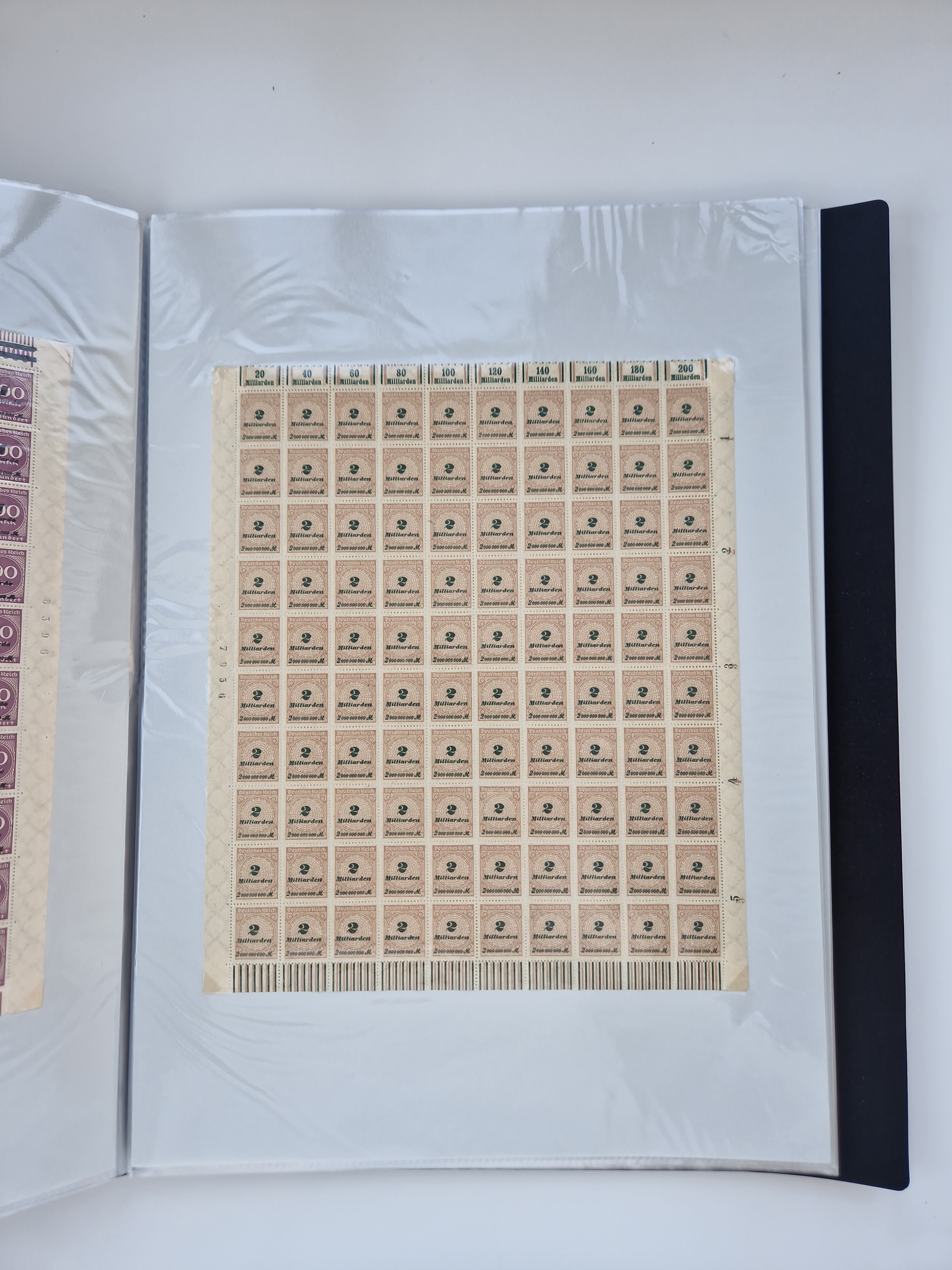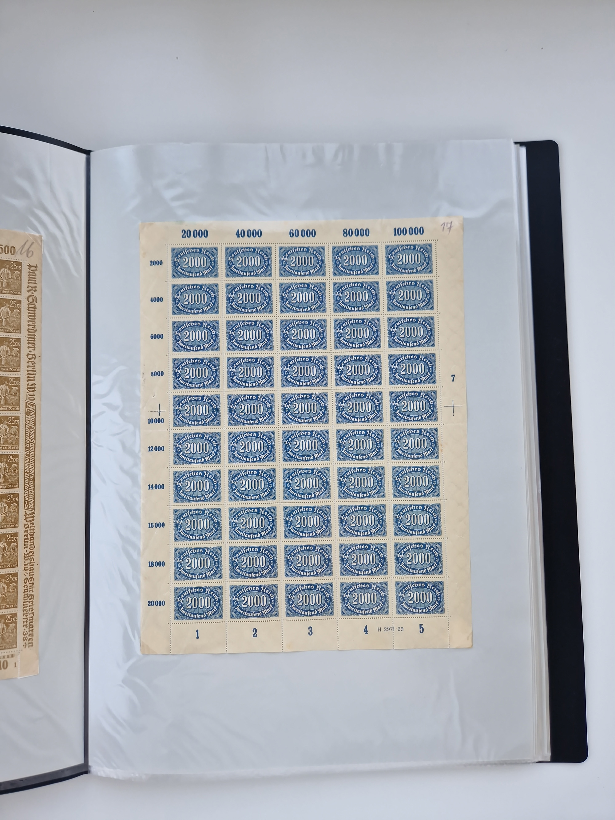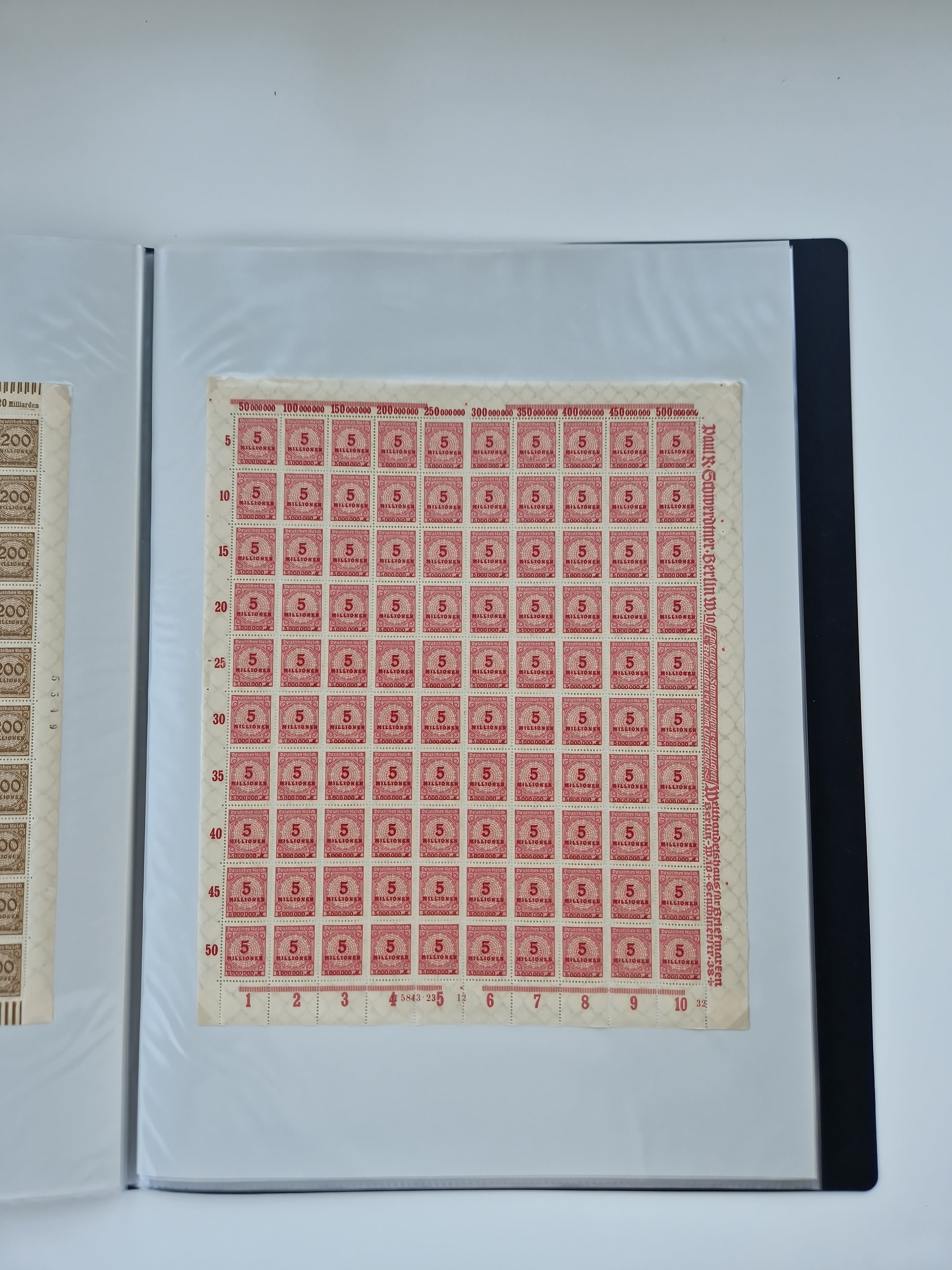 1920, postfrischer Bestand Germania 1.25 auf 1M. (2), 1.5 auf 1 M. (2) sowie 2.5 auf 2 M. (1), in kompletten Bögen, postfrisch, teils gefaltet mit Randfehlern (Mi.-Nr. 116-118)