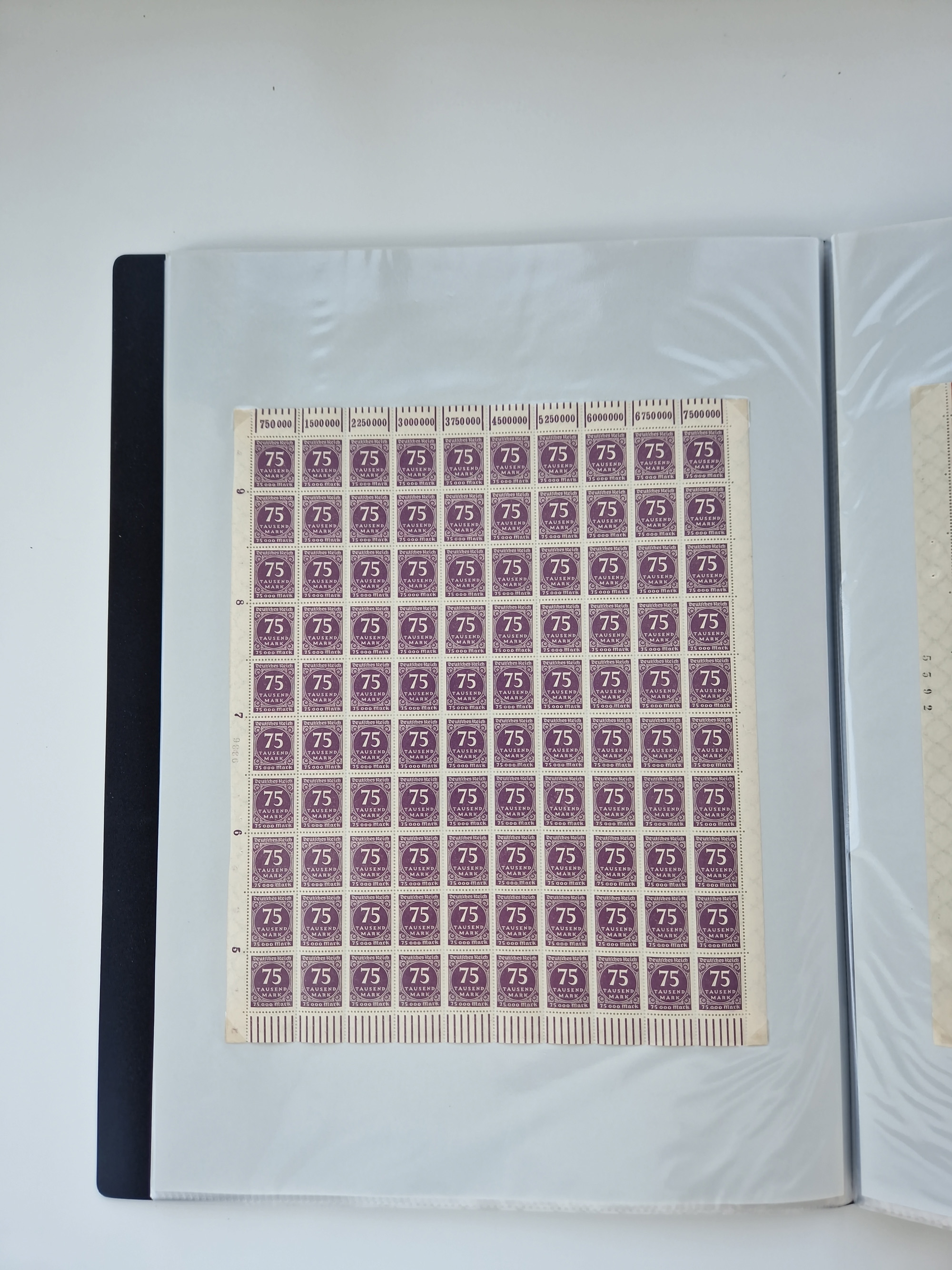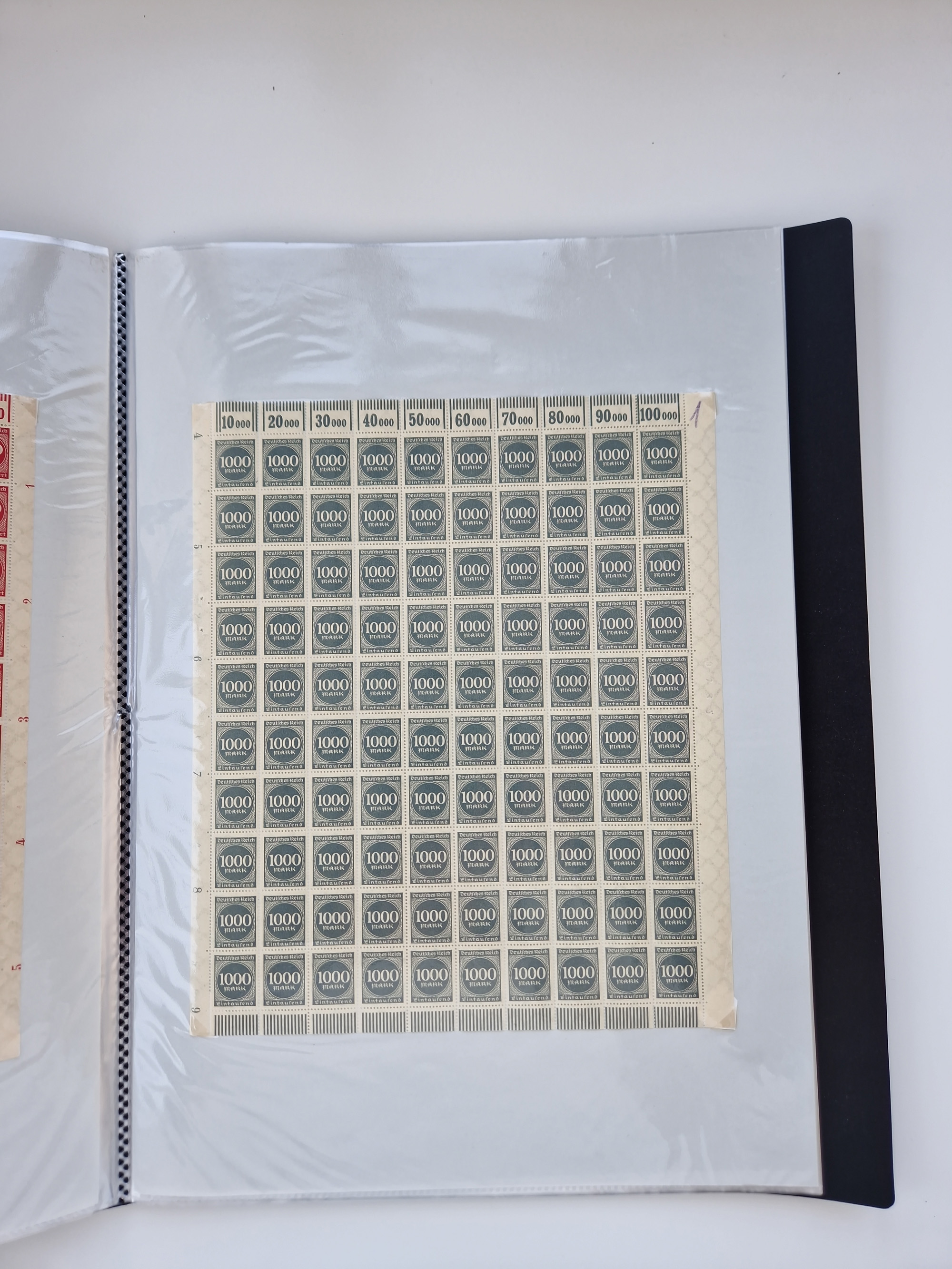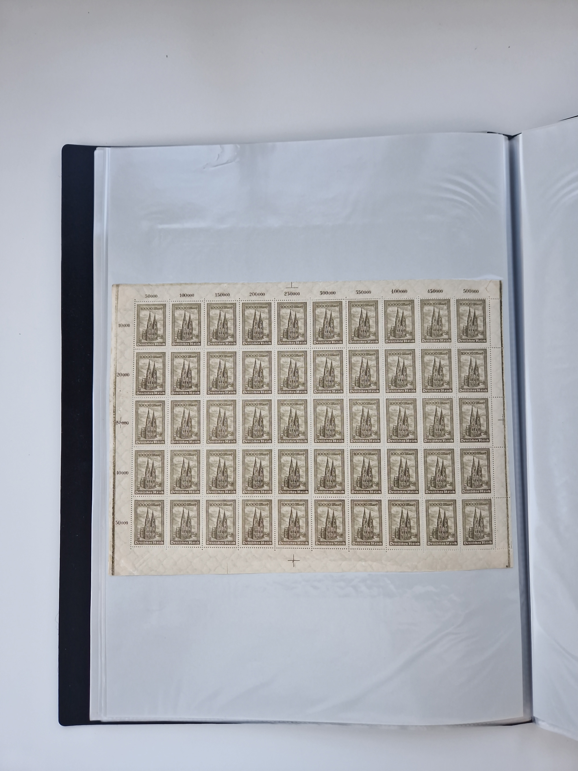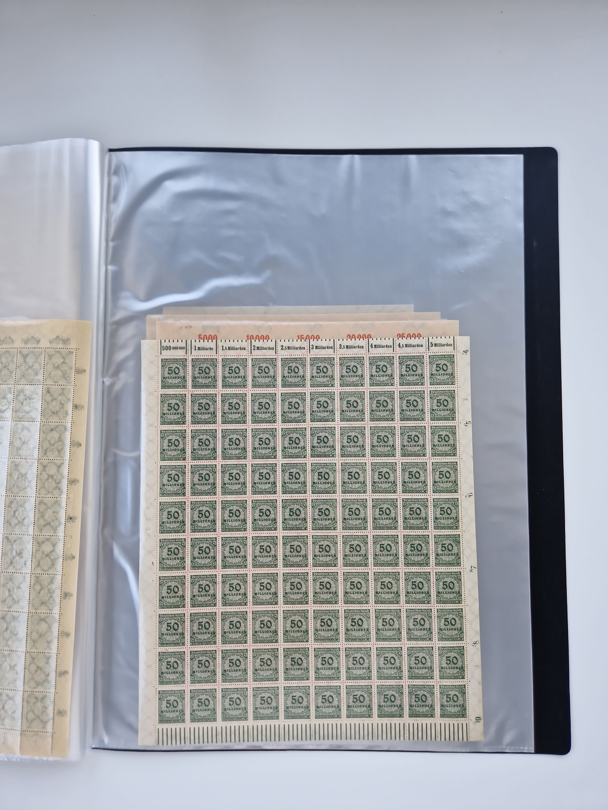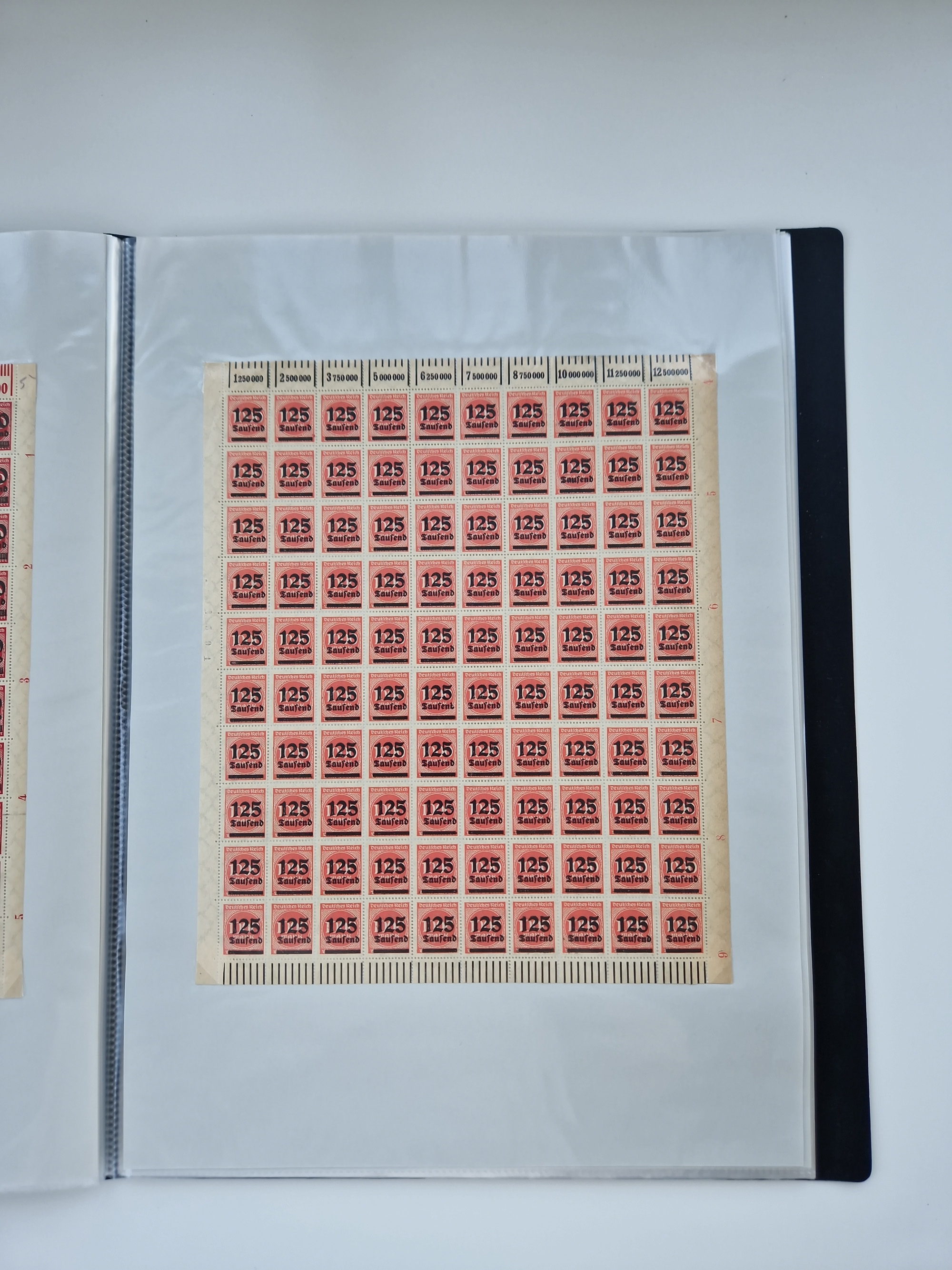 1920, postfrischer Bestand Germania 1.25 auf 1M. (2), 1.5 auf 1 M. (2) sowie 2.5 auf 2 M. (1), in kompletten Bögen, postfrisch, teils gefaltet mit Randfehlern (Mi.-Nr. 116-118)