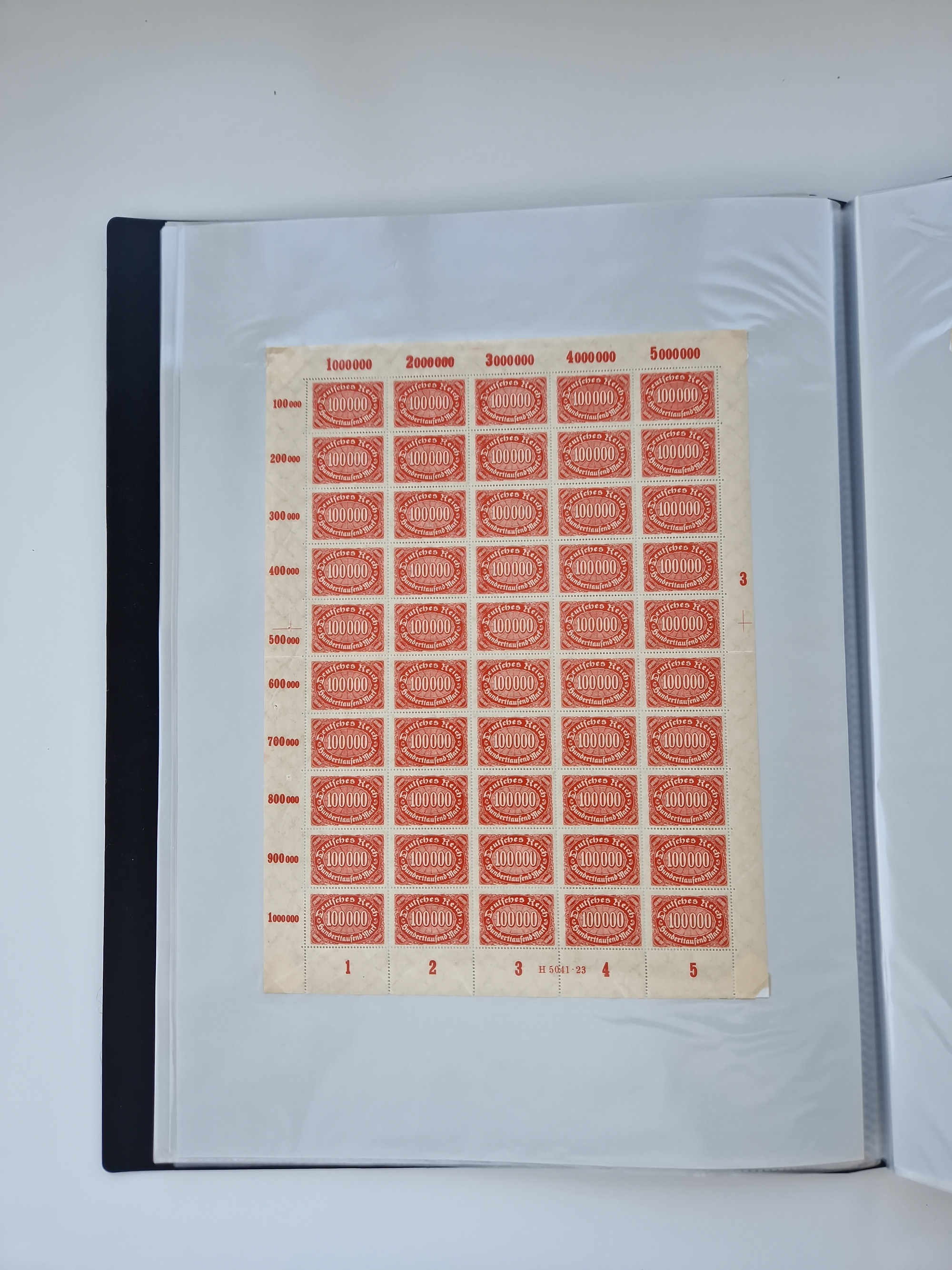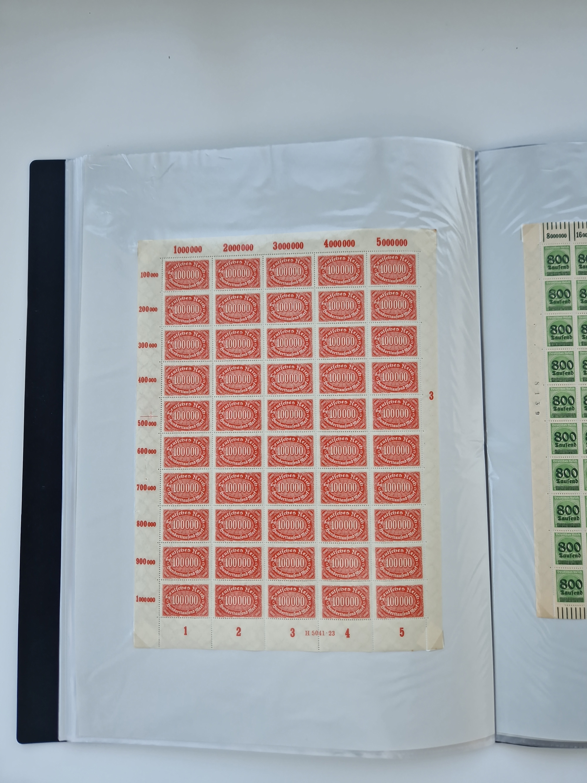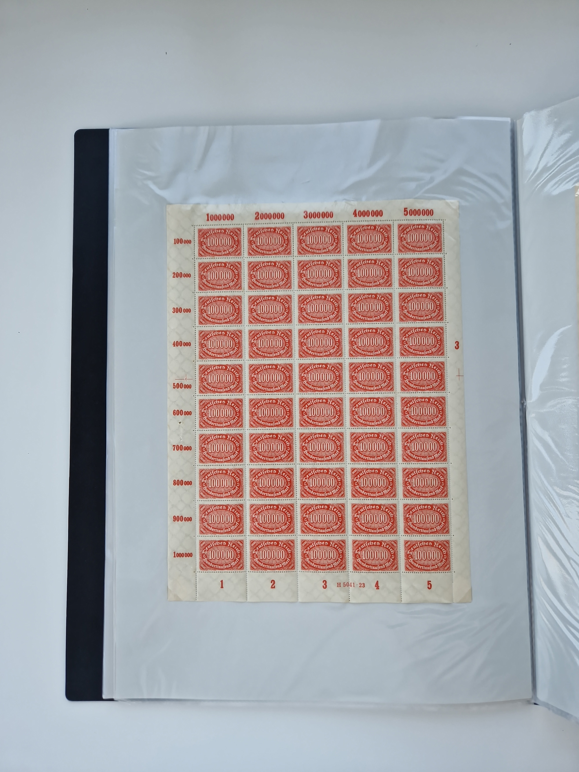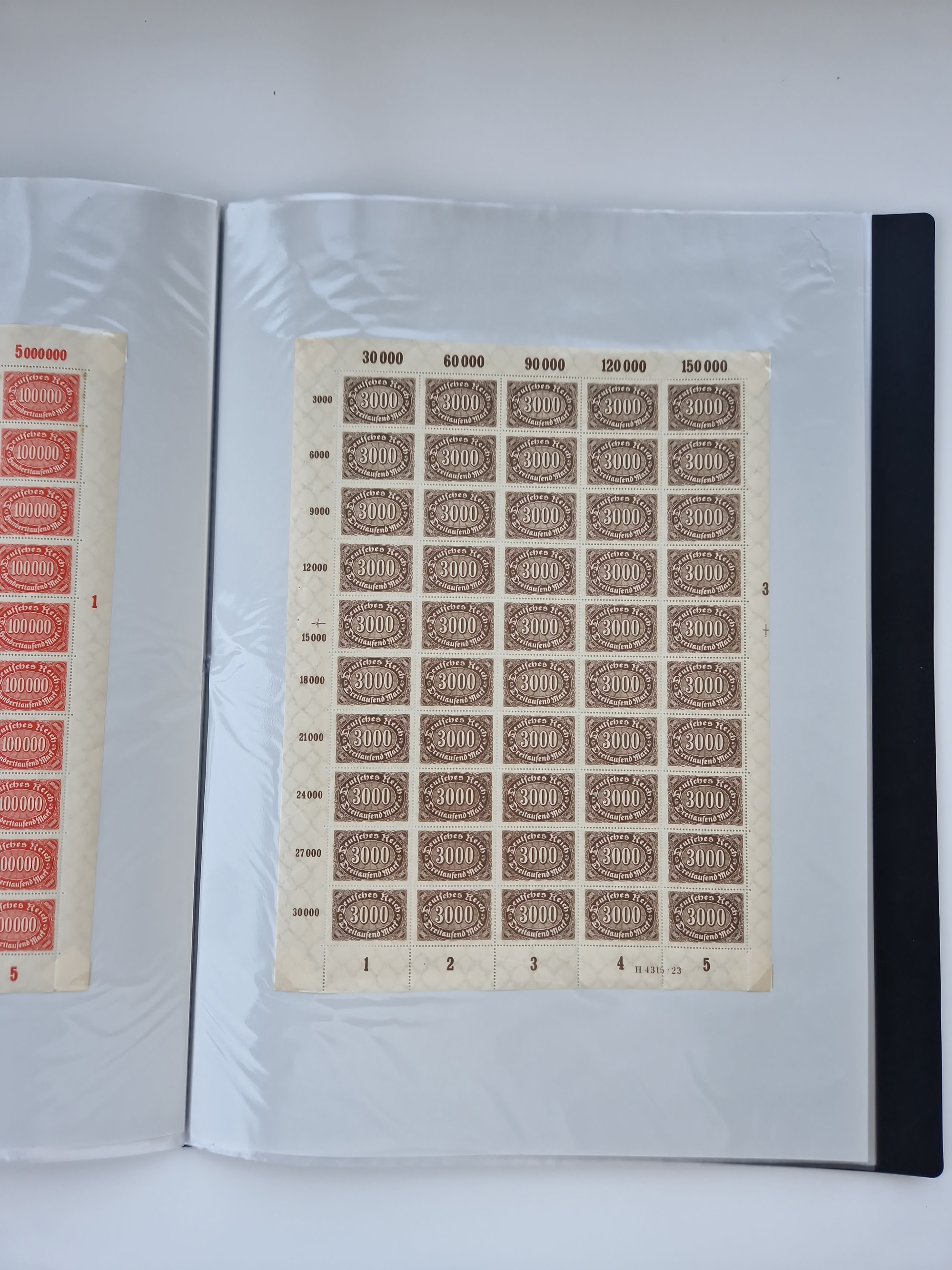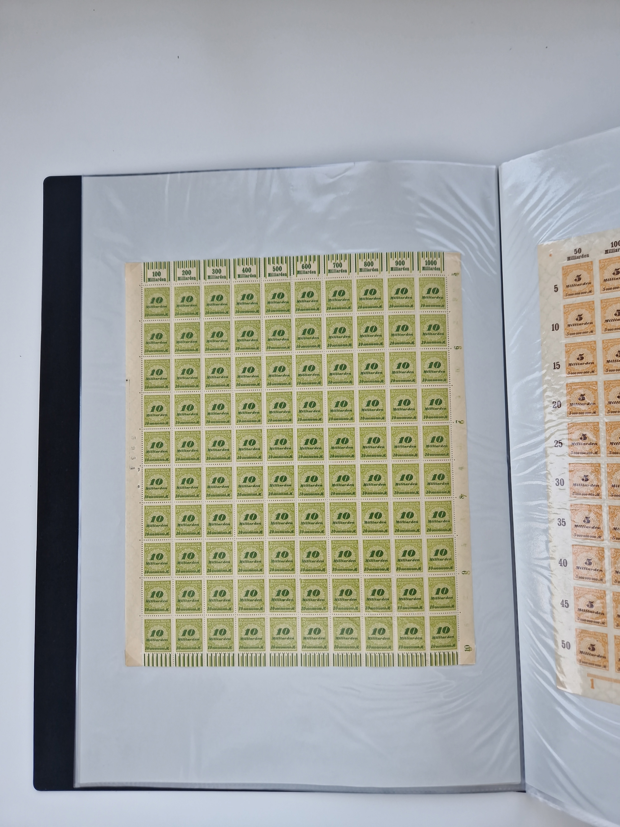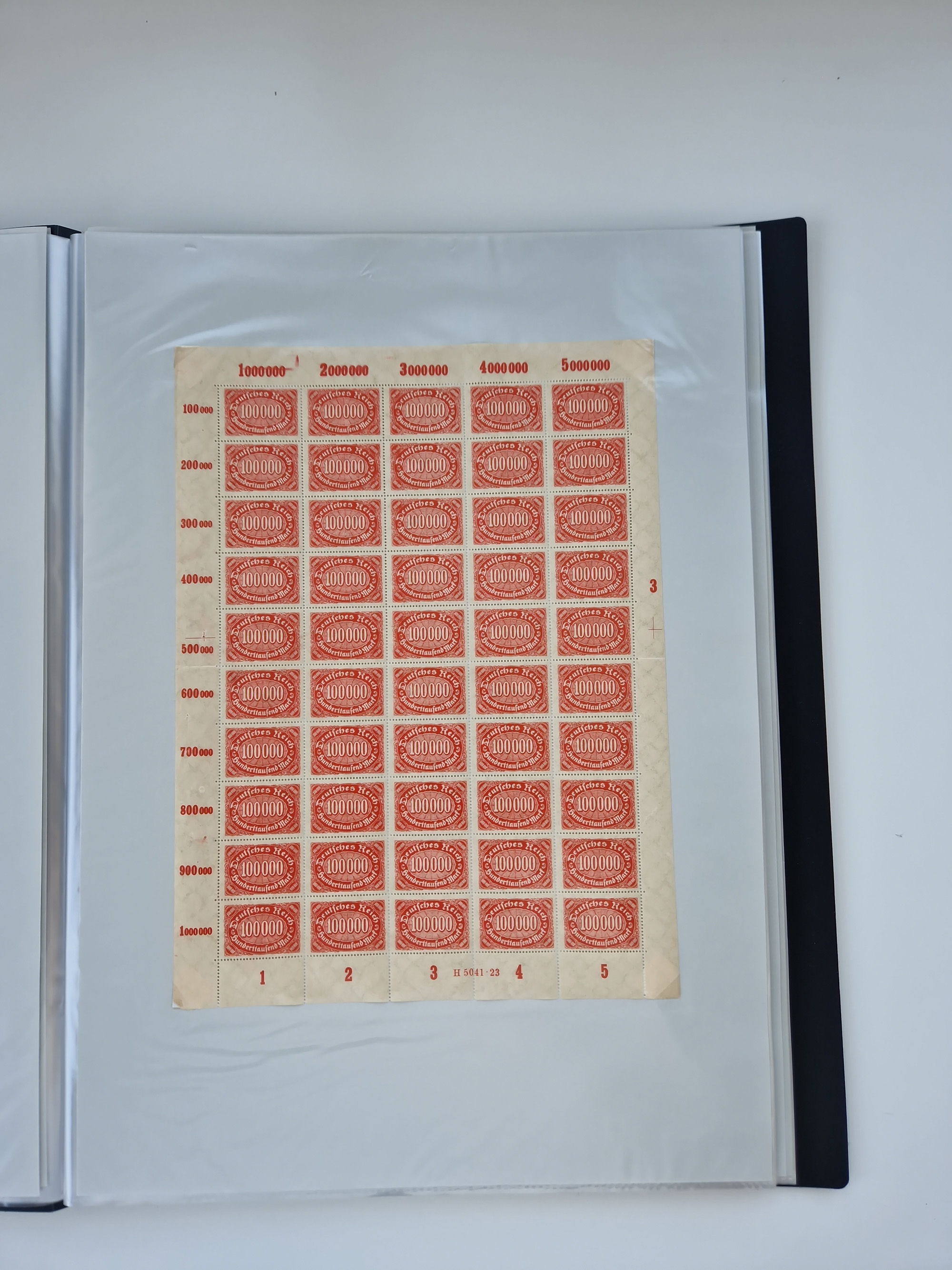 1920, postfrischer Bestand Germania 1.25 auf 1M. (2), 1.5 auf 1 M. (2) sowie 2.5 auf 2 M. (1), in kompletten Bögen, postfrisch, teils gefaltet mit Randfehlern (Mi.-Nr. 116-118)