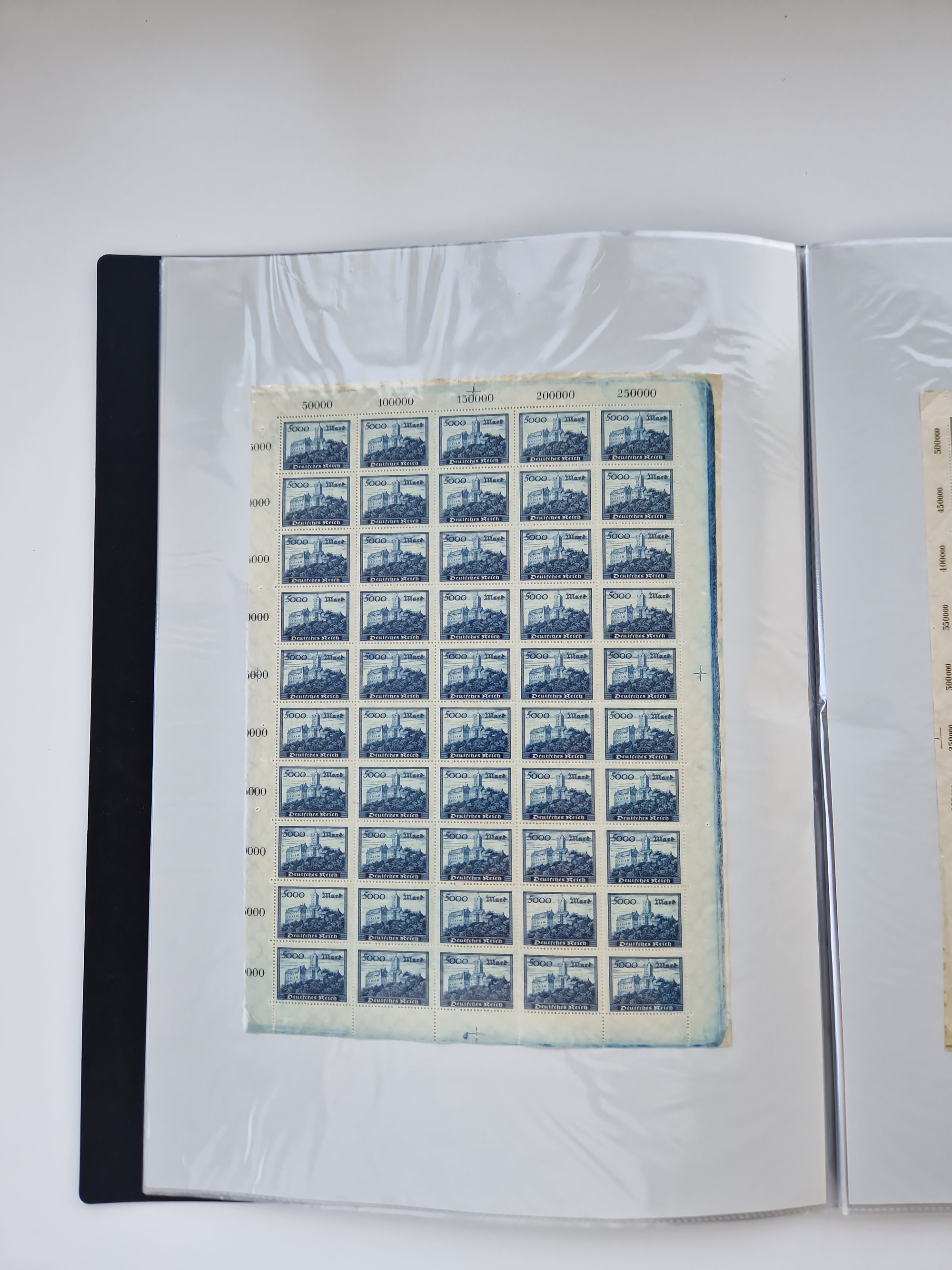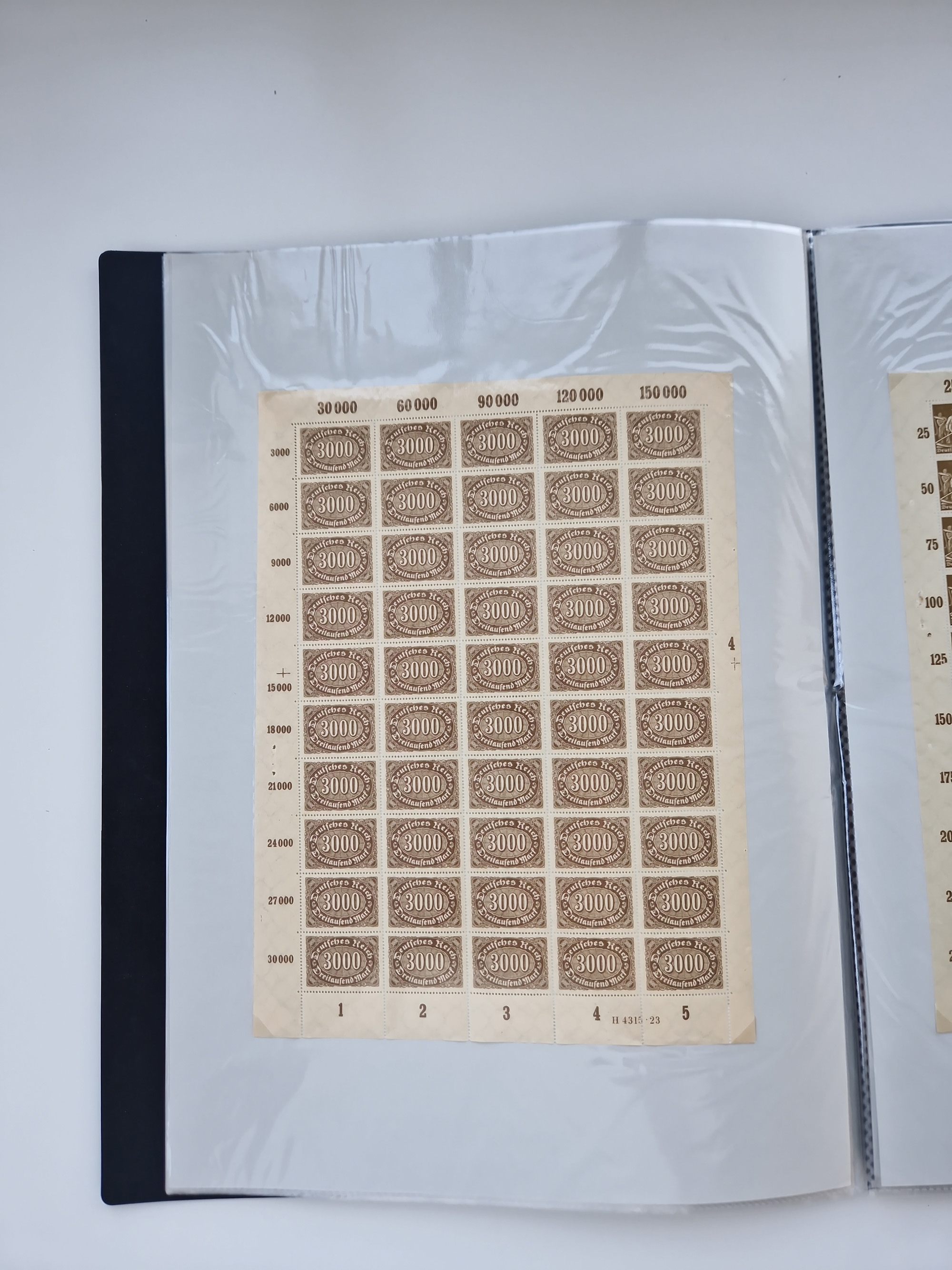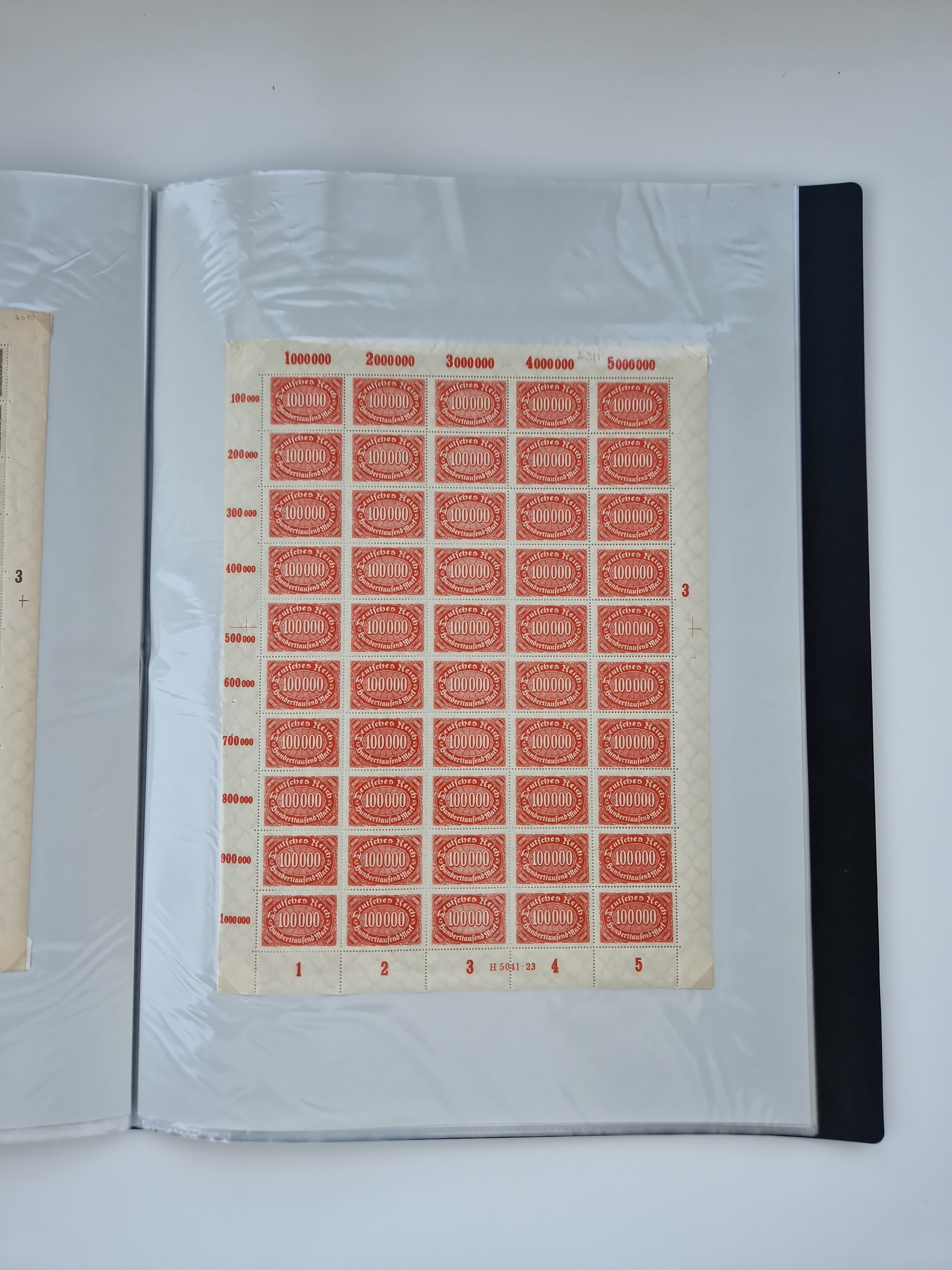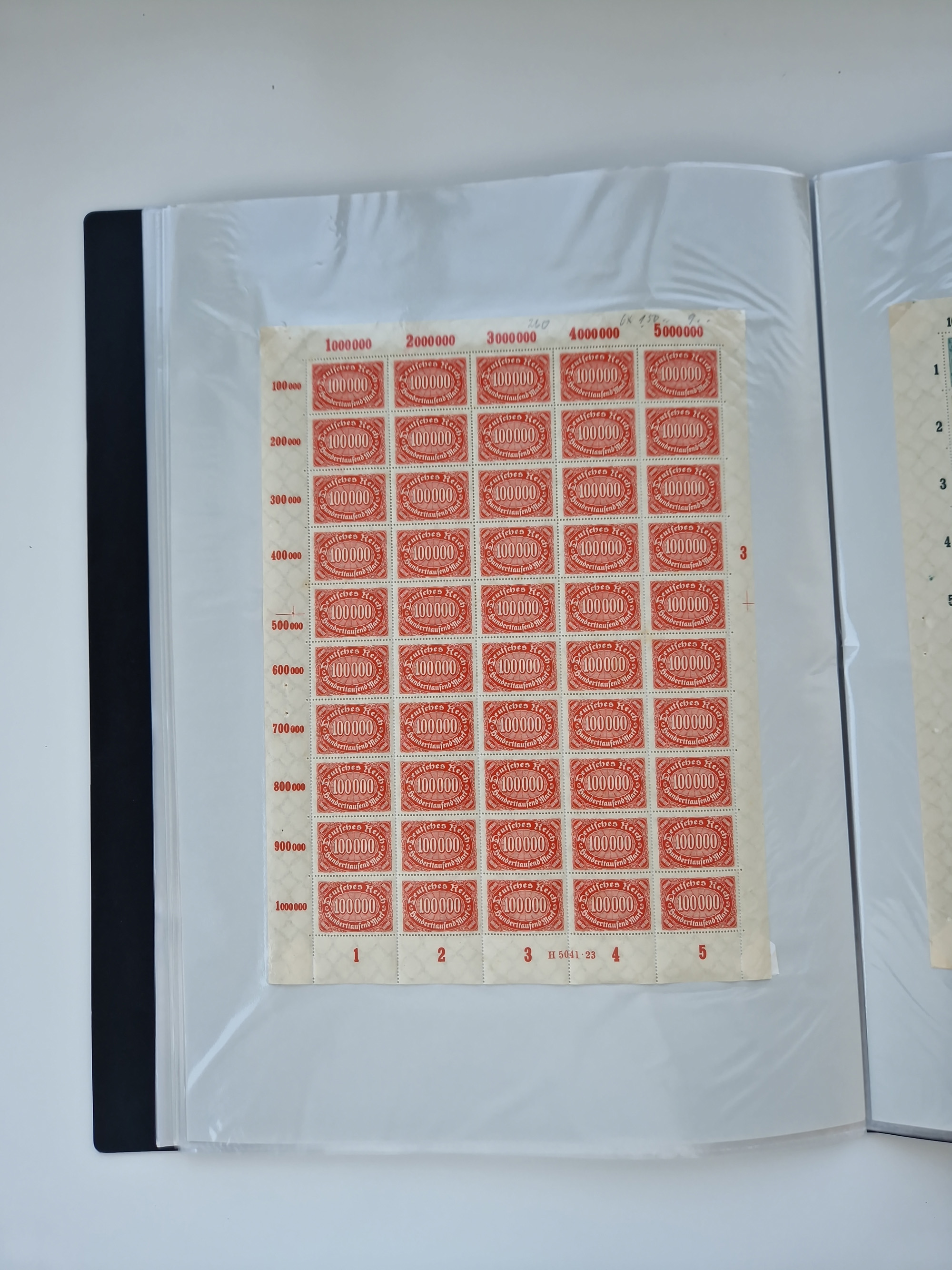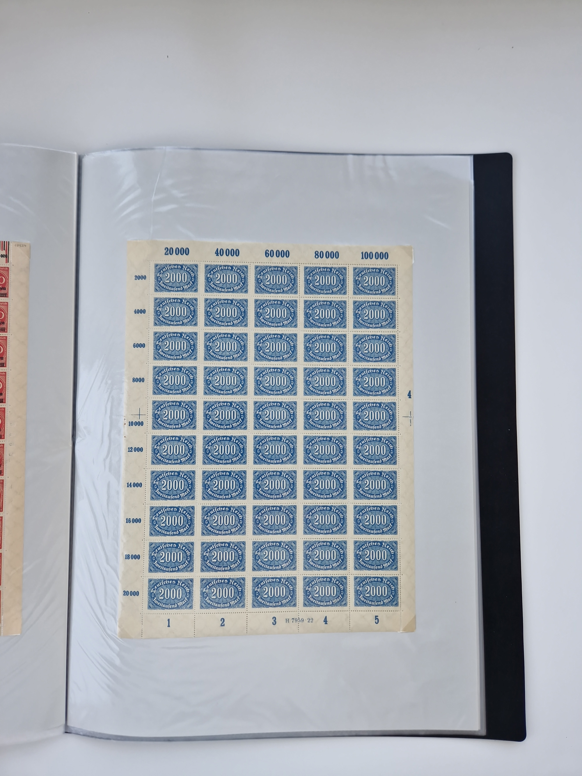 1920, postfrischer Bestand Germania 1.25 auf 1M. (2), 1.5 auf 1 M. (2) sowie 2.5 auf 2 M. (1), in kompletten Bögen, postfrisch, teils gefaltet mit Randfehlern (Mi.-Nr. 116-118)