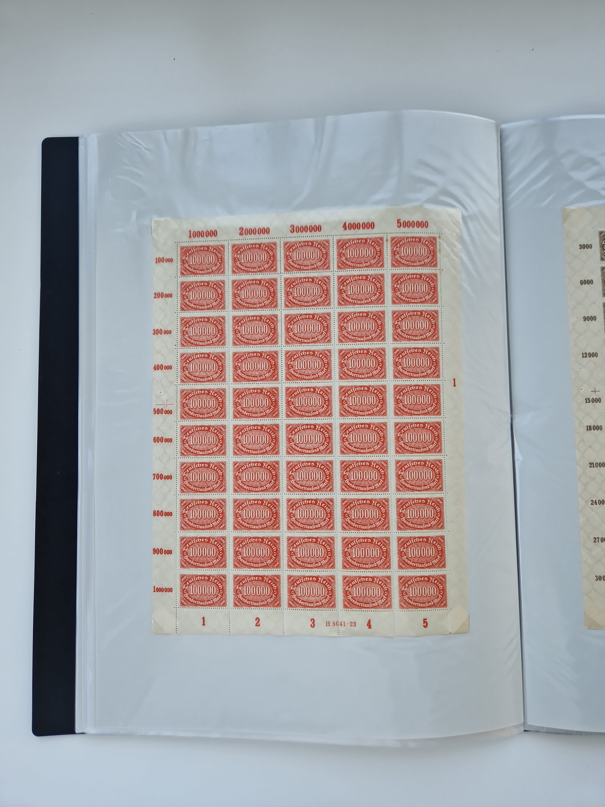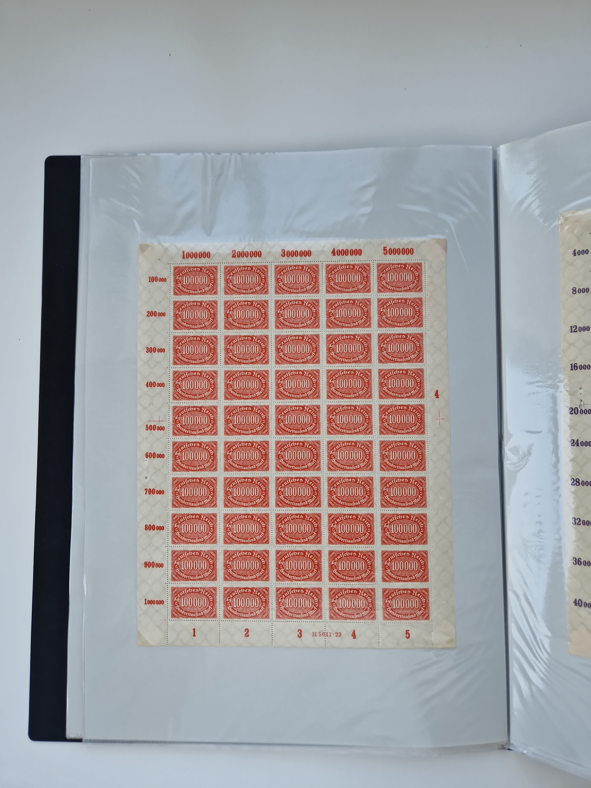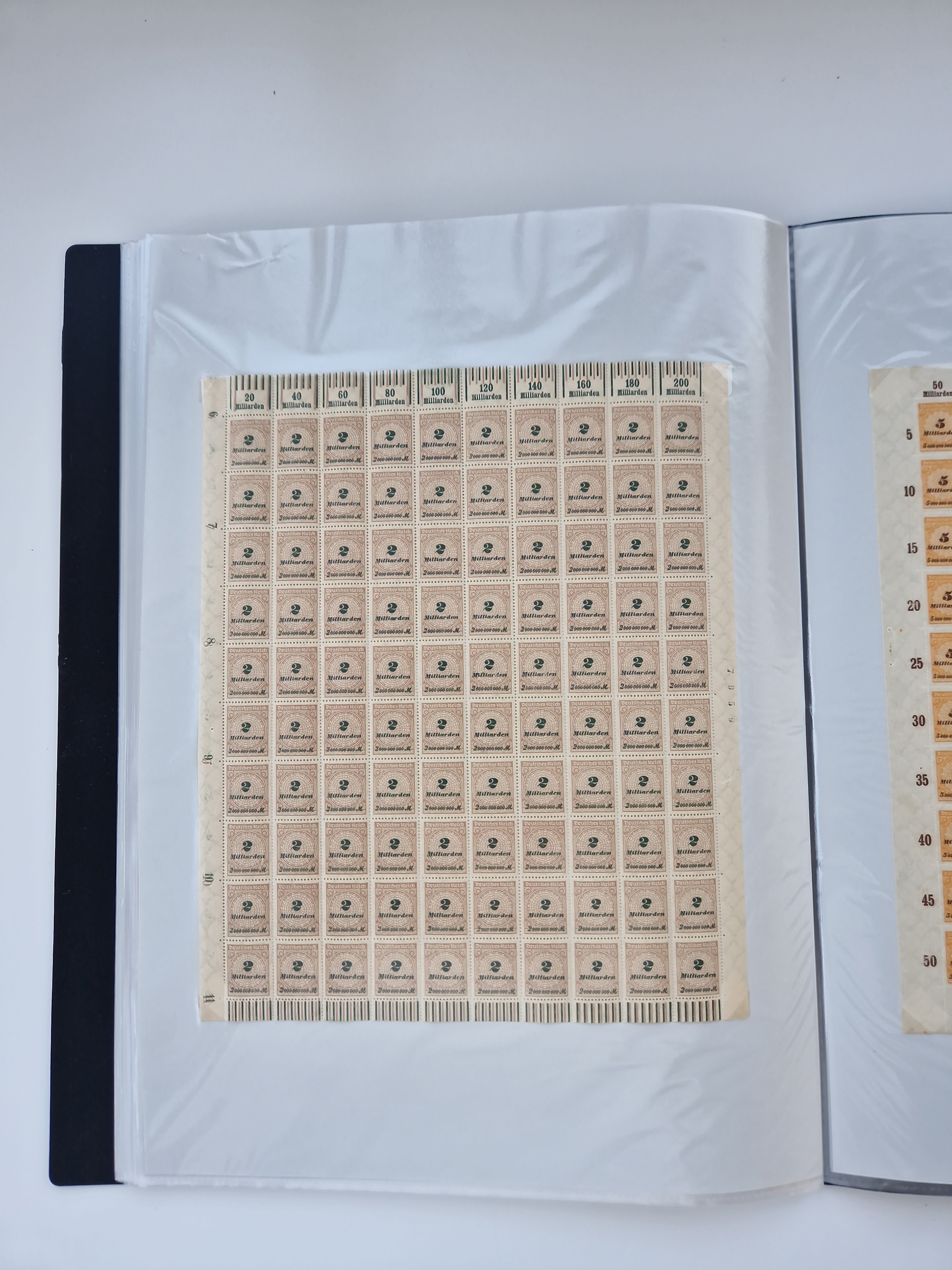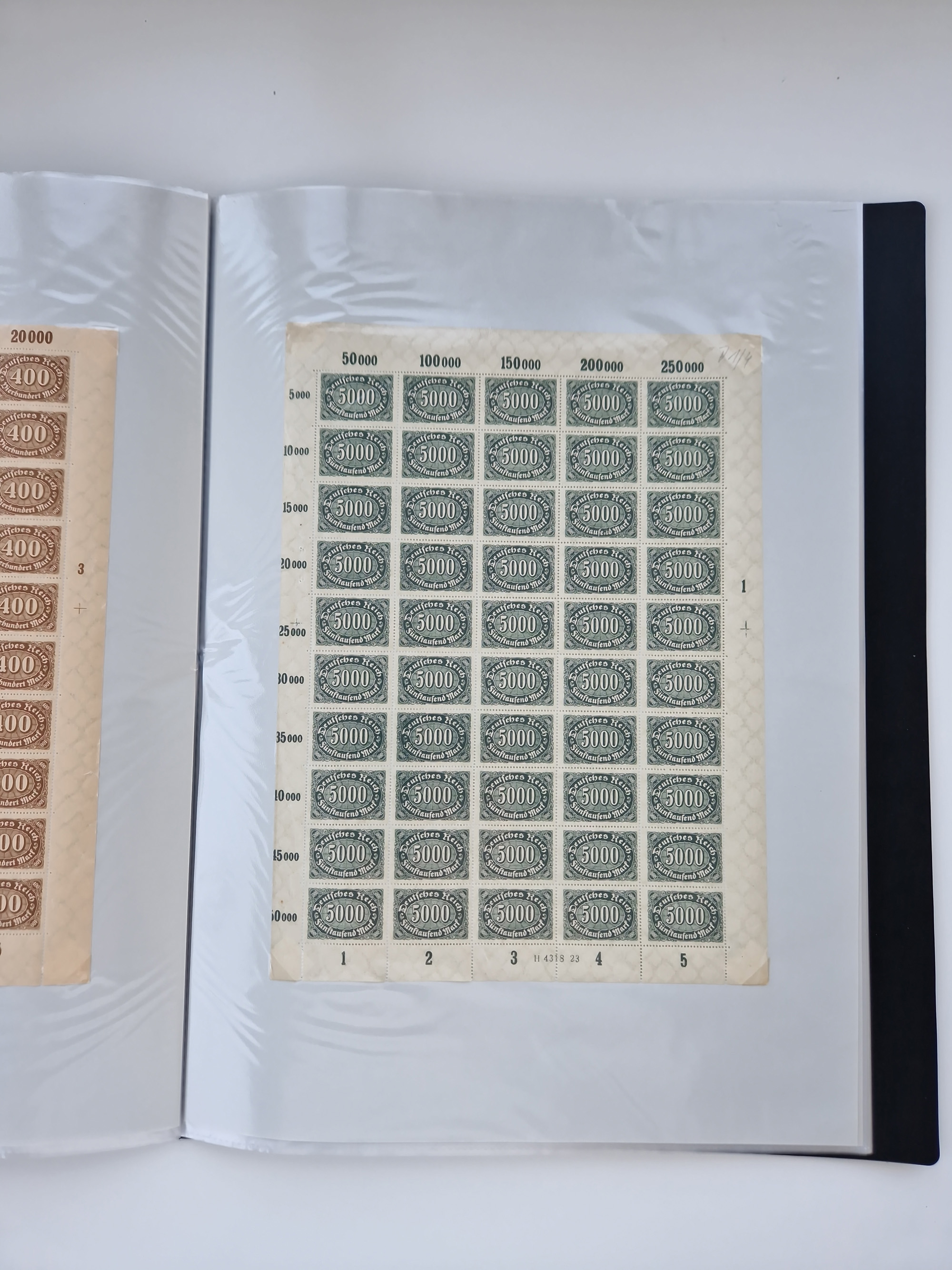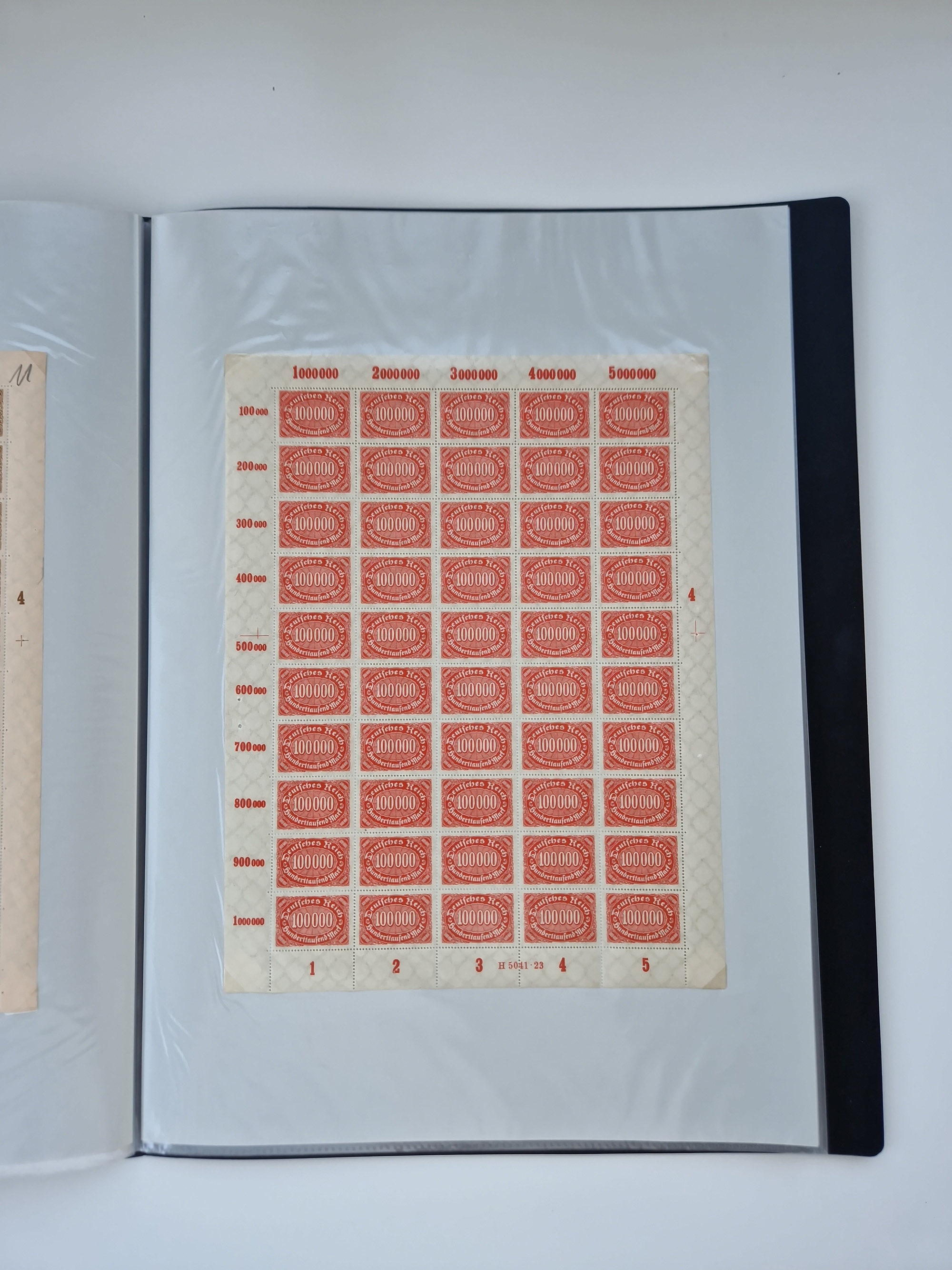 1920, postfrischer Bestand Germania 1.25 auf 1M. (2), 1.5 auf 1 M. (2) sowie 2.5 auf 2 M. (1), in kompletten Bögen, postfrisch, teils gefaltet mit Randfehlern (Mi.-Nr. 116-118)