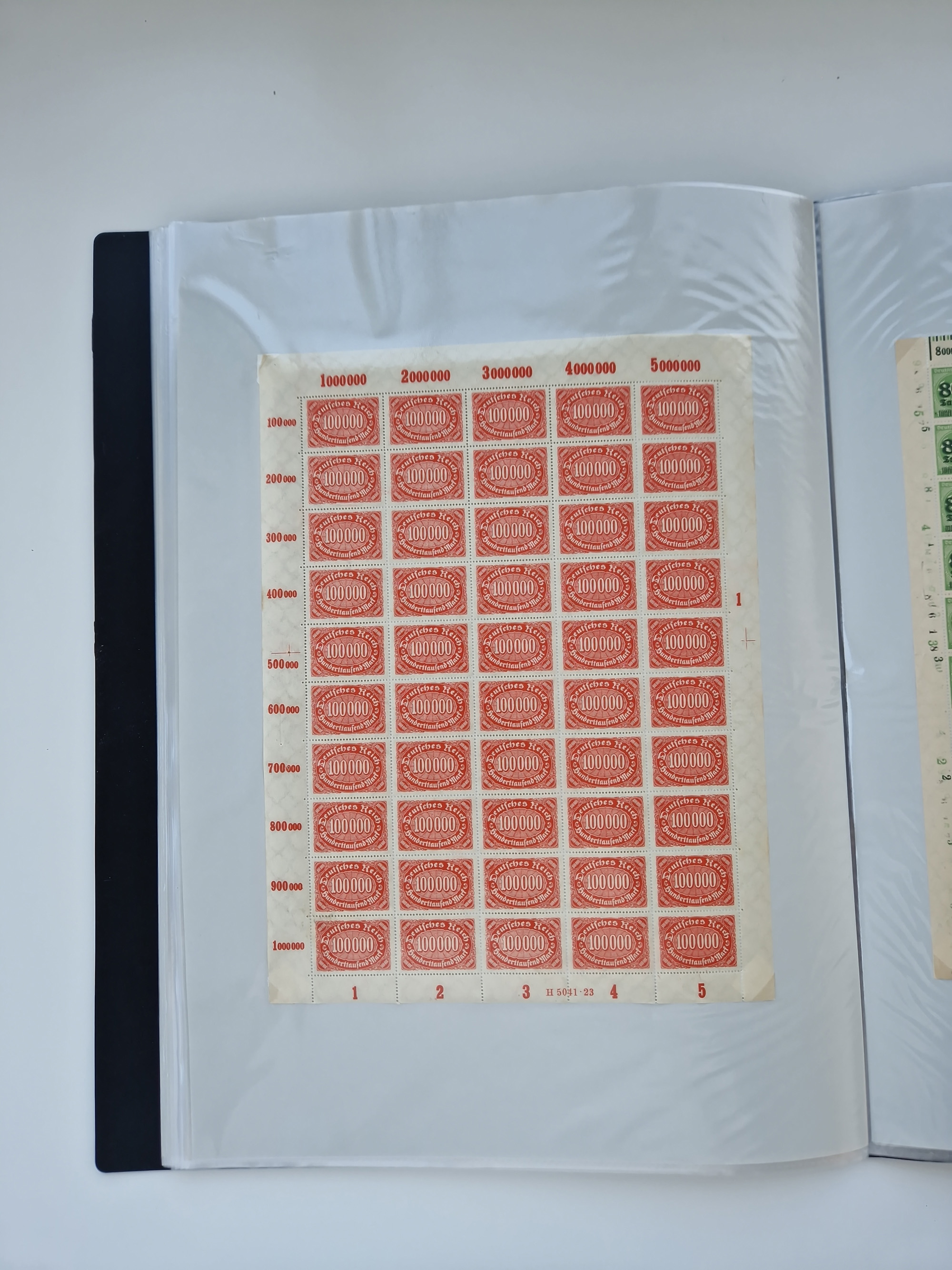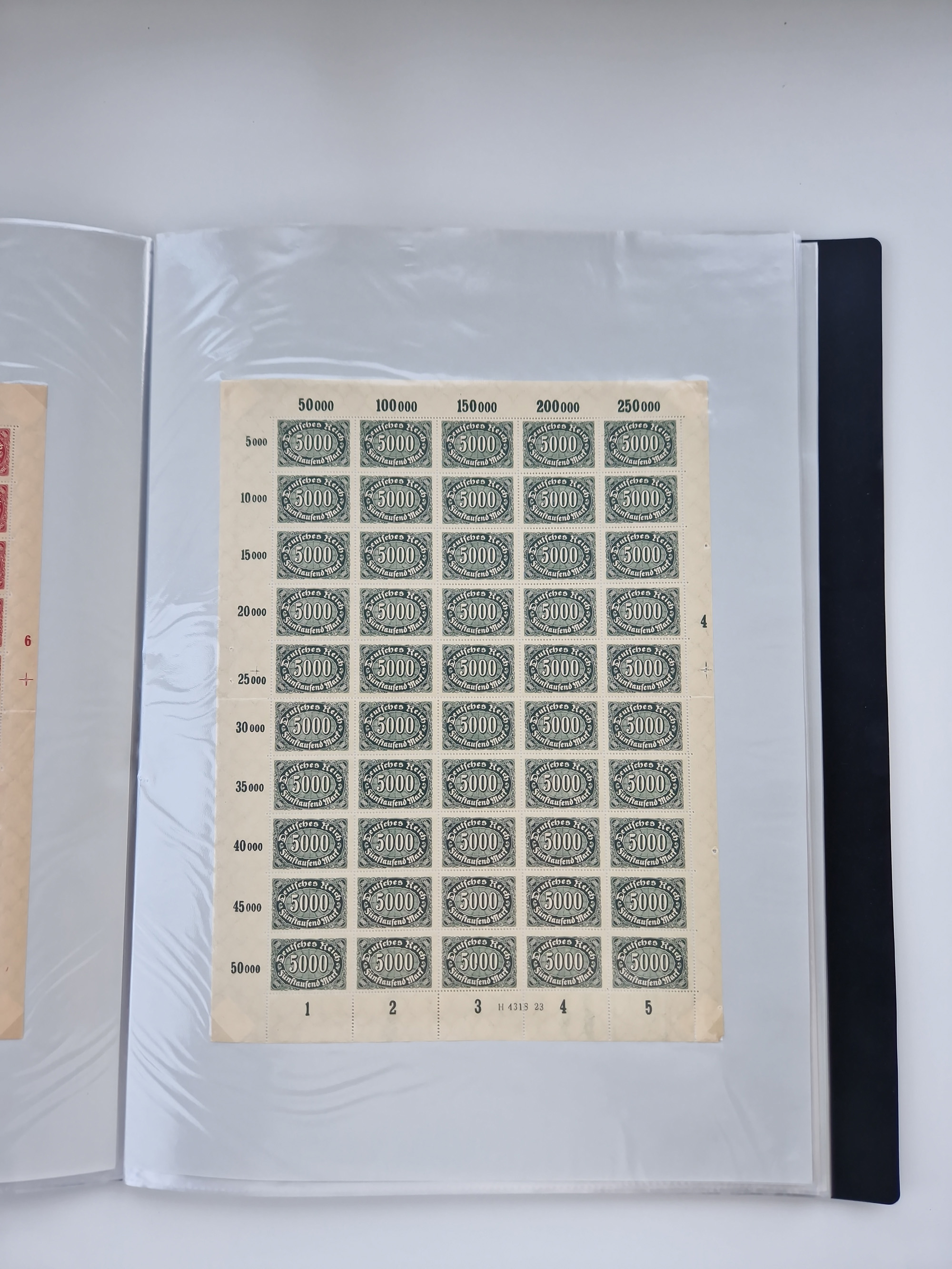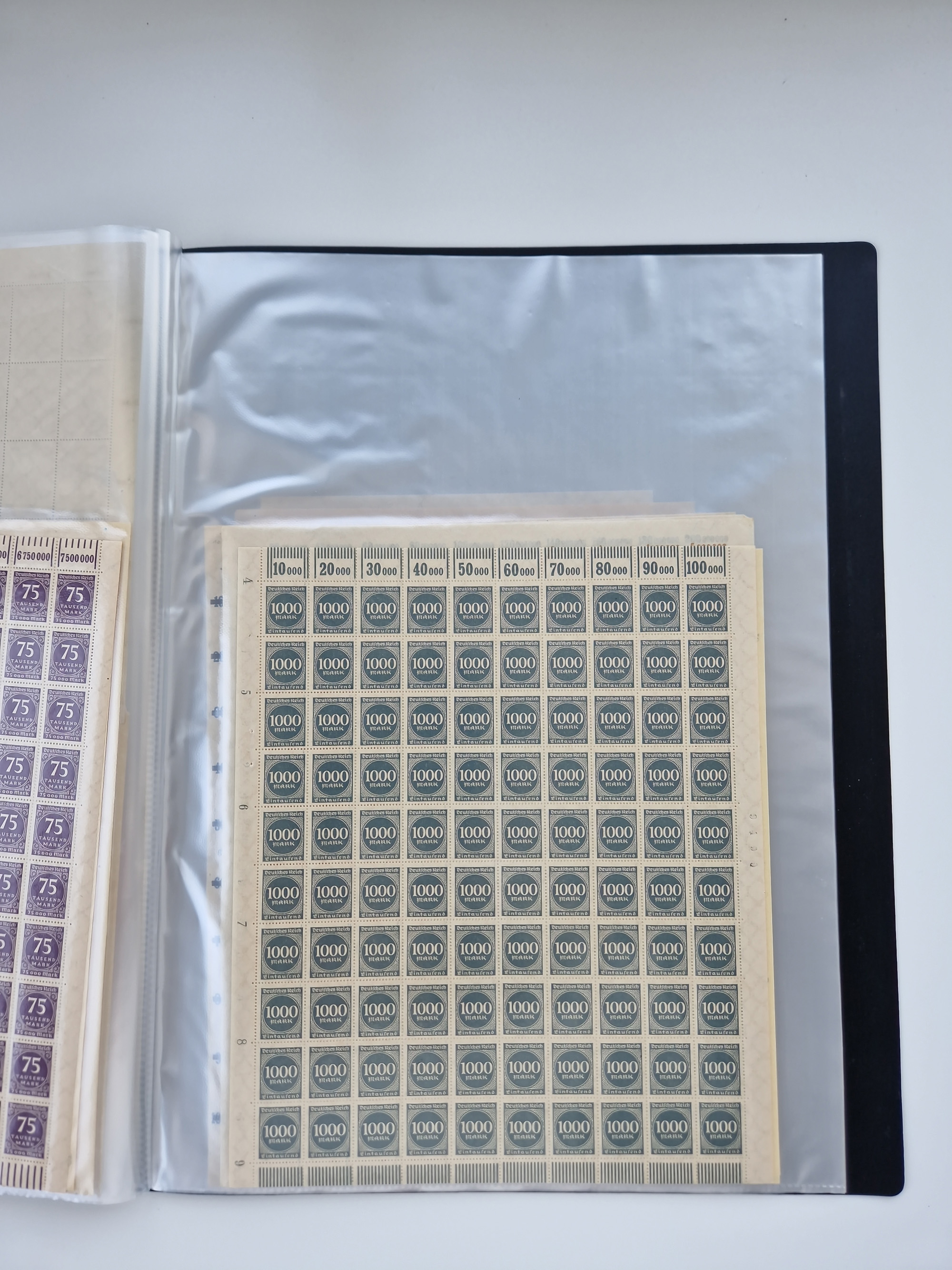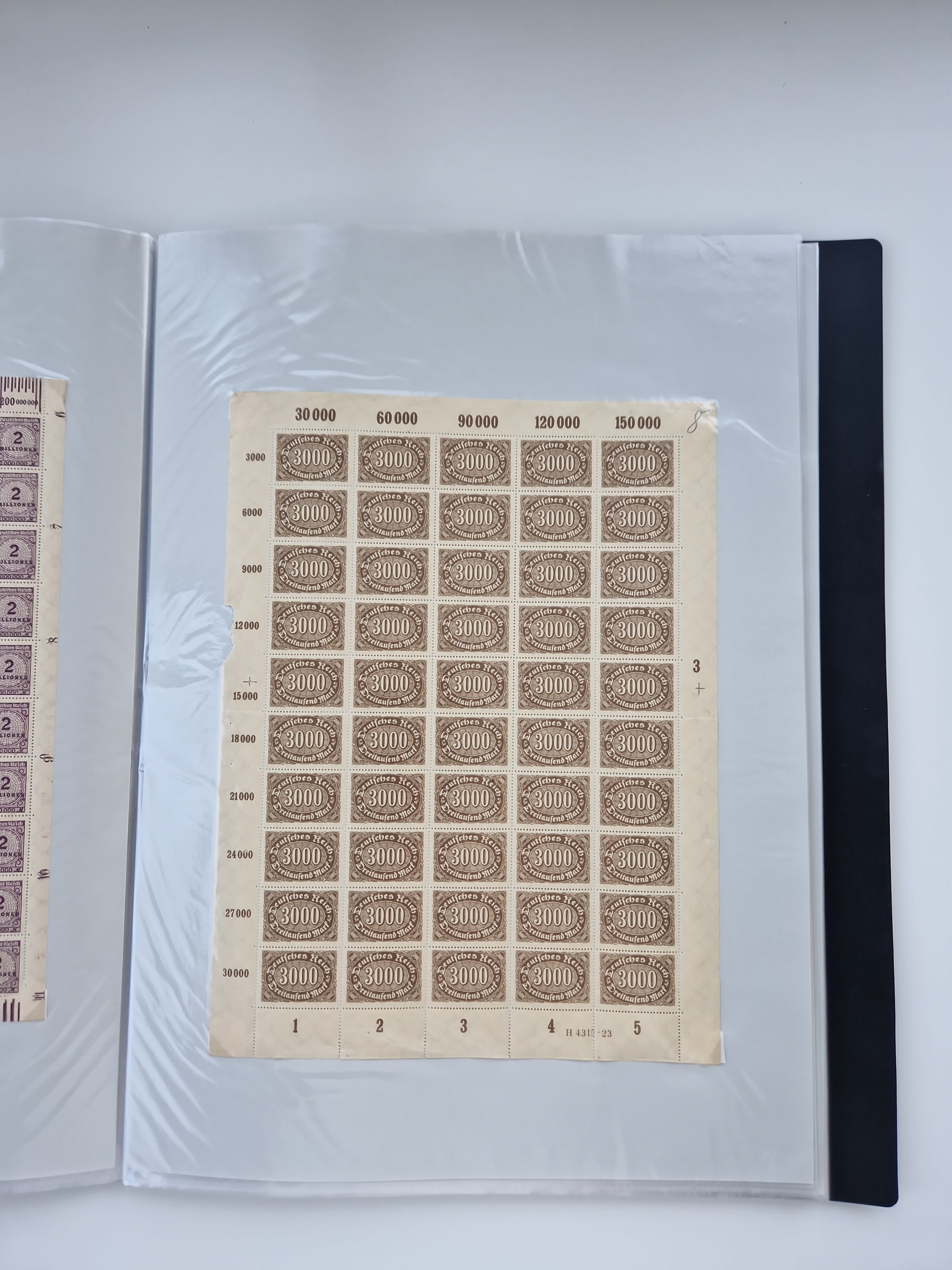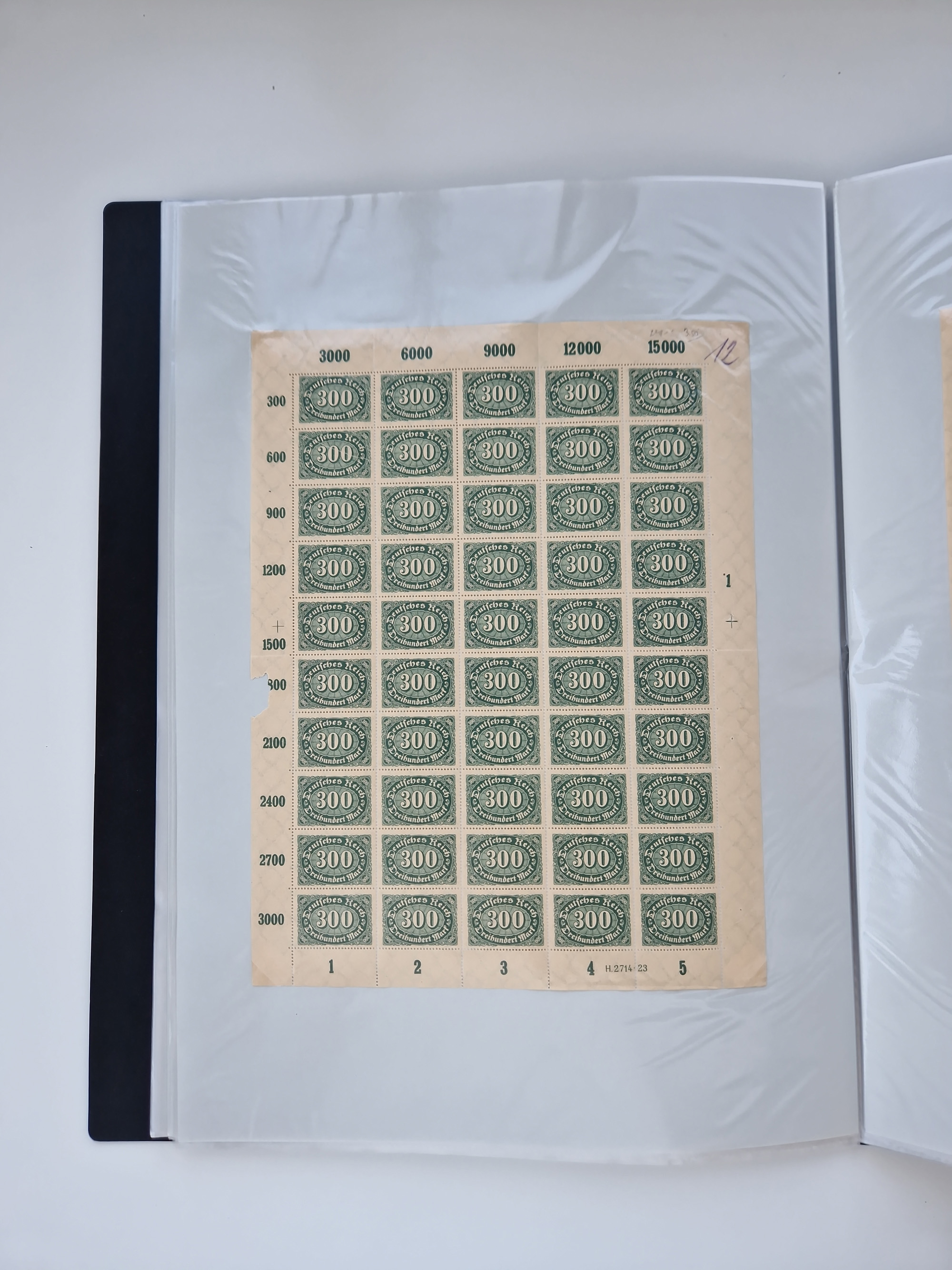 1920, postfrischer Bestand Germania 1.25 auf 1M. (2), 1.5 auf 1 M. (2) sowie 2.5 auf 2 M. (1), in kompletten Bögen, postfrisch, teils gefaltet mit Randfehlern (Mi.-Nr. 116-118)