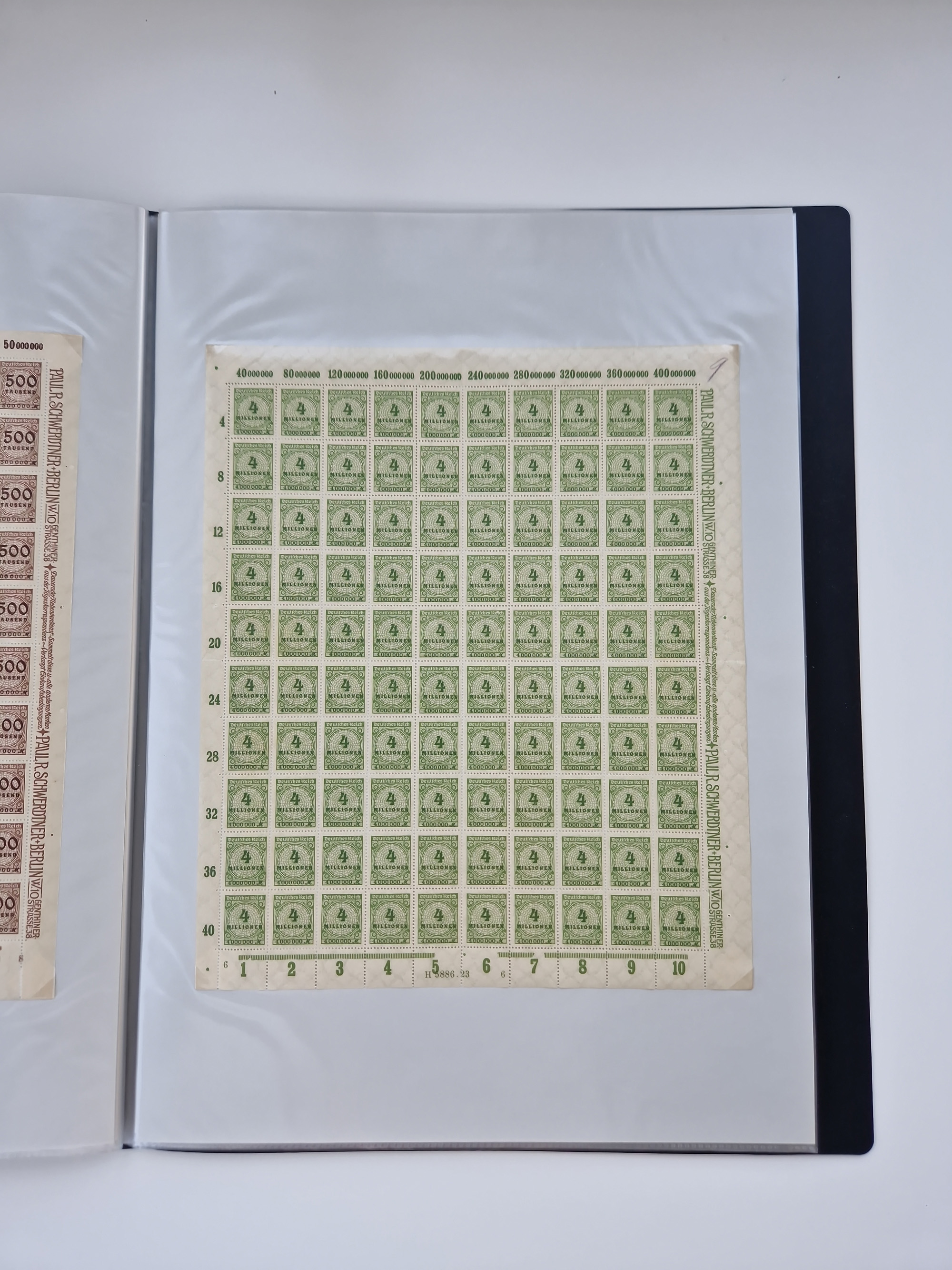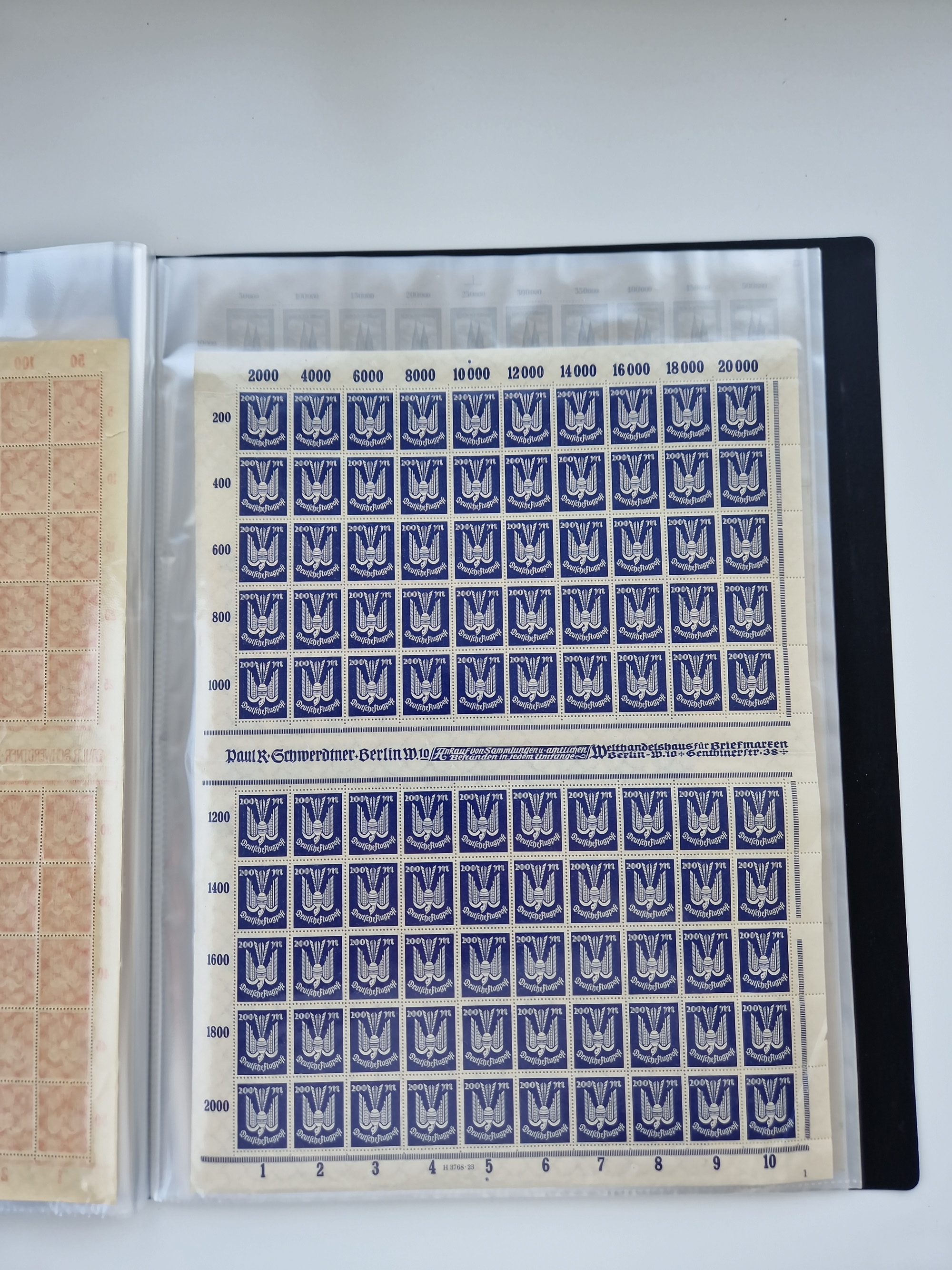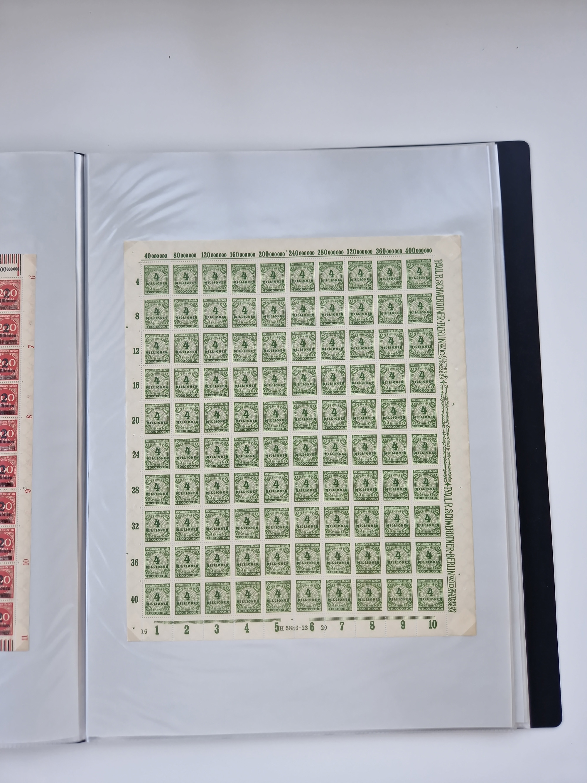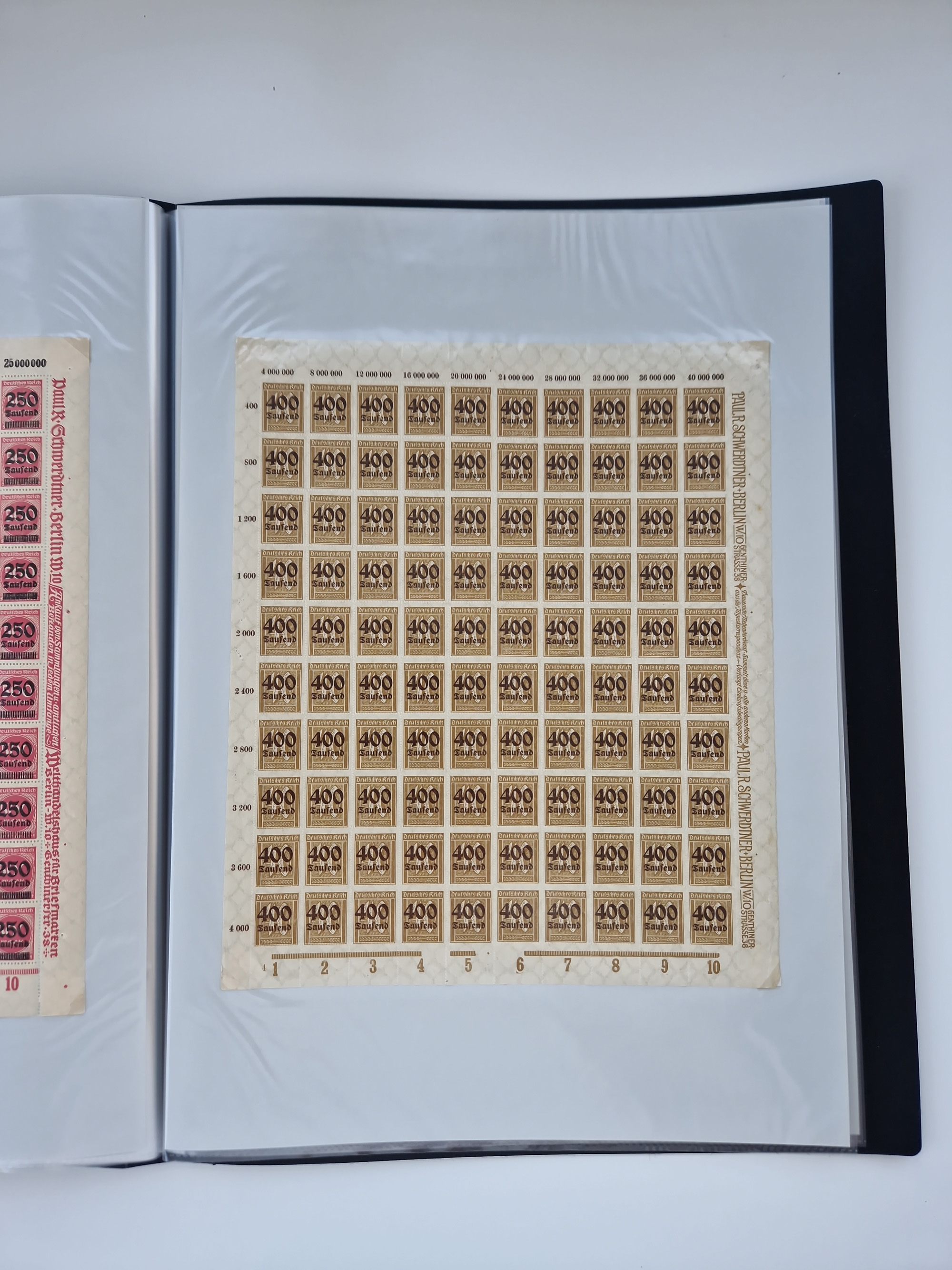1919/32, meist postfrische Sammlung im Lindner-Falzlosalbum komplett mit vielen Besonderheiten. Infla mit vielen Farben und ungezähnten Marken. Weimar mit Mi. 339 ohne Wertziffer Befund Schlegel BPP, Mi. 344-350 Viererblocksatz meist postfrisch, Attest A. Schlegel BPP, Mi. 401X im 6er-Block postfrisch mit HAN in braun und gelb, Attest Dr. Oechsner BPP, Mi. 407-409 Viererblocksatz postfrisch, Attest Oechsner BPP, Mi. 434I postfrisch Attest A. Schlegel BPP, Mi. 397 postfrisch Befund H-D-Schlegel BPP, Zeppelinmarken ungebraucht