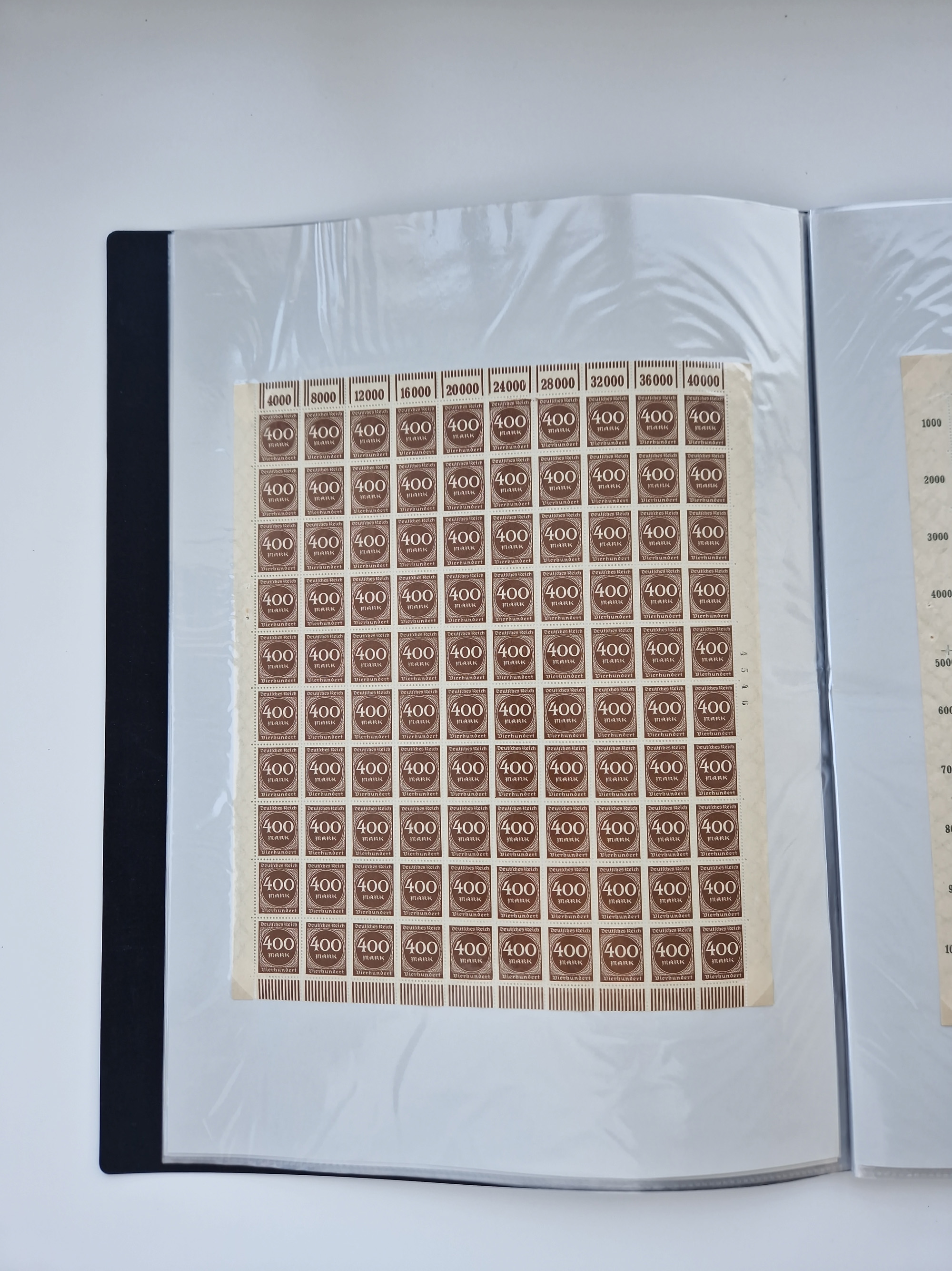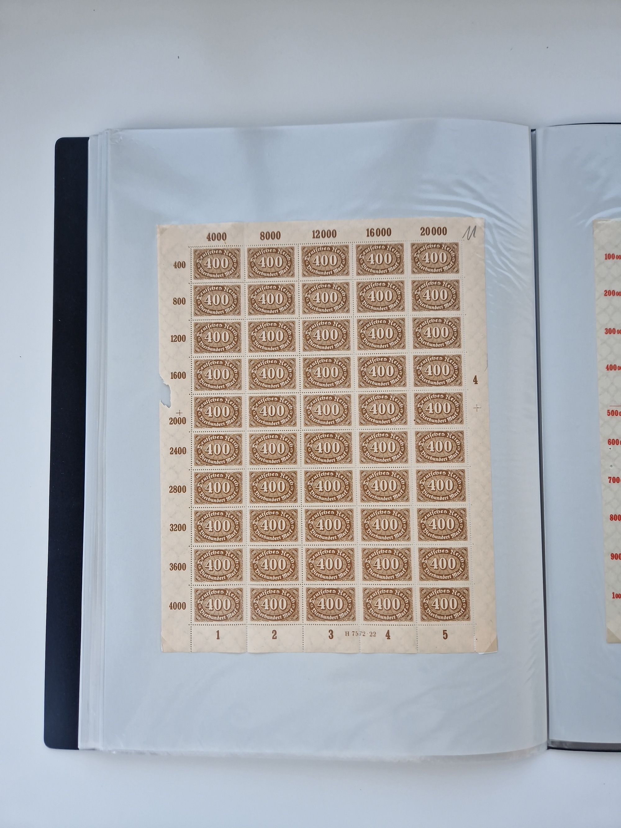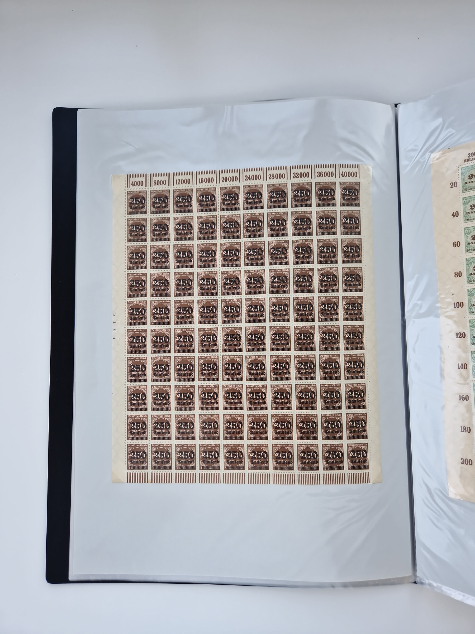 1920, Abschiedsserie 5 Pfg.-20 M., im kpl. Bogensatz, dabei auch Marken mit Plattenfehlern und Leerfeldern, meist postfrisch, teils angetrennt und meist in guter Erhaltung, teils mit Eigentümerzeichen oder Bleistift im Rand, im Album (Mi.-Nr. 119-38I)