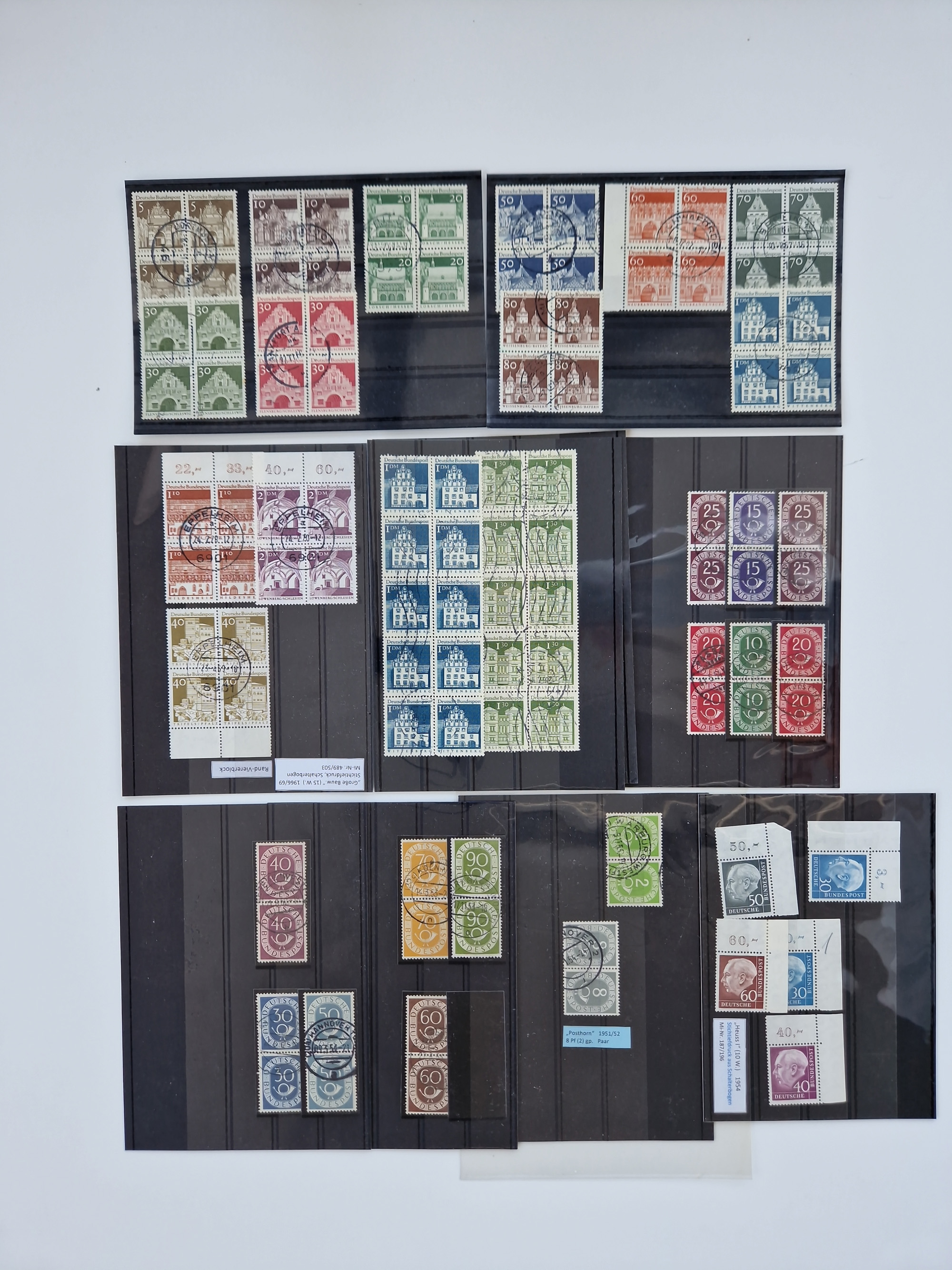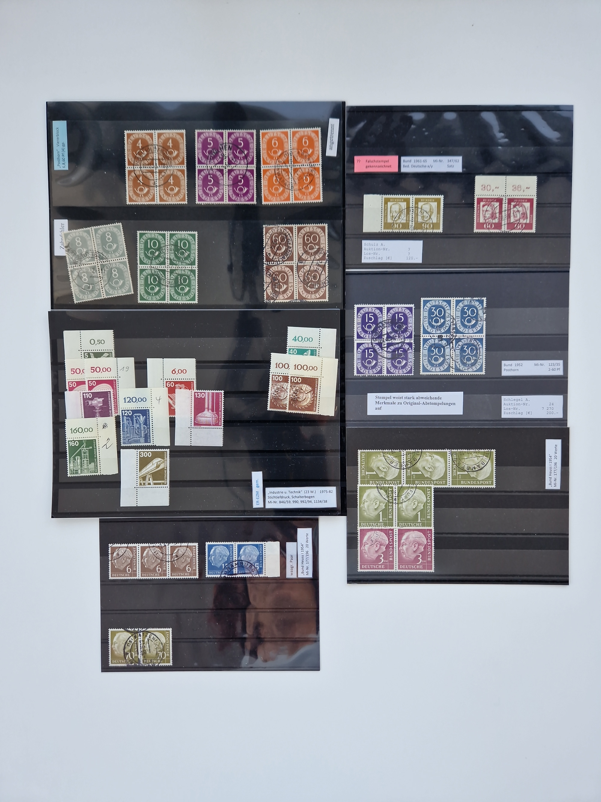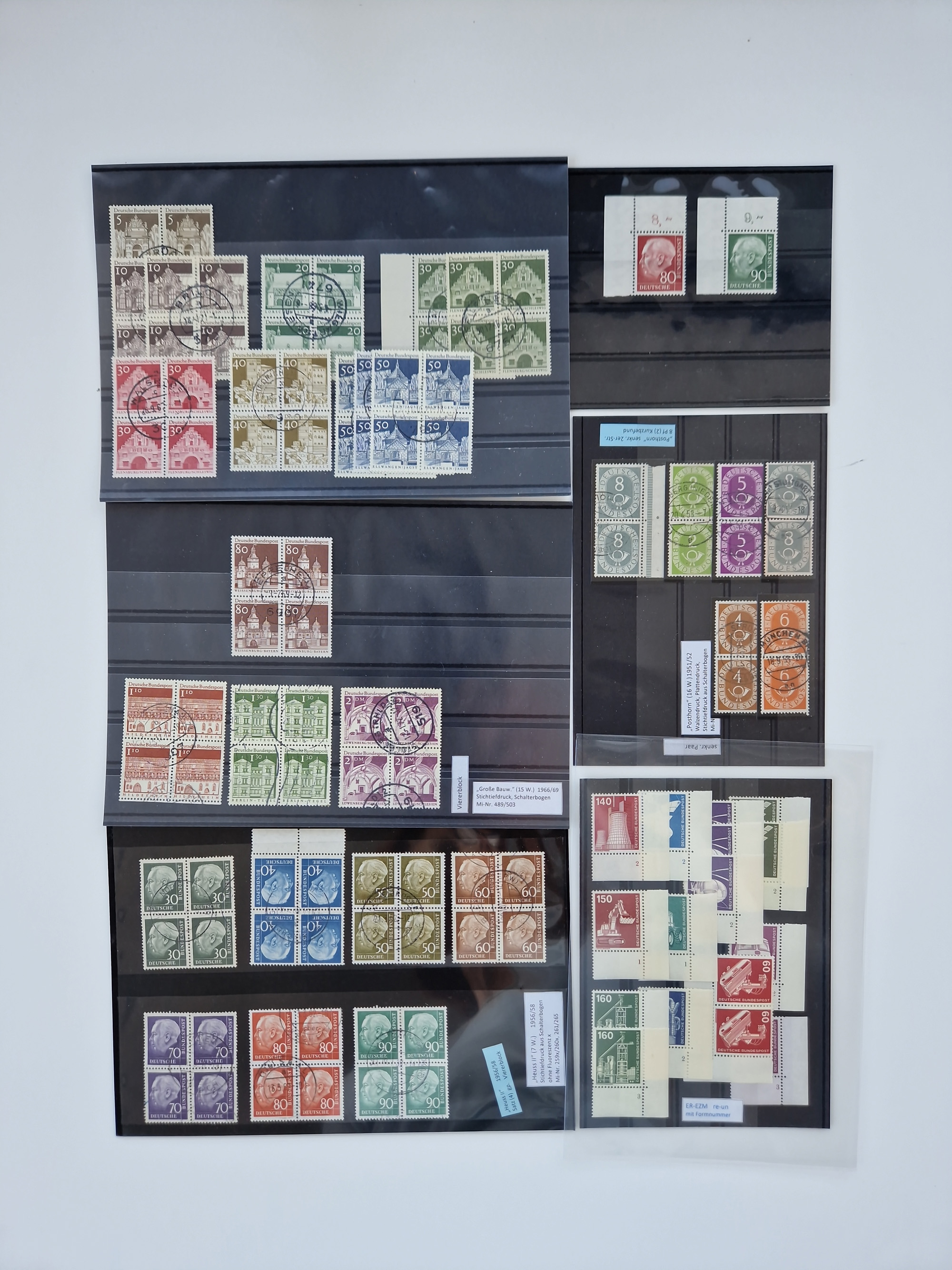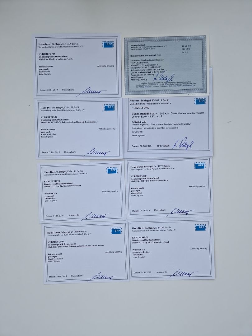 1951/2023, reichhaltiger postfrischer/ungebrauchter und gestempelter Sammlungsbestand mit Viererblocks, Bogenecken, Oberrandstücken, Fo.-Nr., Pl.-Nr., waagerechten Paaren ab Posthorn, dabei u.a. Posthorn in Viererblocks ohne 25, 70 und 80 Pfg. kpl., (90 Pfg. FA Schlegel BPP), sowie in waagerechten Paaren bis auf 80 Pfg. kpl., Mi.-Nr. 191 und 192 in 6er-Blocks, 259x 4er-Bl., 305 waagr. Paar, 306 Eckr.-4er-Bl., Heuss teils in 4er, 6er und 10er-Blocks, Heuss Lumogen Eckrand-4er-Blocksatz postfrisch, Bedeutende Deutsche ZD, etc. etc., sowie einige Briefe mit interessanten MeF, Einheiten und FDC, etliches mehrfach und teils auf Loskarten, vieles signiert sowie 4 Atteste und 58 (Kurz-)Befunde Schlegel BPP, gute Erhaltung, in zwei Kartons