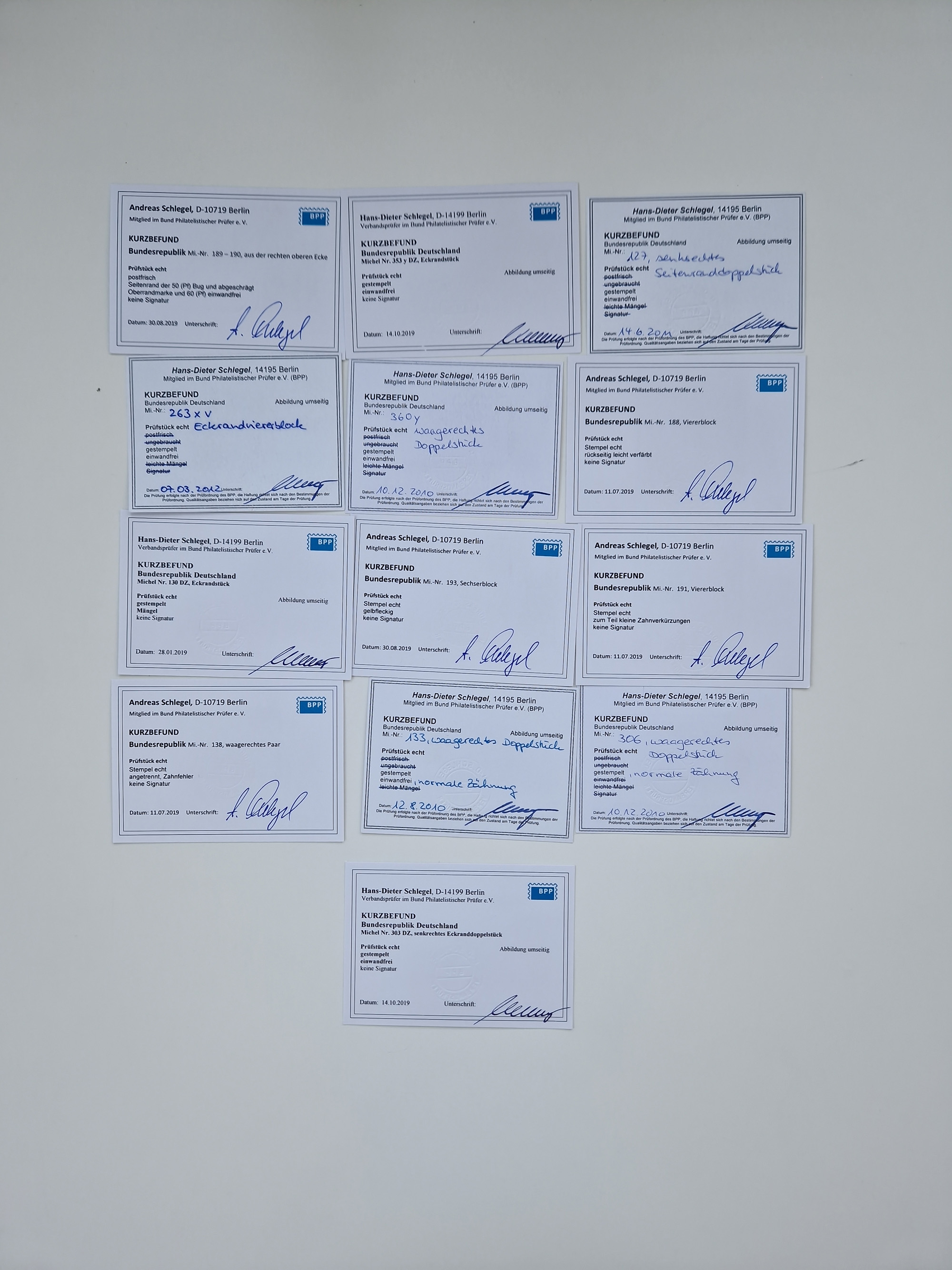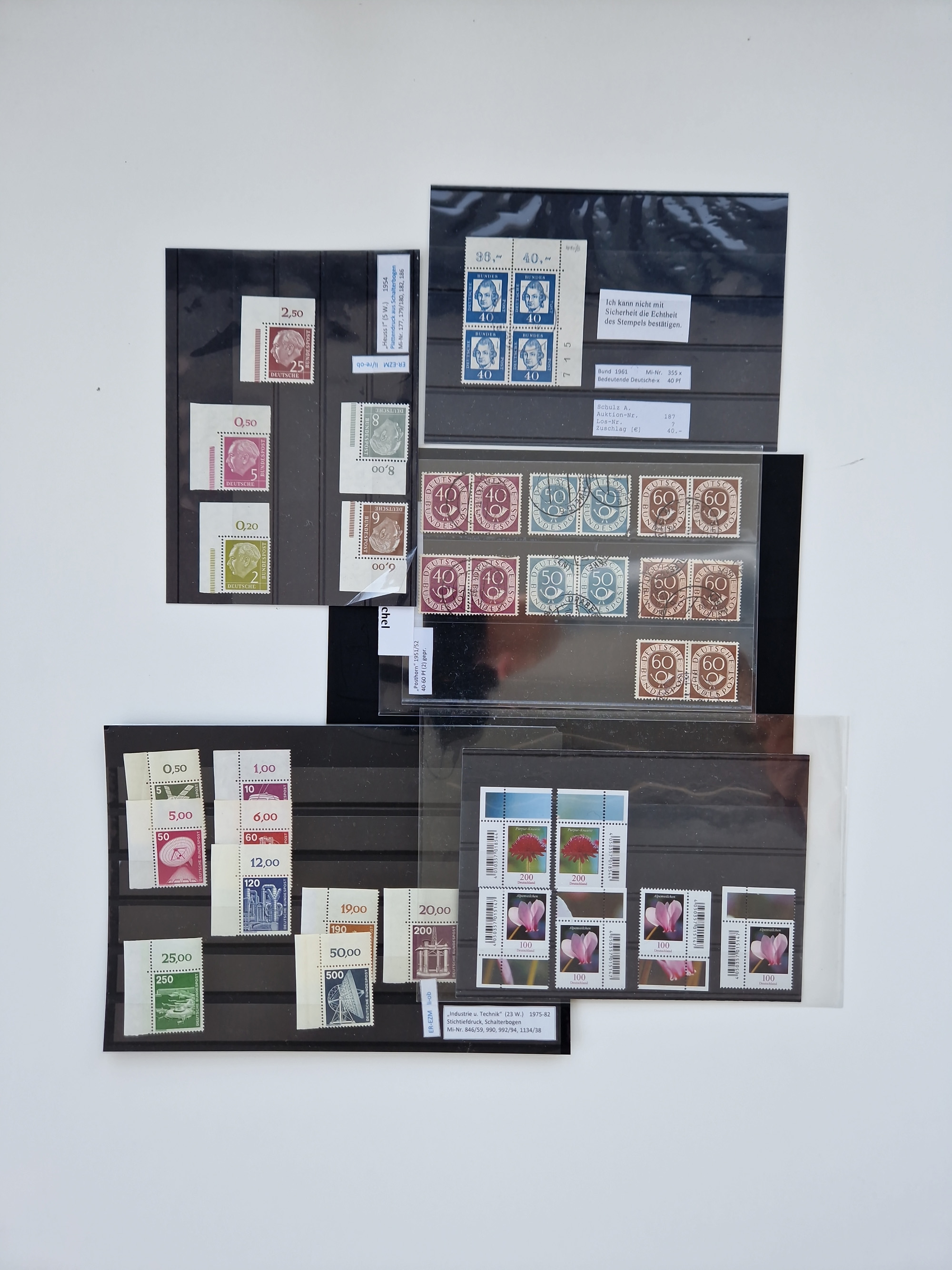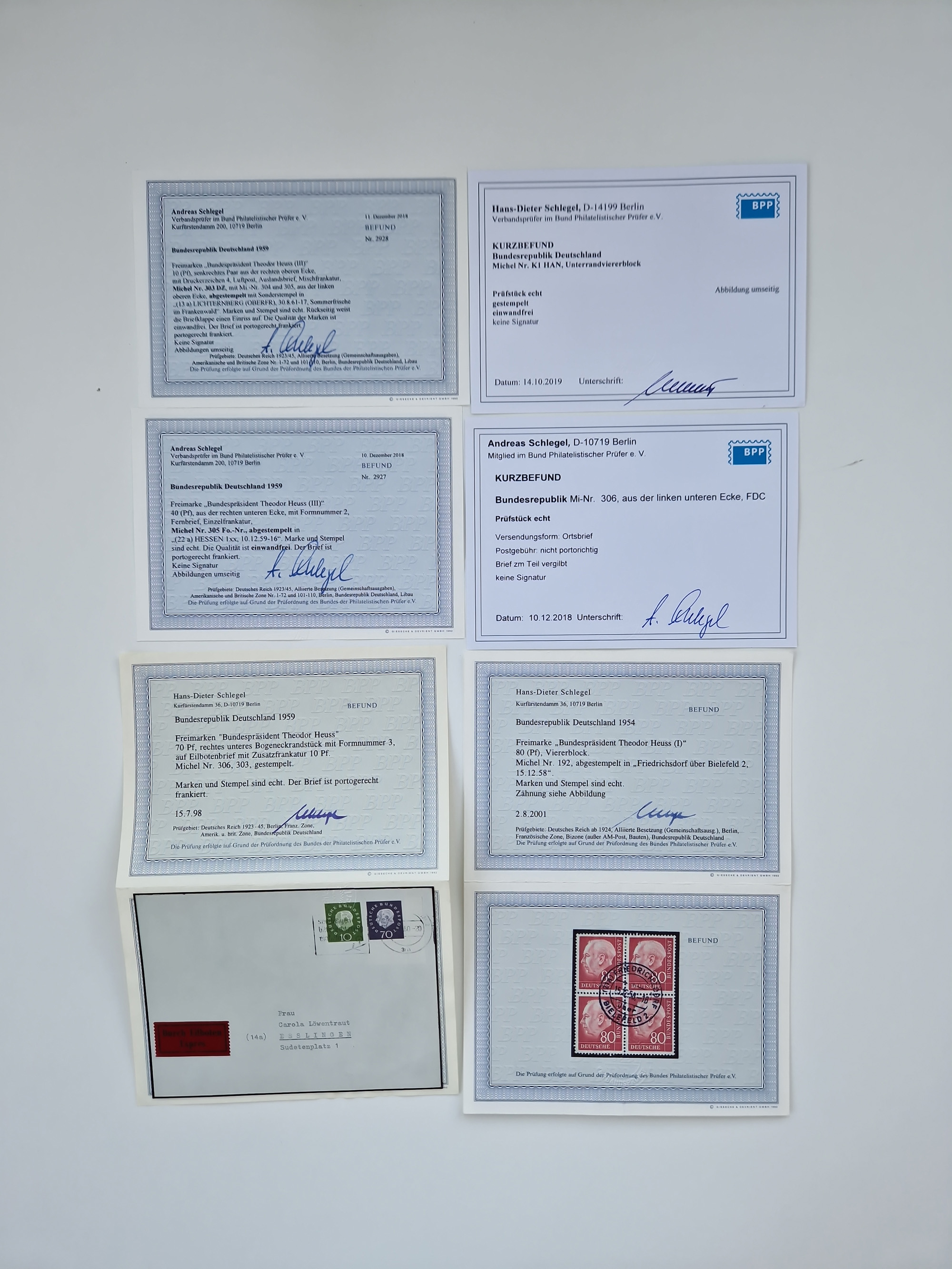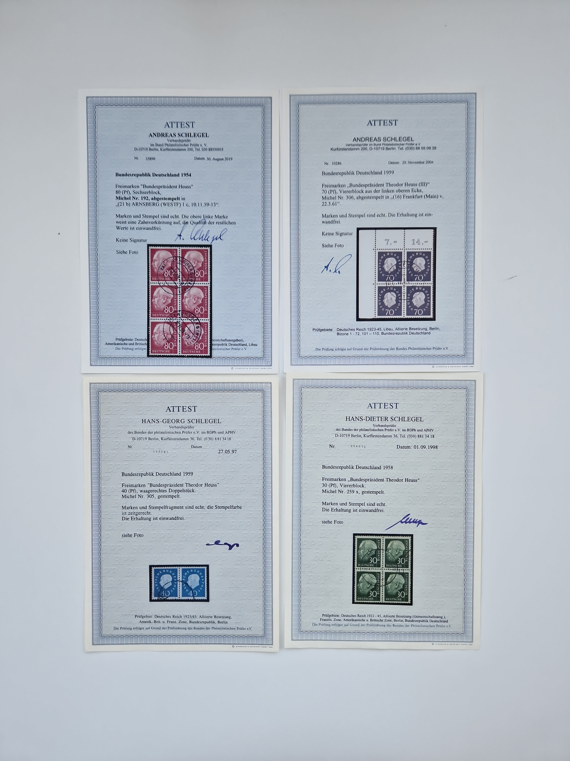 1951/2023, reichhaltiger postfrischer/ungebrauchter und gestempelter Sammlungsbestand mit Viererblocks, Bogenecken, Oberrandstücken, Fo.-Nr., Pl.-Nr., waagerechten Paaren ab Posthorn, dabei u.a. Posthorn in Viererblocks ohne 25, 70 und 80 Pfg. kpl., (90 Pfg. FA Schlegel BPP), sowie in waagerechten Paaren bis auf 80 Pfg. kpl., Mi.-Nr. 191 und 192 in 6er-Blocks, 259x 4er-Bl., 305 waagr. Paar, 306 Eckr.-4er-Bl., Heuss teils in 4er, 6er und 10er-Blocks, Heuss Lumogen Eckrand-4er-Blocksatz postfrisch, Bedeutende Deutsche ZD, etc. etc., sowie einige Briefe mit interessanten MeF, Einheiten und FDC, etliches mehrfach und teils auf Loskarten, vieles signiert sowie 4 Atteste und 58 (Kurz-)Befunde Schlegel BPP, gute Erhaltung, in zwei Kartons