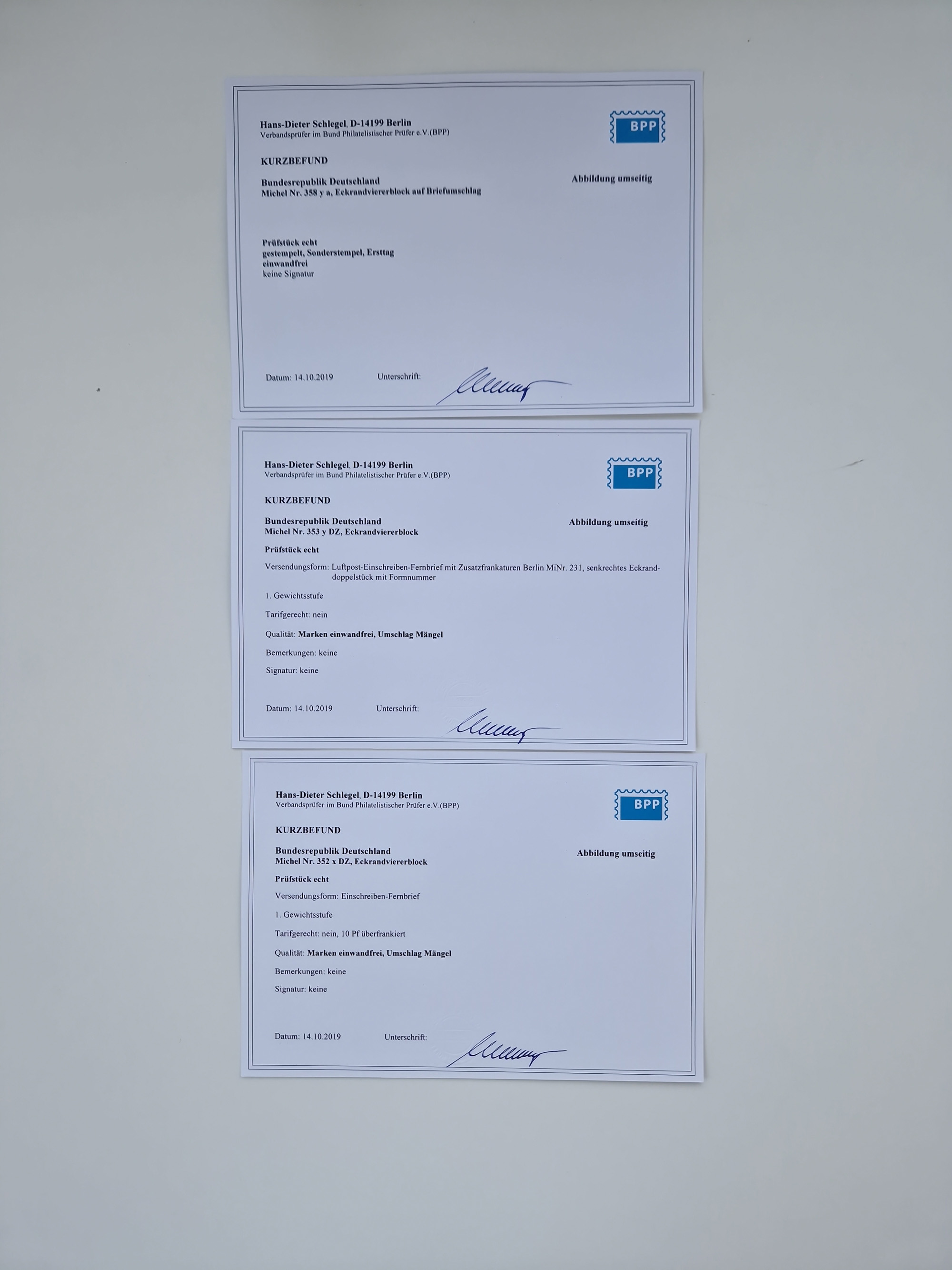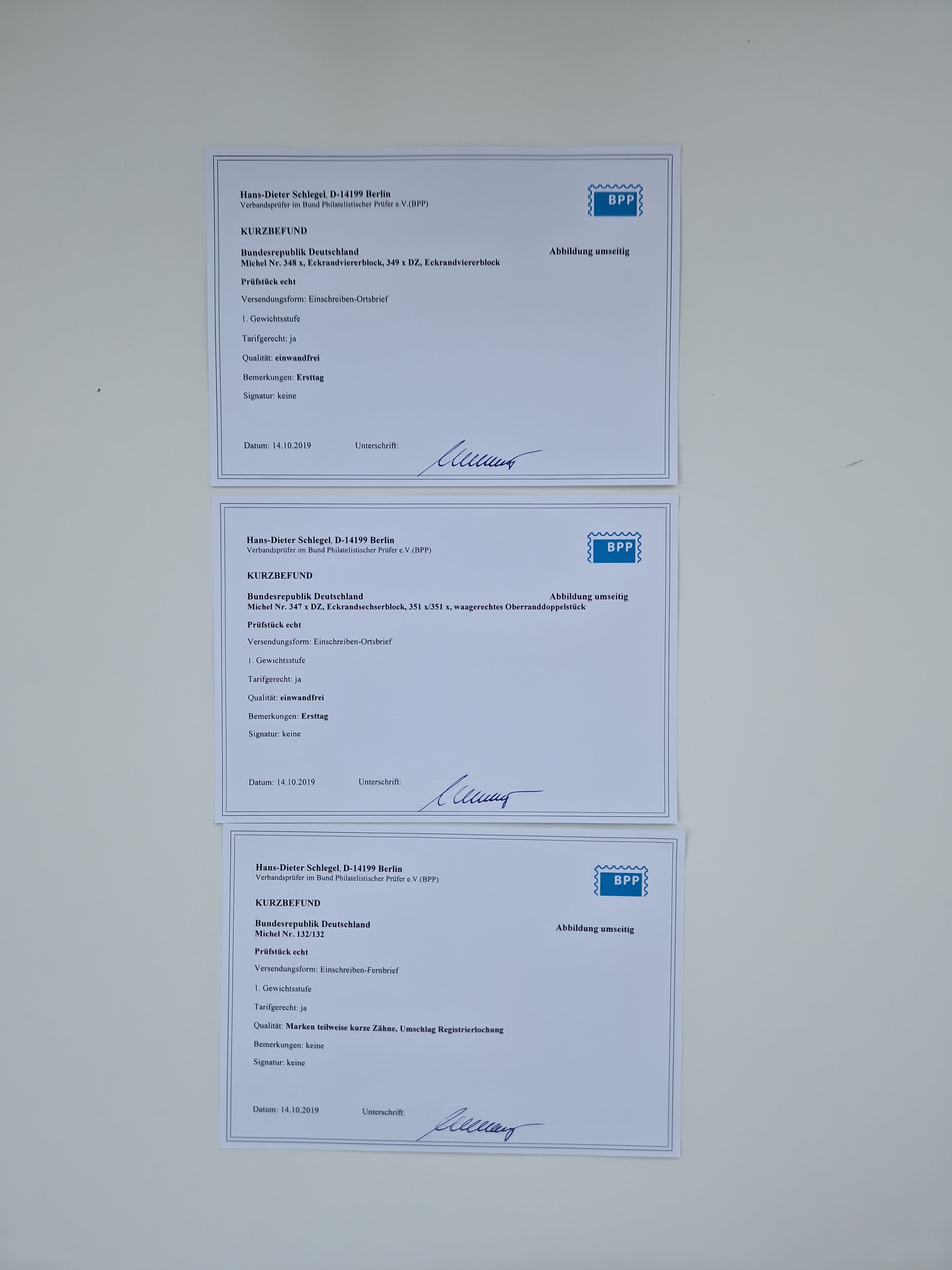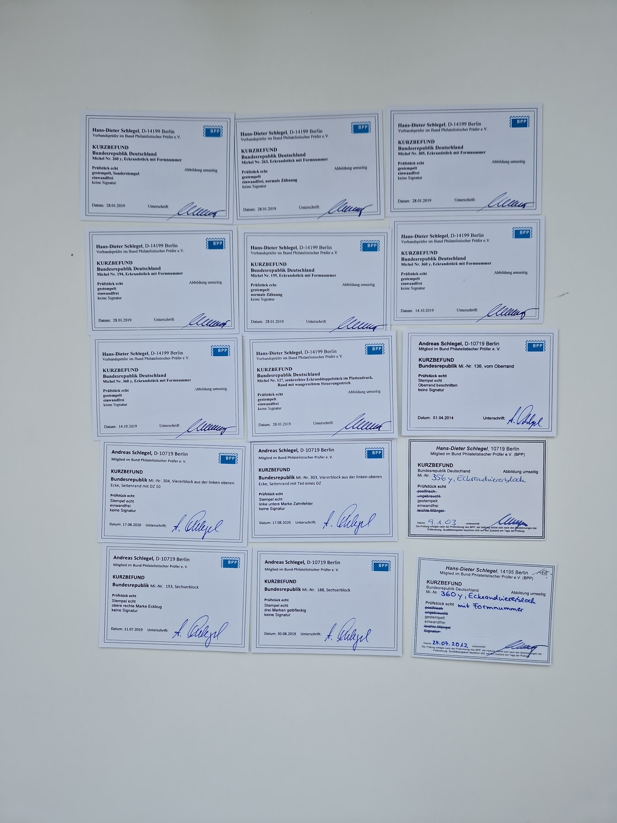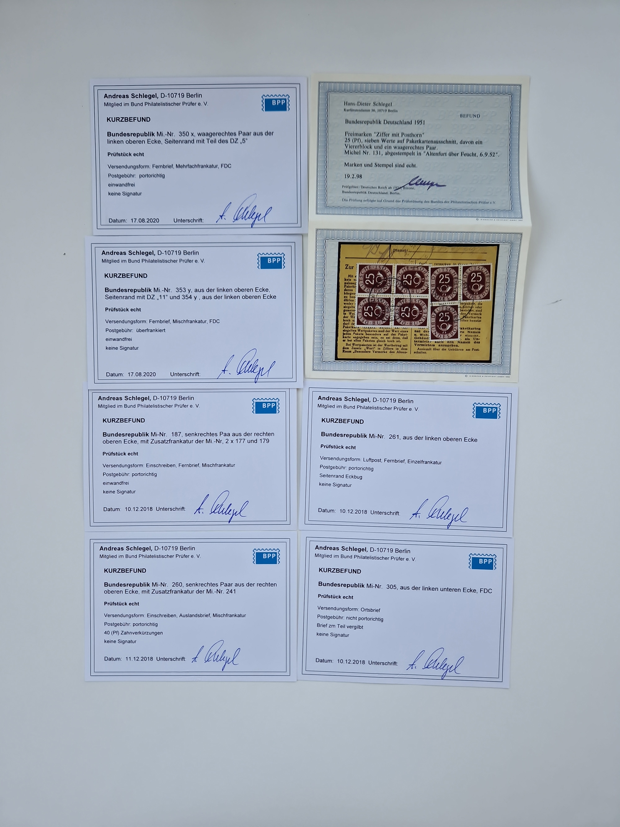 1951/2023, reichhaltiger postfrischer/ungebrauchter und gestempelter Sammlungsbestand mit Viererblocks, Bogenecken, Oberrandstücken, Fo.-Nr., Pl.-Nr., waagerechten Paaren ab Posthorn, dabei u.a. Posthorn in Viererblocks ohne 25, 70 und 80 Pfg. kpl., (90 Pfg. FA Schlegel BPP), sowie in waagerechten Paaren bis auf 80 Pfg. kpl., Mi.-Nr. 191 und 192 in 6er-Blocks, 259x 4er-Bl., 305 waagr. Paar, 306 Eckr.-4er-Bl., Heuss teils in 4er, 6er und 10er-Blocks, Heuss Lumogen Eckrand-4er-Blocksatz postfrisch, Bedeutende Deutsche ZD, etc. etc., sowie einige Briefe mit interessanten MeF, Einheiten und FDC, etliches mehrfach und teils auf Loskarten, vieles signiert sowie 4 Atteste und 58 (Kurz-)Befunde Schlegel BPP, gute Erhaltung, in zwei Kartons