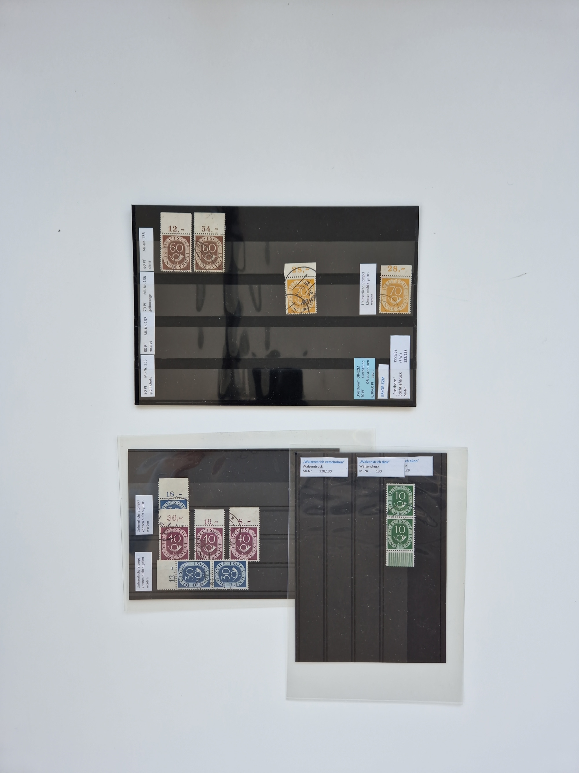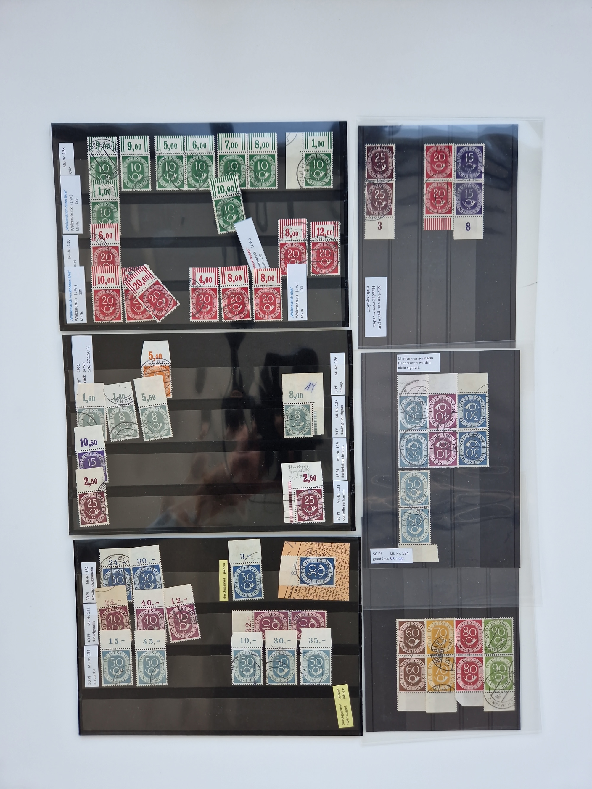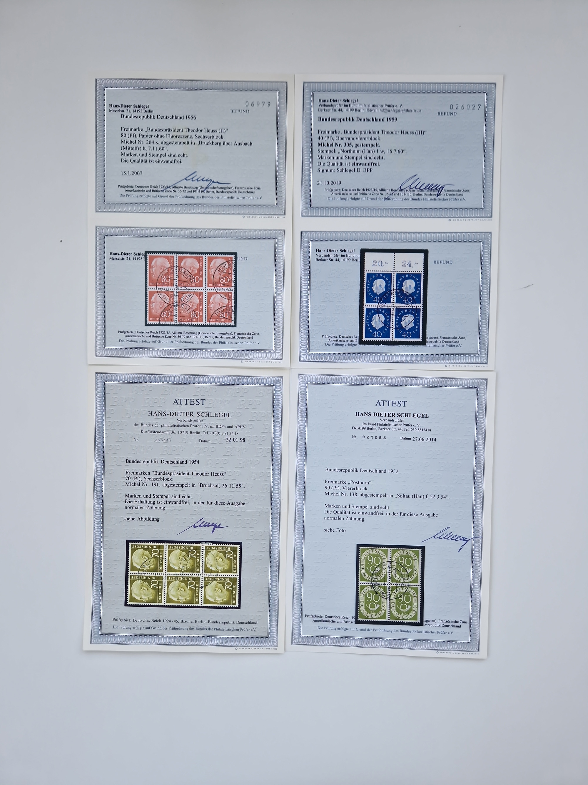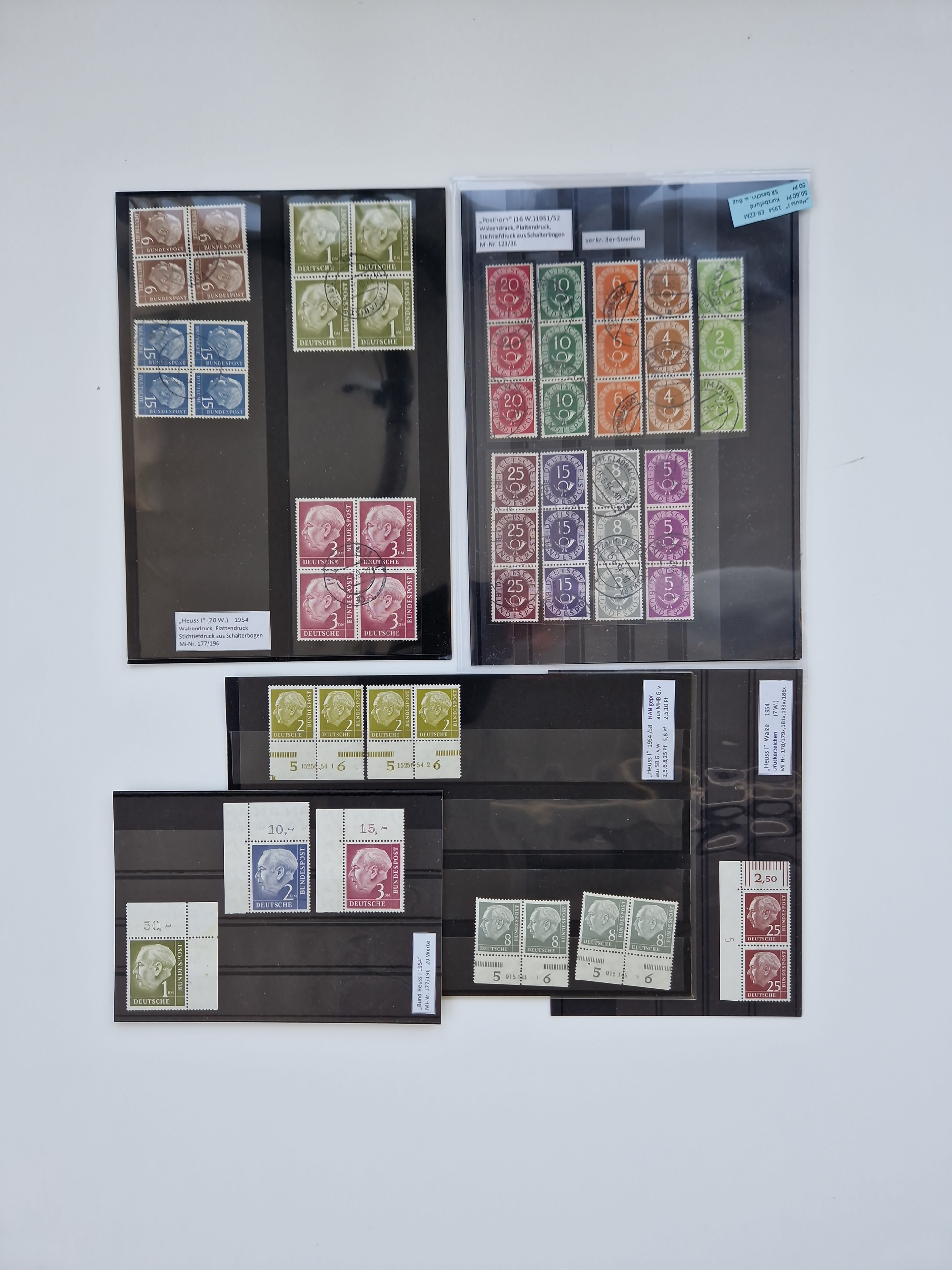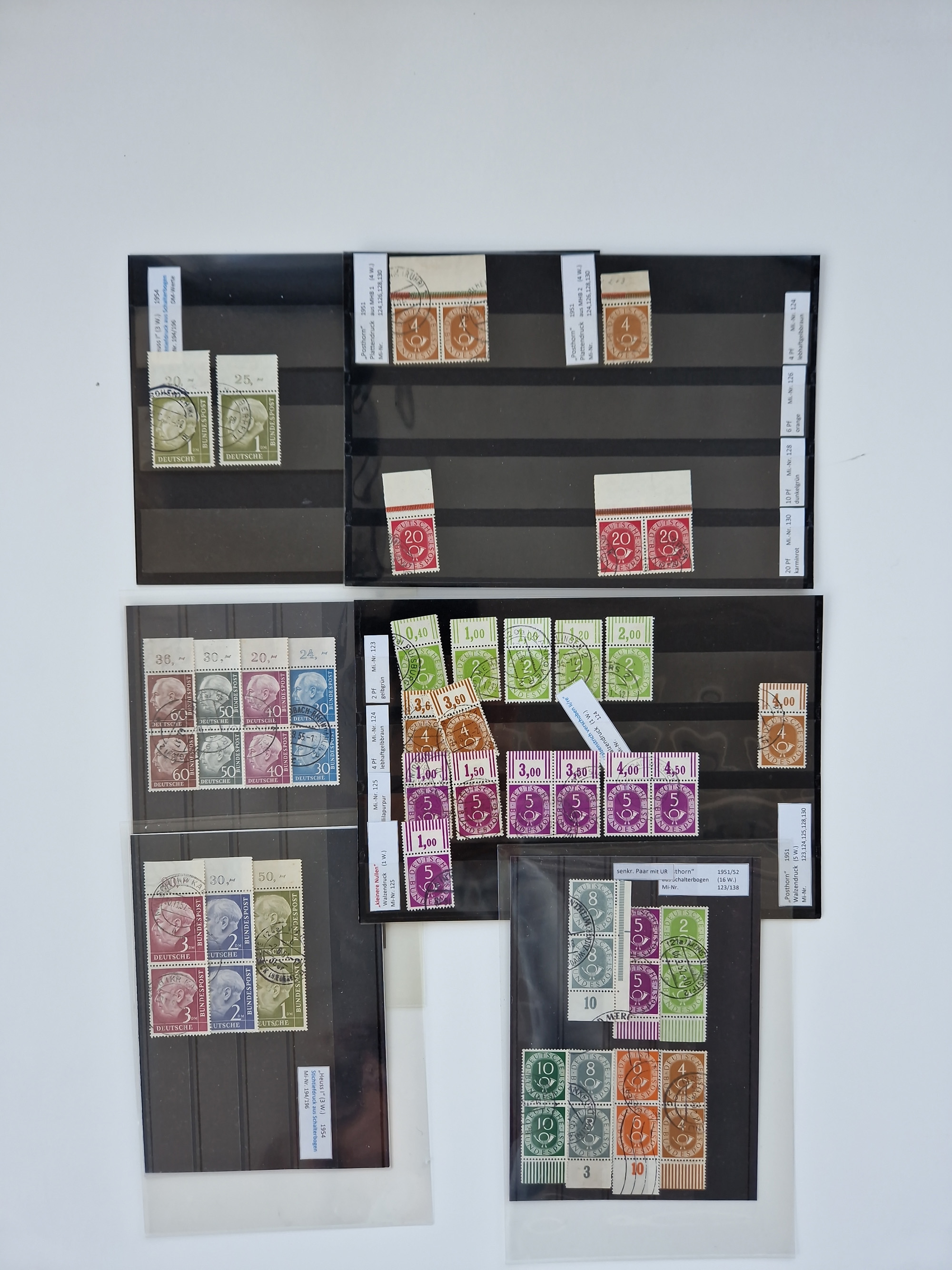 1951/54, gestempelte und meist postfrische Sammlung Zusammendrucke Posthorn und Heuss mit vielen geprüften Stücken wie H-Bl. 1 gestempelt Attest A. Schlegel BPP, S8PFI postfrisch, Attest H-D. Schlegel BPP, Mi. S6 postfrisch, Attest H.-D. Schlegel BPP, Mi. S6 und S7 gestempelt, je Befund A. Schlegel BPP, H.-Bl. 2 Befund H.- D. Schlegel BPP, WZ4 postfrisch, Befund H.-D. Schlegel BPP und W1/S9 postfrisch Befund H.-D. Schlegel BPP.