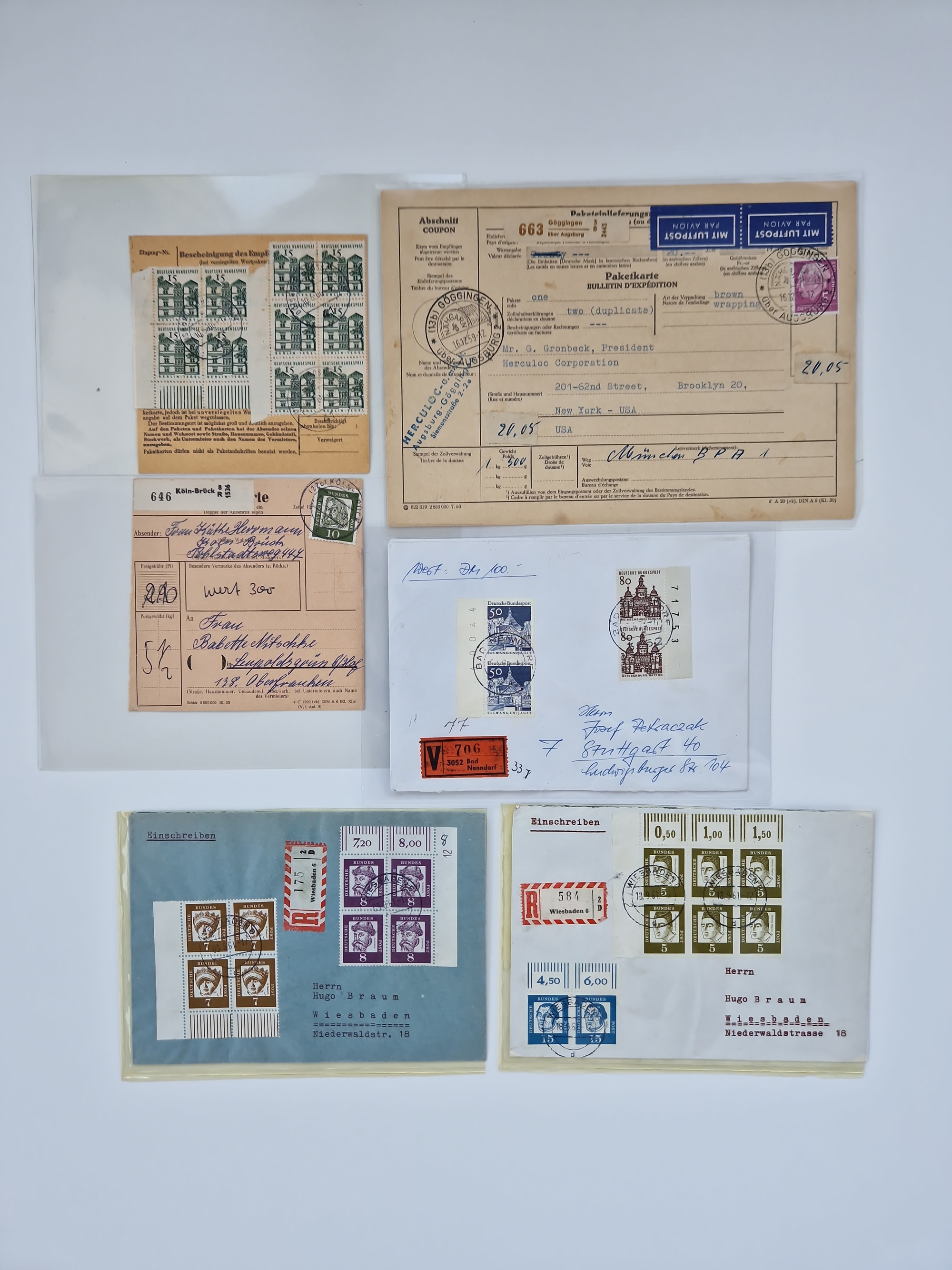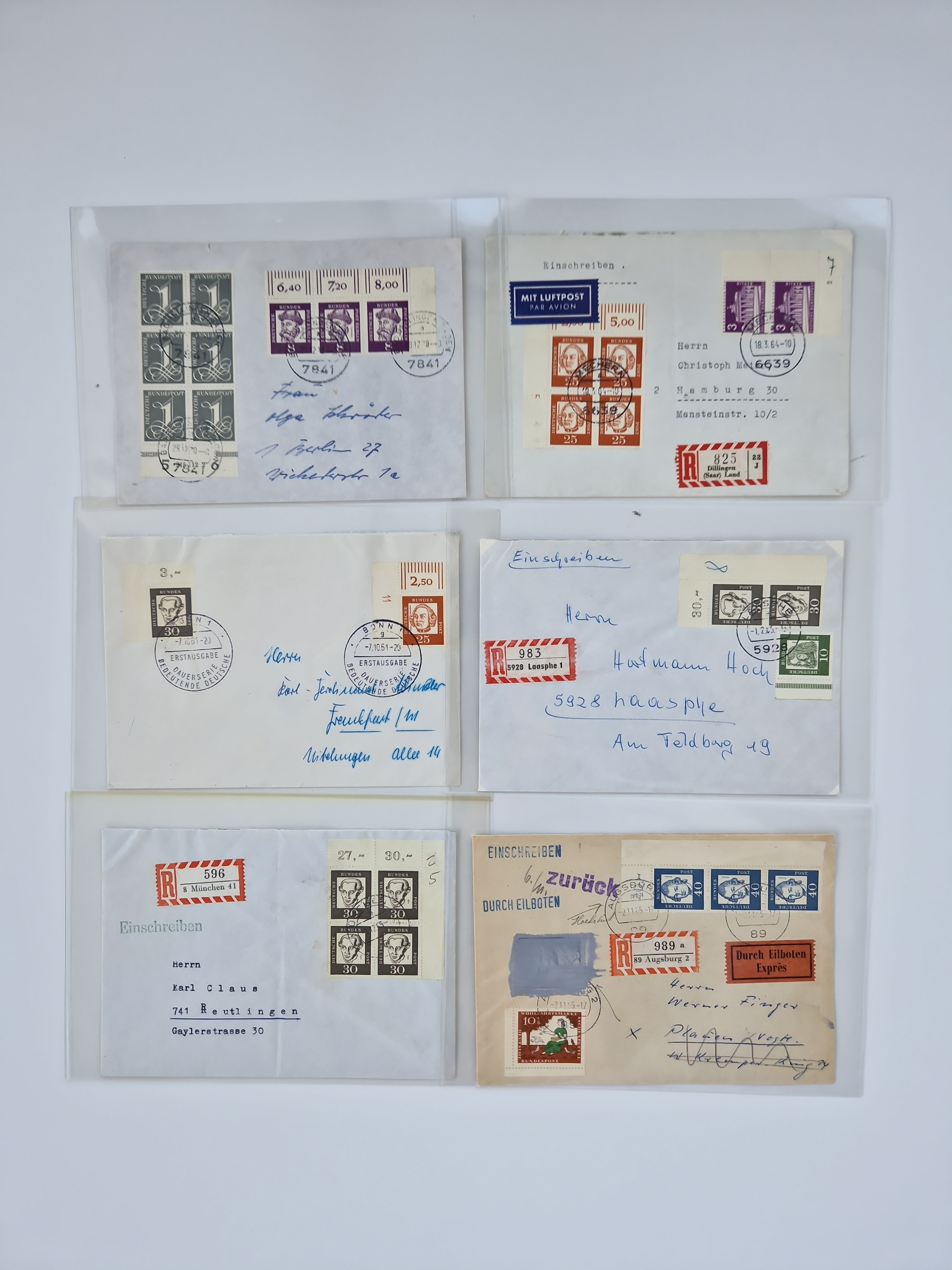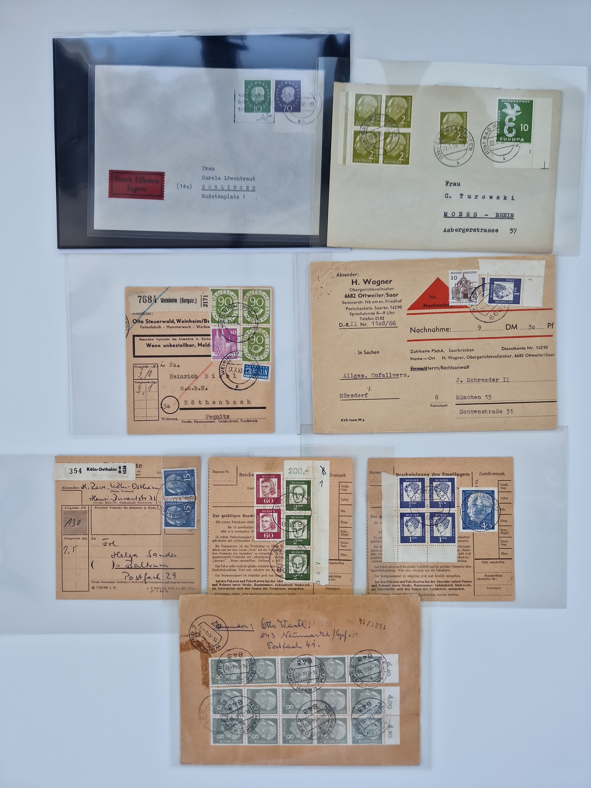1949/2001, umfangreiche Sammlung mit geschätzt 5000 Briefen und Karten mit vielen besseren Einzel- und Mehrfachfrankaturen, R-Briefen, Portostufen, Luftpost, Auslandspost, Einheiten und besseren FDC. Dabei u.a. Mi.-Nr. 111-12FDC, 115 MEF auf R-Brief, 116 MEF auf R-Brief, Mi.-Nr. 121-22 je im Paar auf R-Brief “Bonn-Bundeshaus”, 139 MEF, 146 (3) MEF auf R-Auslandsbrief, 159-59 FDC, 156 (5) MEF, 188 im waagerechten Paar auf LP-Brief mit Portomarken, Heftchenblatt 8YI auf Eilbotenbrief, 225 MEF auf R-Brief, 260 im waagerechten Paar auf Eilbotenbrief und 263 im waagerechten Paar auf Erstflugbrief